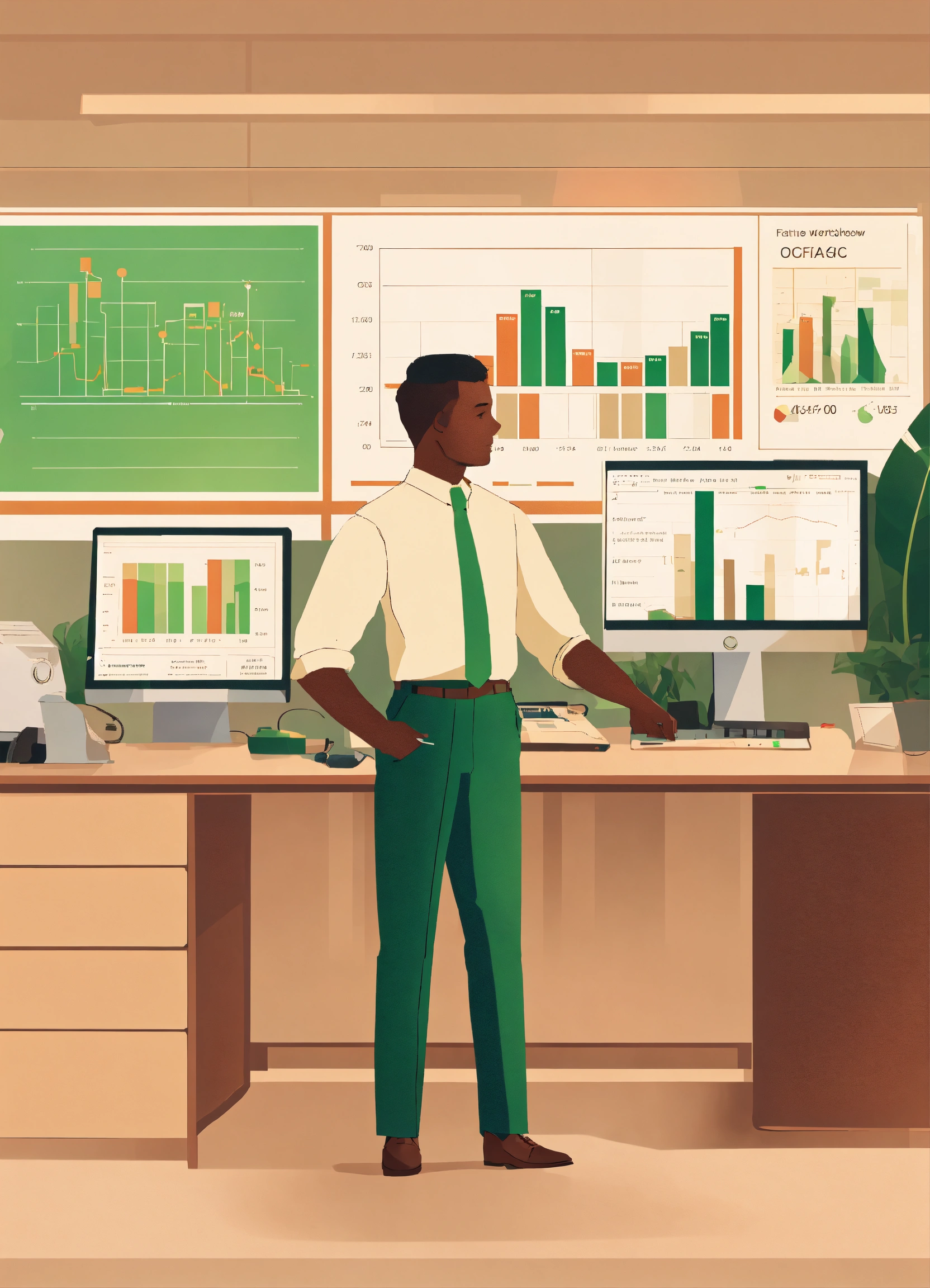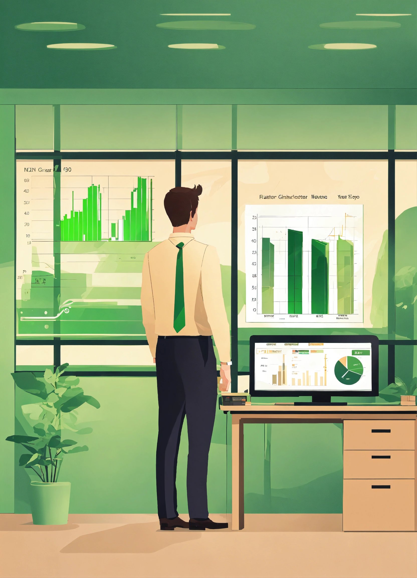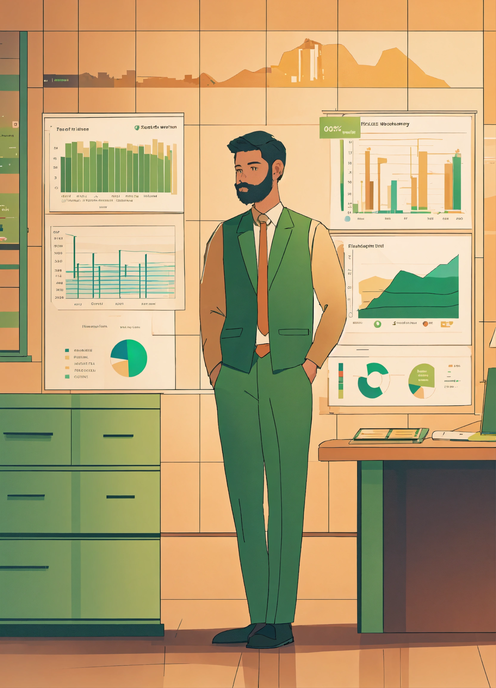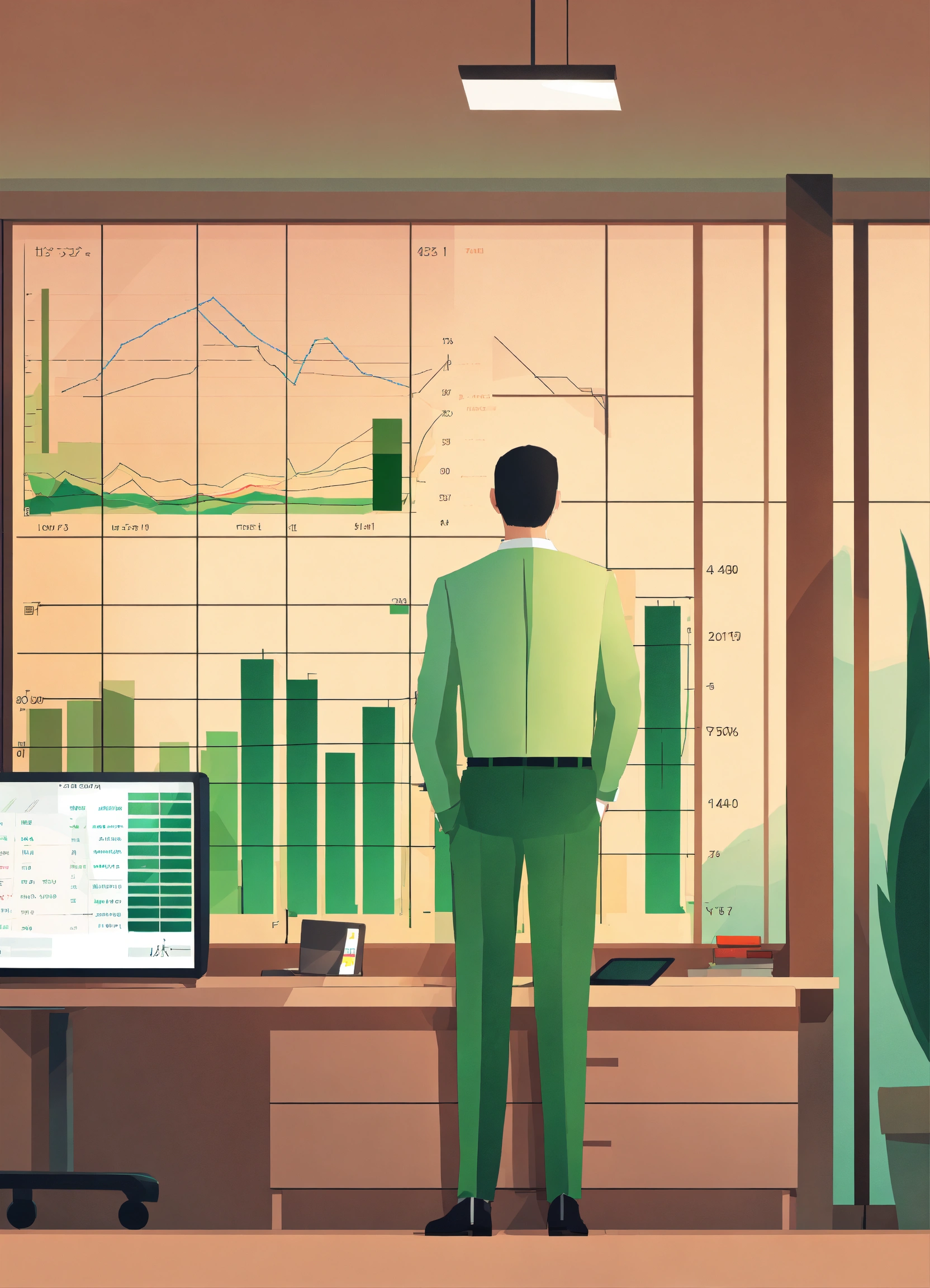 Flat illustration of an office worker standing in front of a dashboard with chart, green and beige, gradients