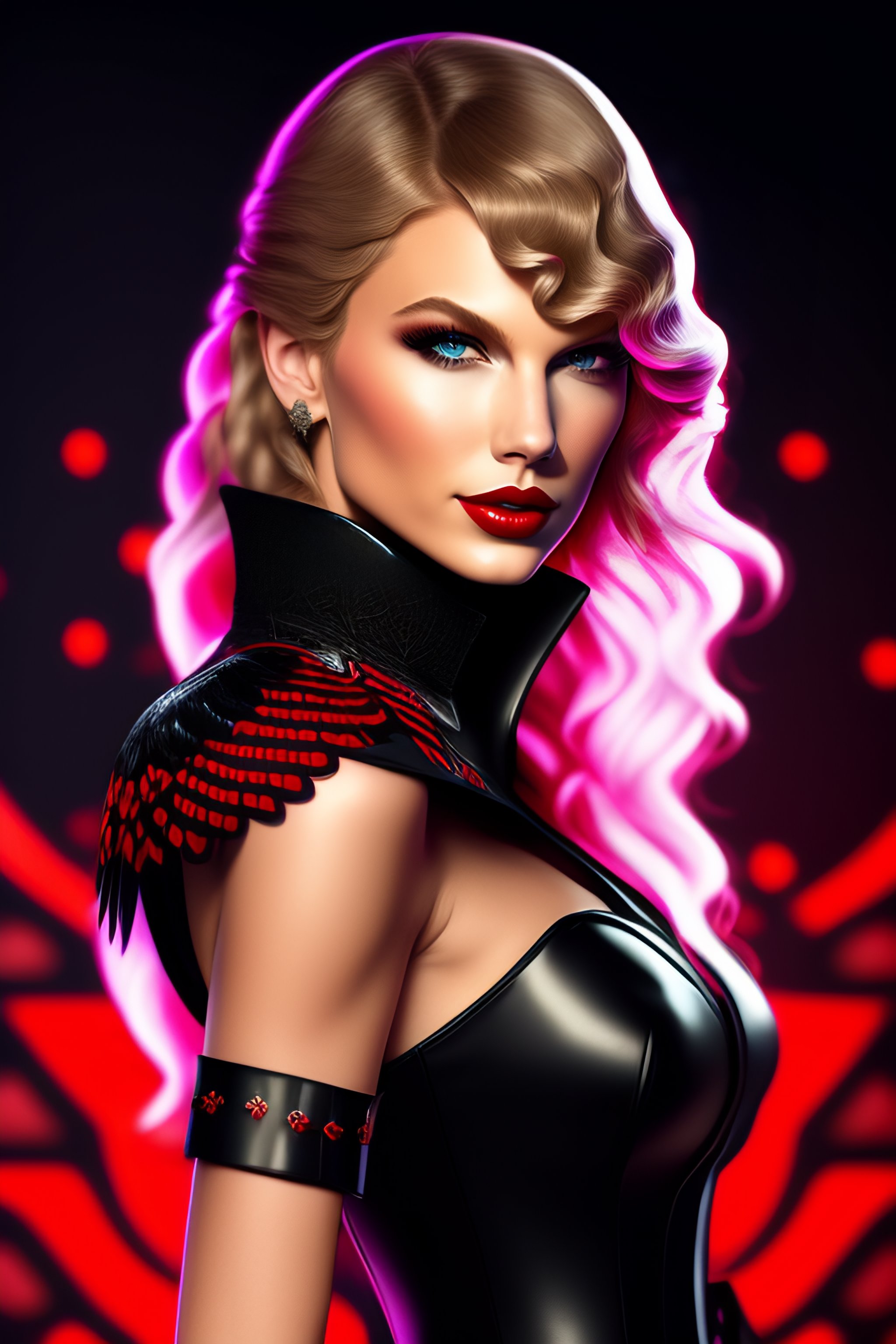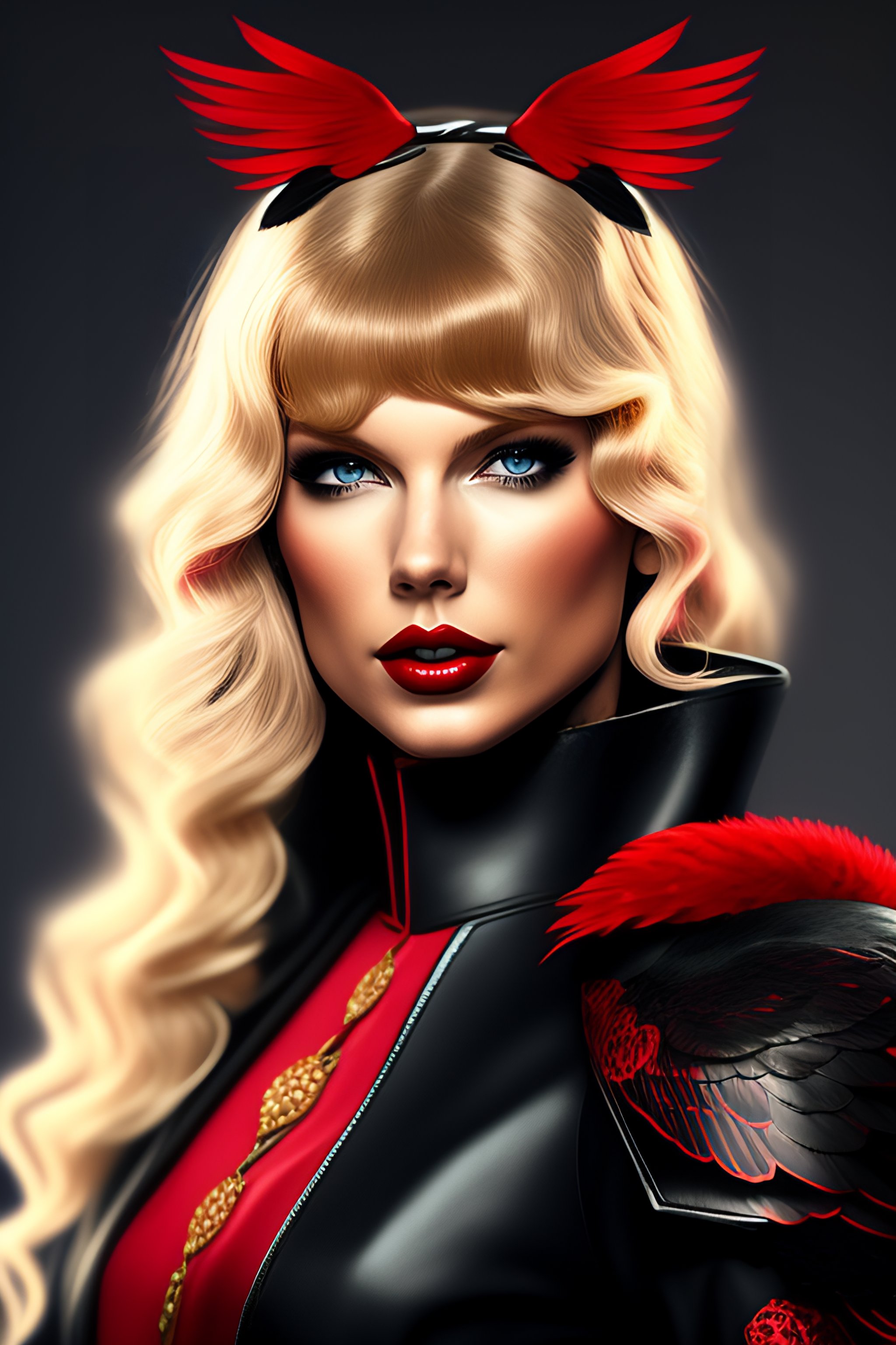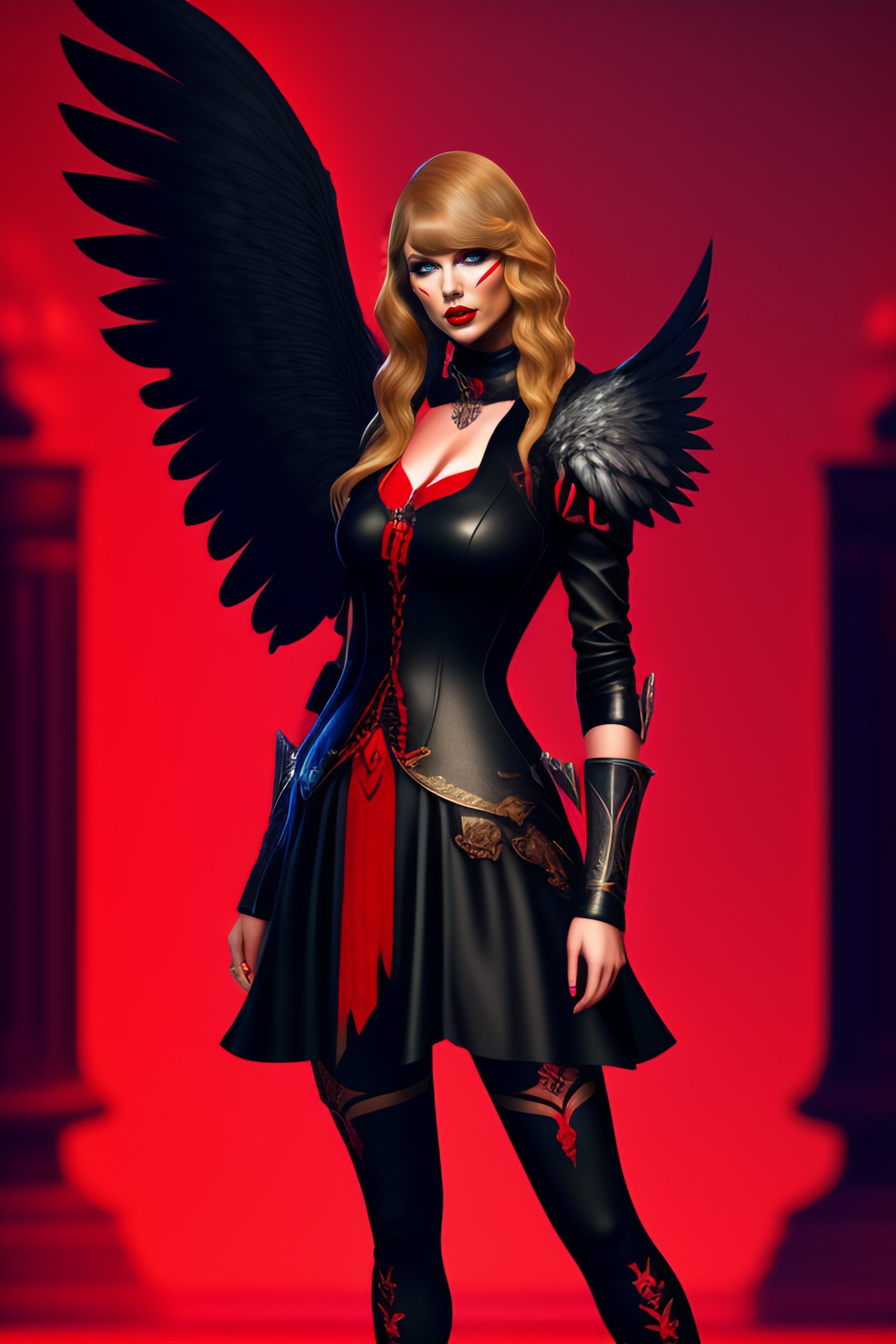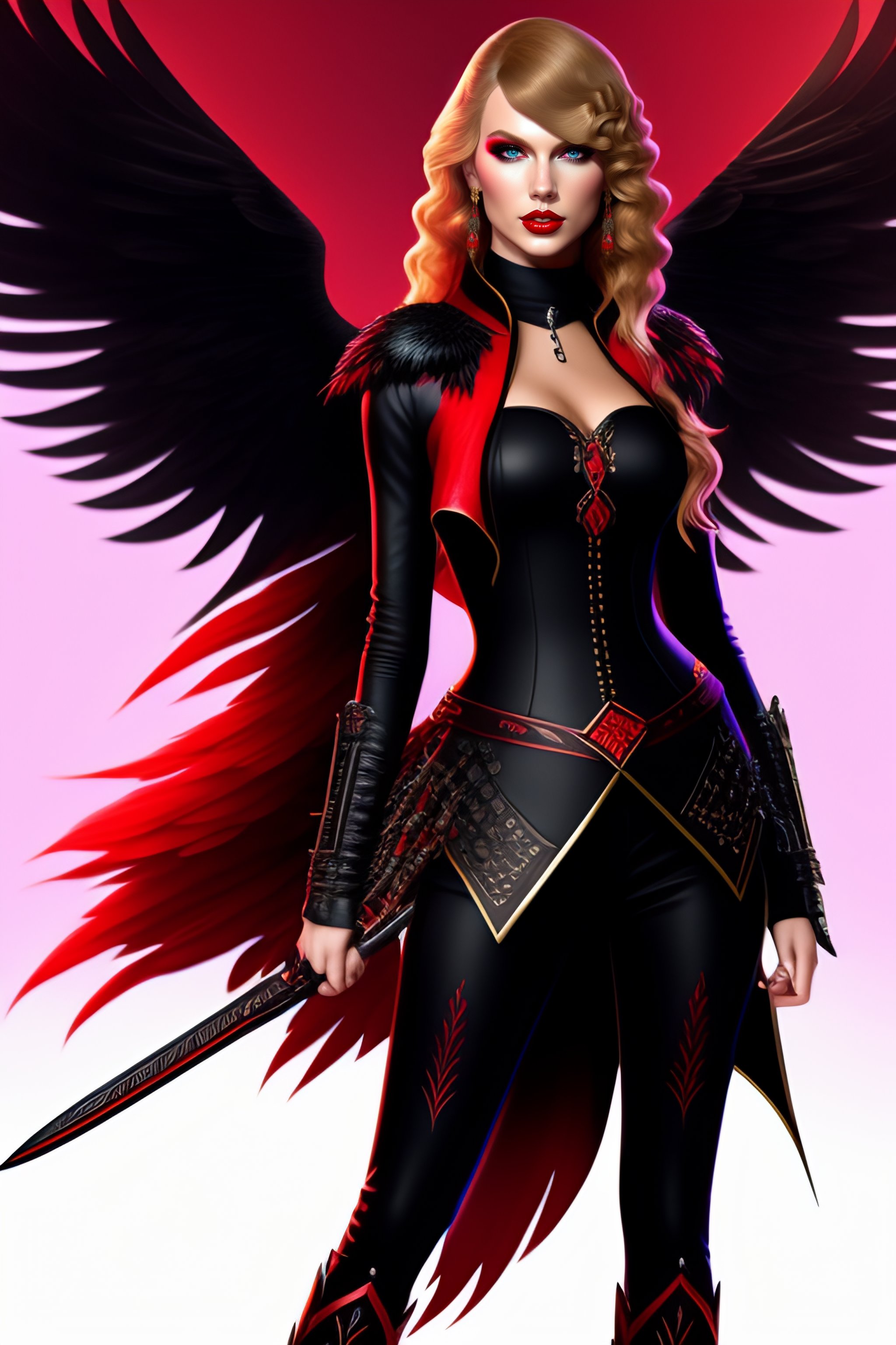 Taylor swift as an online game character is depicted as more gothic appearance with a black and red color scheme, floral patterns, and heavy emphasis on crow feathers adorning the outfit, assassin, combative, blonde hair