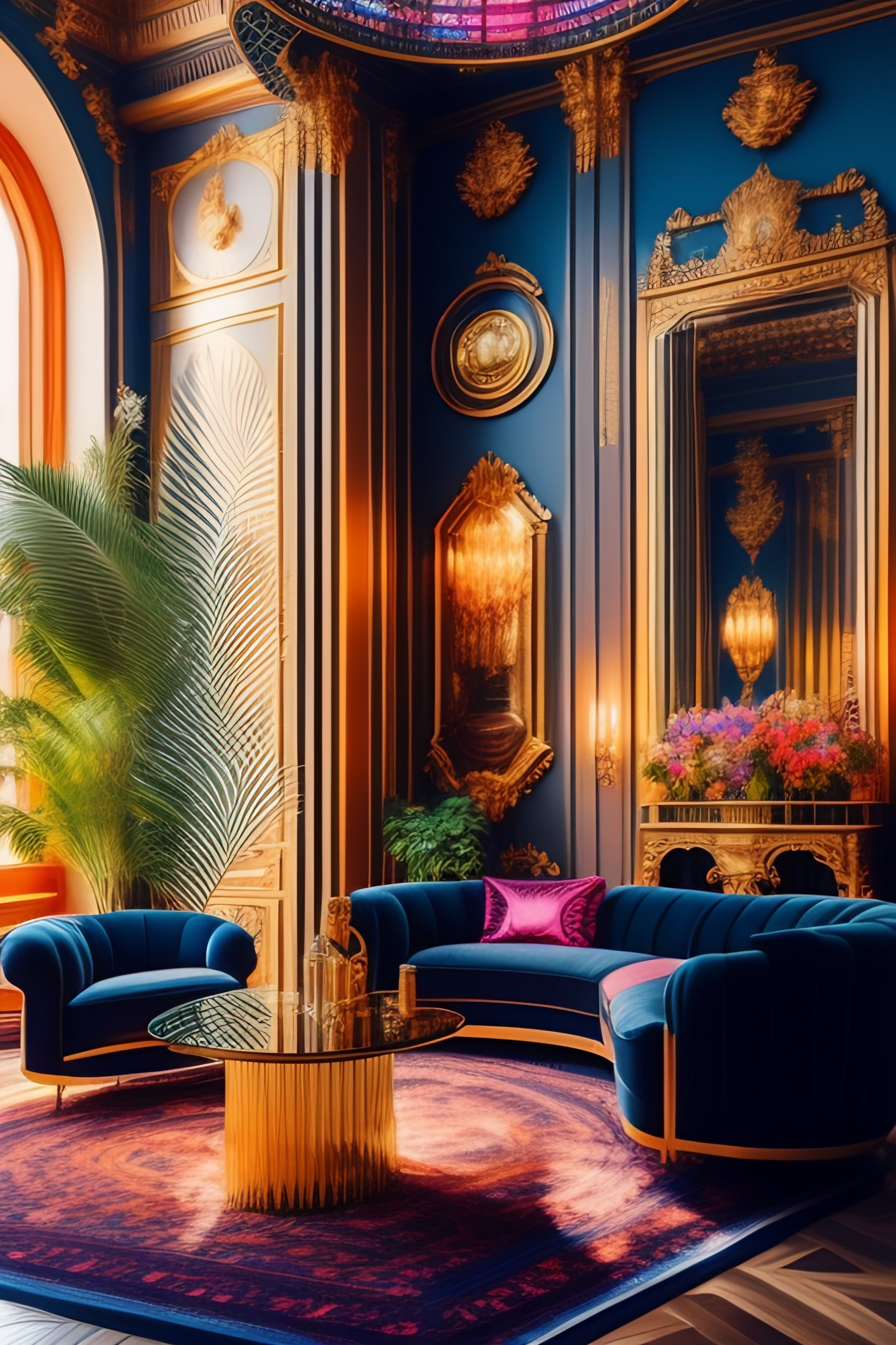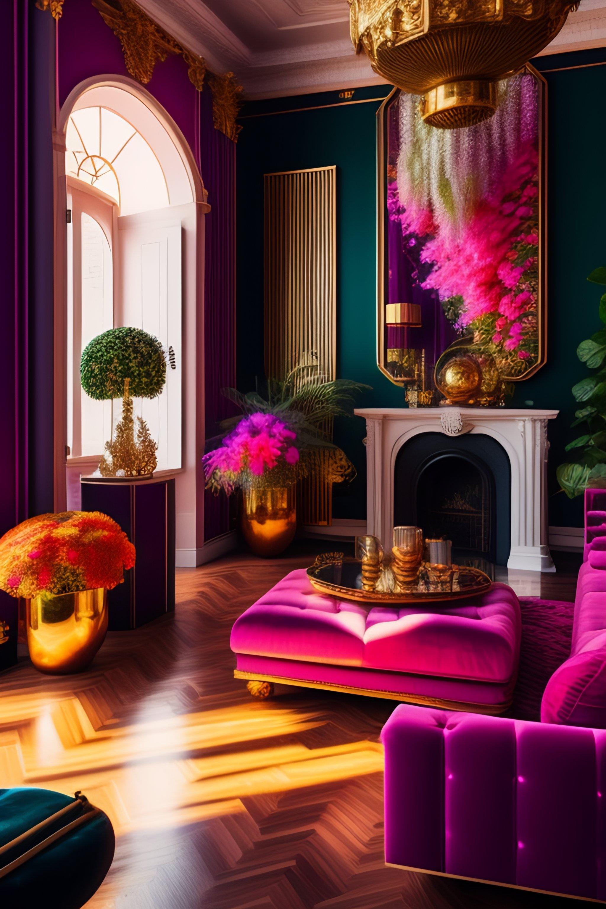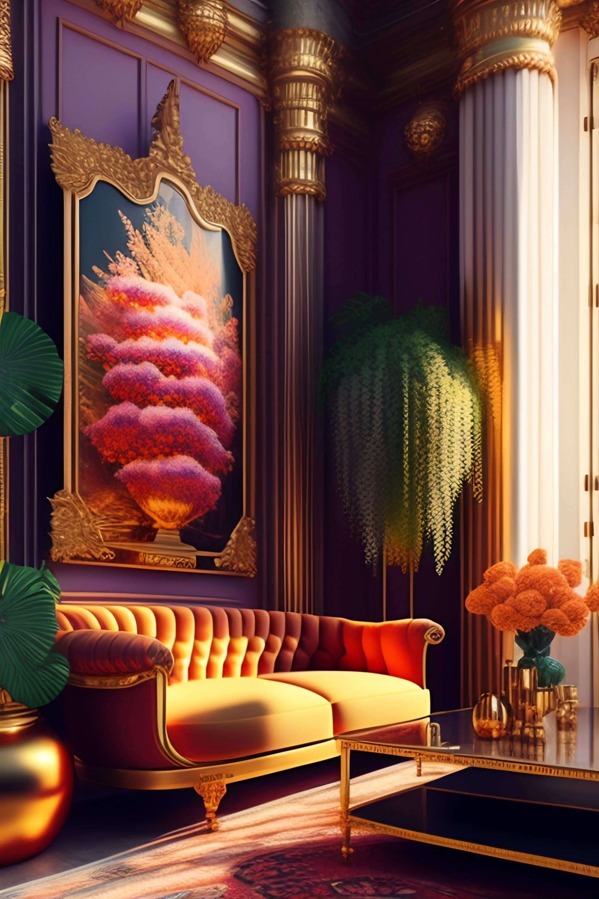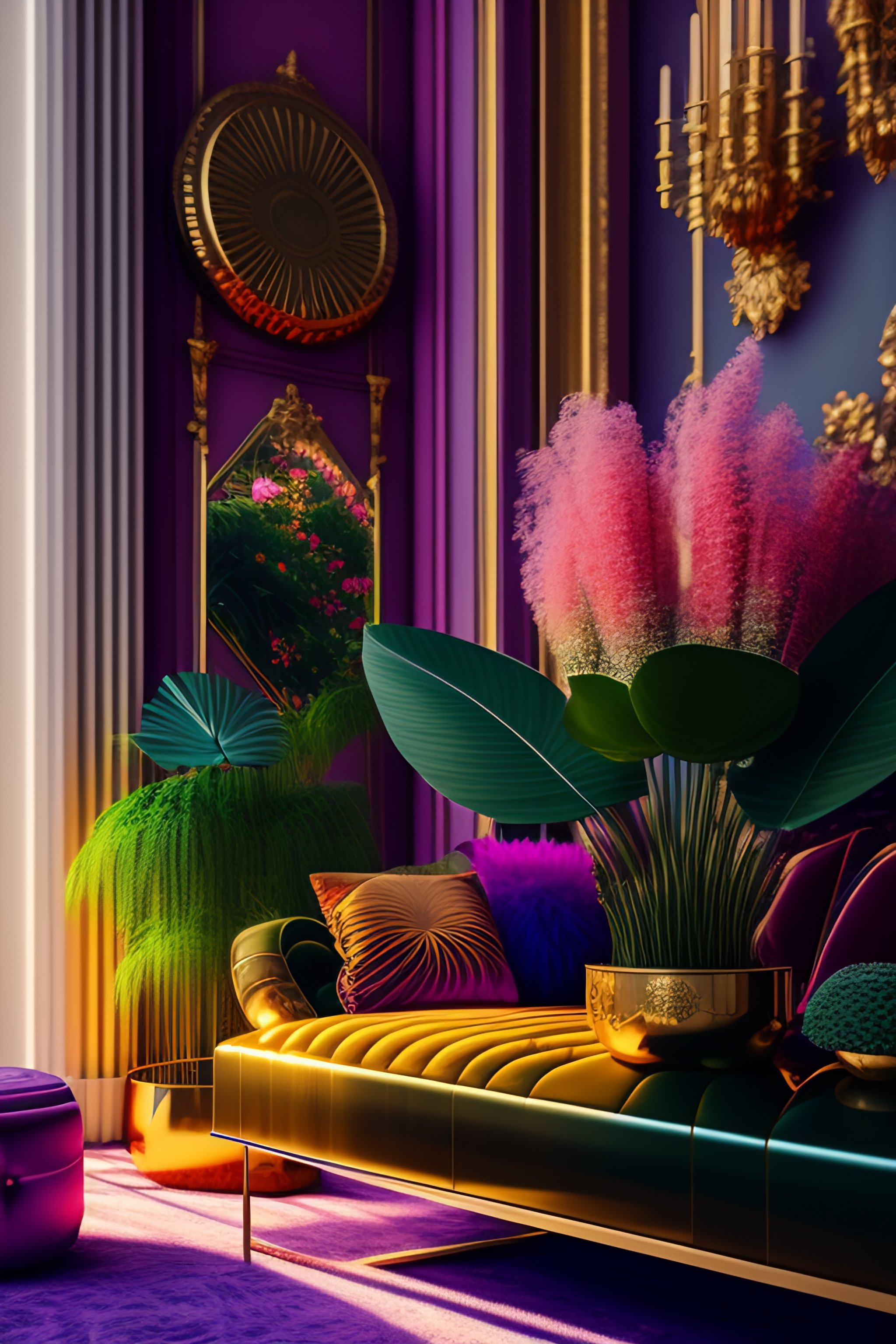 Architectural digest photo of a maximalist infrared {vaporwave/steampunk/solarpunk} living room with lots of flowers and plants, golden light, hyperrealistic surrealism, award winning masterpiece with incredible details, epic stunning