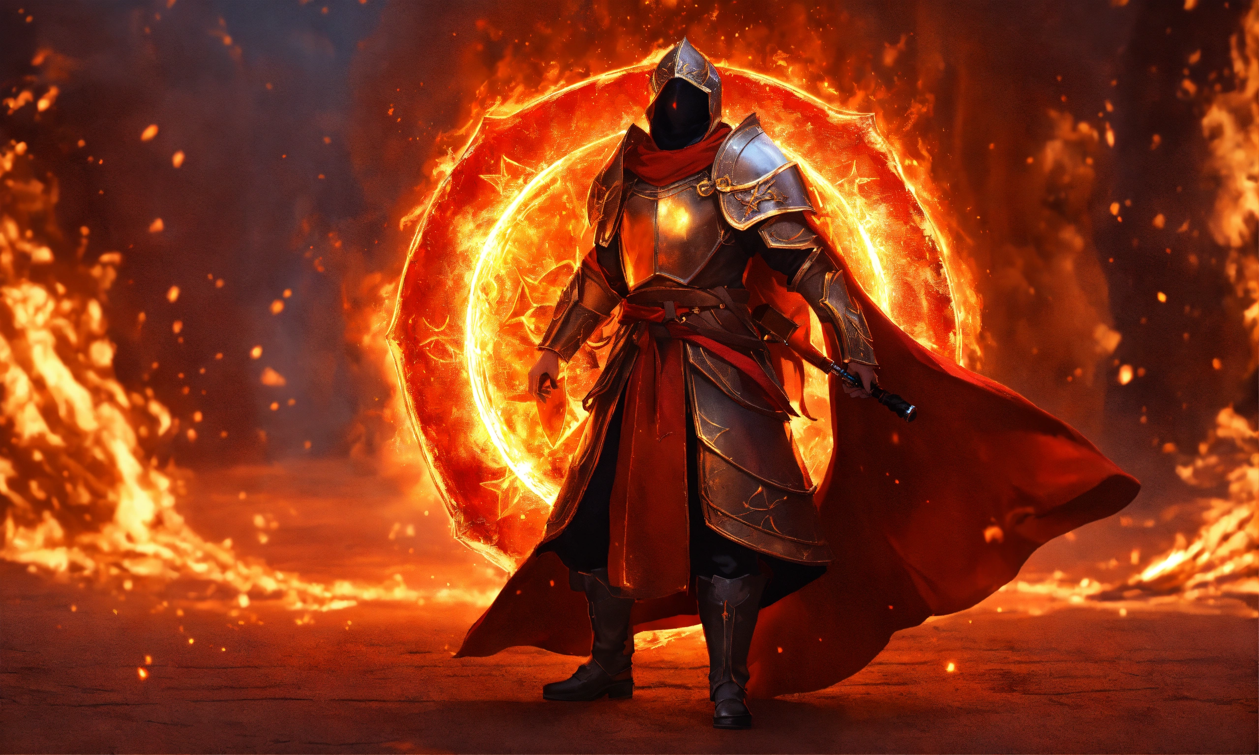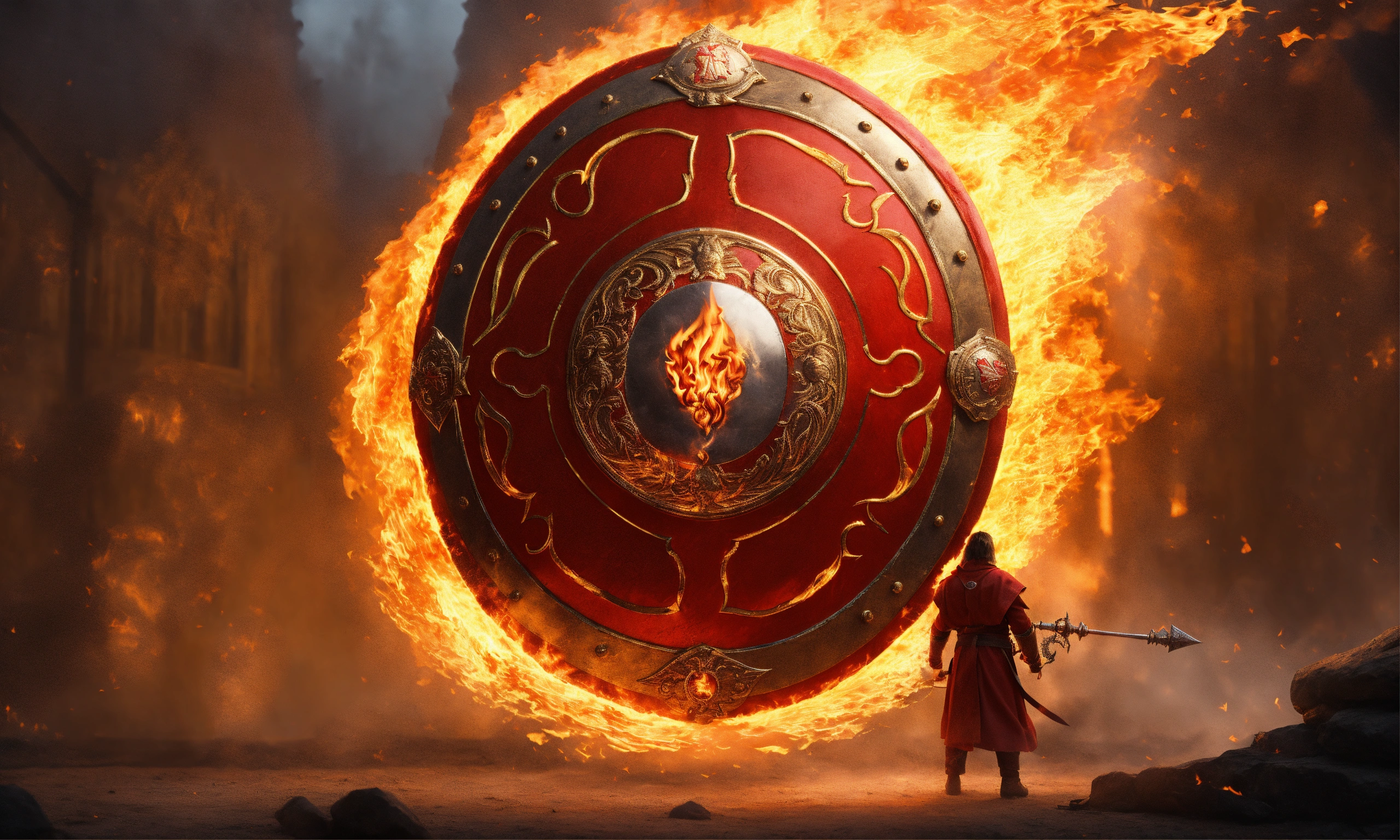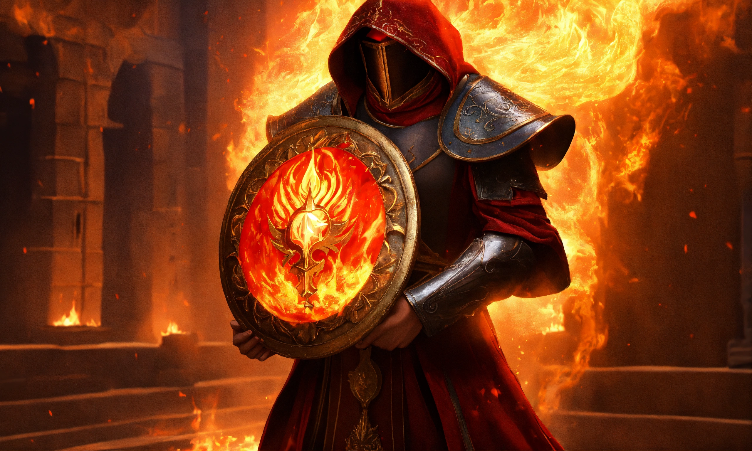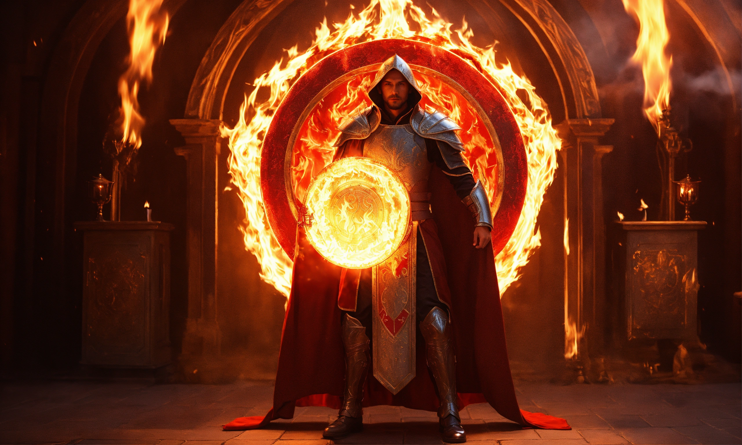 Fire shield, shield made of flames, magical shield, magical equipment, fire shield reflecting a magic spell, shield holder safe, flame shield protecting shield bearer, person holding magical flame shield, red robes sorcerer holding flame shield