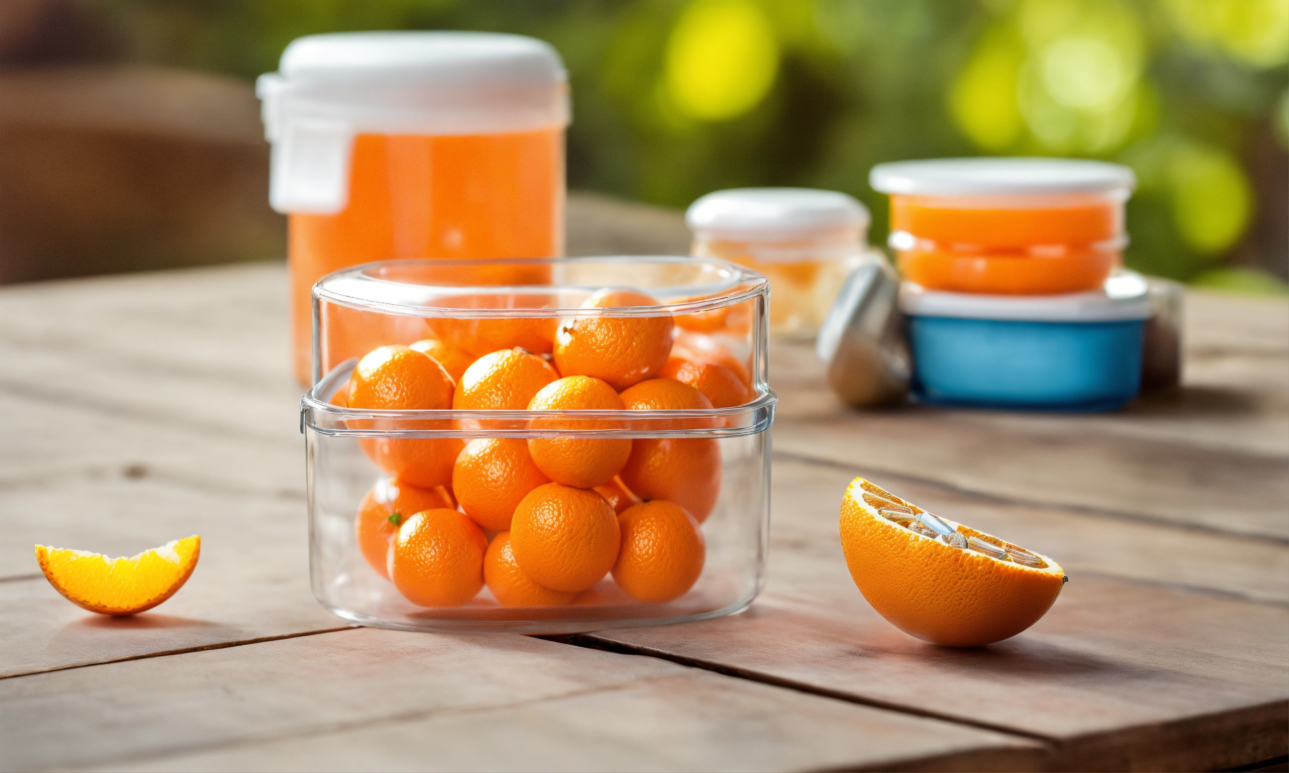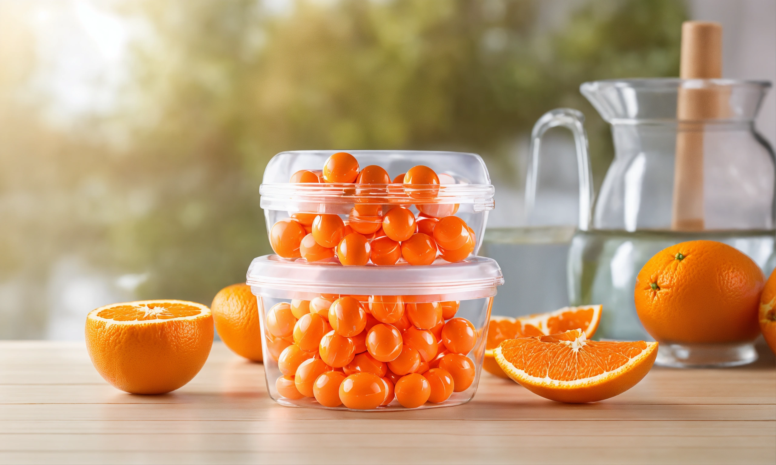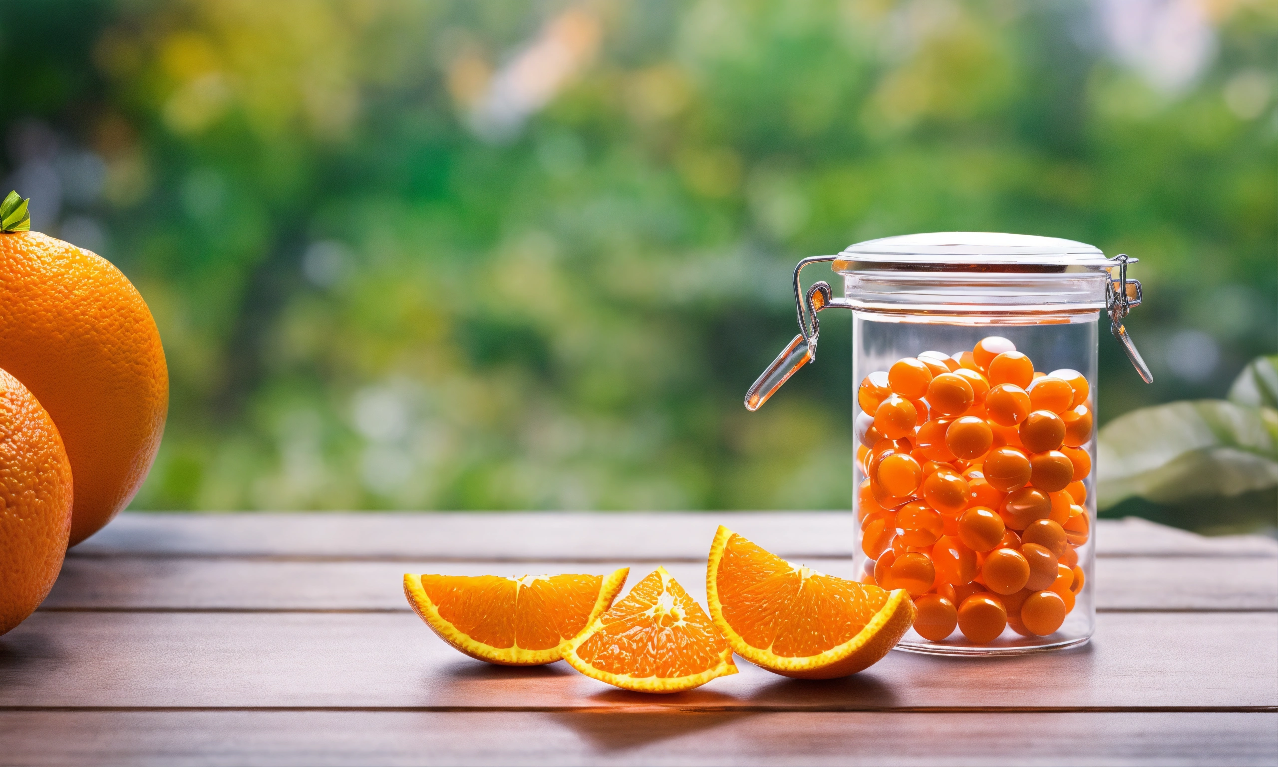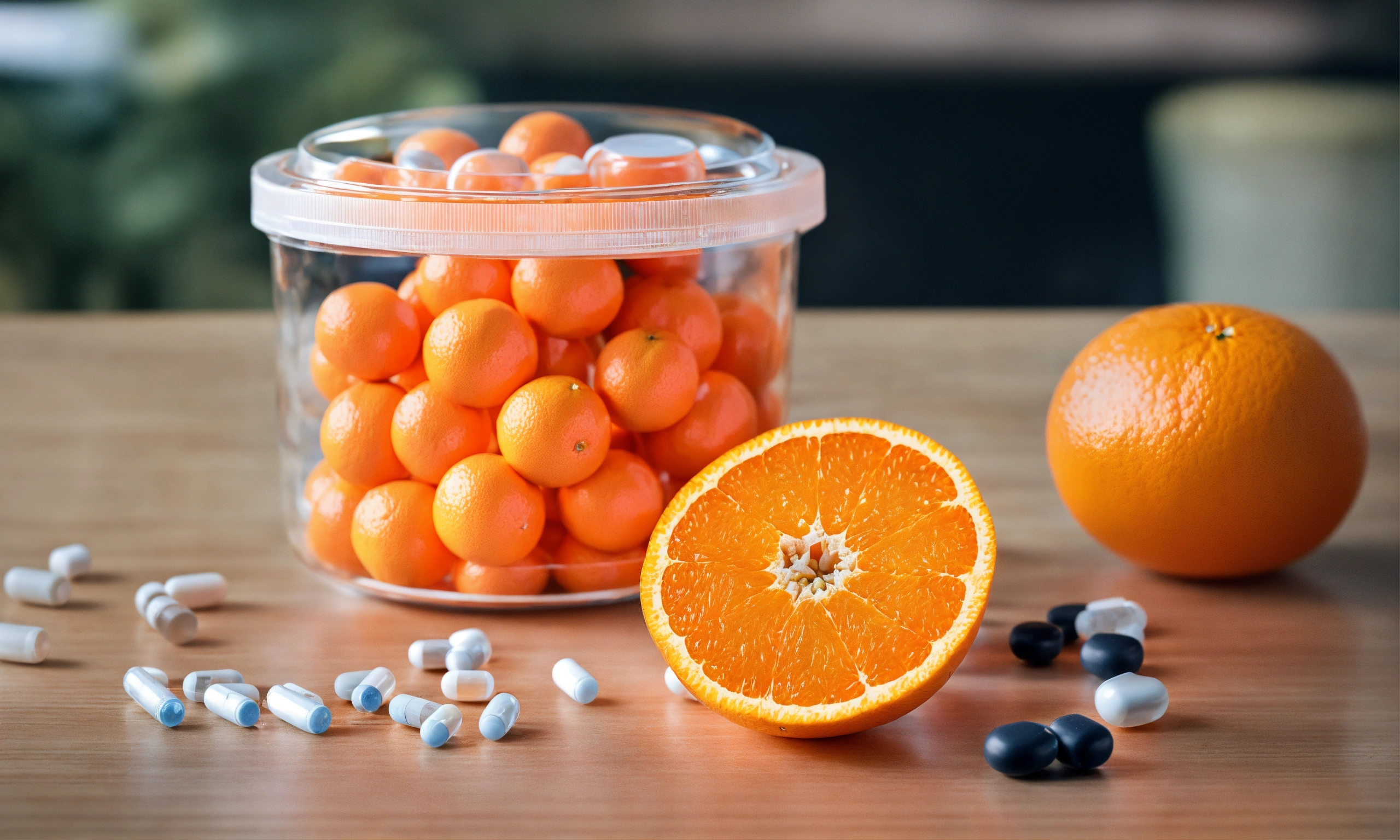 Medical pills in the transparent orange container on the table and oranges nearby in the clean and healthy environment