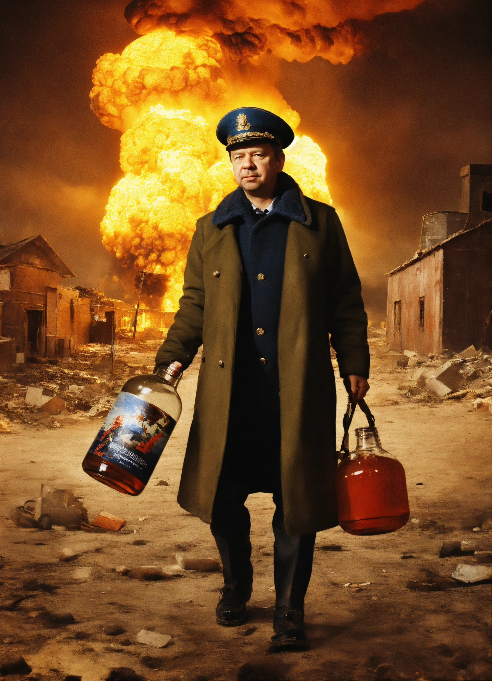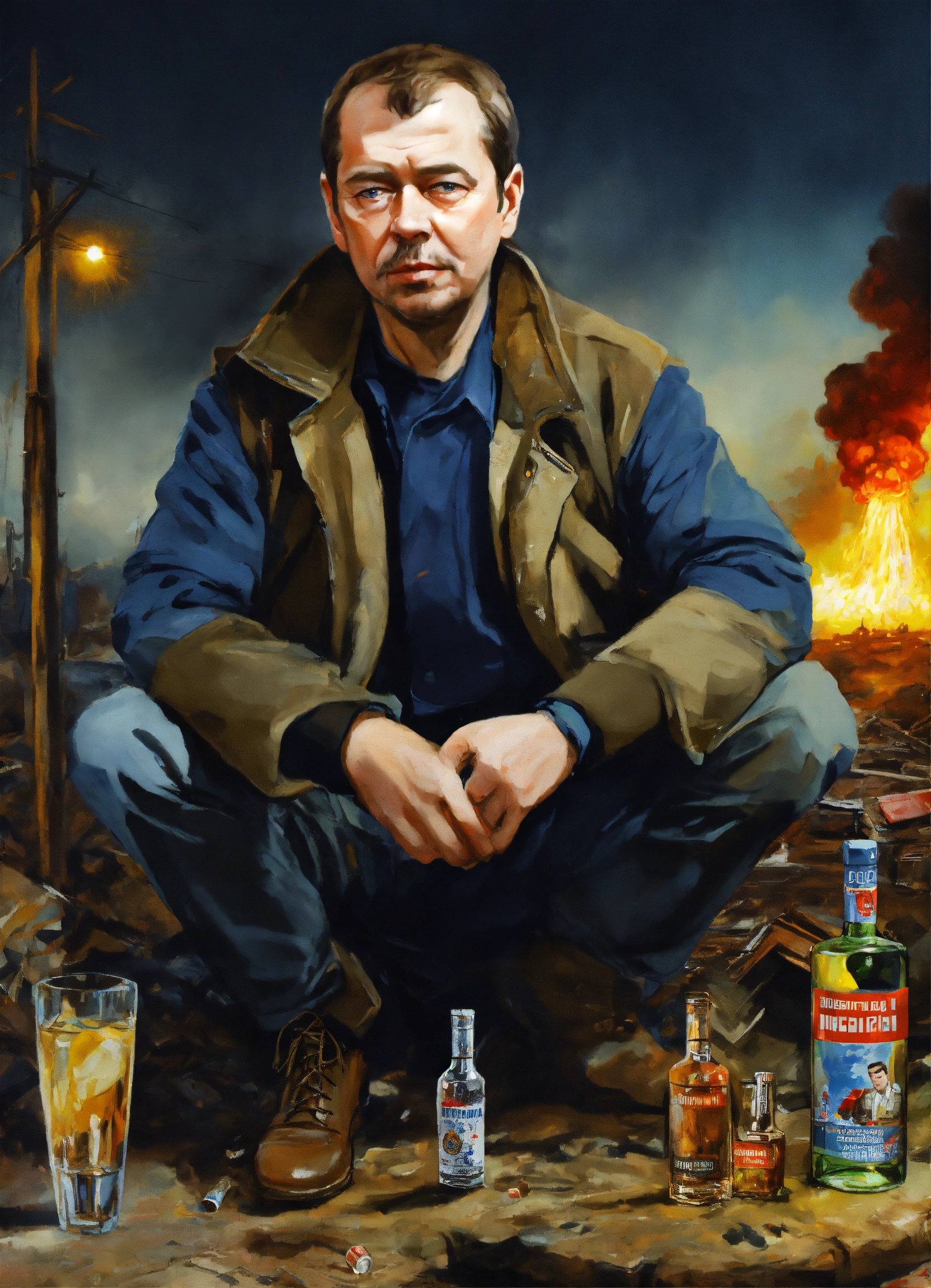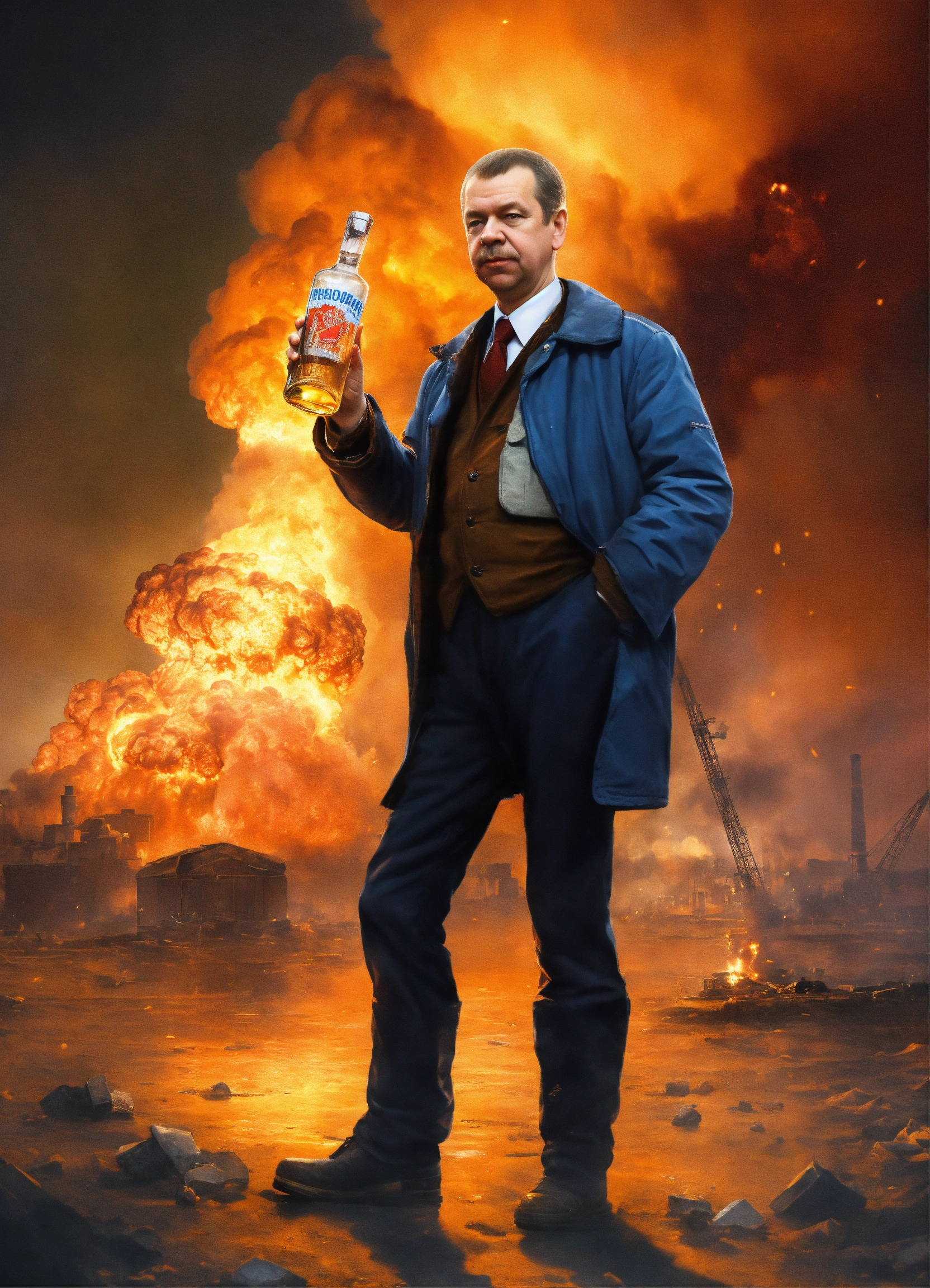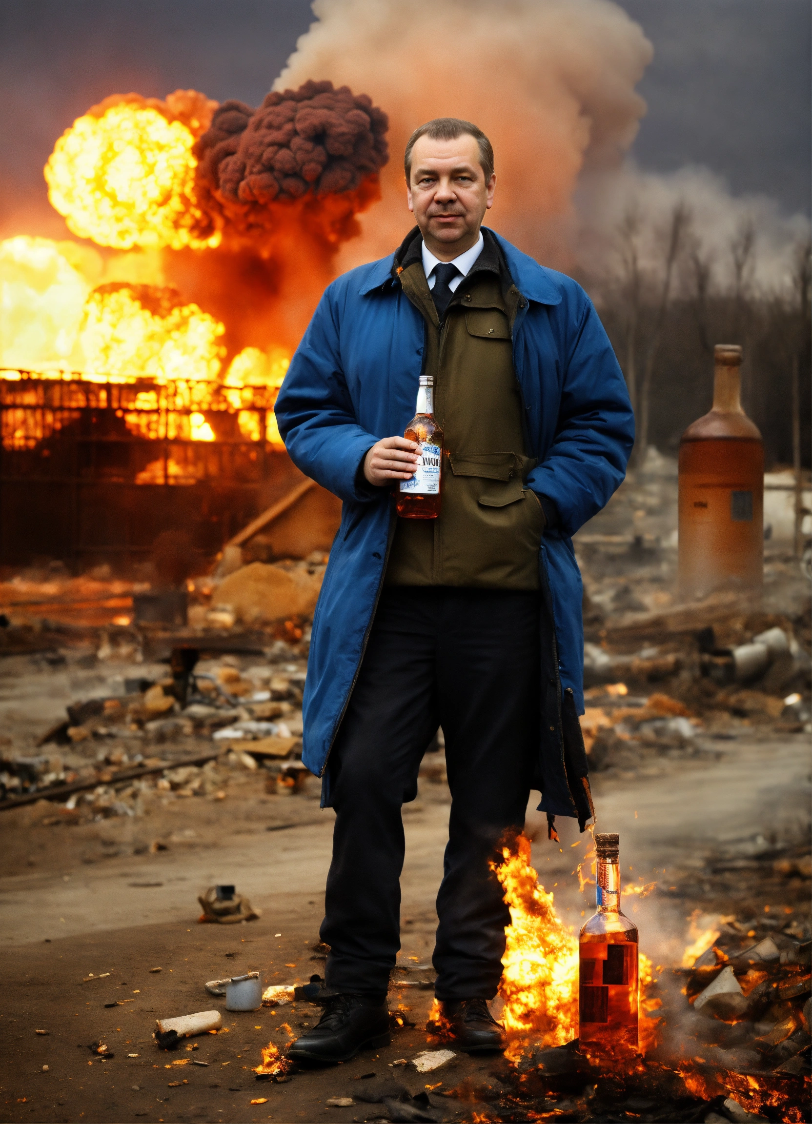 Dmitry medvedev as hobo with bottle of vodka in hands and nuclear explosion and many glits