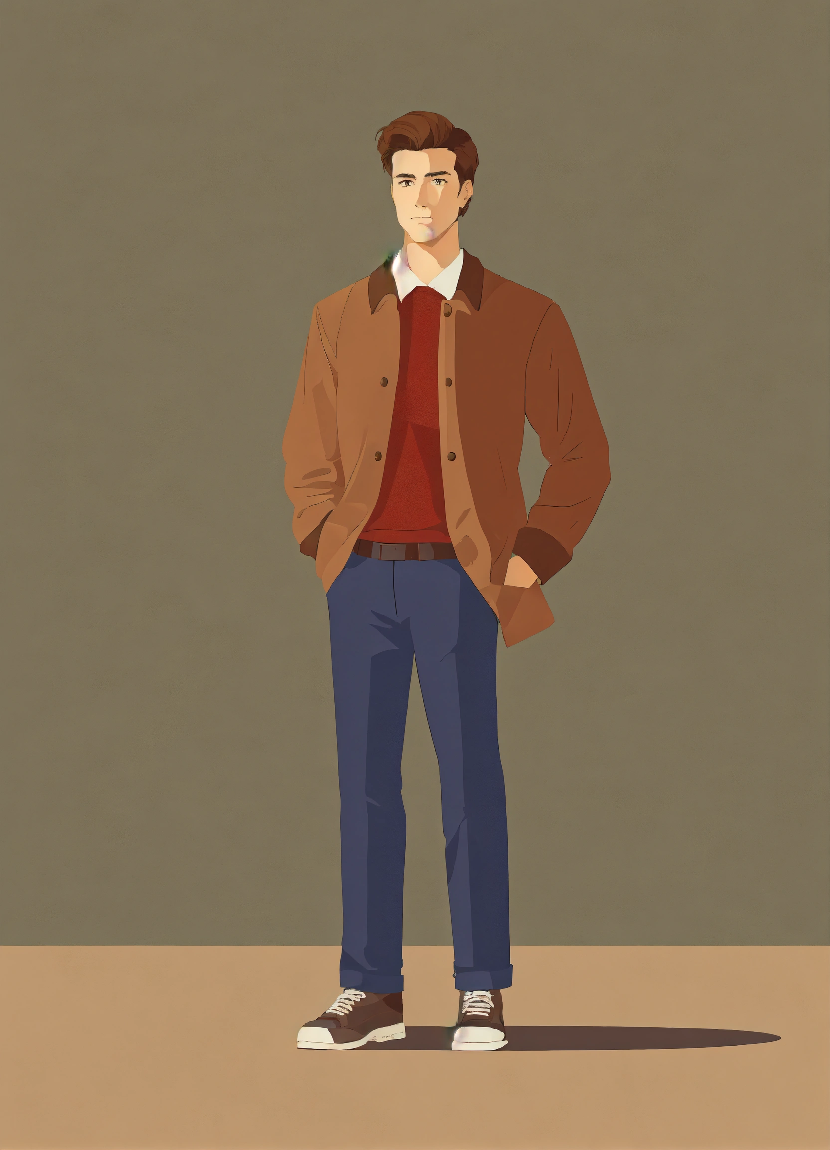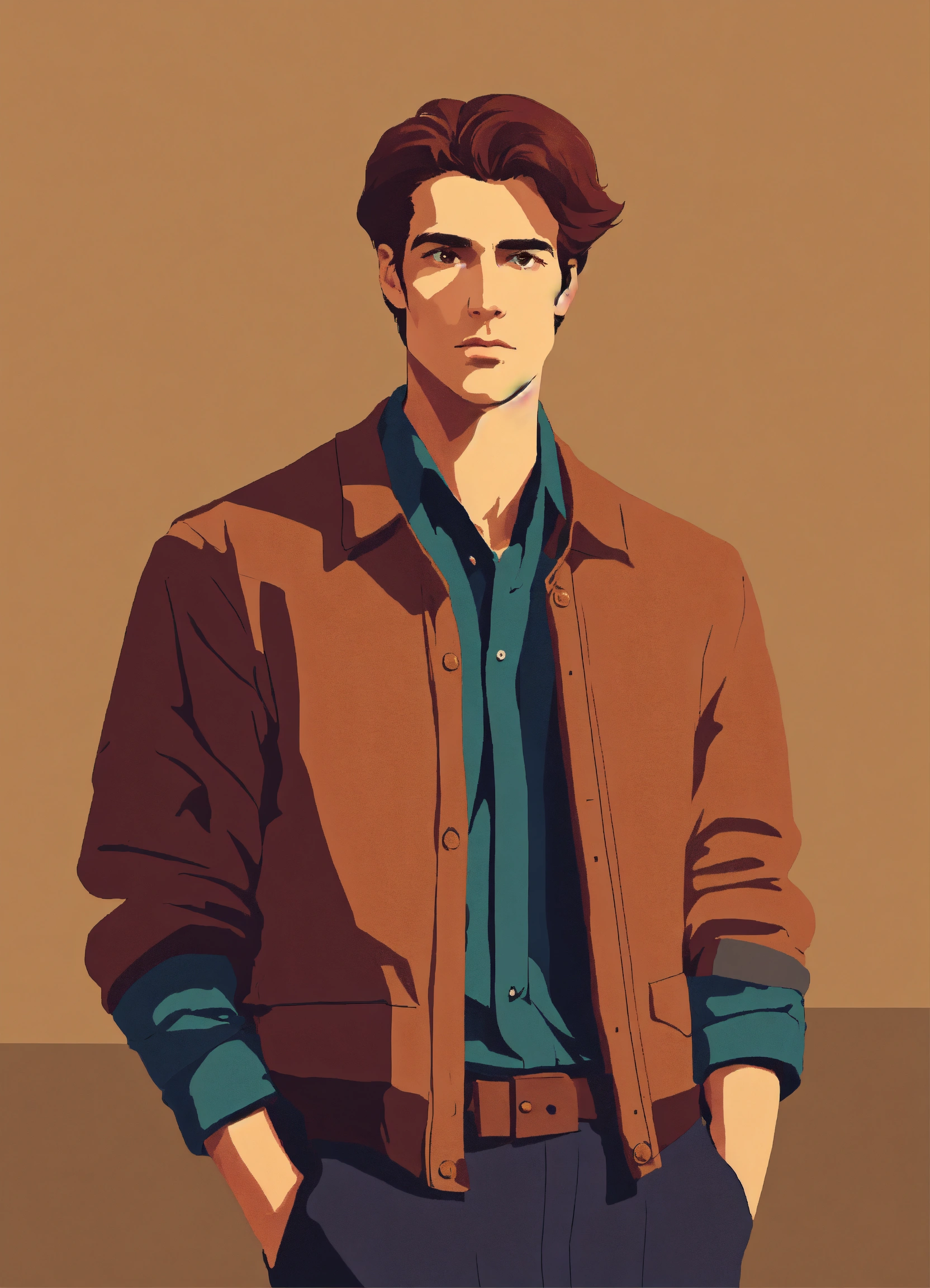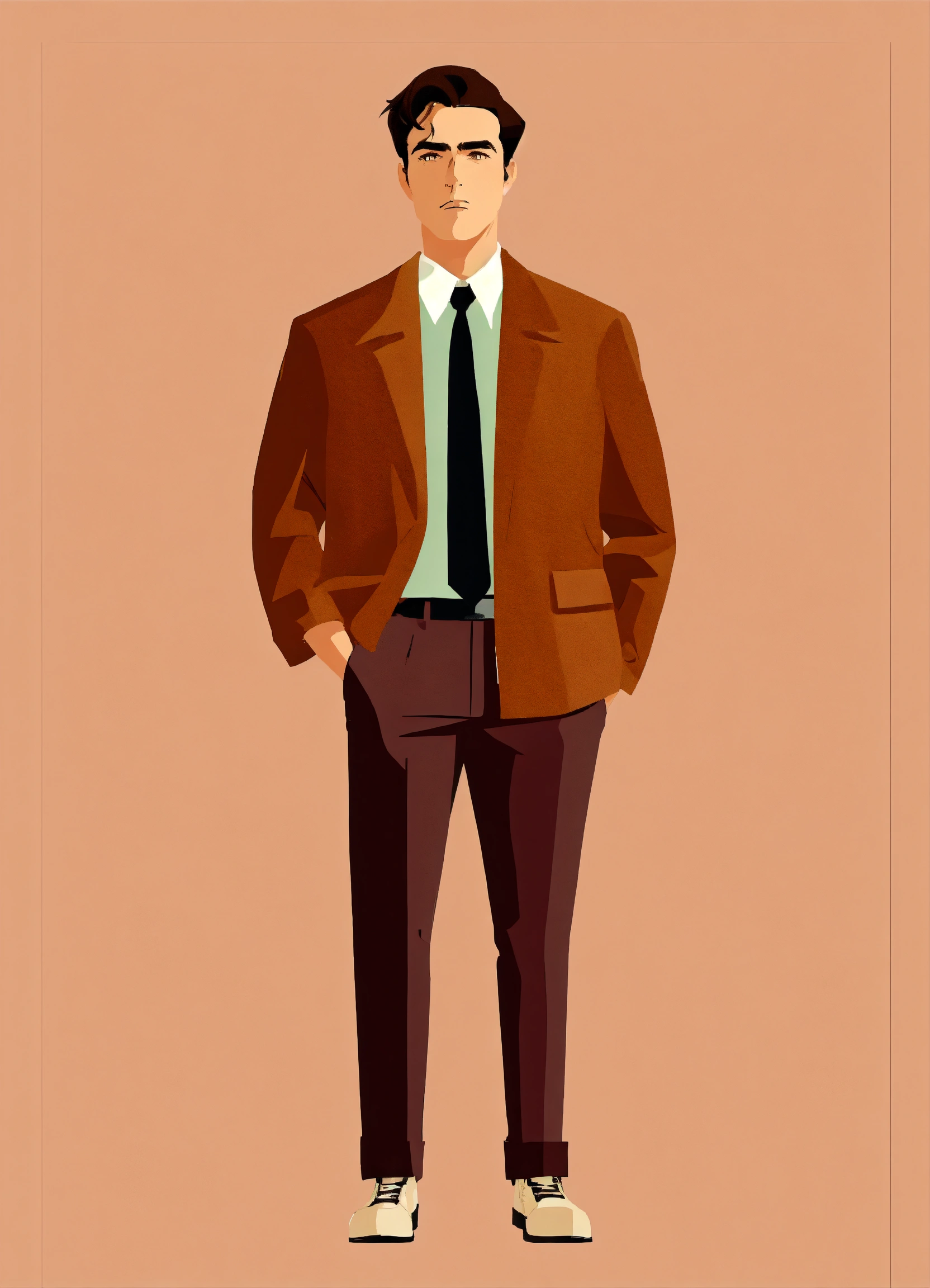 Flat design, layered, a brown haired handsome man, standing straight, with a blank expression, full body, vintage 90's