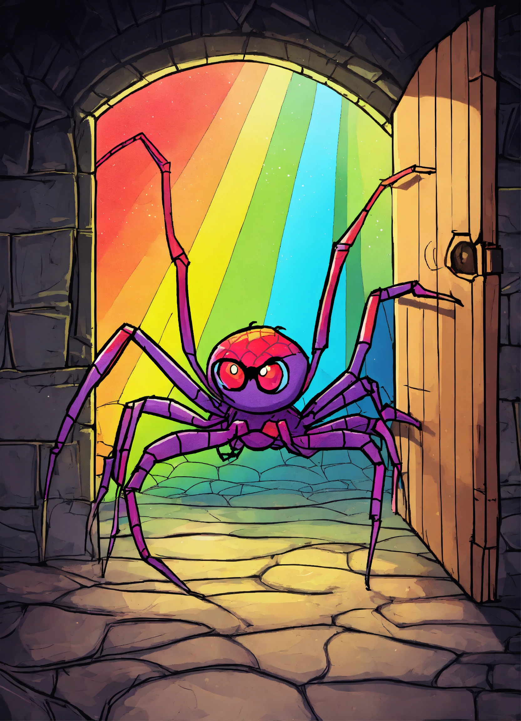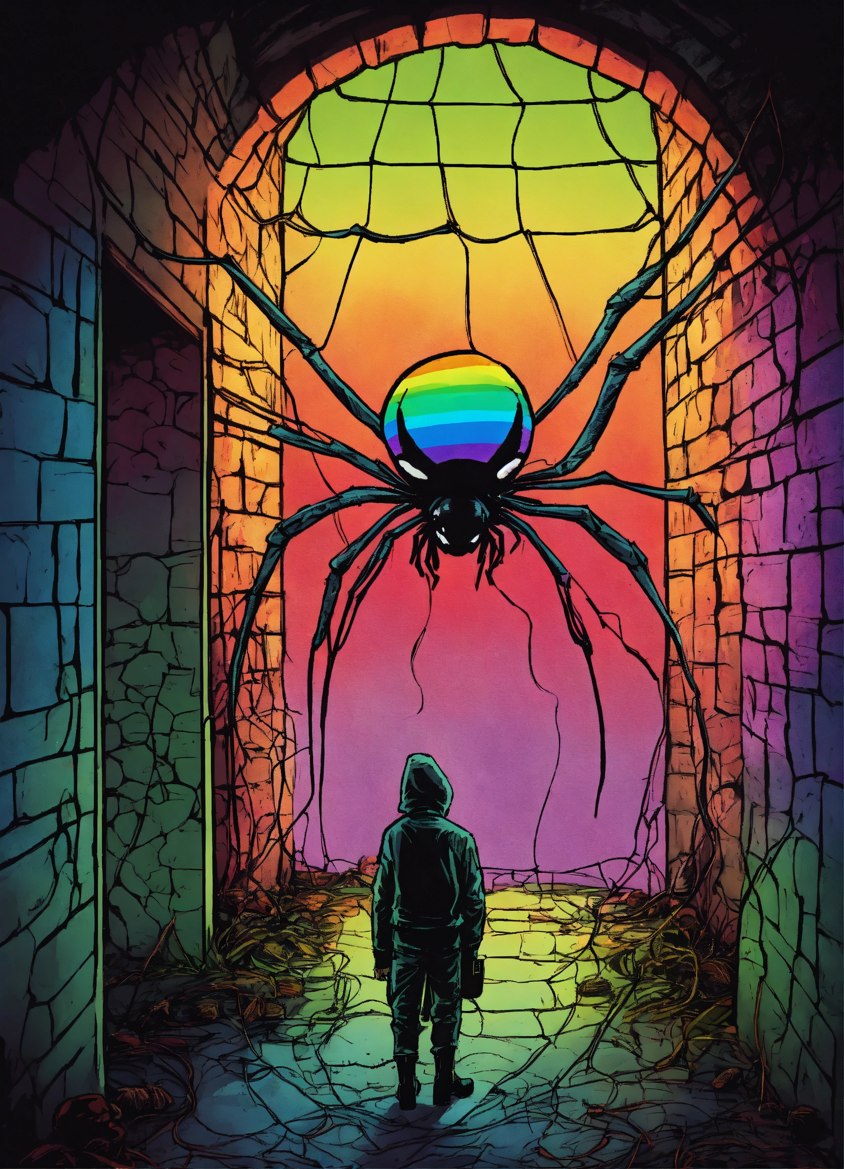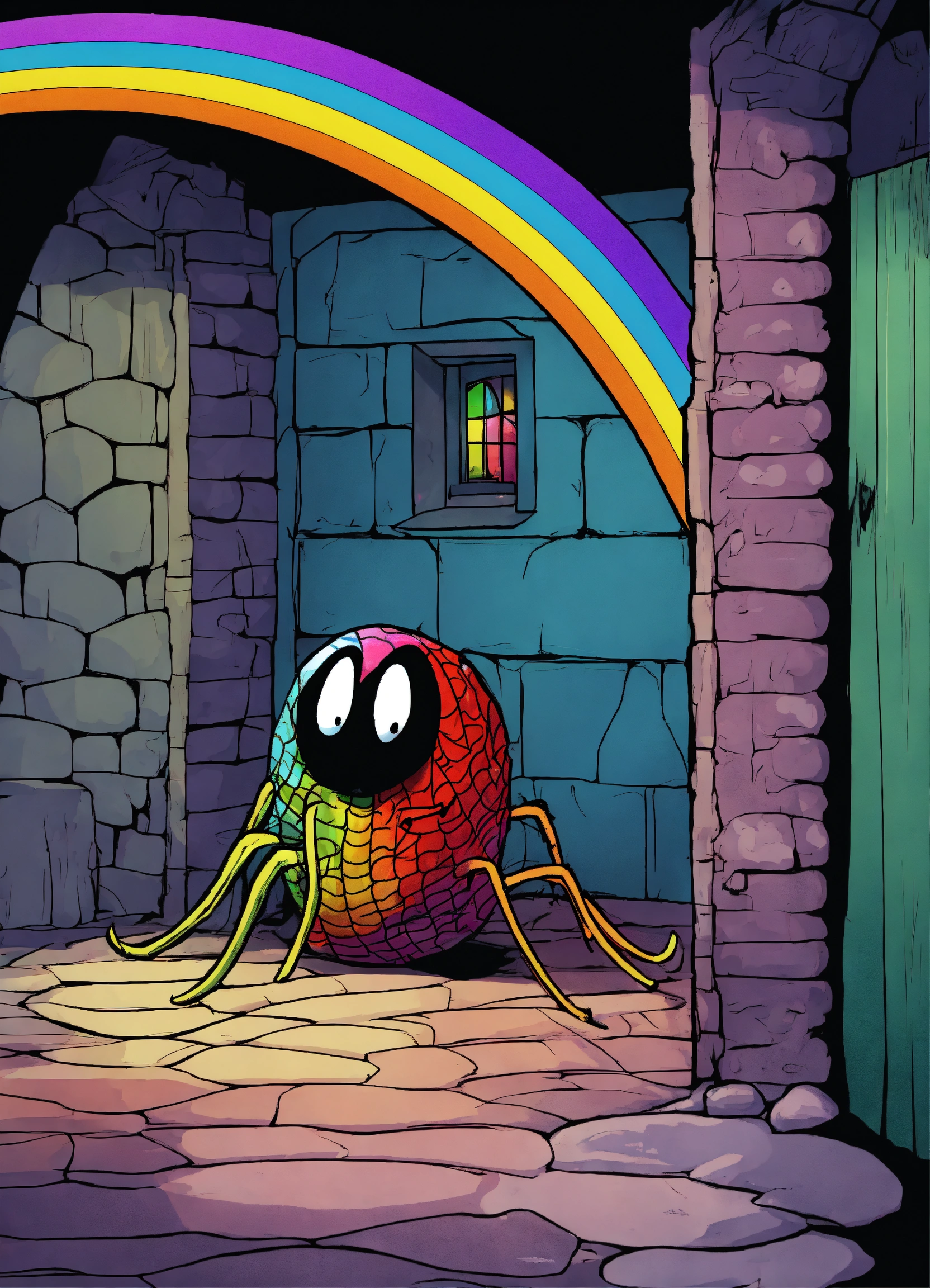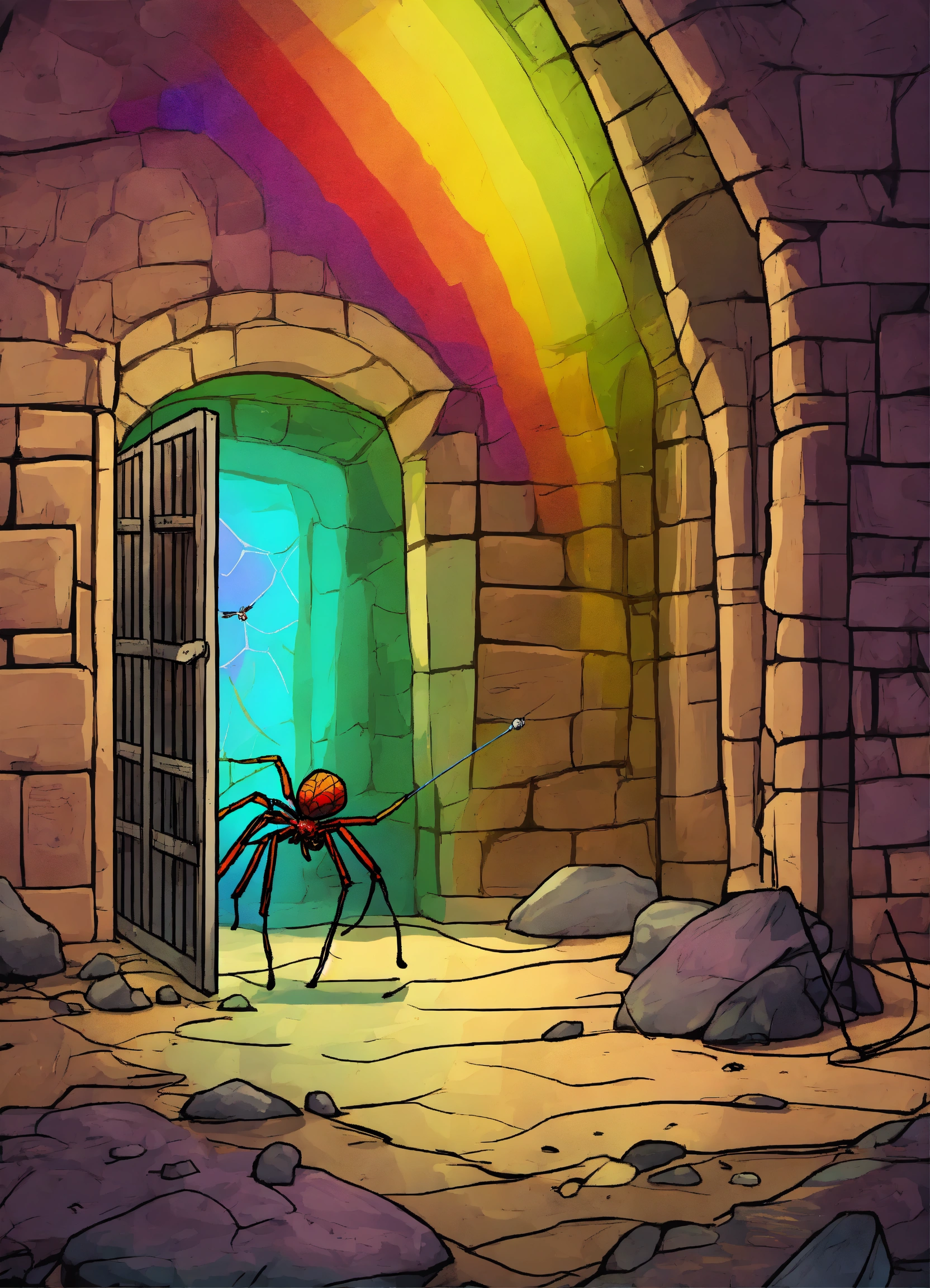 A spider hodling a rainbow in his net in a dark cellar
