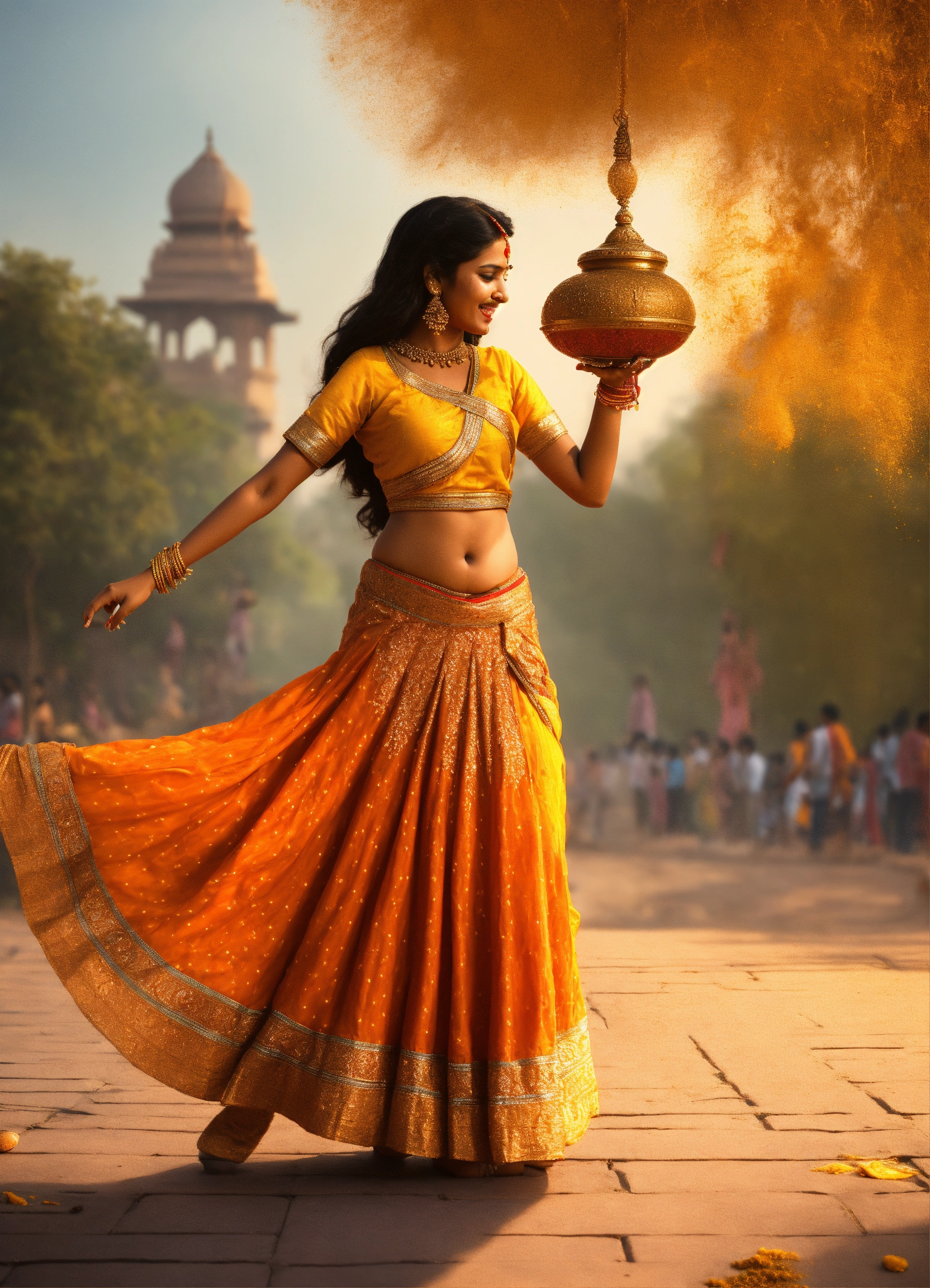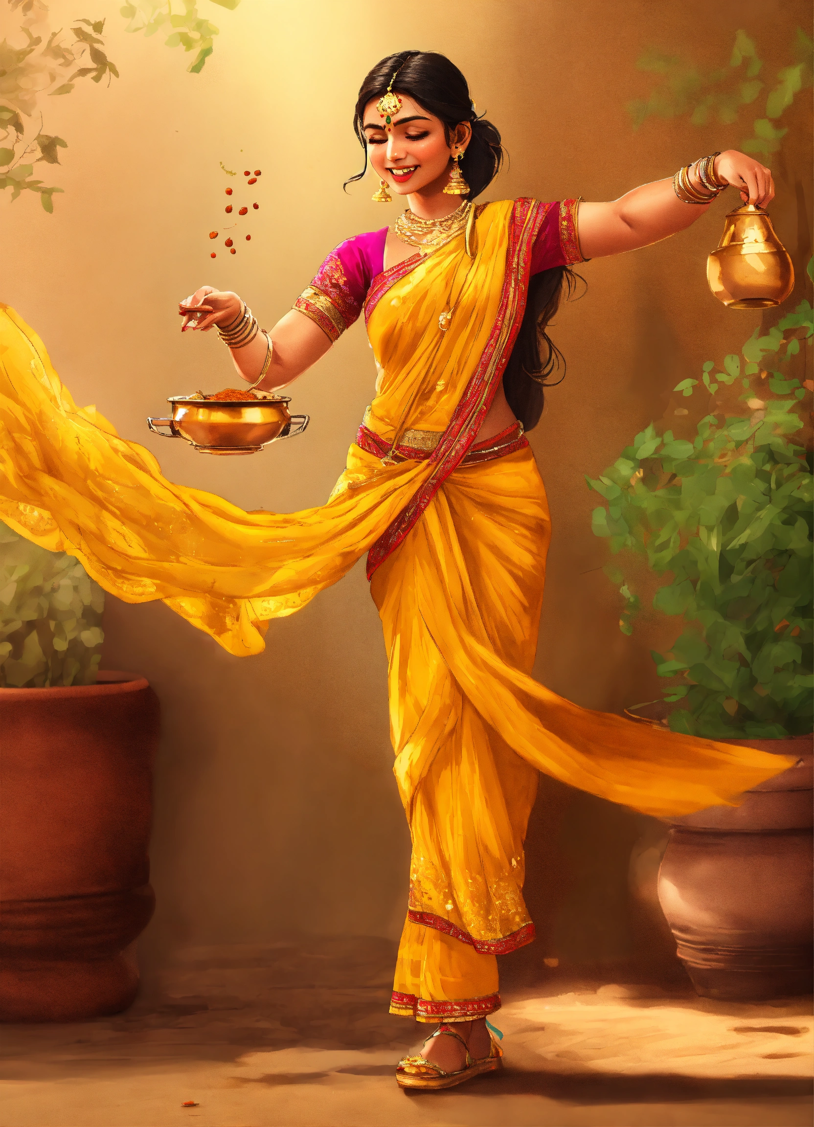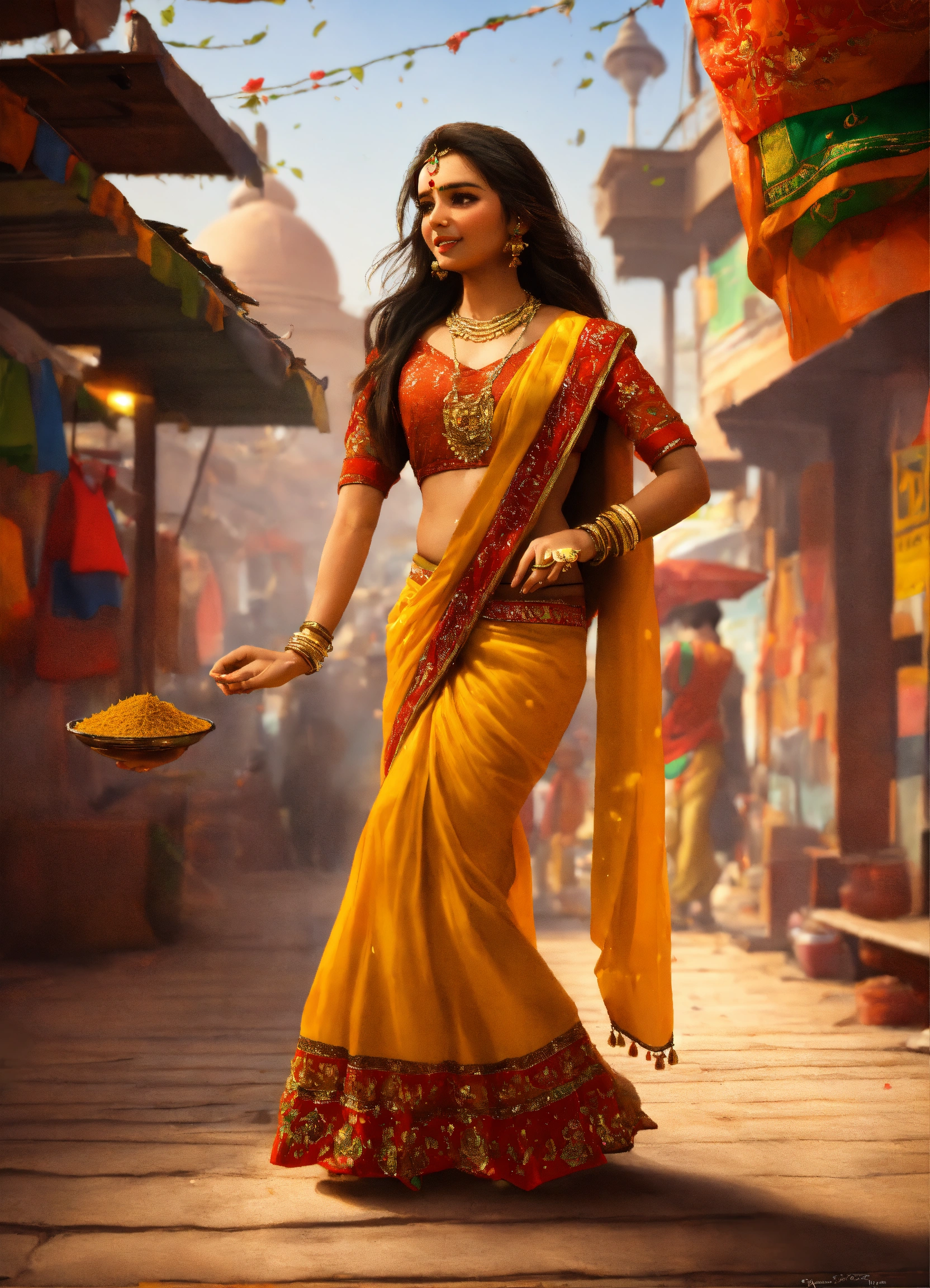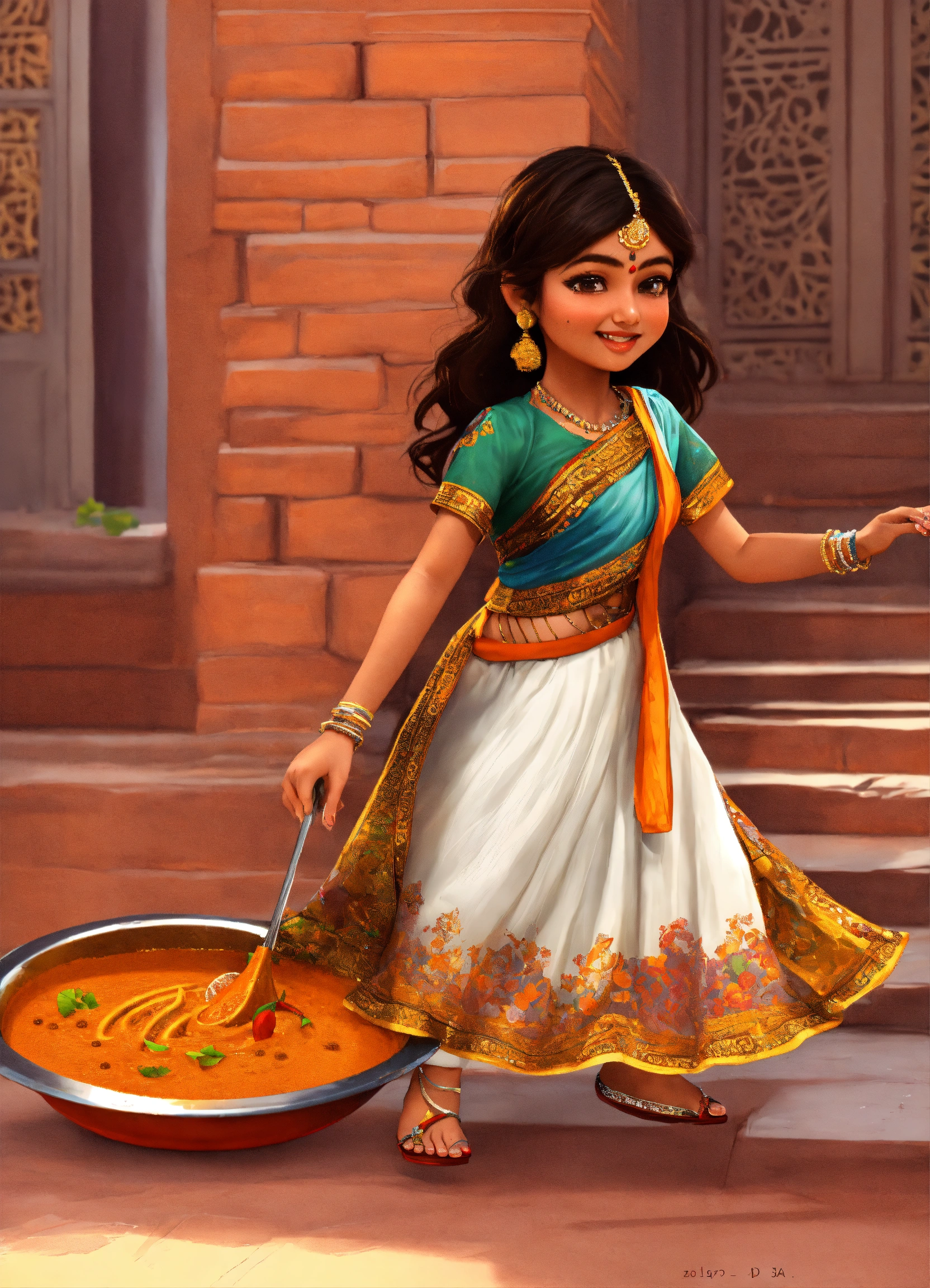 Draw an indian girl in new- delhi, she is collecting curry spice and dancing. the picture must be in 3d