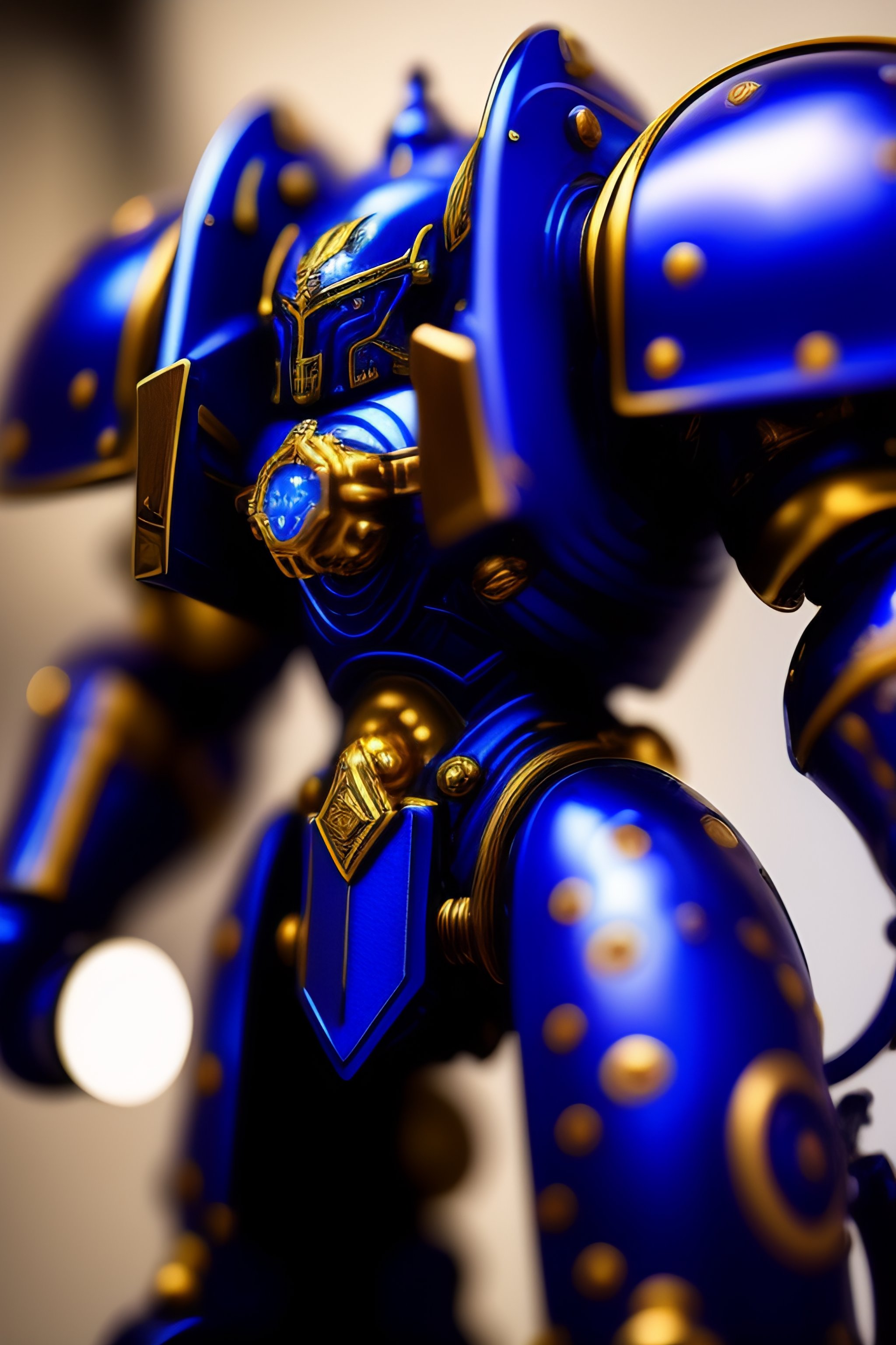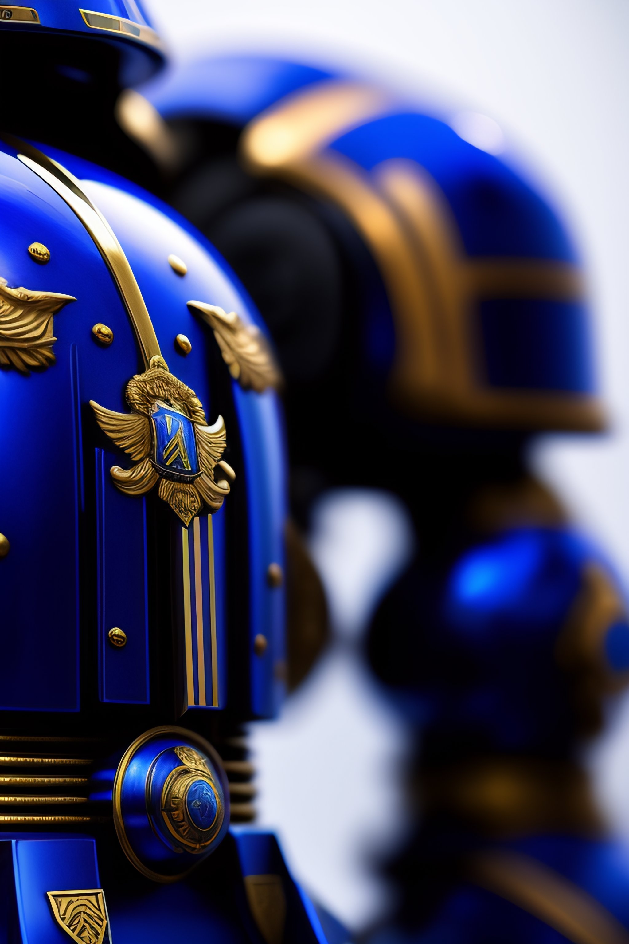 The warhammer 40k ultramarine stands tall and proud, its sleek, metallic lines glinting in the light, hyper-realistic details that bring the machine to life - from the rivets and seams in the armor plating to the subtle scratches and weathering that mark its surface.