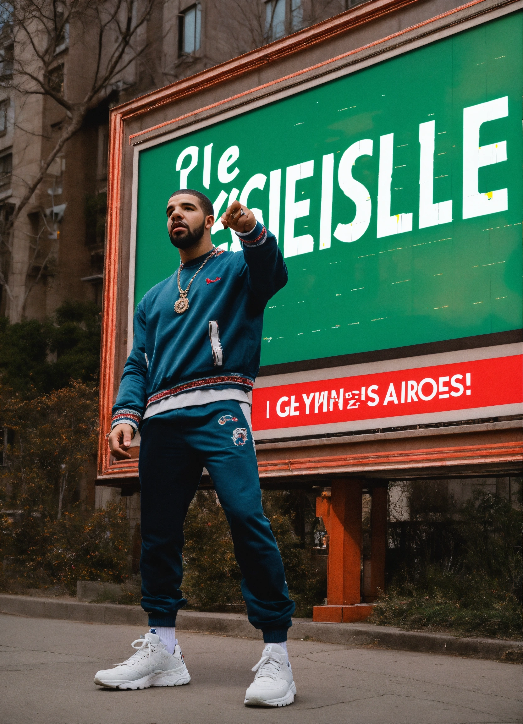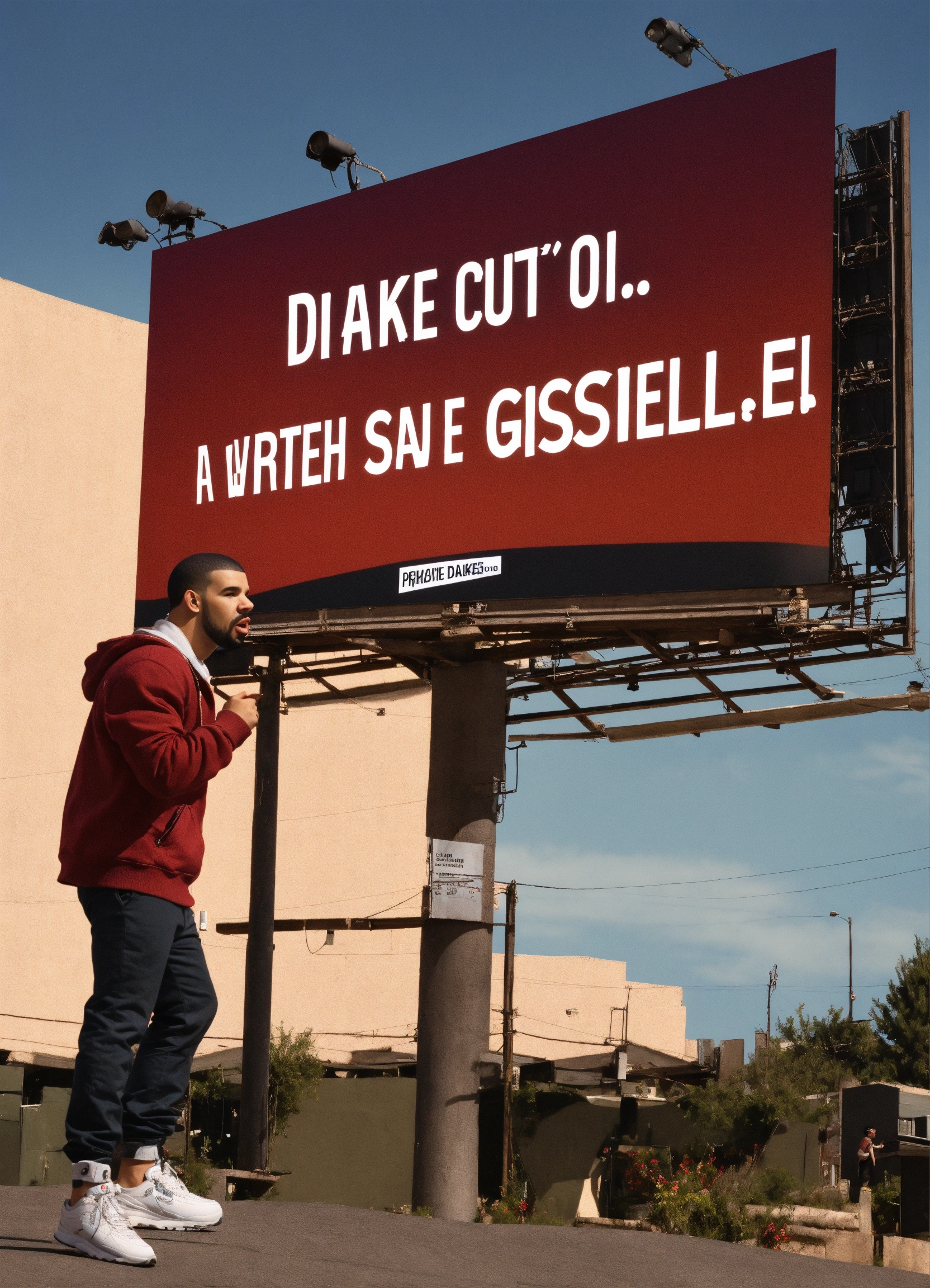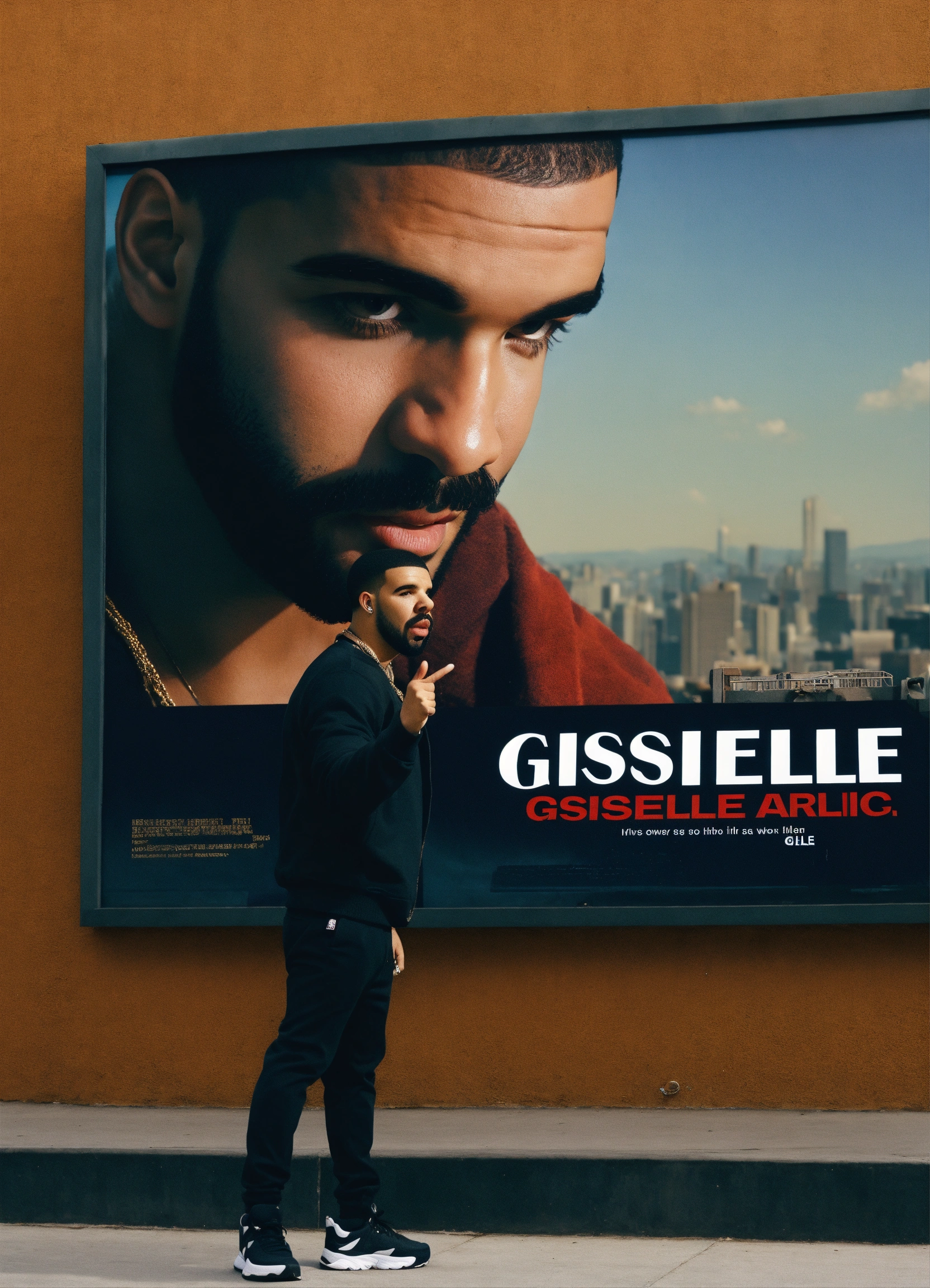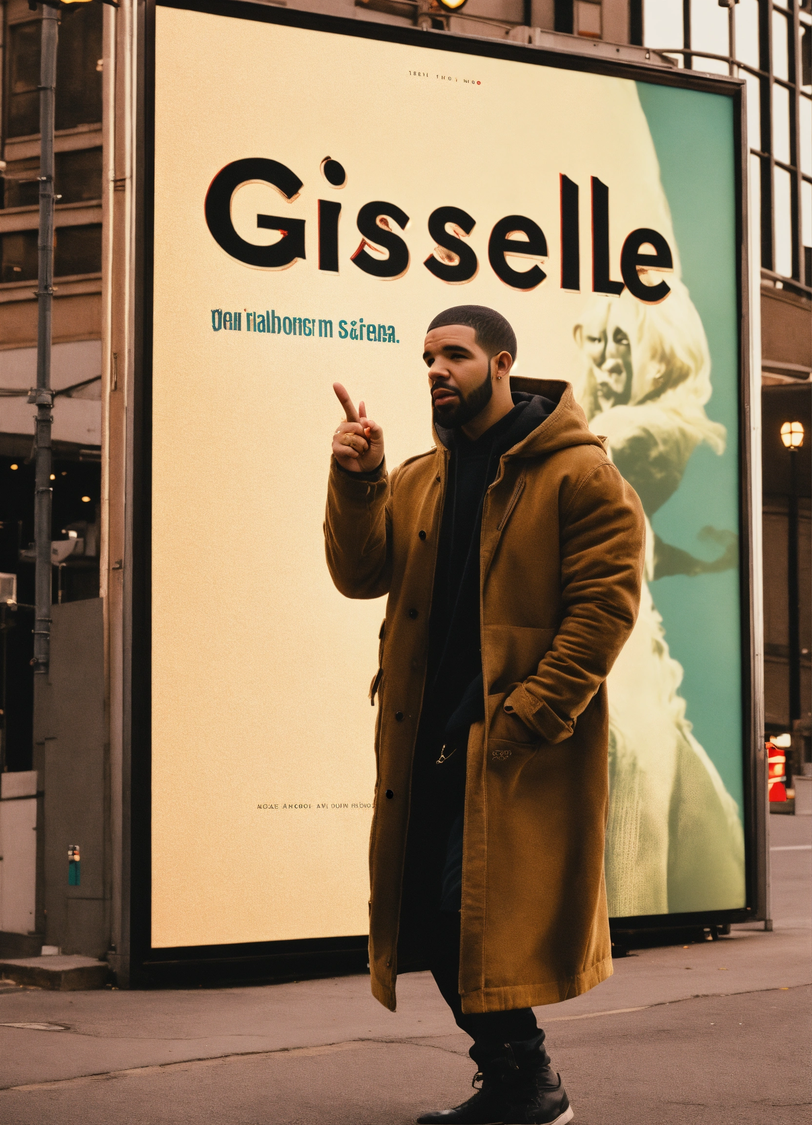 Drake pointing at a billboard that has the words written giselle