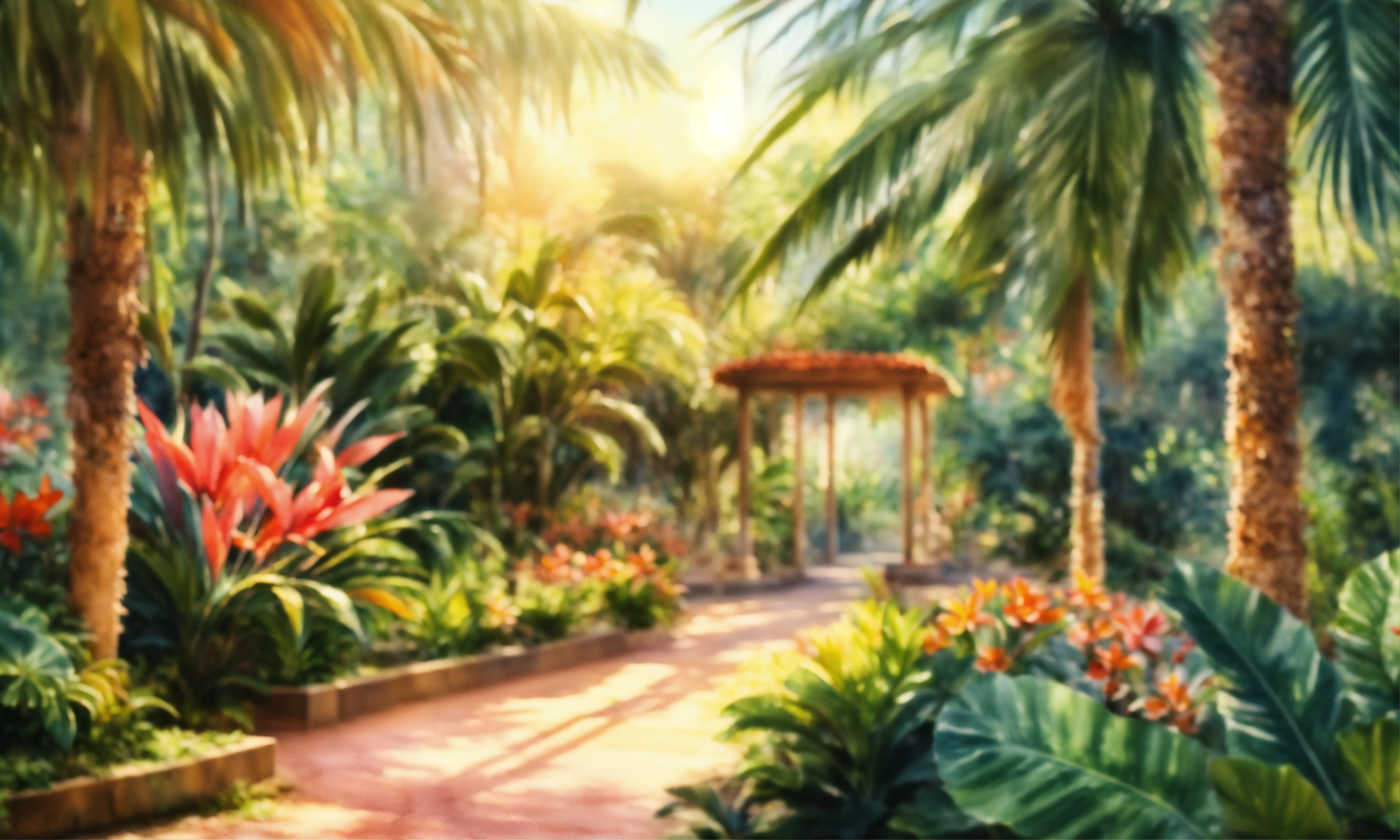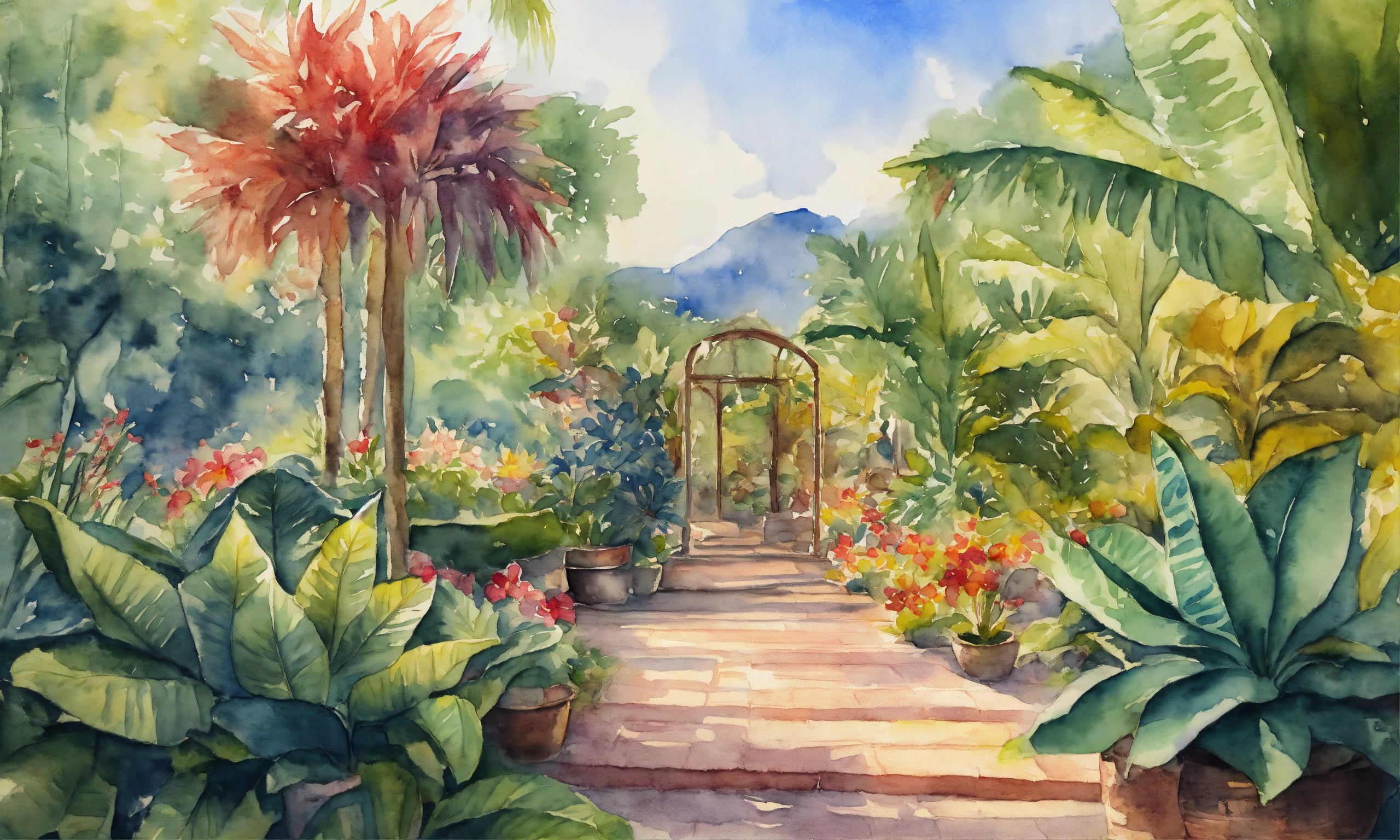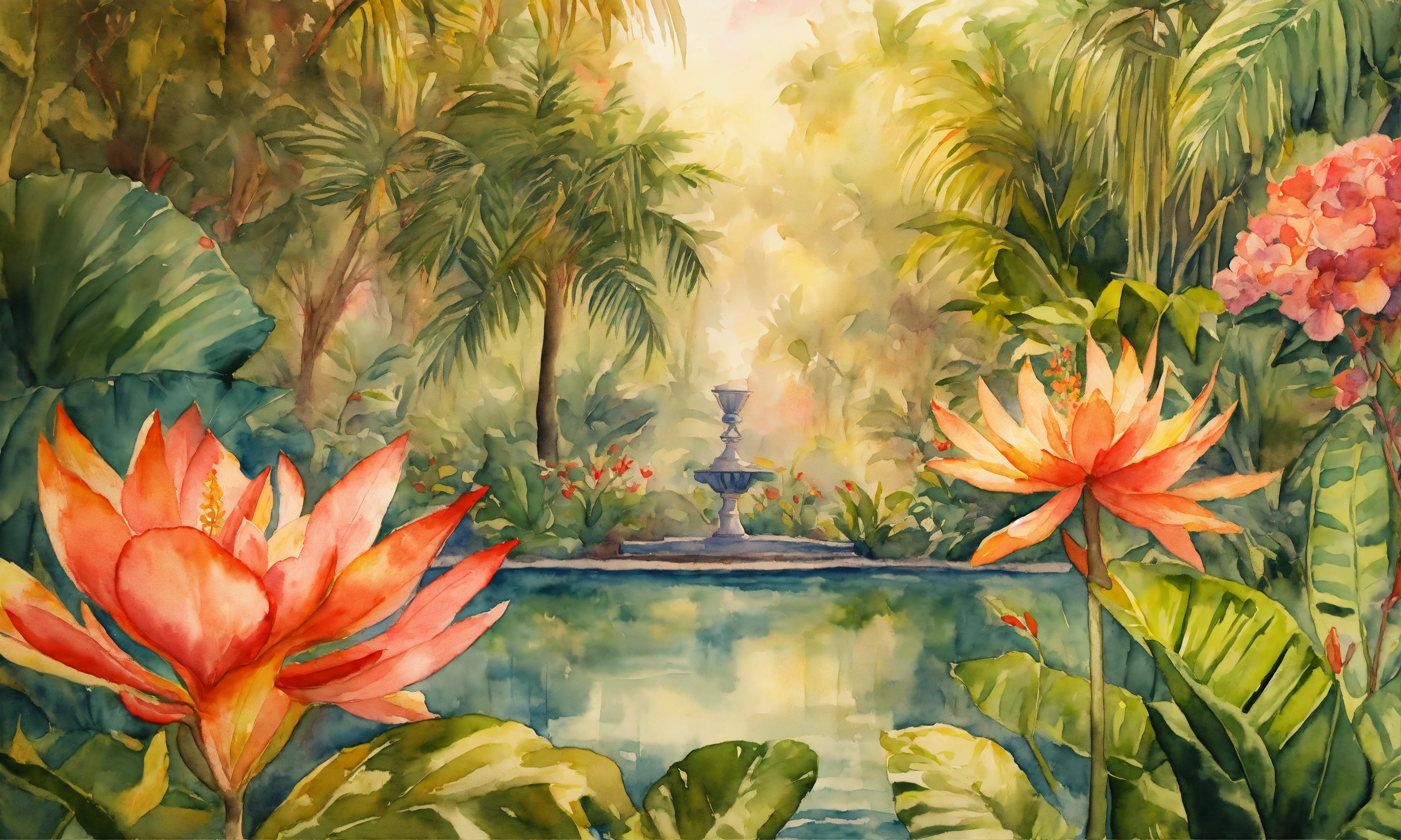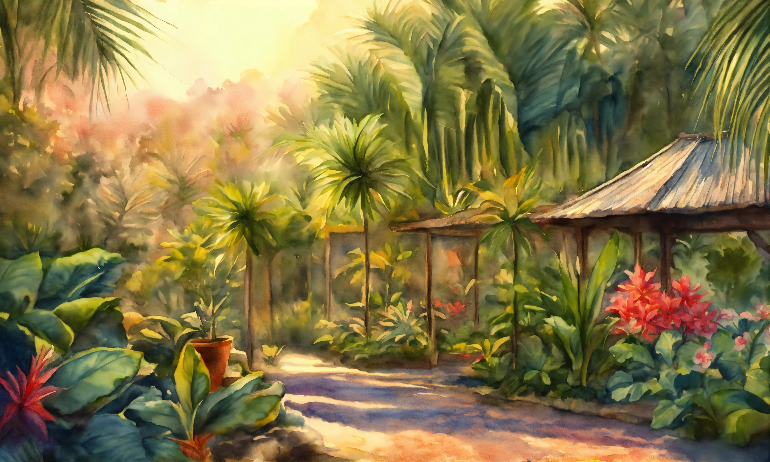 Watercolour painting, beautiful tropical garden, warm light, intricate and detailed, 8k, ultra-detailed, sharp focus