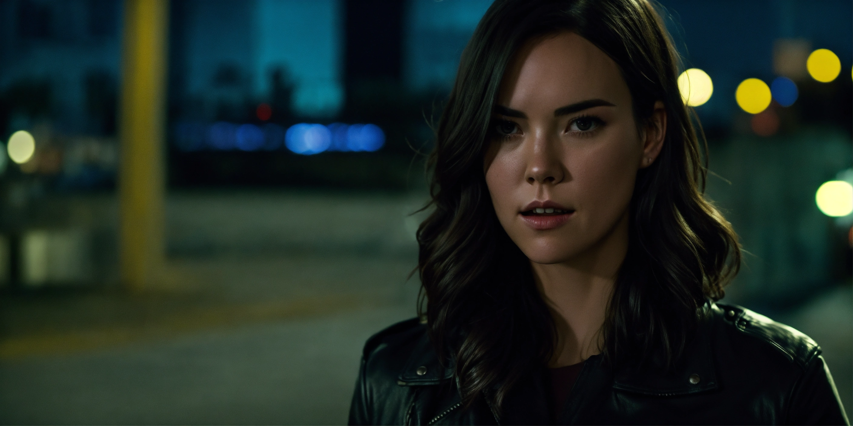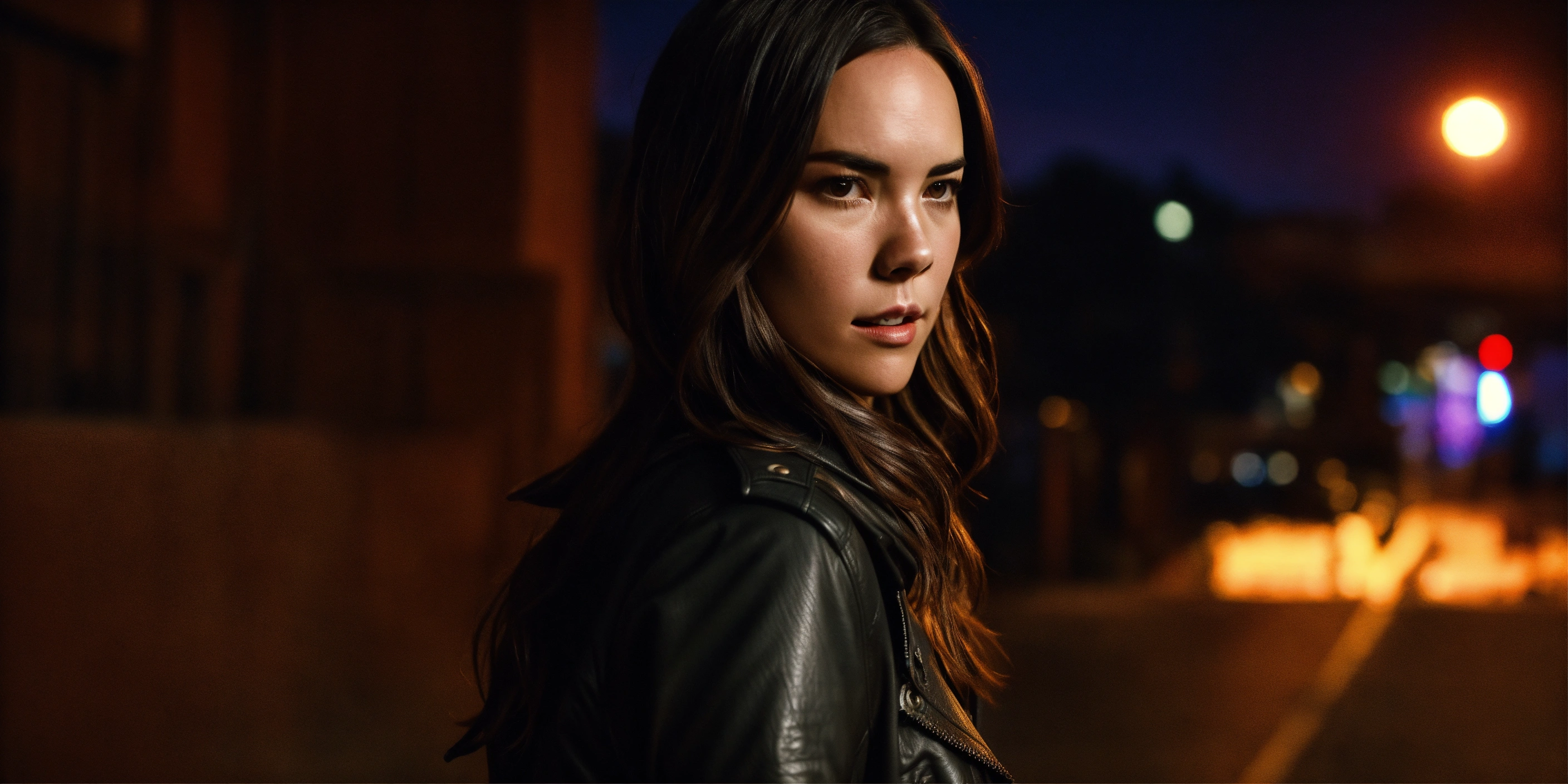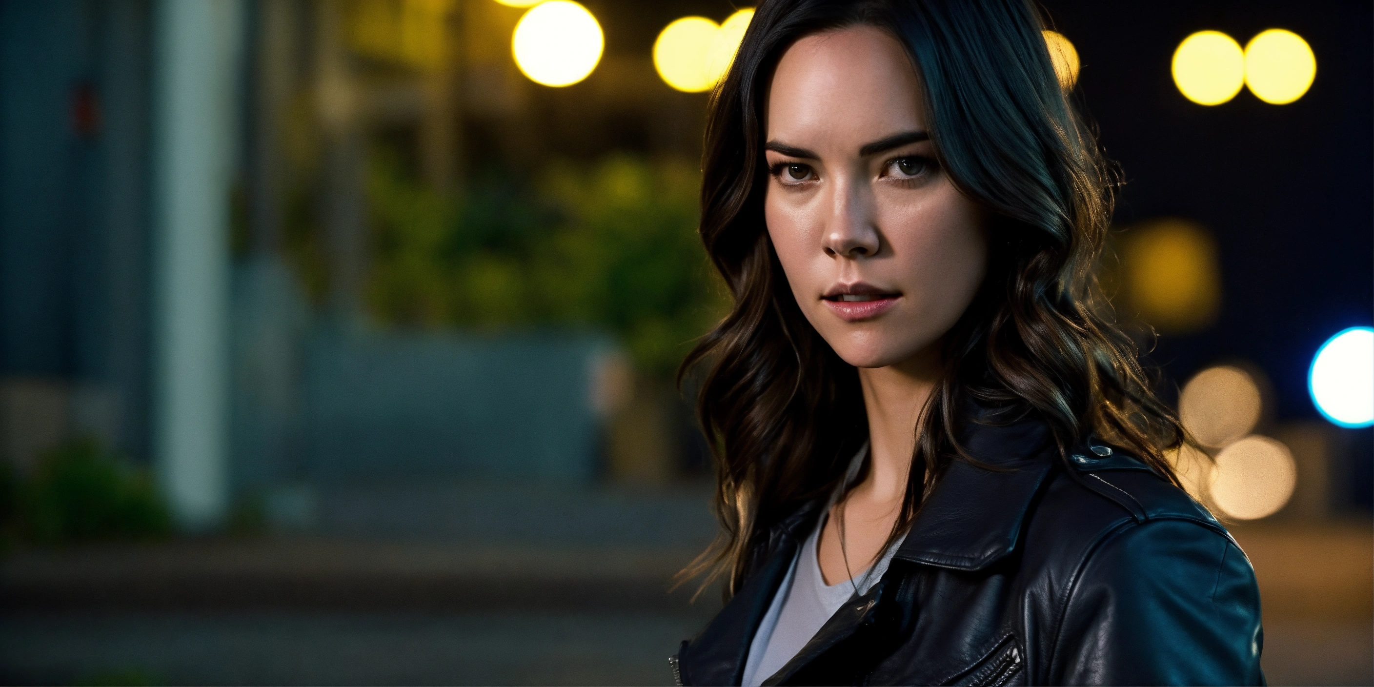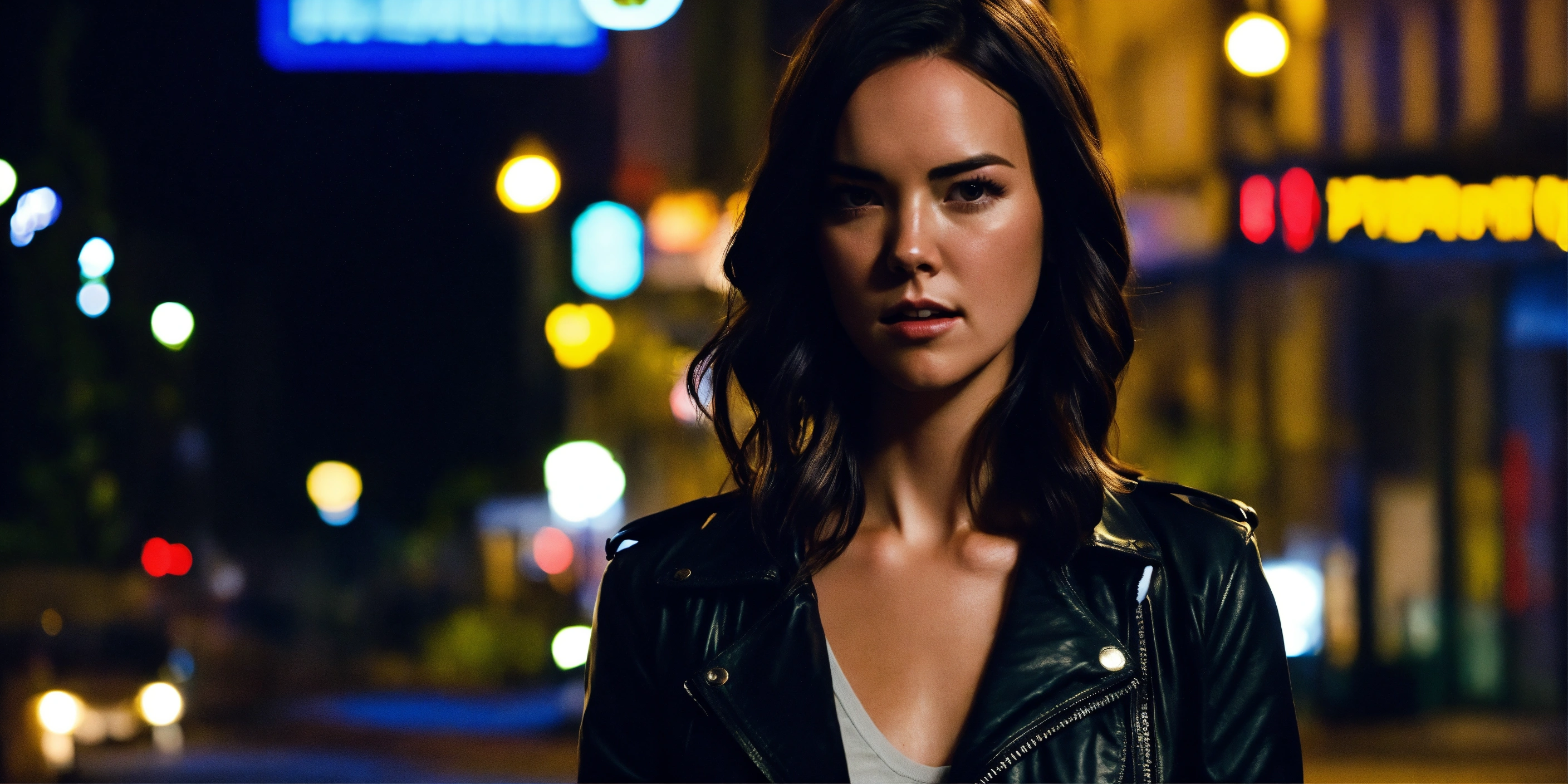 Very beautiful 27 years old odette annable, cute big eyes, crime survival serial killer victim, suspenseful, night, city, life-or-death situation, leather jacket, cinematic, realistic walk, closed mouth