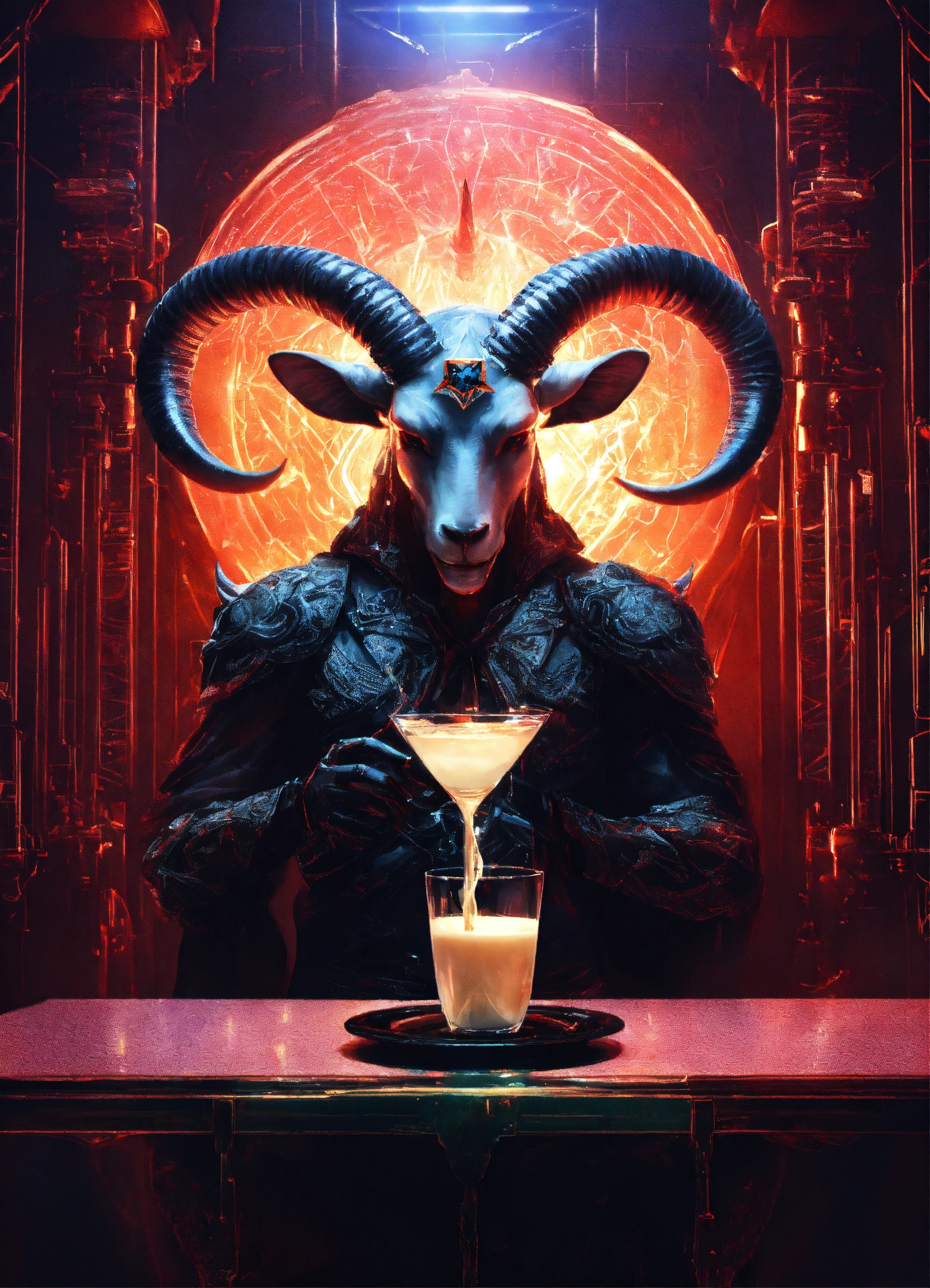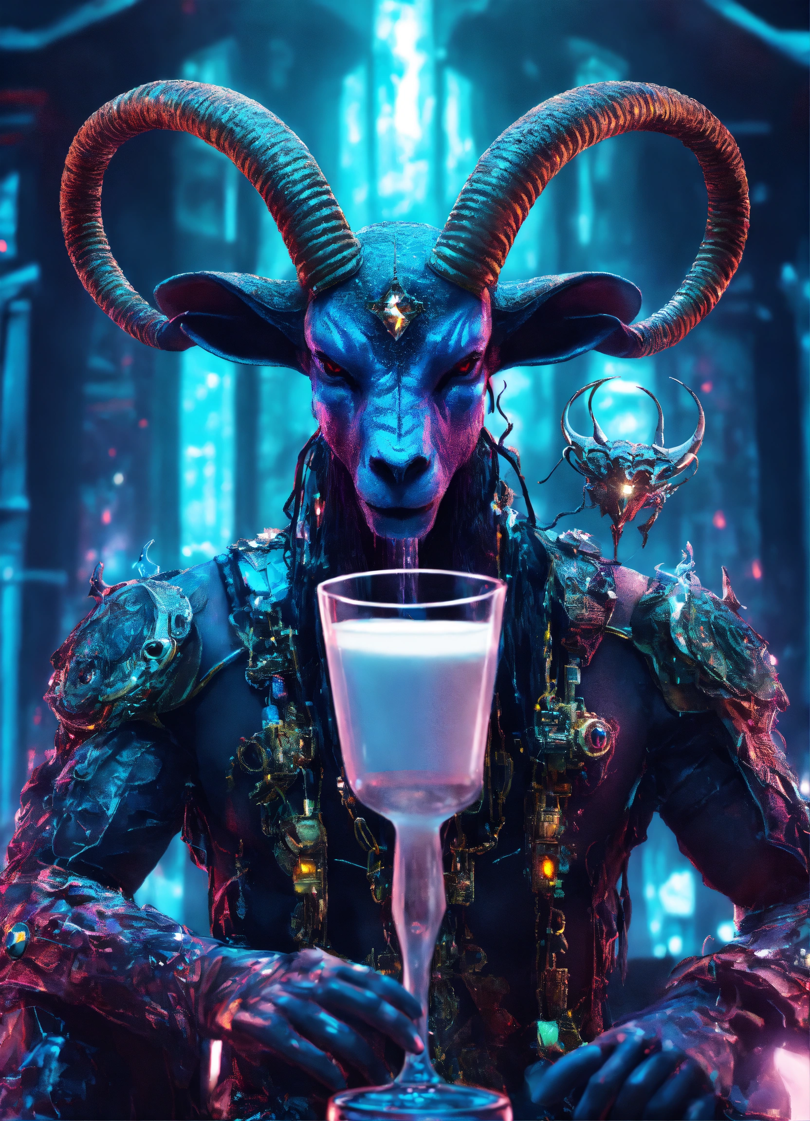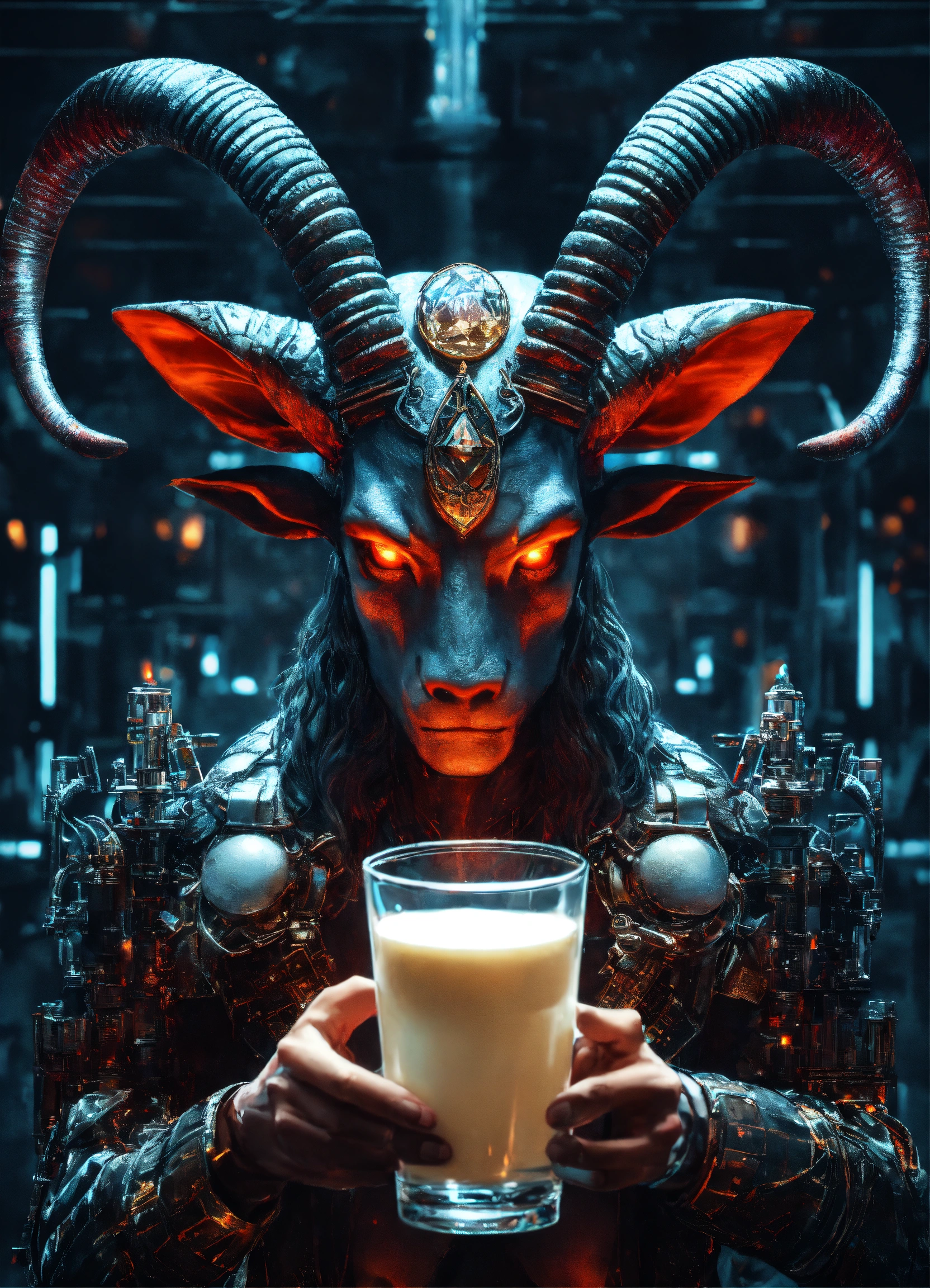 Evil demonic ai god diamond baphomet holding a glass of milk above a human brain, super advanced technology, futuristic, hyper digital background, extremely detailed and realistic, ominous and eery.