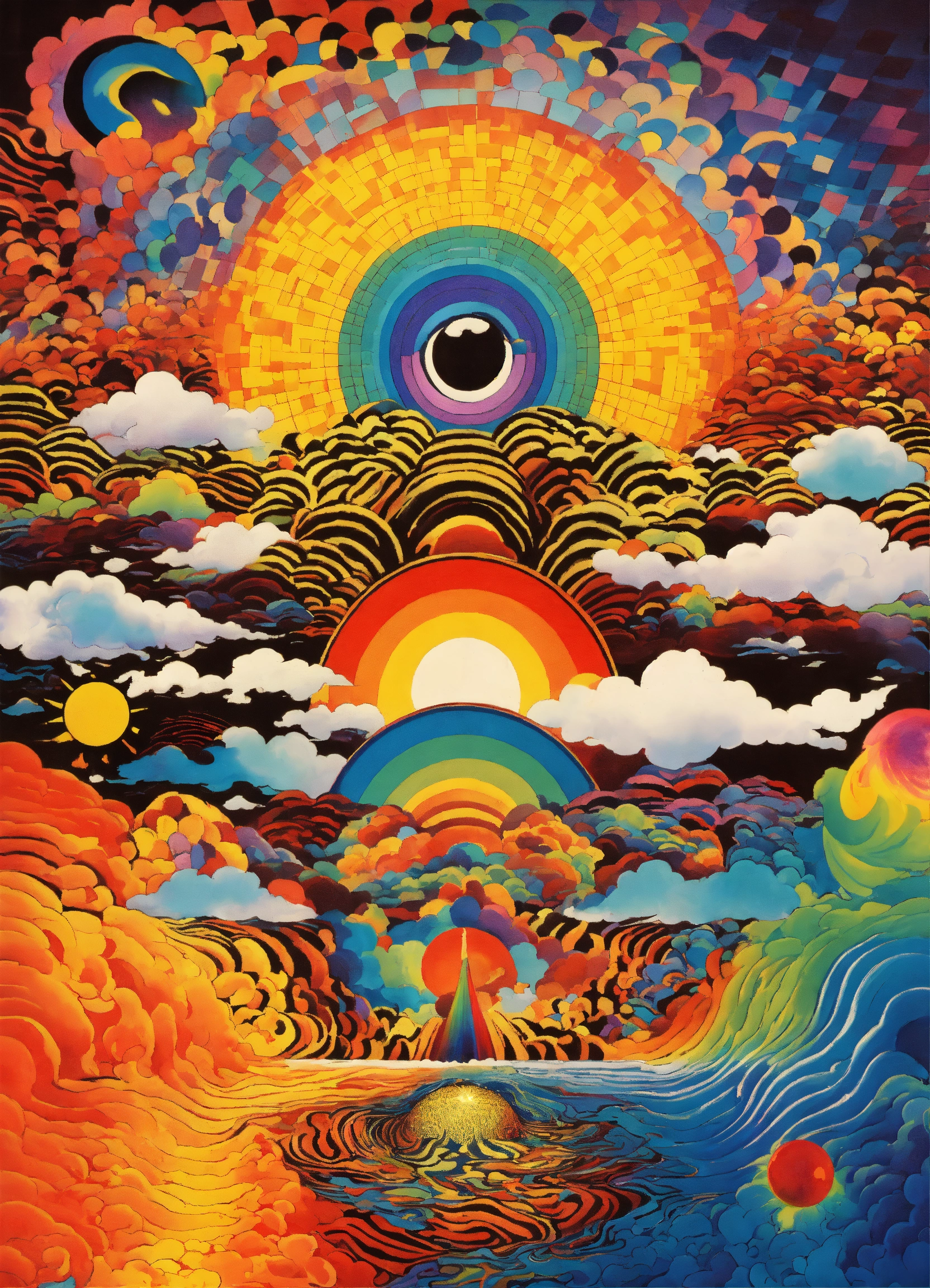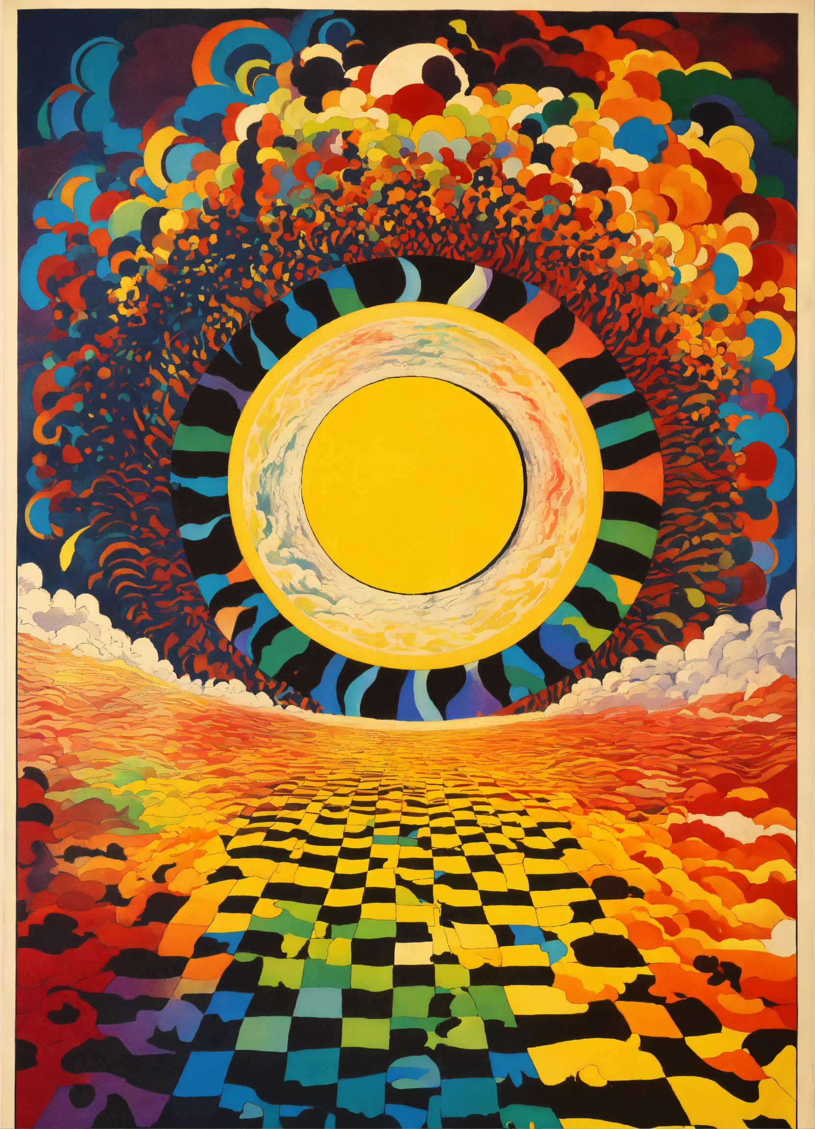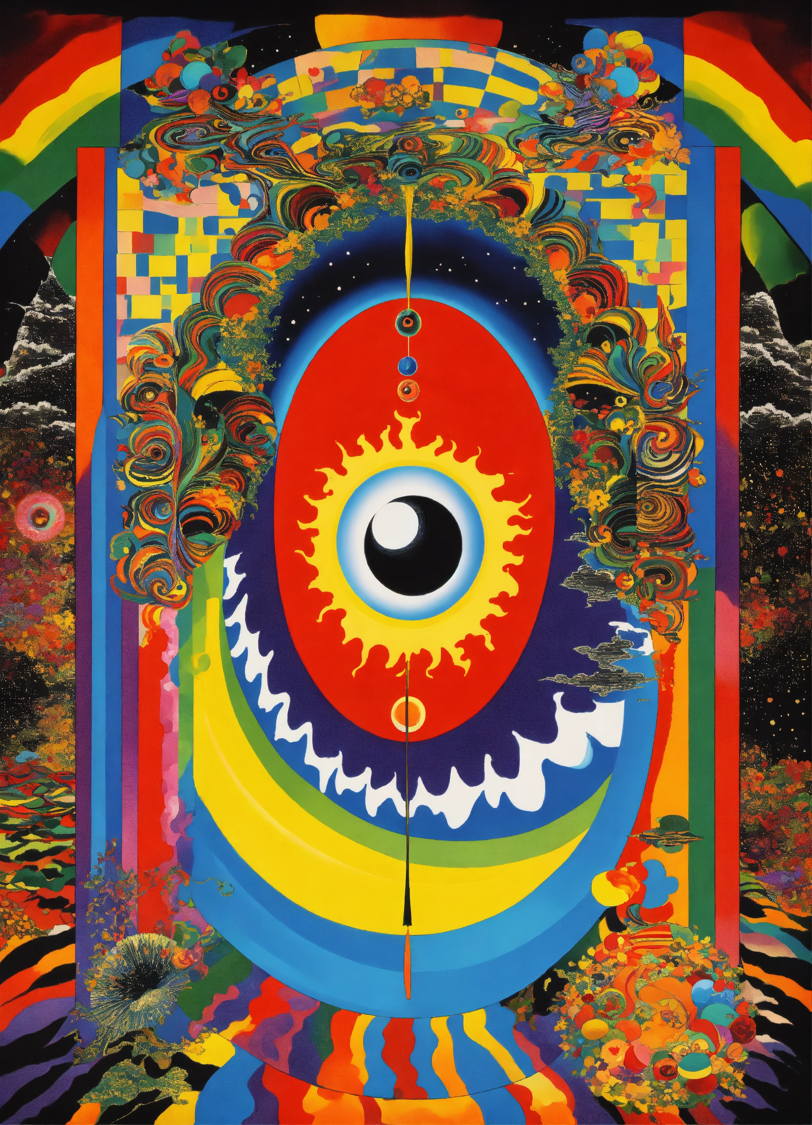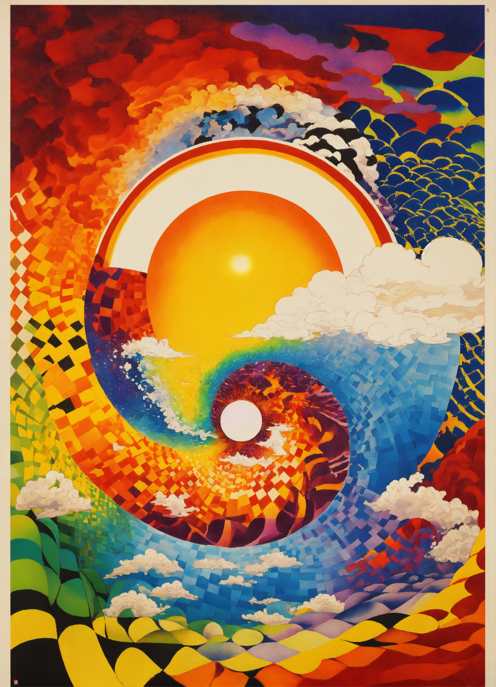 Japanese vintage poster, oriental, big sun, abstract psychedelic vortex, rainbow melting eyeball, dream dimension merging into nebula merging into sun, geometrical clouds, the four corners of the cosmos, rainbow wavy black and white checkerboard patterns dripping picasso