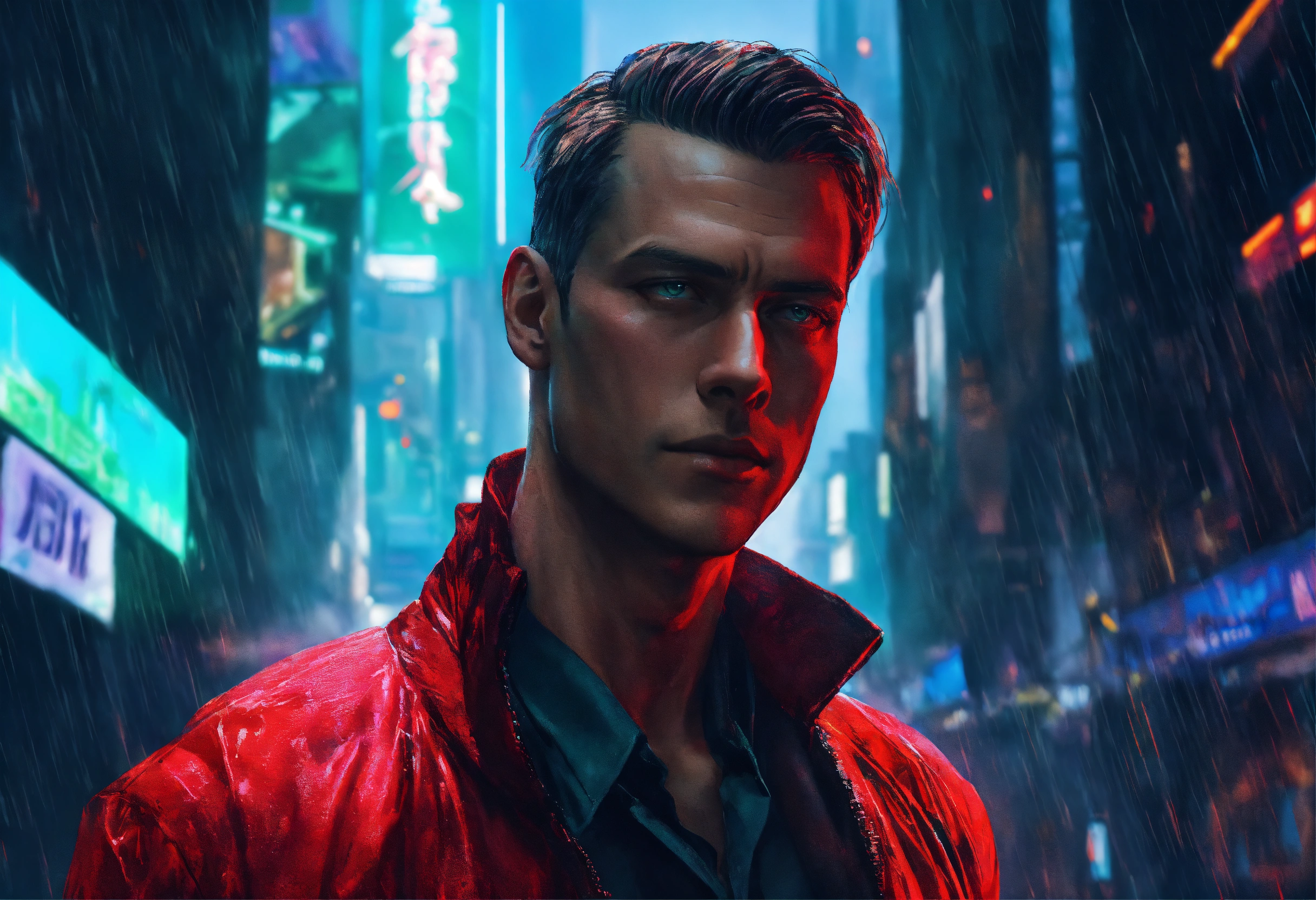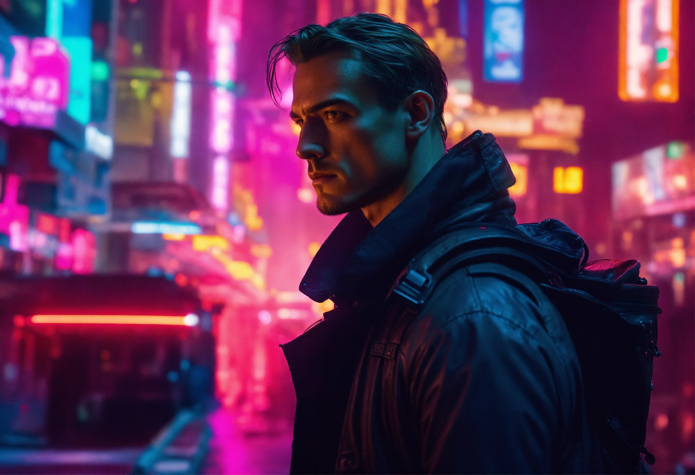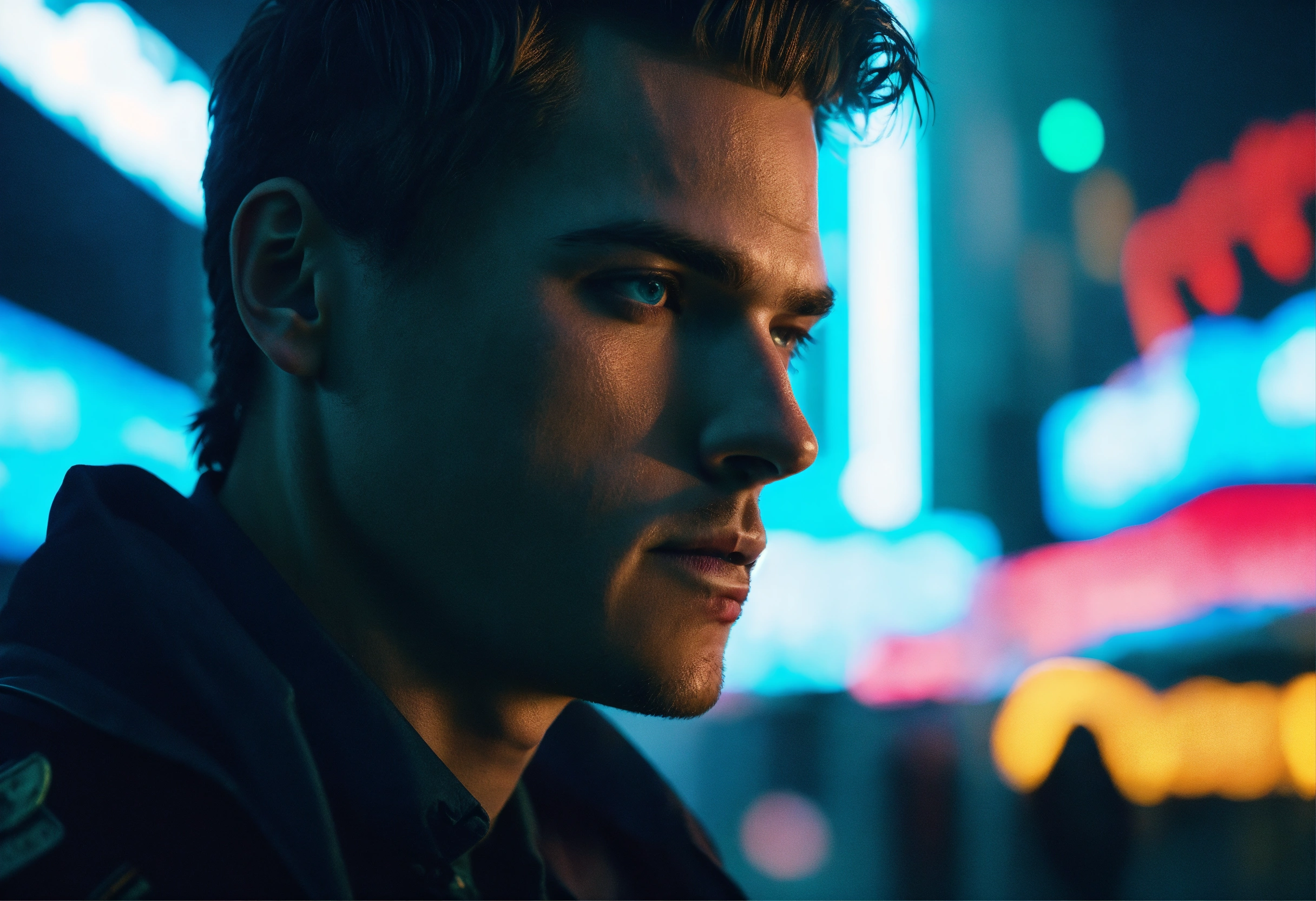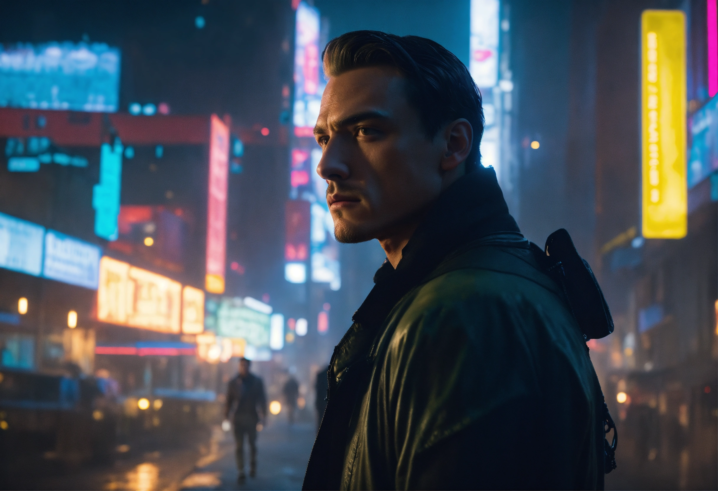 Handsome tall man, kinnaman, apocalyptic, altered carbon, dark, walk, city, white, light, neon, cinematic, epic, detailed, realistic face