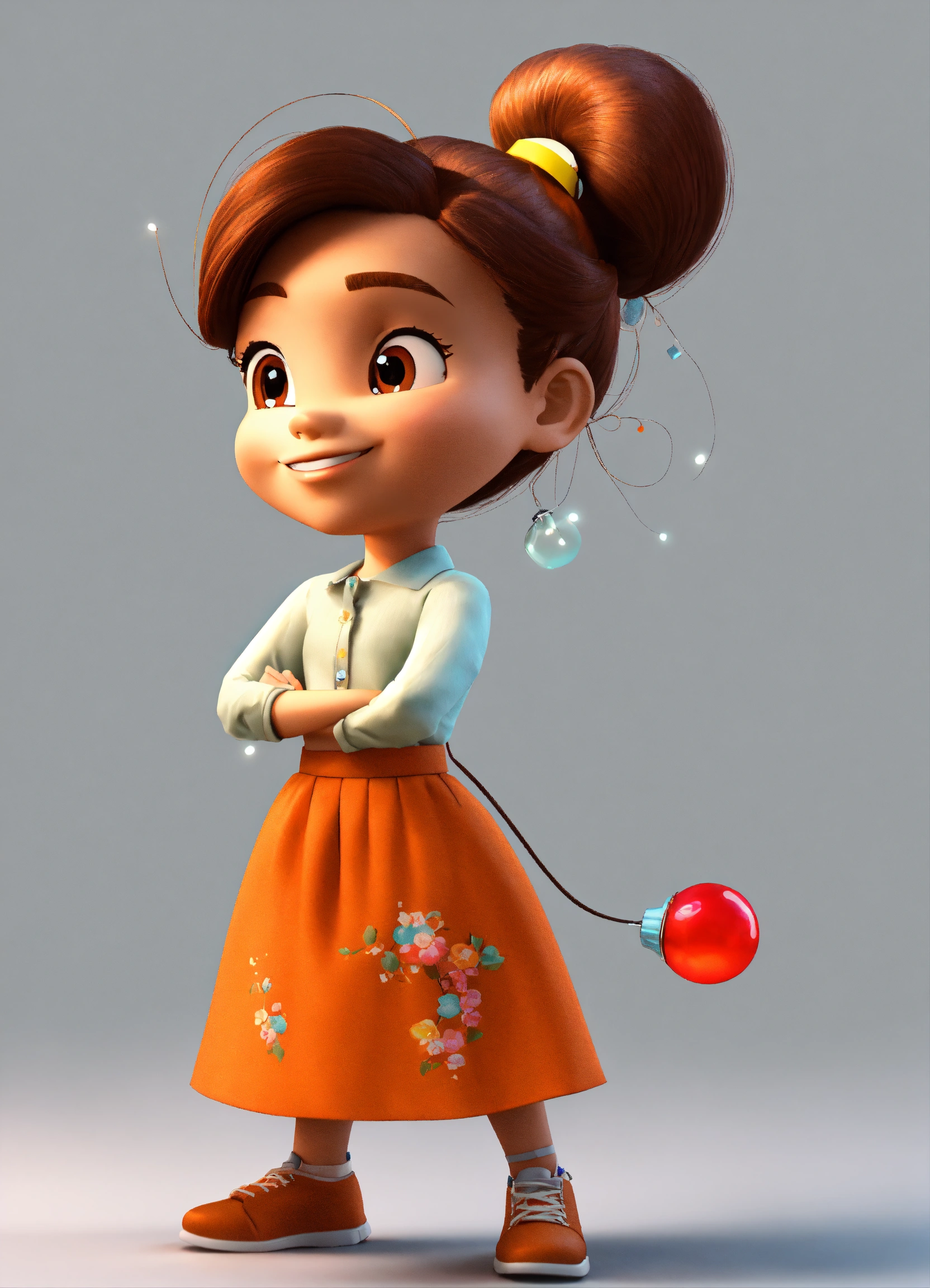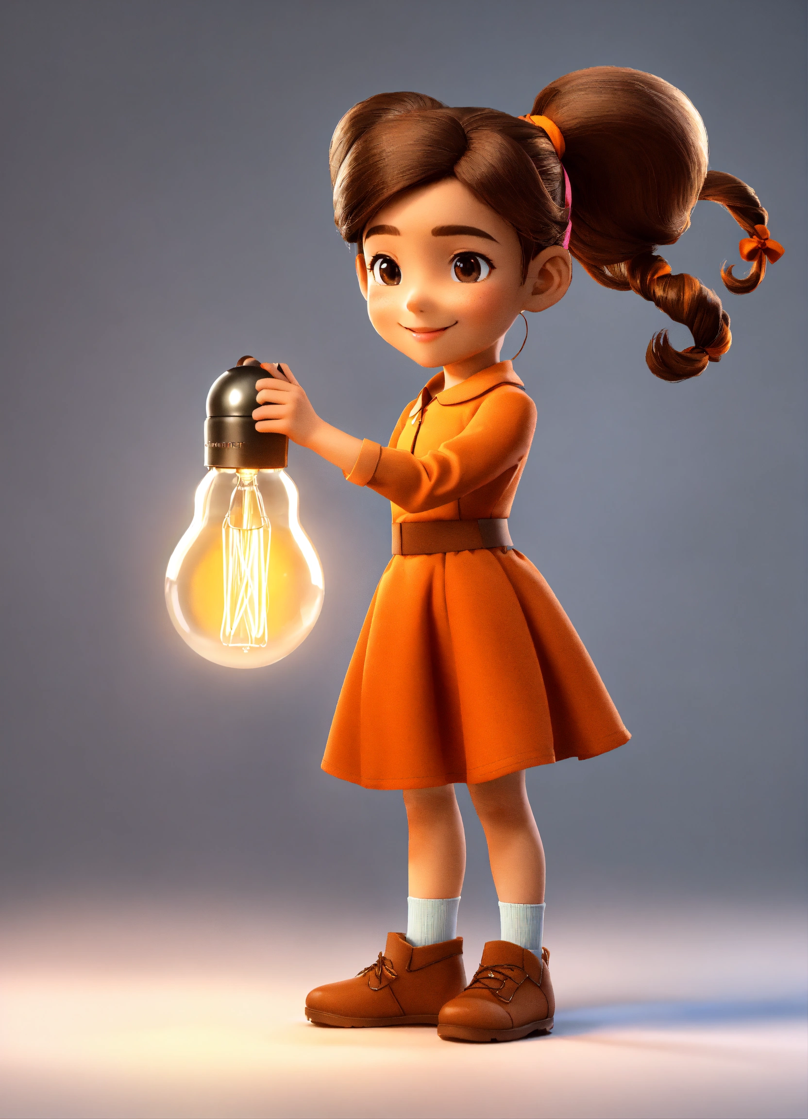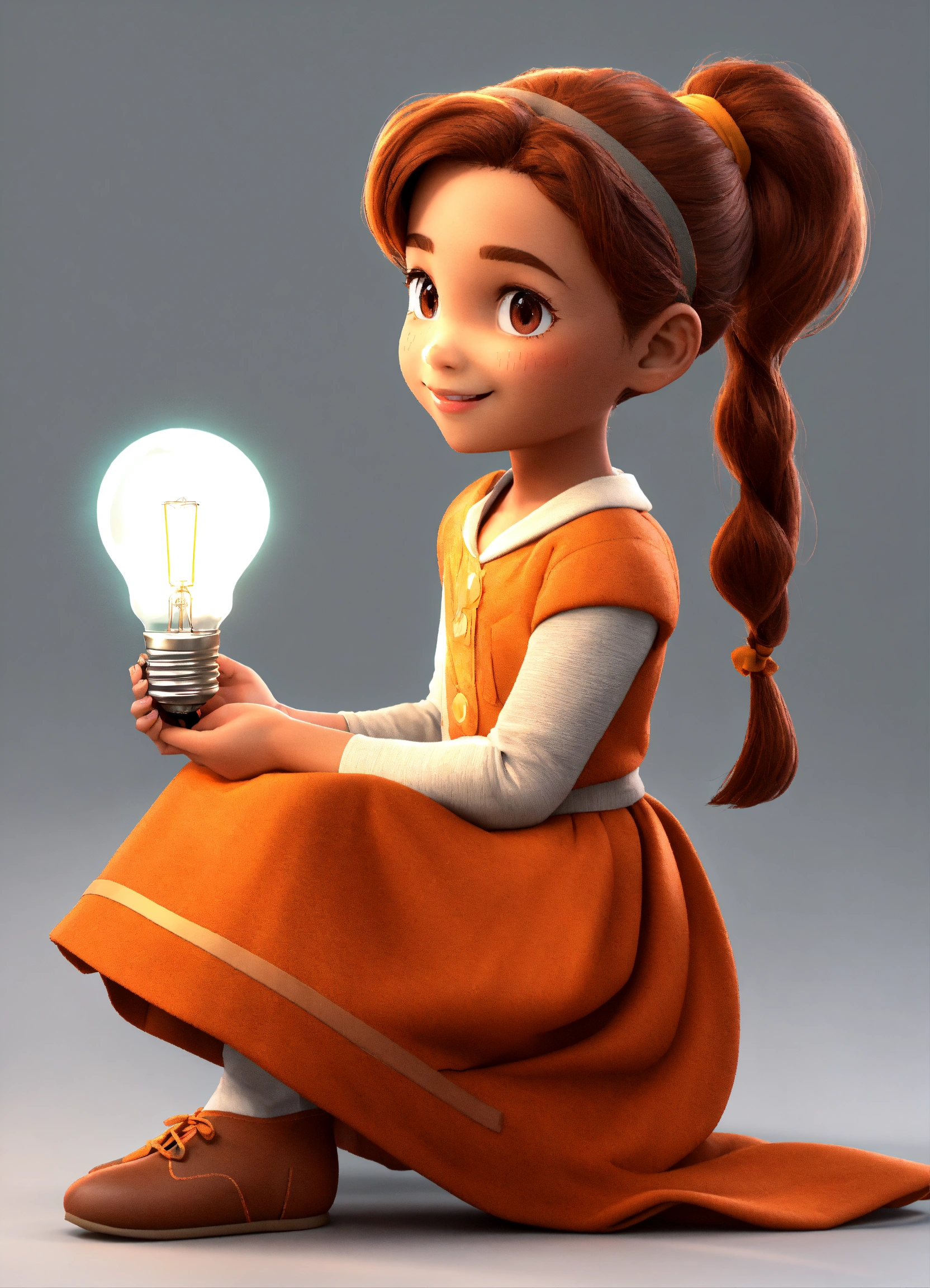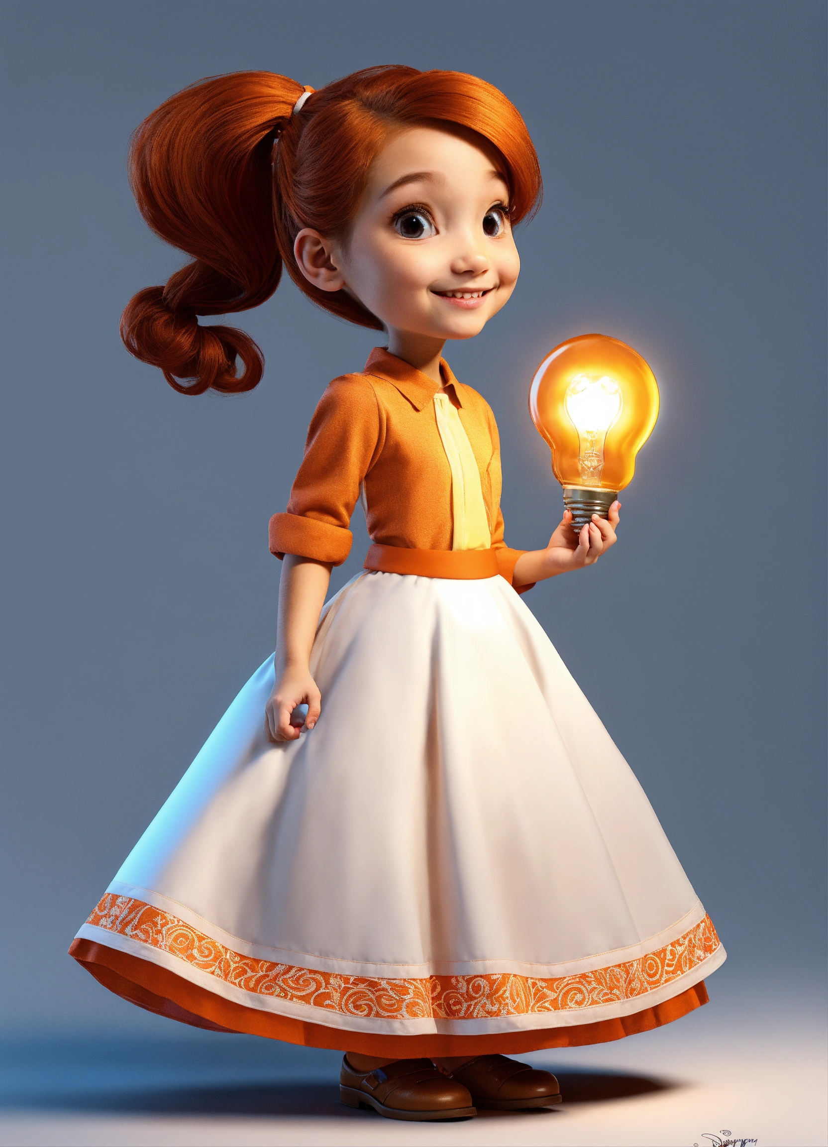 8 year old. happy girl with light skin, with ponytails and a hair handband hair in color. orang-brown, and a long skirt and a shirt. drawn from the back, looking to the side. with long sleeves. holding a light bulb in her hand, by disney concept artists, elegant, sharp focus. 3d style. happy. white background