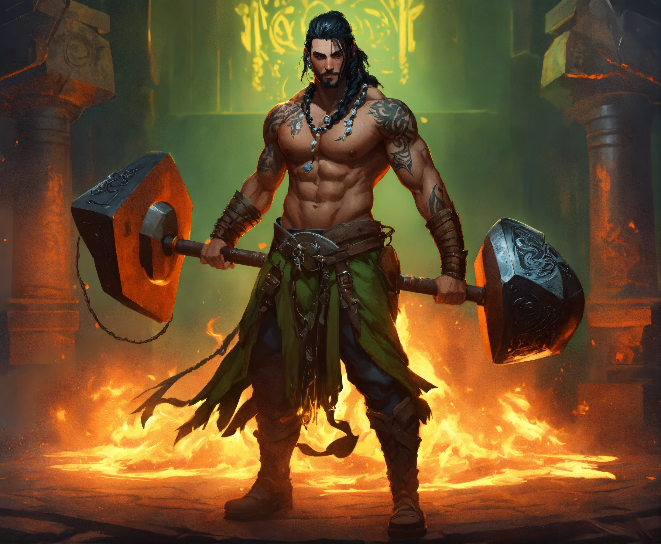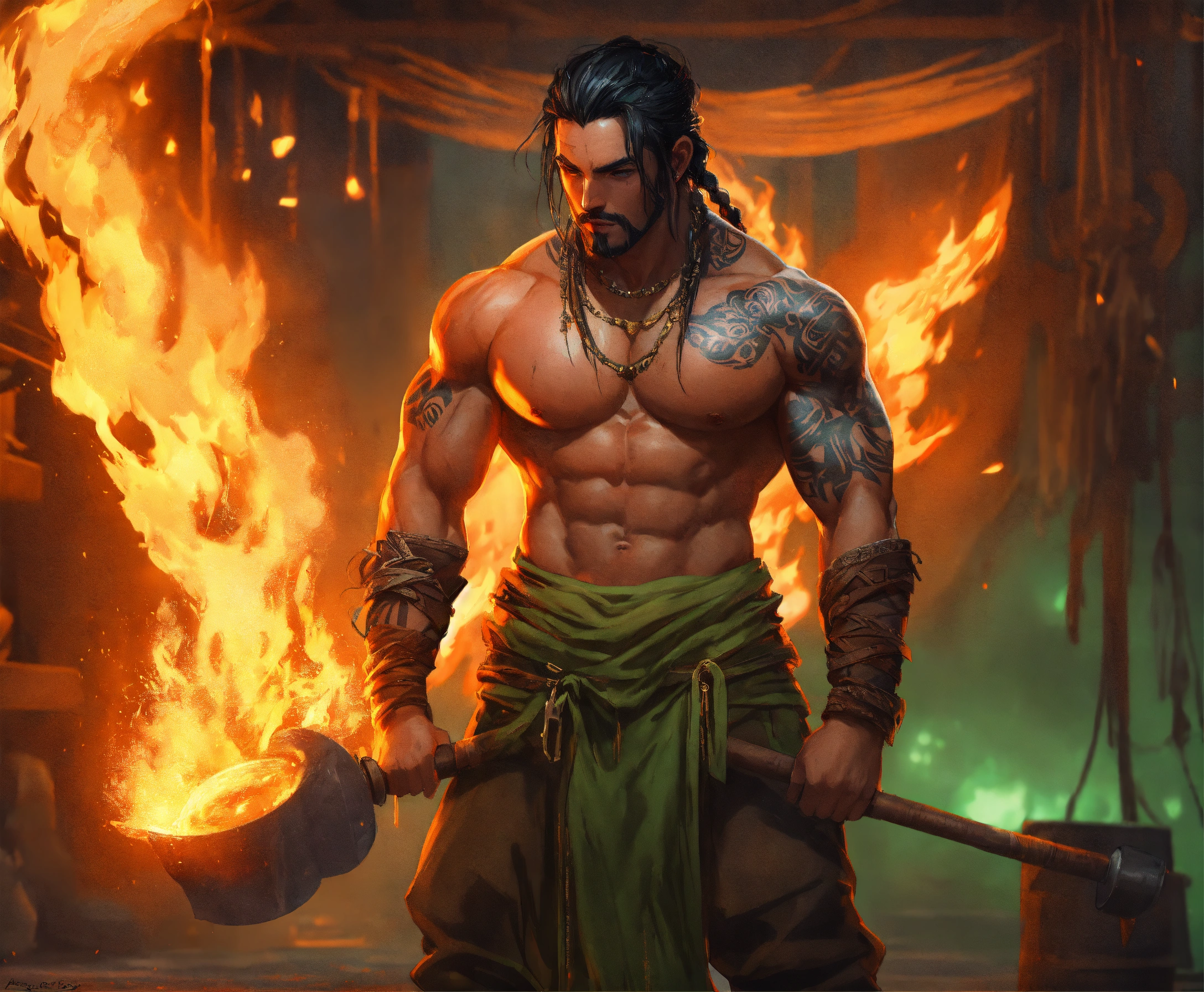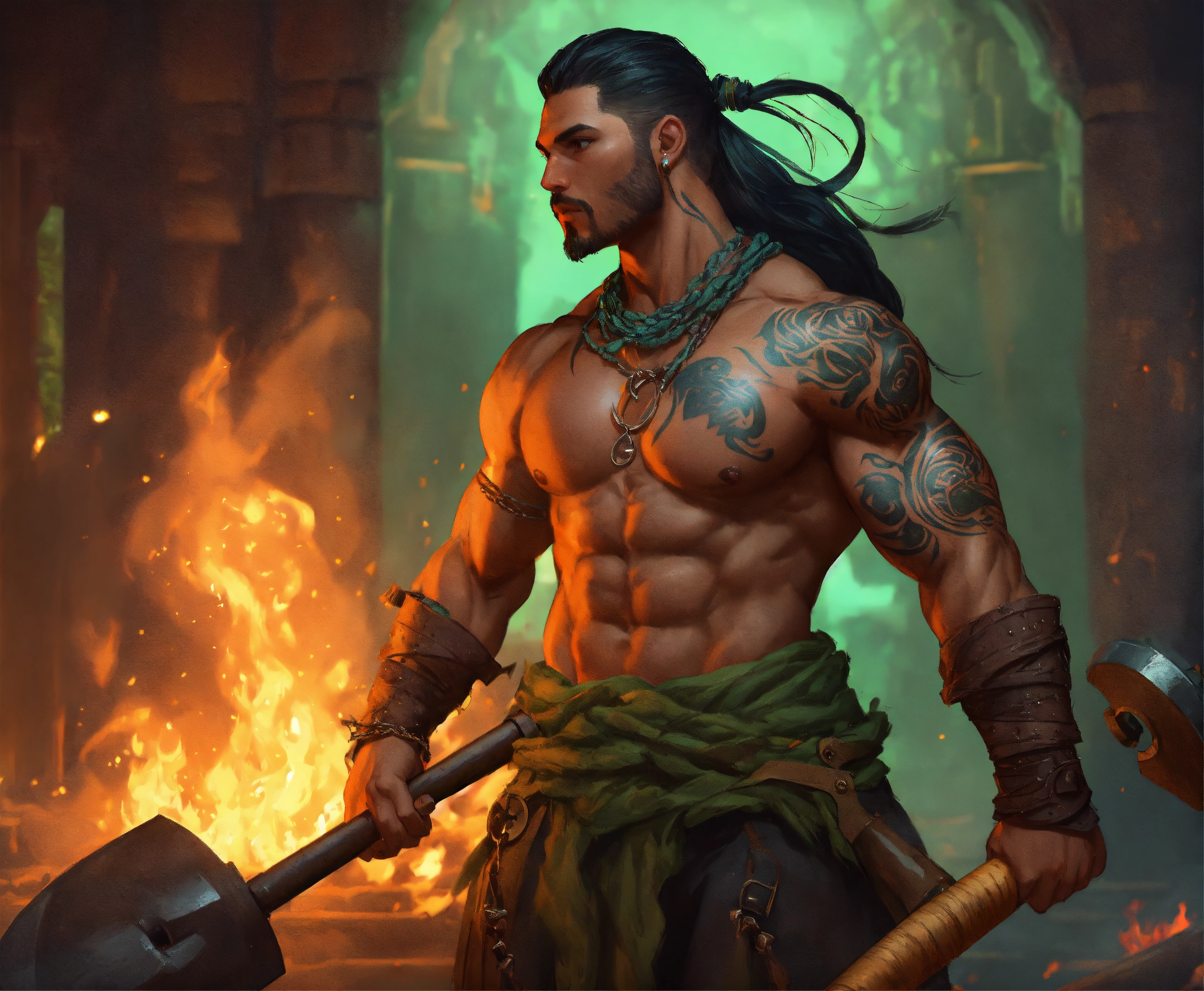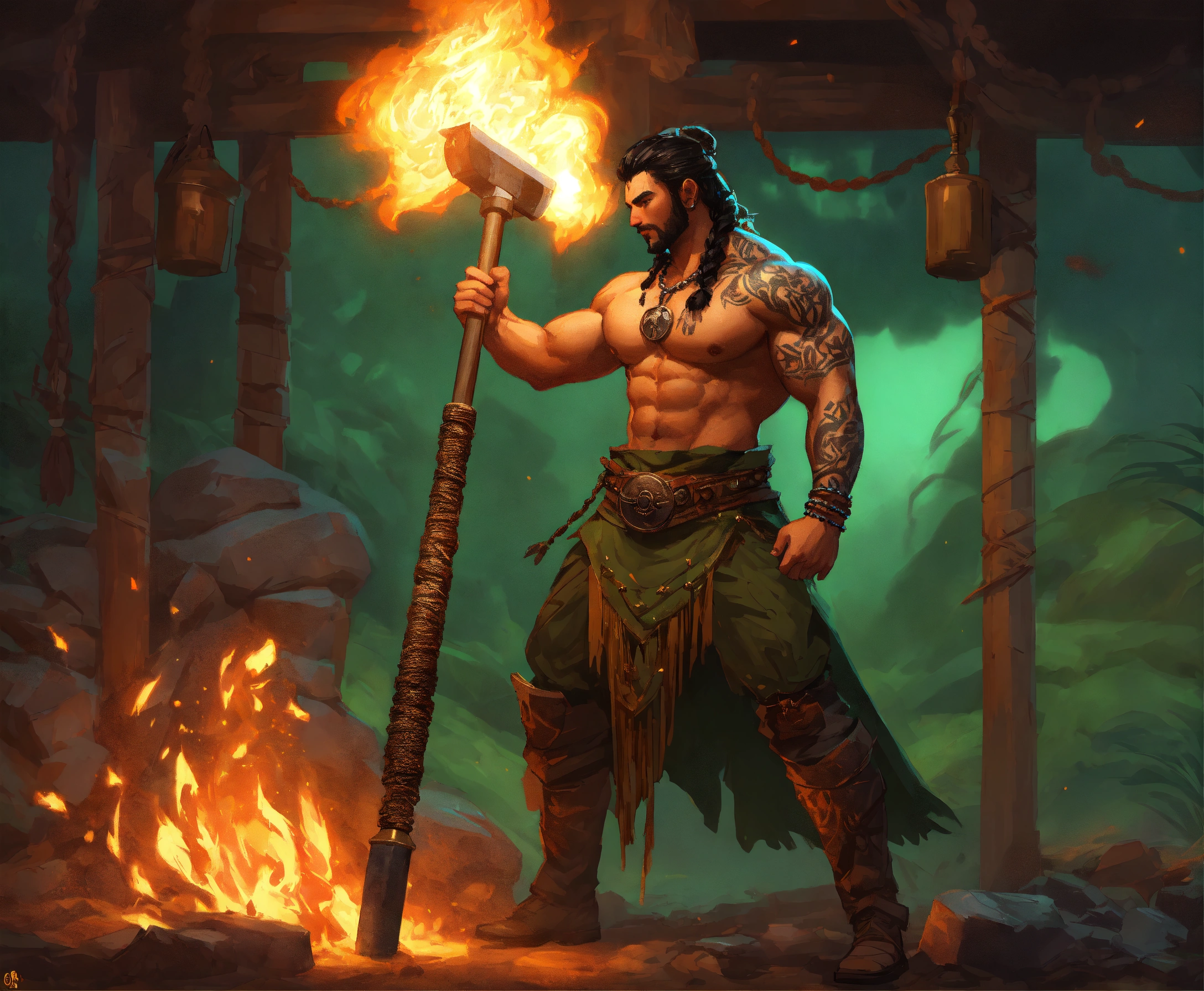 Full body, orque, dirty, black hair, lots of intricate braids with beads, tribal tattoos, blacksmith, holding a large smithing hammer, burly, muscle, high fantasy, illuminated by fire, dark background, 8k, concept art, greg rutkowski, artgerm, anvil, green skin
