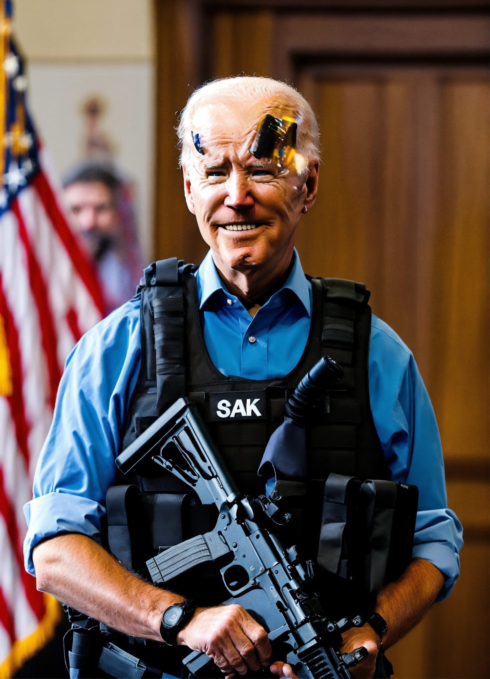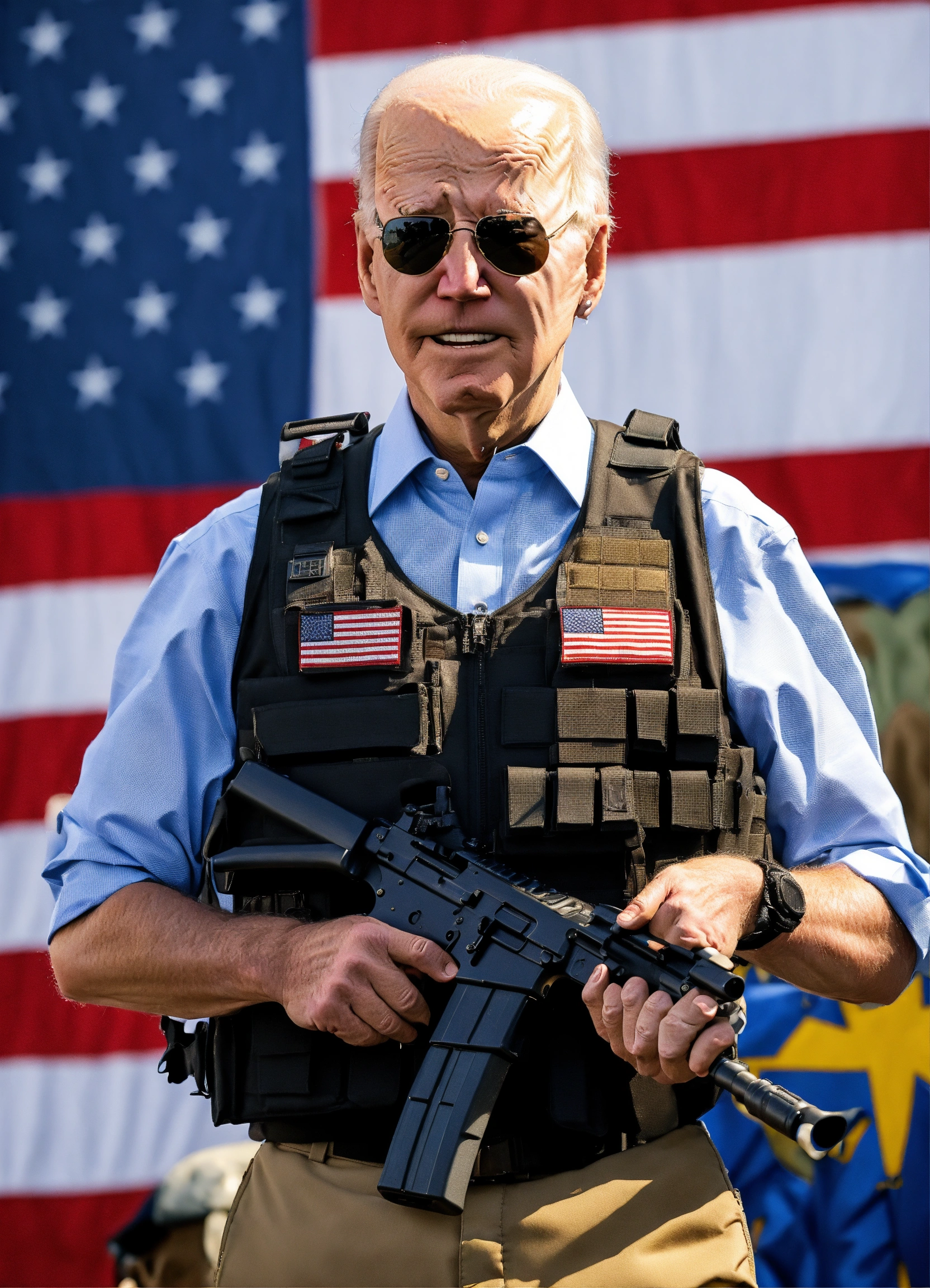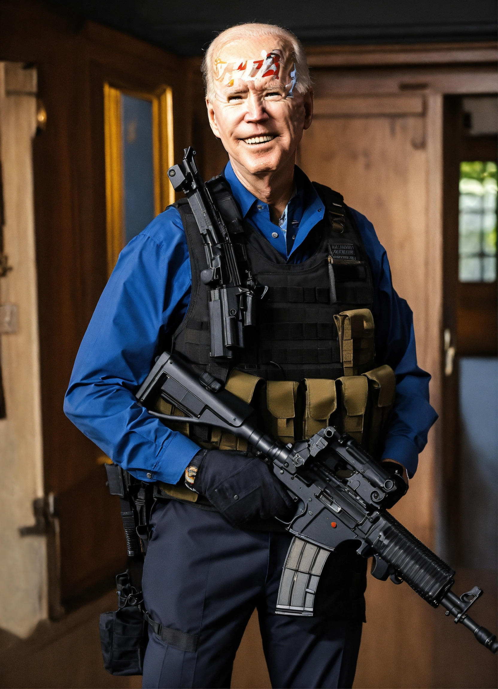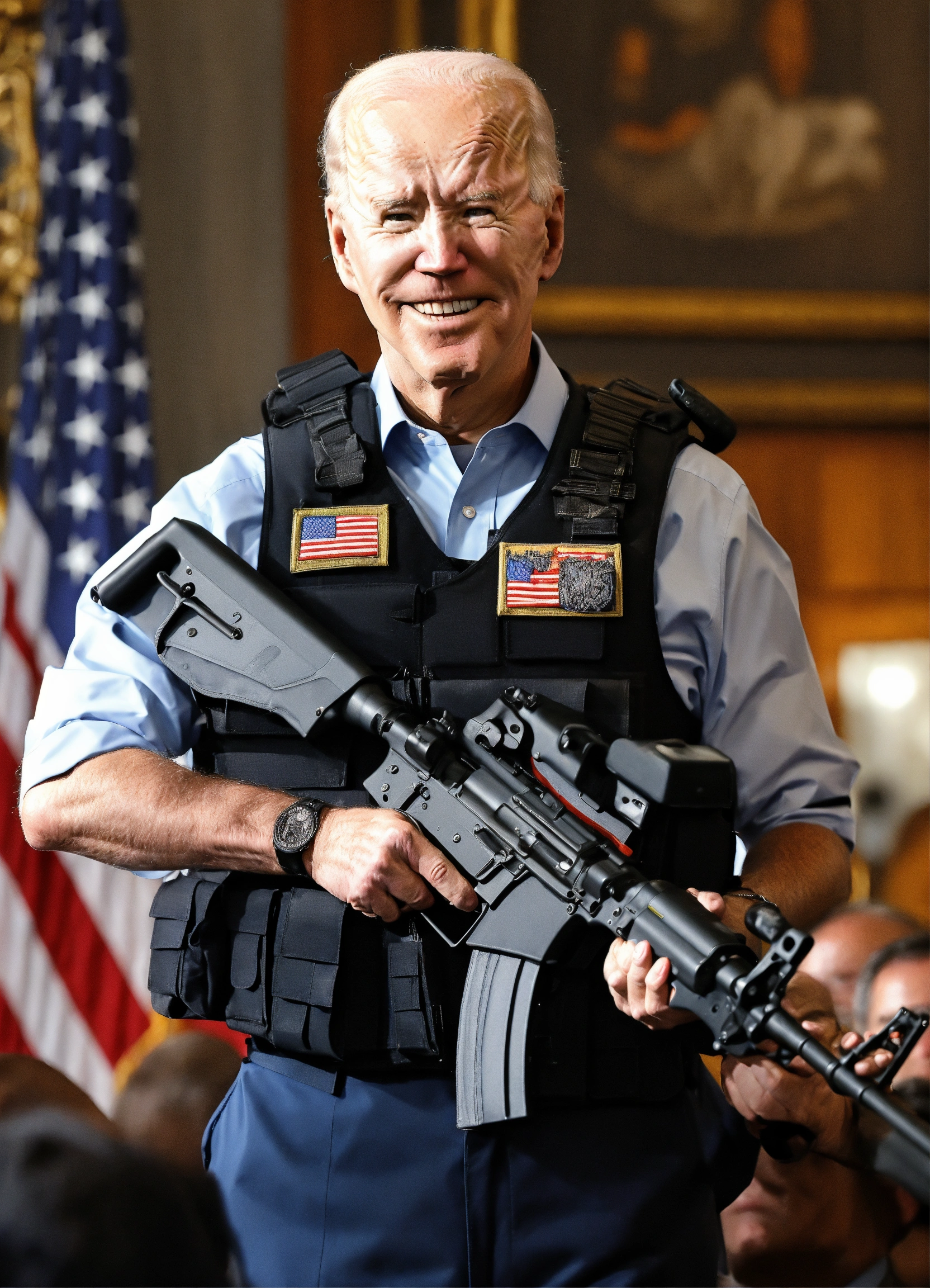 Joe biden with a bulletproof vest and 2 ak-47