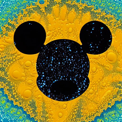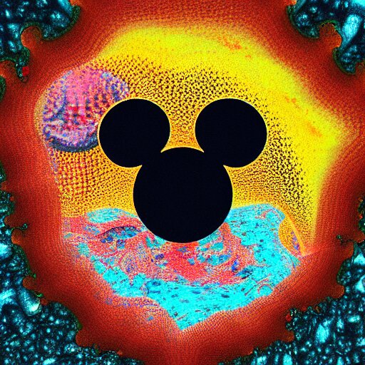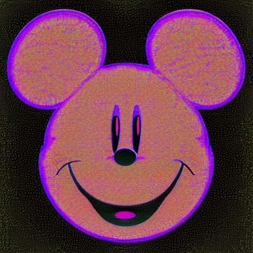 Mickey mouse head, distorted, vhs glitch, varied textures, wet, mycelium, scaly, broken, melting fractal
