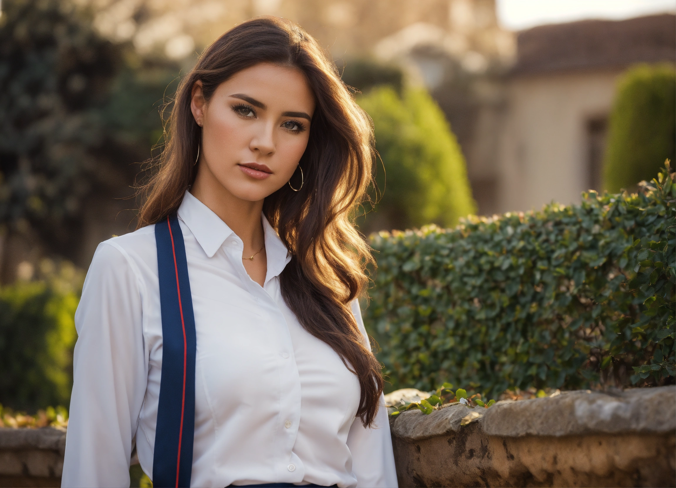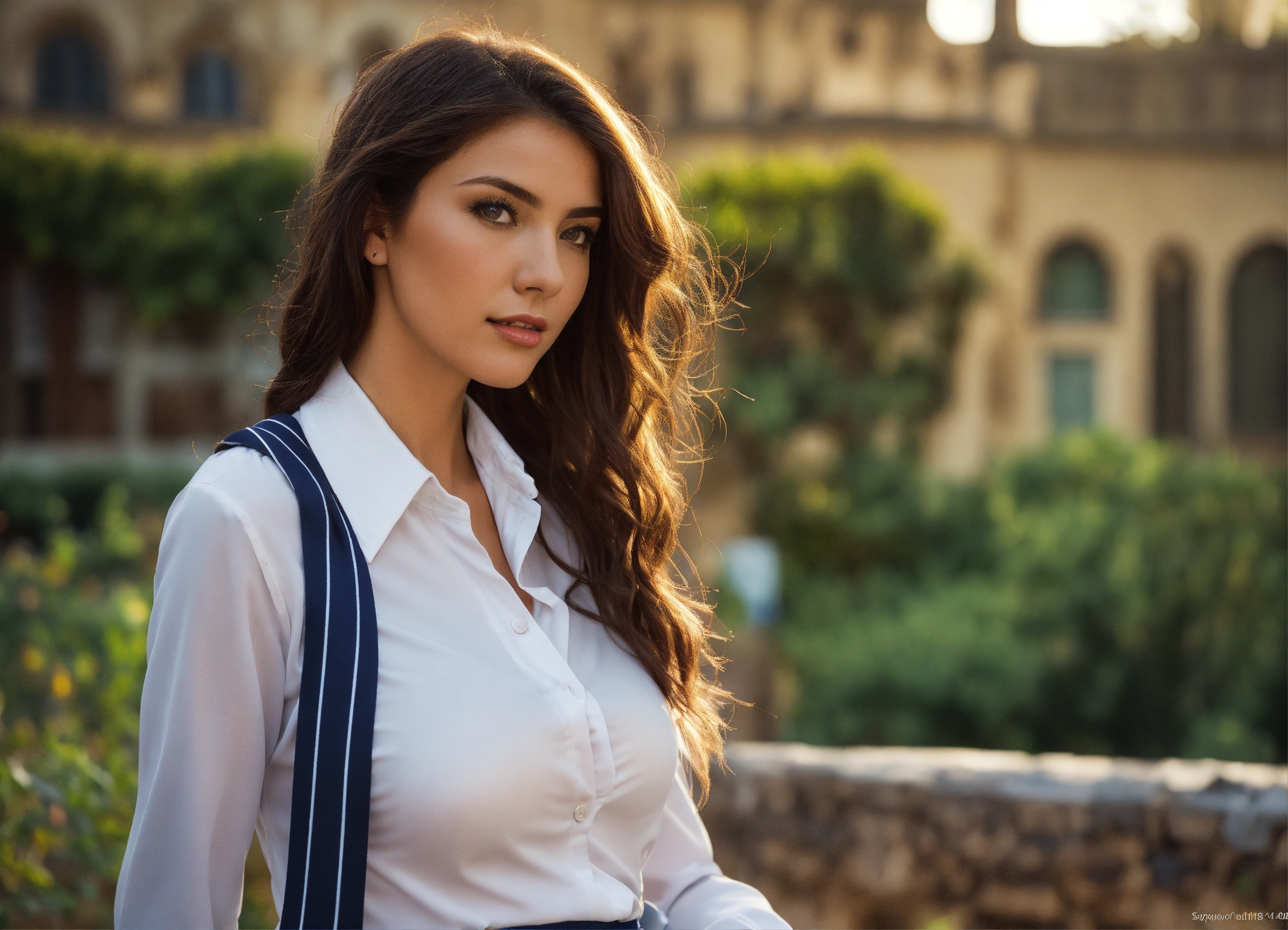 Hot adult woman, southern european, passionate with a boy, spain, taking care, schoolgirls in uniform, private school uniform, jacket, tight shirt, skirt, tights, feminine, school scenes, aura of beauty, relaxation, released tie, wide bust, pure spanish woman, sharp focus, 8k high definition, clothes too small and thin, undersized shirt and prominent body, shot on lo-fi], cinematic, 8k, masterpiece, xf iq 4, 1 5 0 mp, 5 0 mm, iso 2 0 0, 1 / 1 6 0 s, realistic, leading lines composition, symmetrical balance, depth layering, sense of depth, ai enhanced, tailored shirt, tight-fitting, increased bust