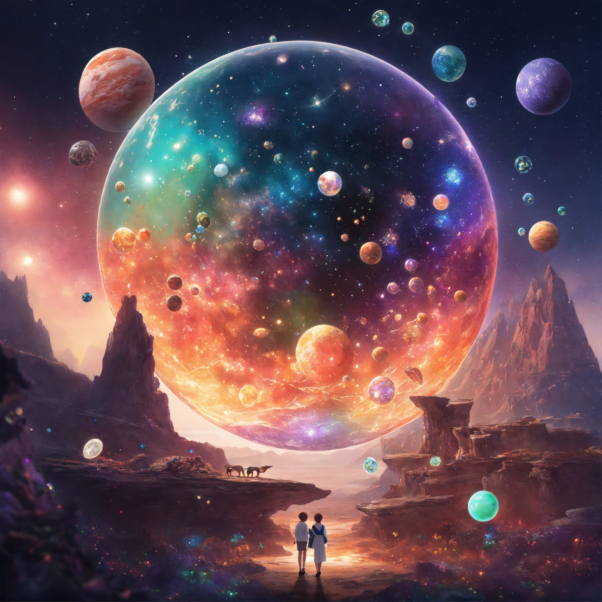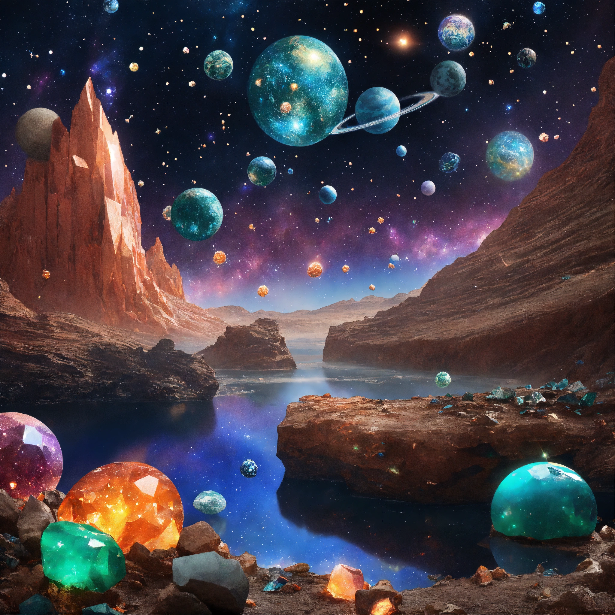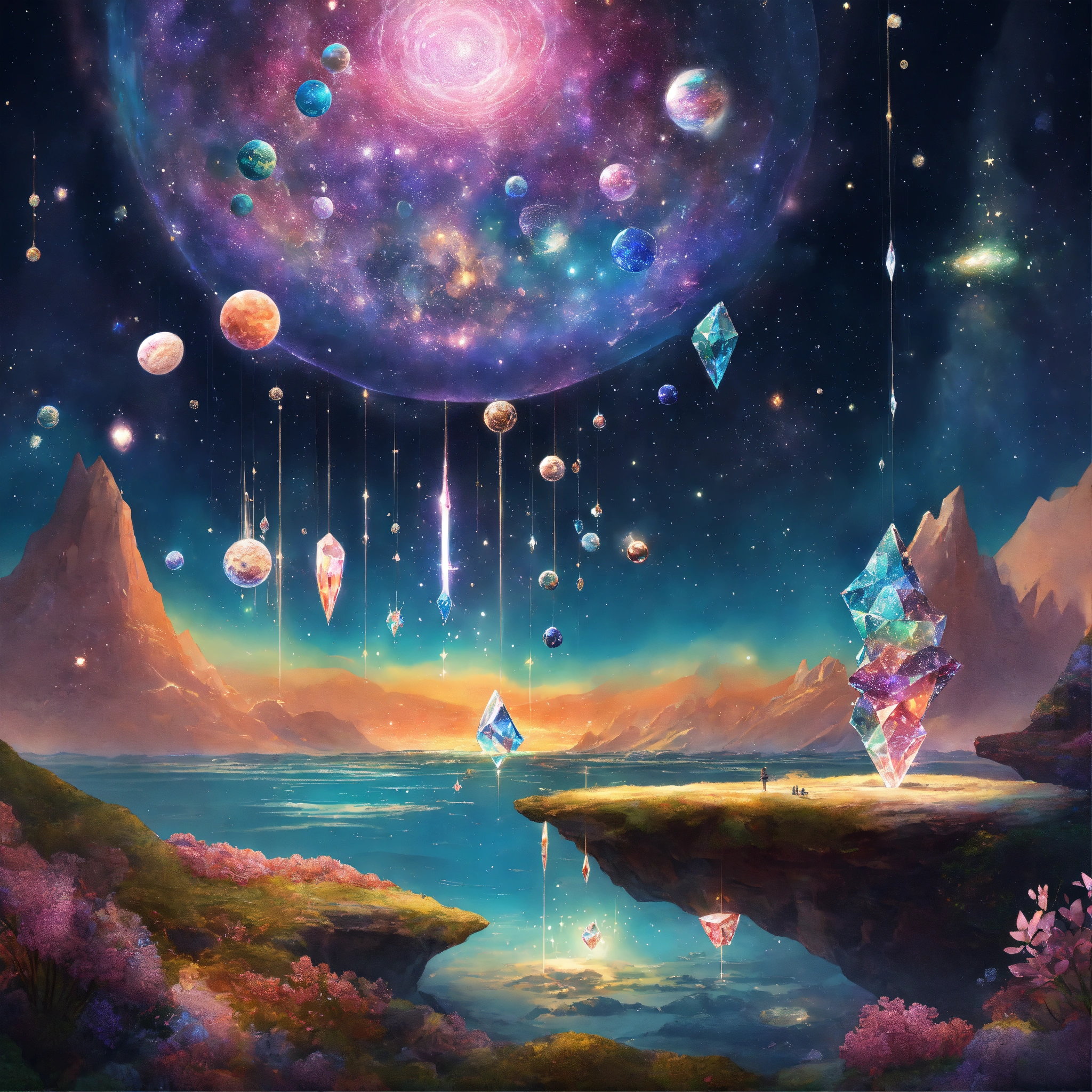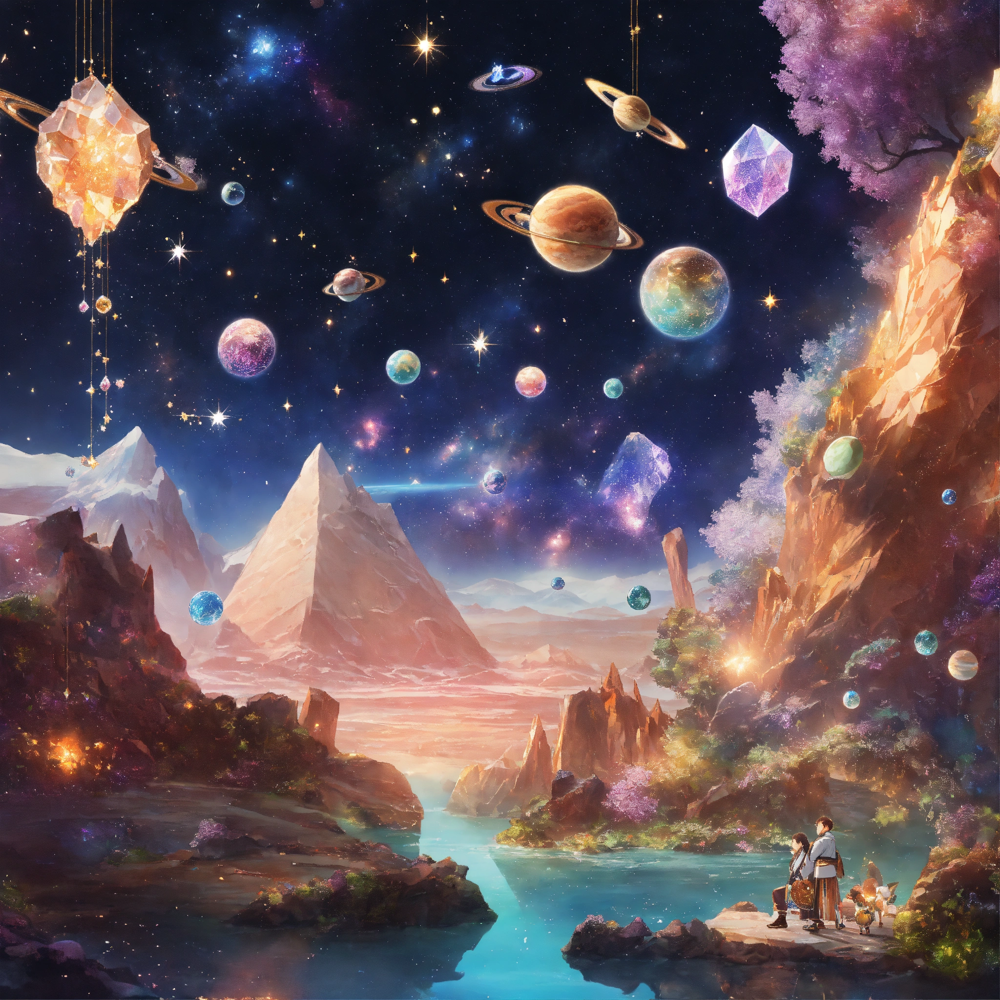 Visualize a studio ghibli galactic tableau where planets and stars are replaced with stunning crystals and minerals from the spy crystal collection. a galaxy swirling with celestial energy, where each star is a sparkling crystal and planets are composed of layered agates, swirling malachites, and other gemstones. the 'spy crystal' name orbits around this galaxy as a shining constellation, while social media details are presented as coordinates to this otherworldly location, inviting the customer to connect with the brand on a cosmic scale. the final image should be dazzling and full of depth, suggesting that the beauty of the universe is mirrored in the intricacies of crystals and minerals.