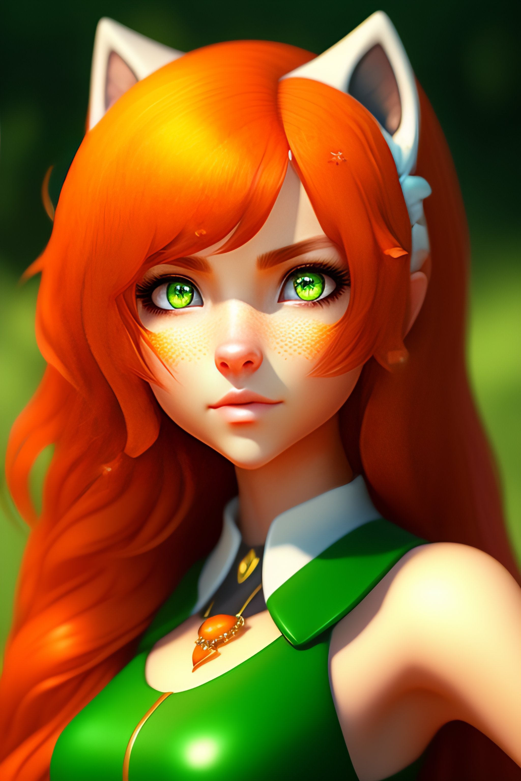 Fox girl with orange hair, beautiful fox girl with white skin with green big eyes, fox girl with orange hair in a green dress, realistic, detailed, anime style, 8k