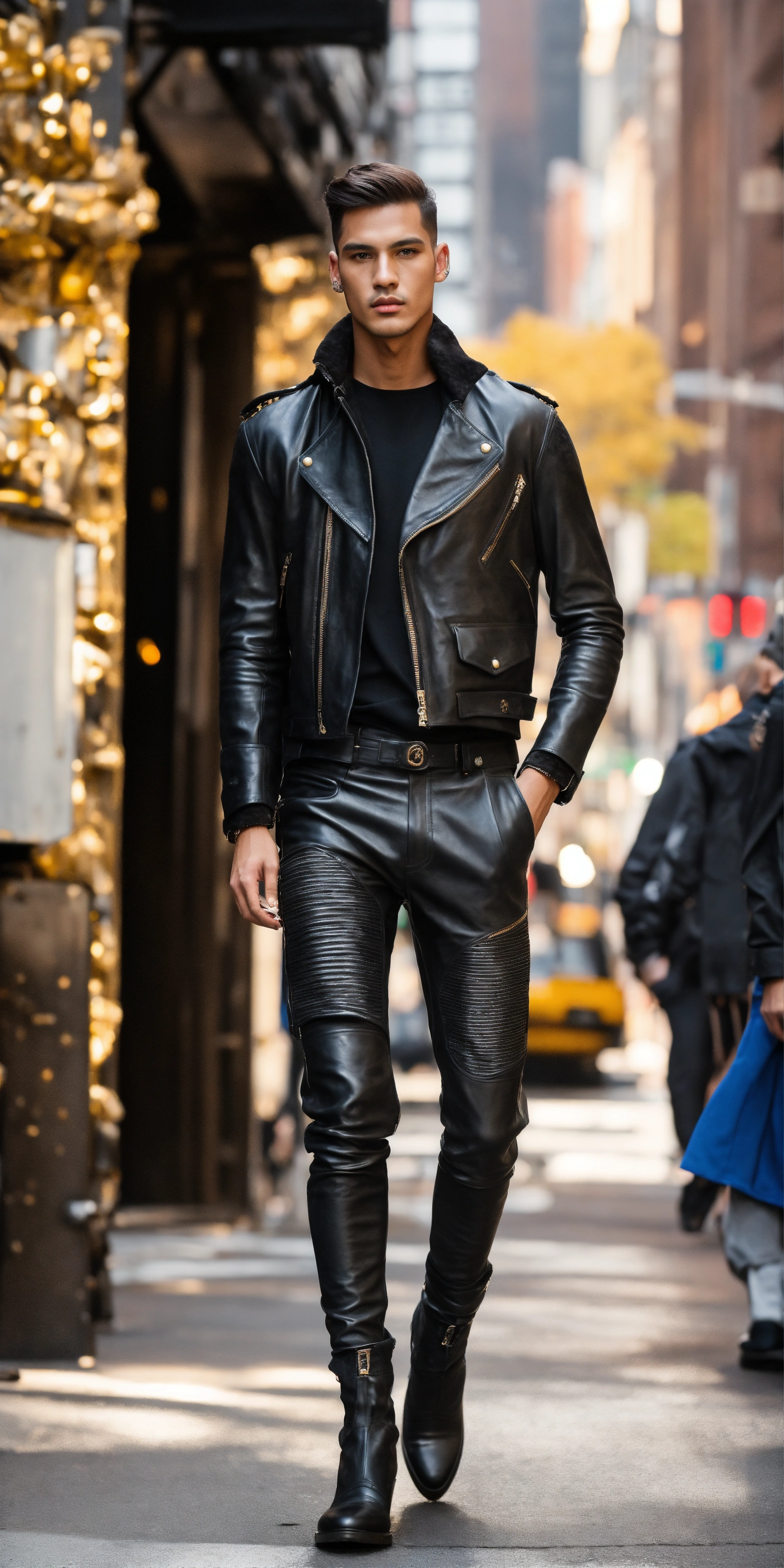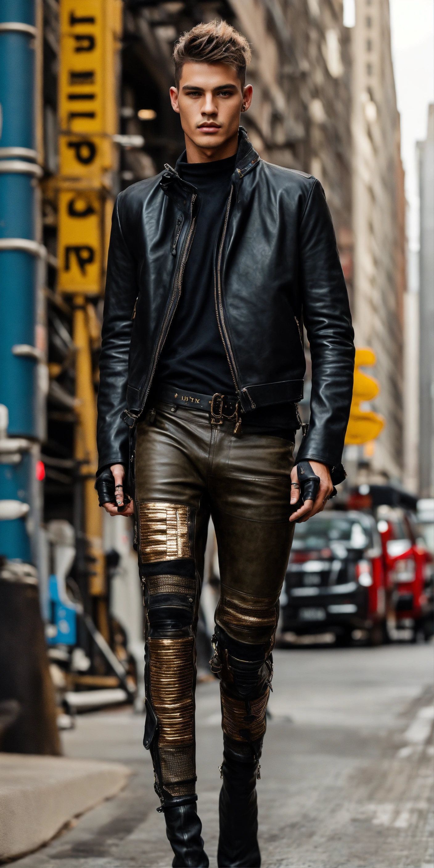Ultra realistic full body photo of an fashionable model modeling novelty interesting complex unusual street sporty modern brave black waxed leather and suede pants, military textures metal walking runway in new york