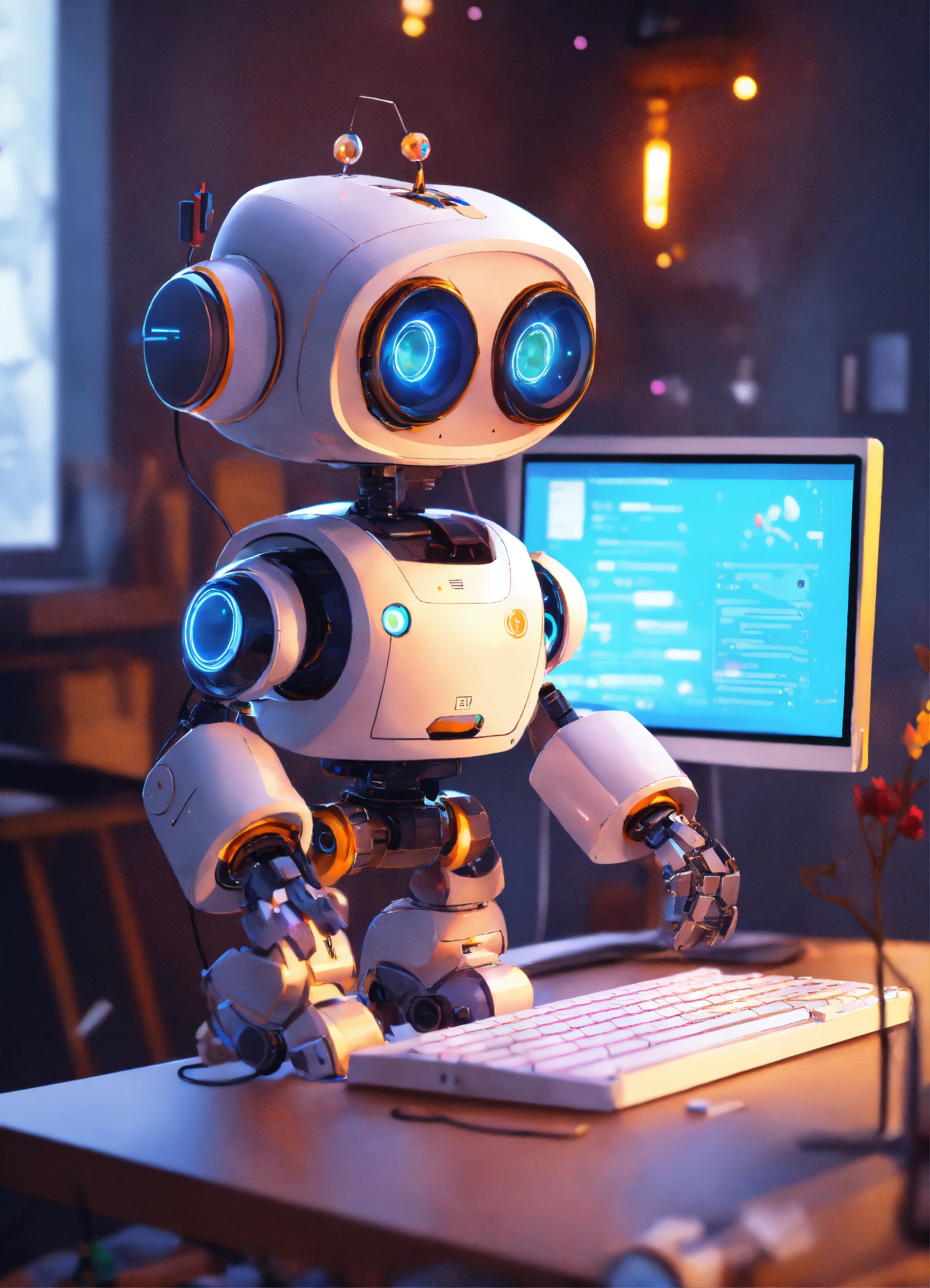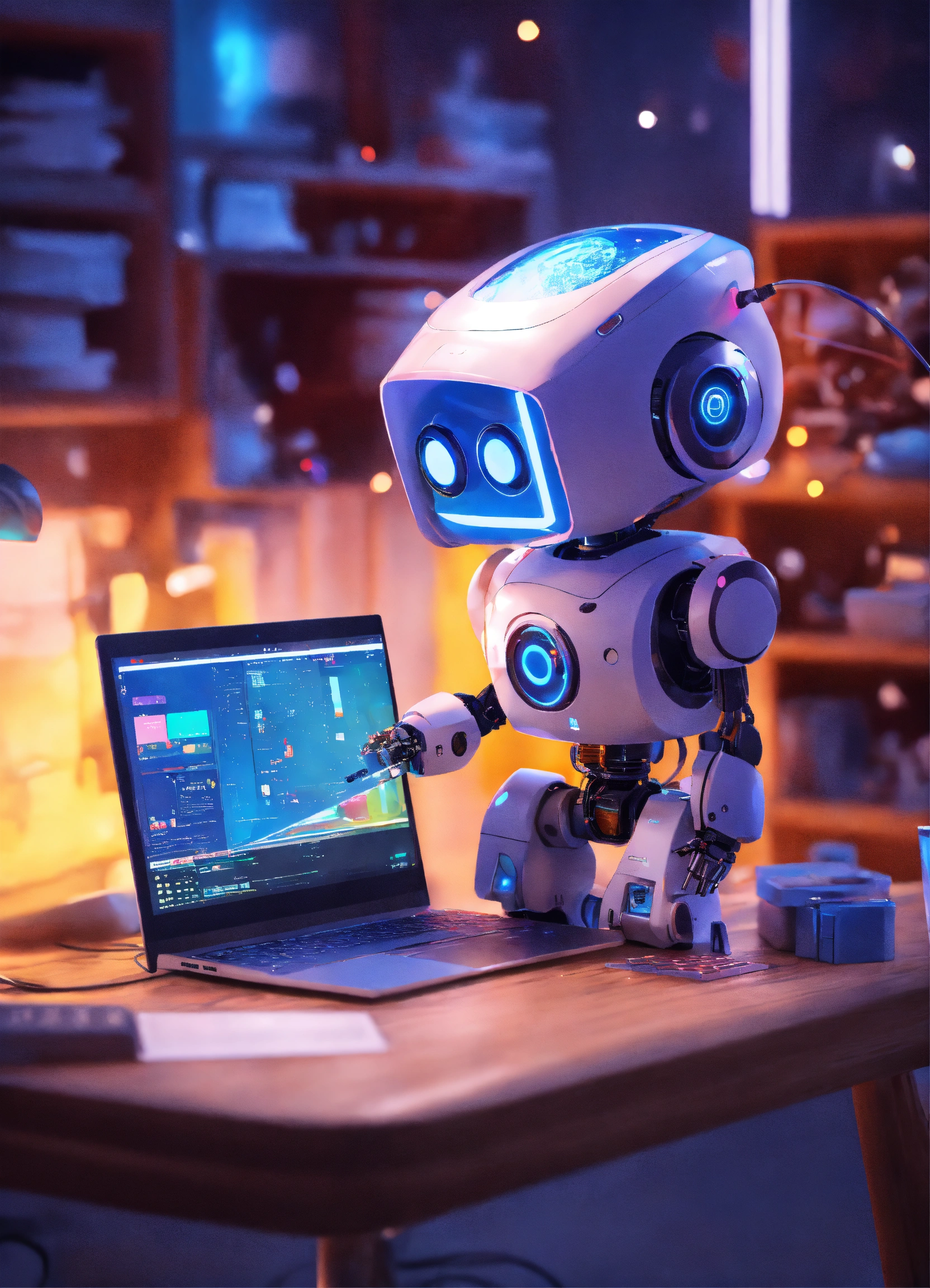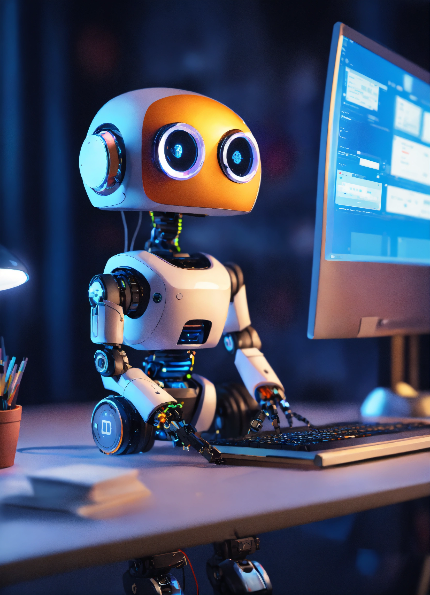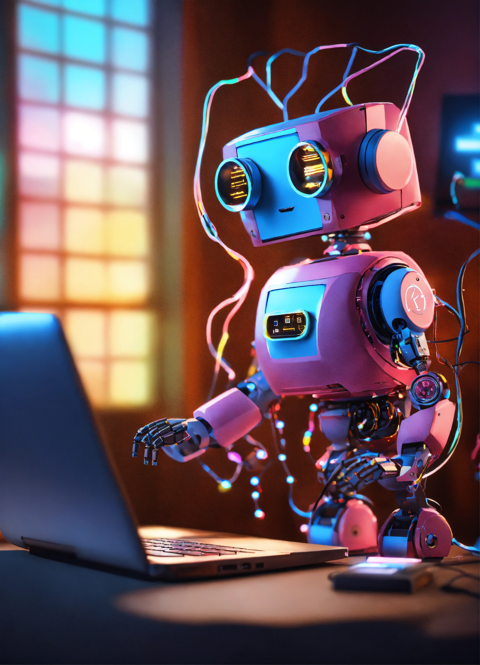Cute little robot connected with a lot with data sources, looking very busy and contentrated using a keyboard looking at a screen of a laptop with education content, cute, 8k, unreal engine, perfect, bright colors, funny, safe, secure