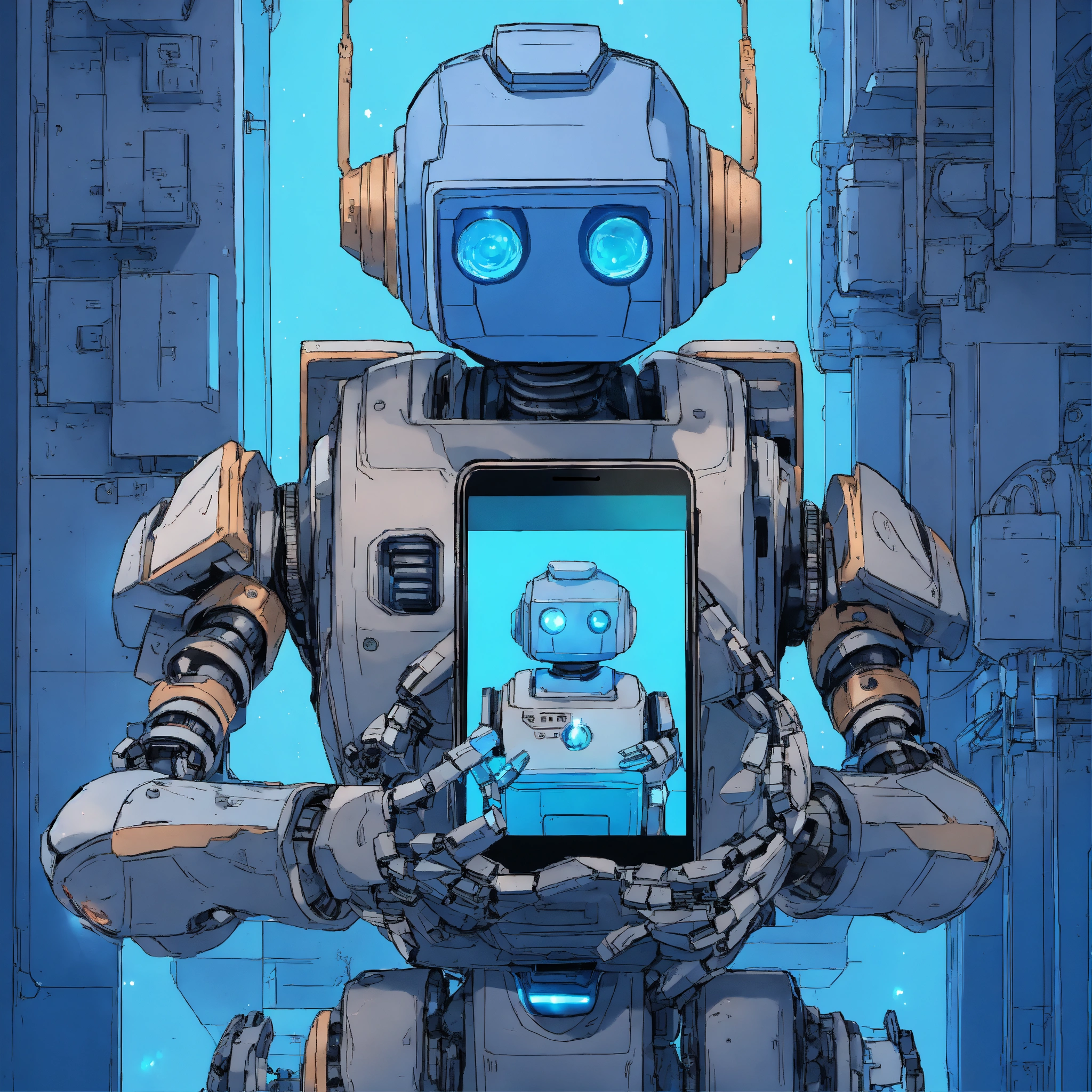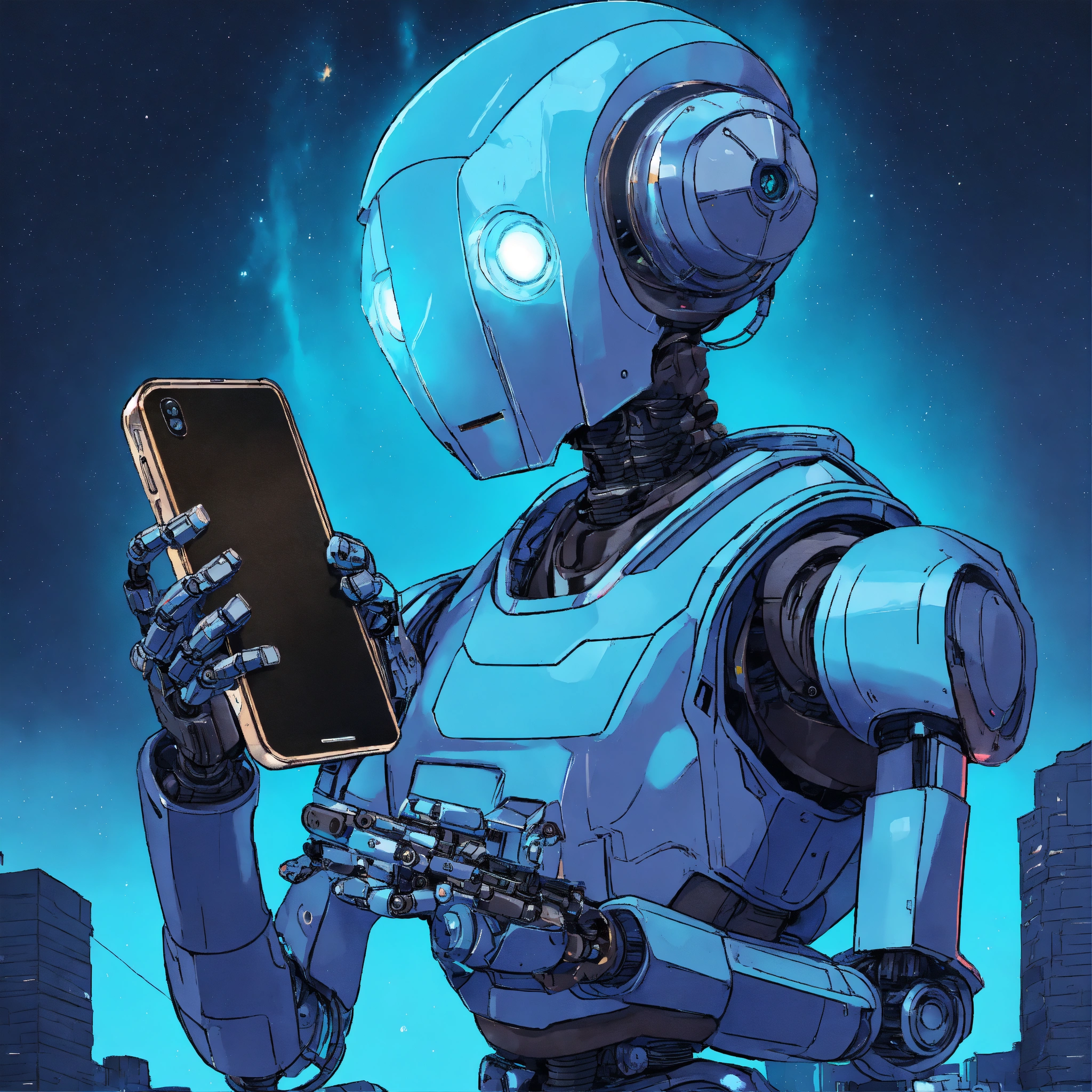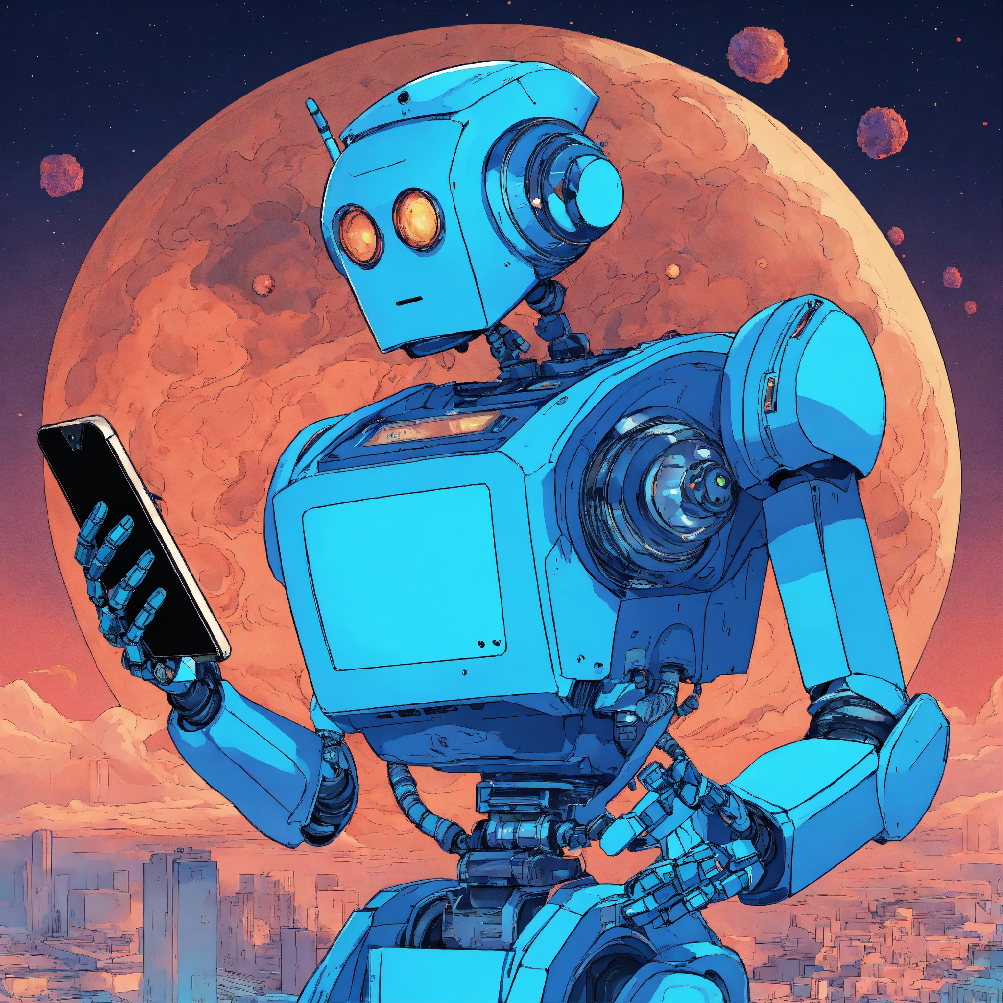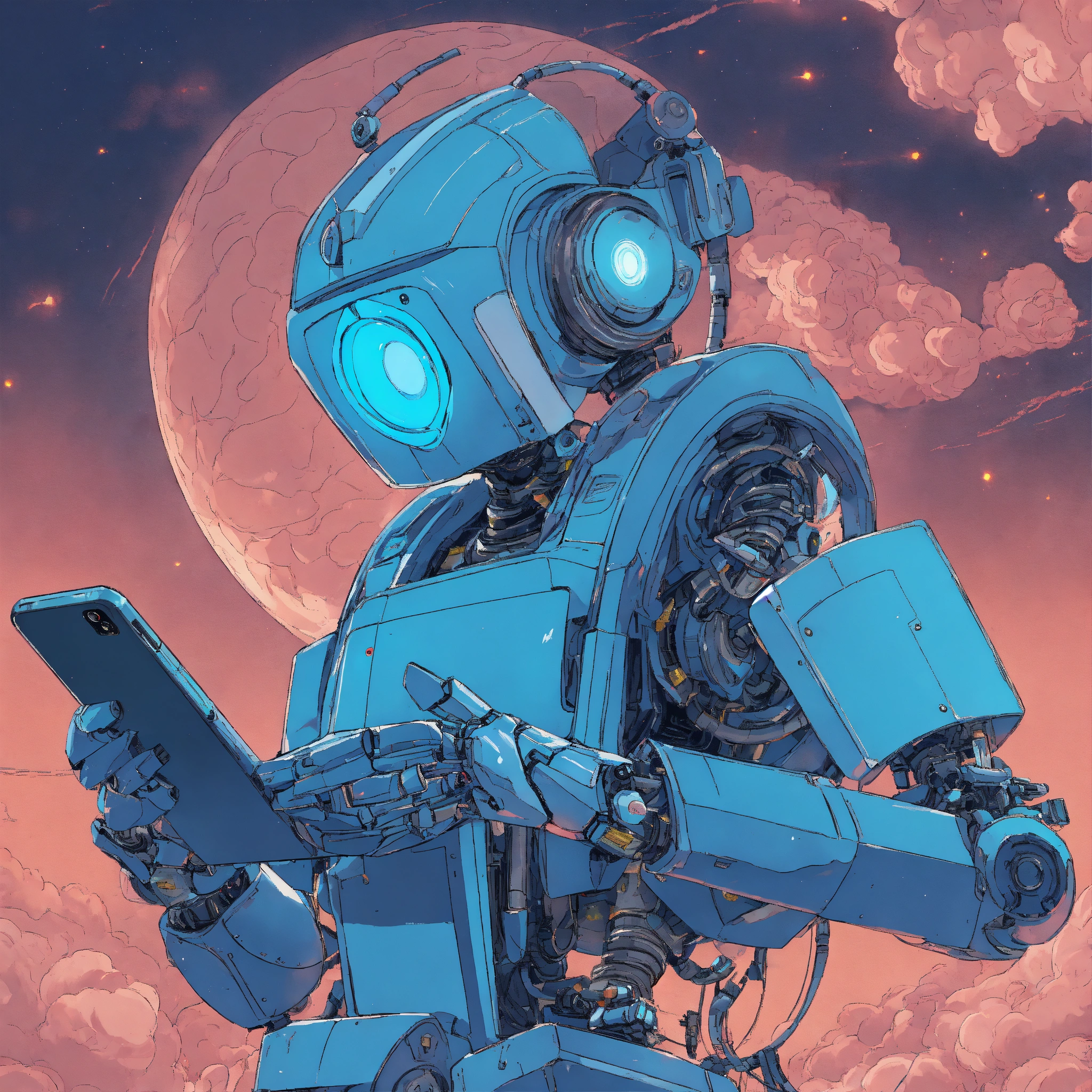 ((robot holding smartphone with both hands)), in blue colors, style of 90's vintage anime, 3/4 pose, looking at smartphone, human like face, surrealism, akira style, studio ghibli, detailed line art, fine details, devinart, trending on artstation, professional, masterpiece, commissioned, best quality, inside an exploding nebula