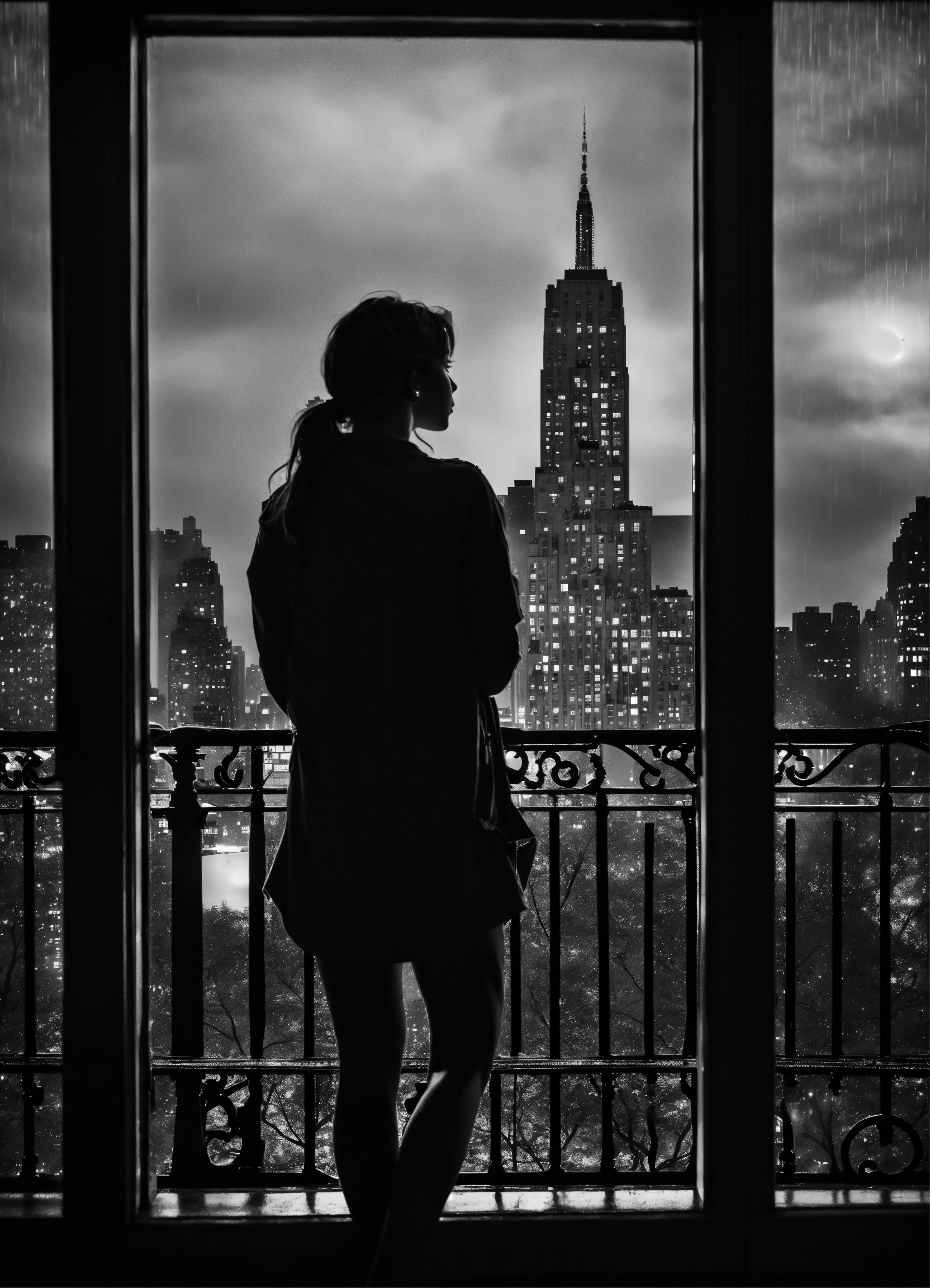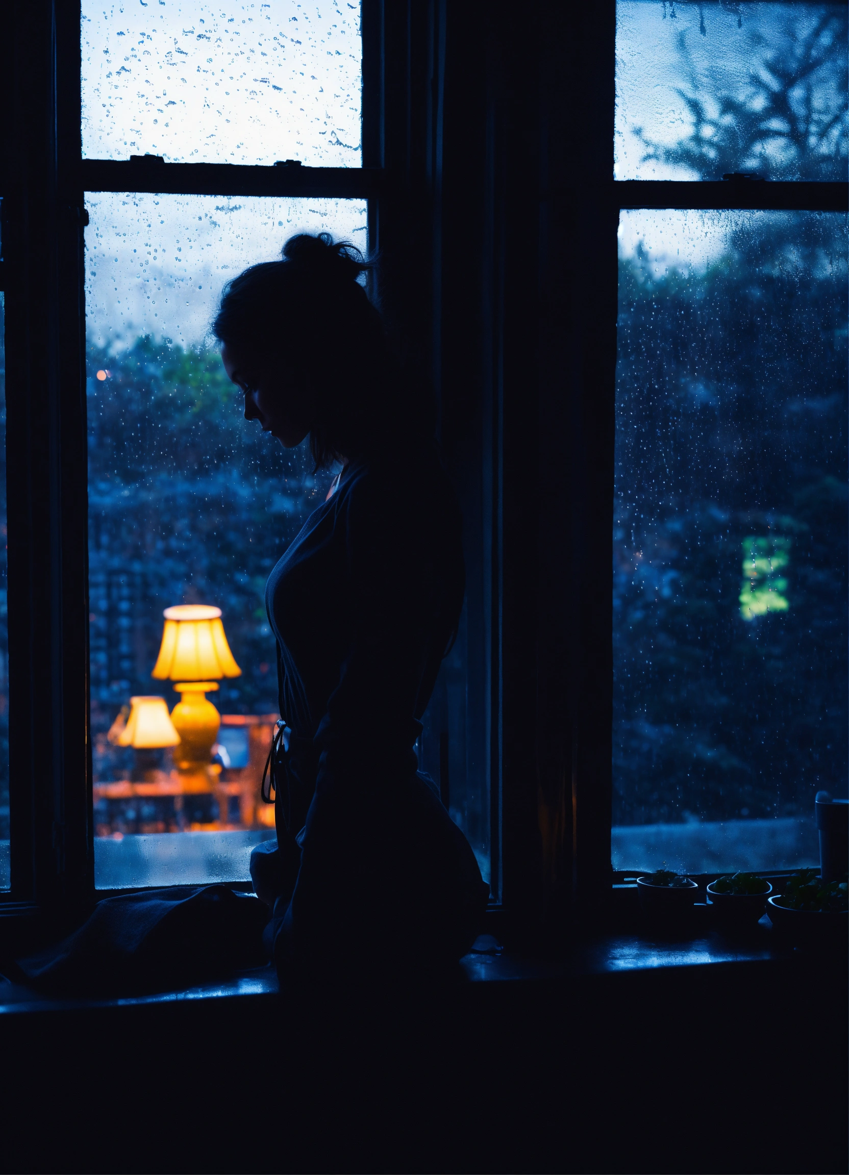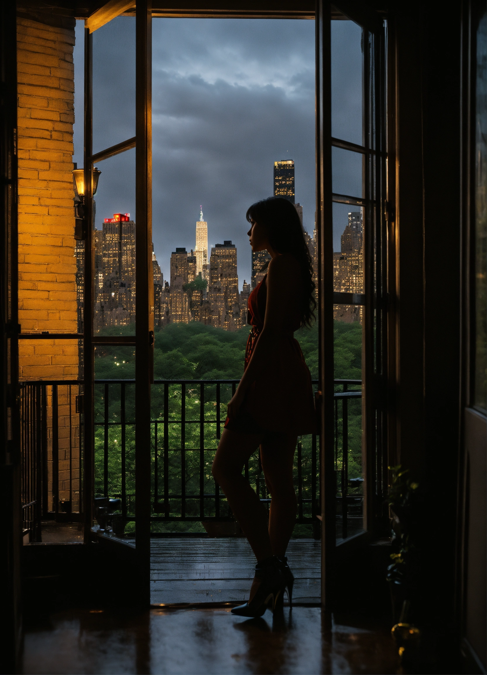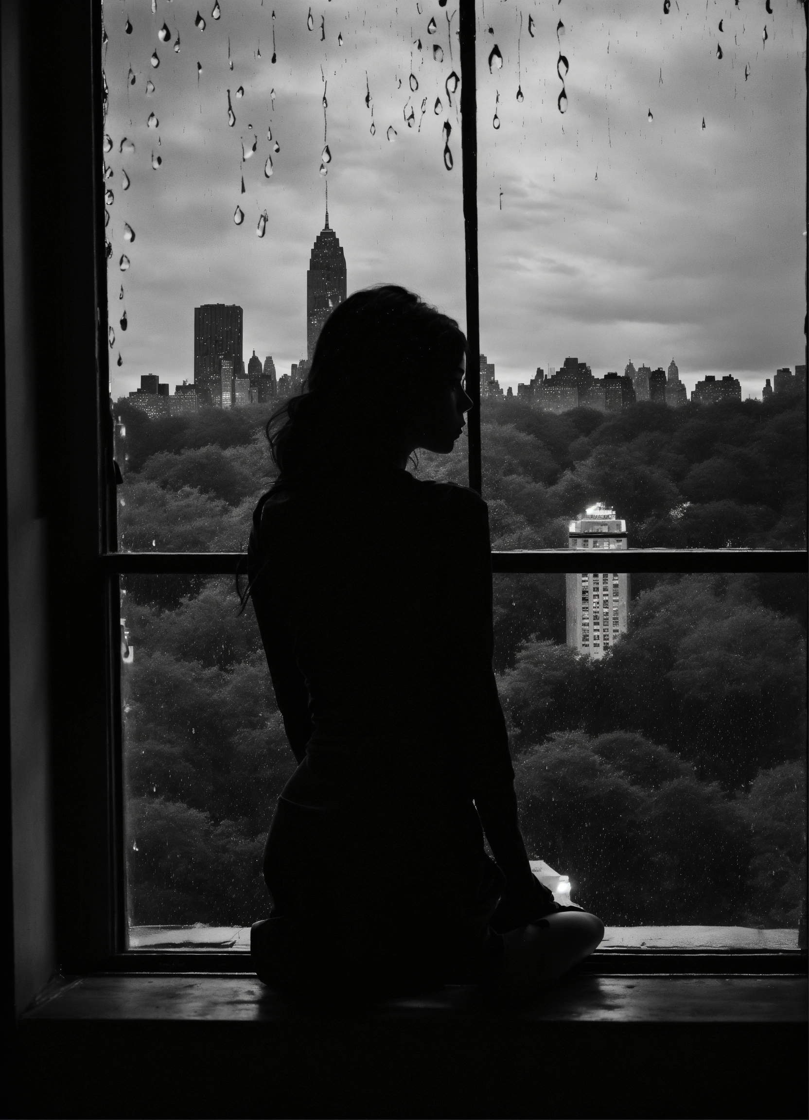 Silhouette of a hot girl thinking about life seeing through her window of her apartment in central park new york at raining day at night