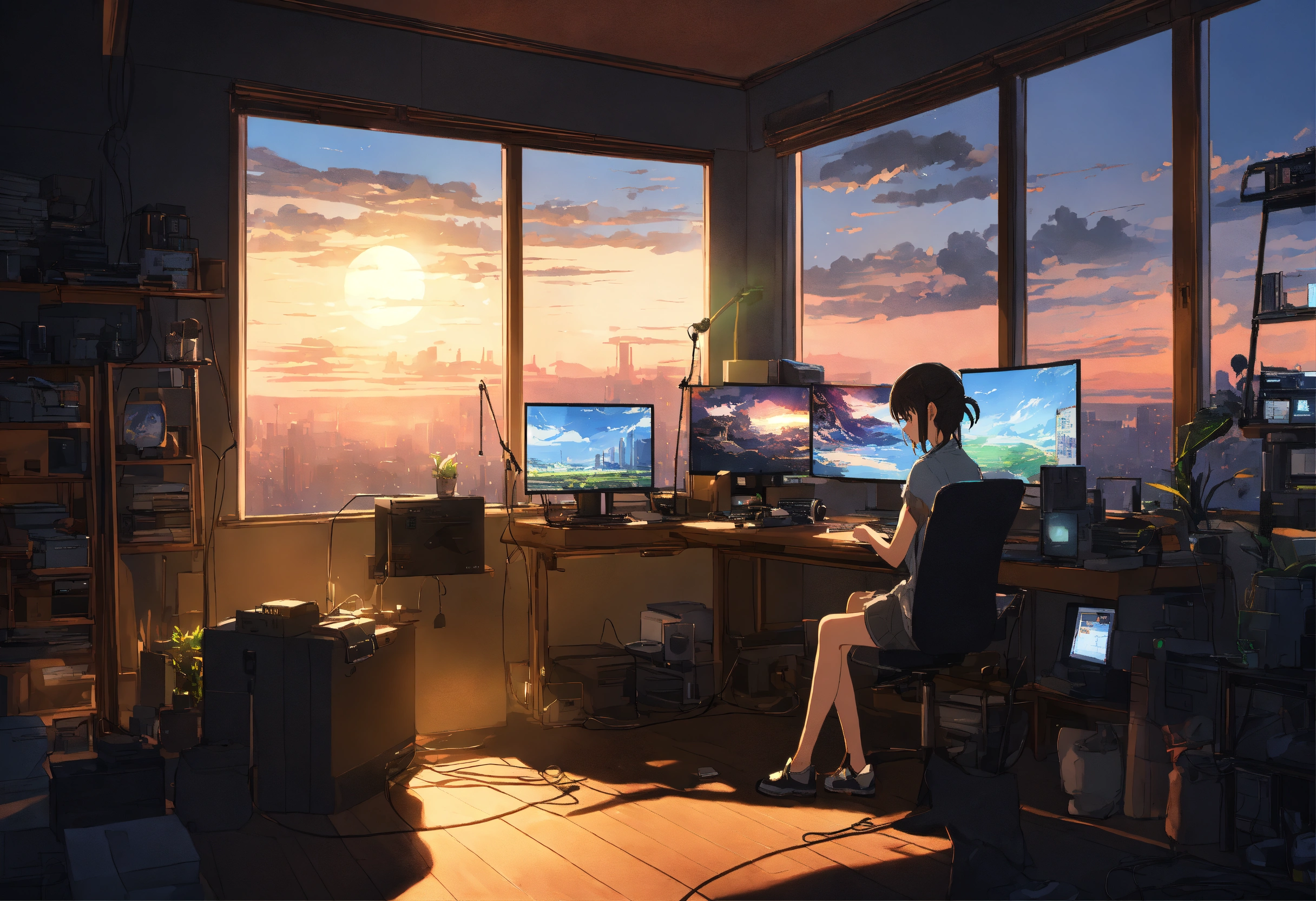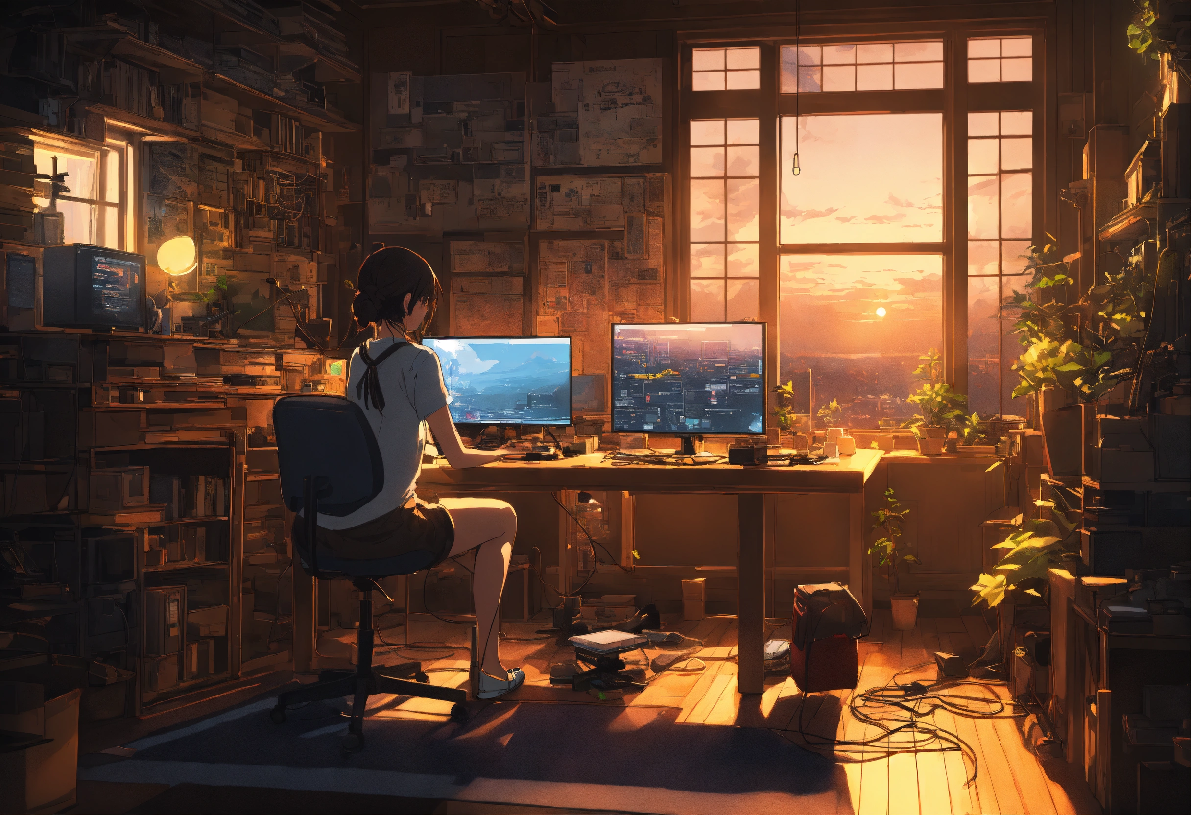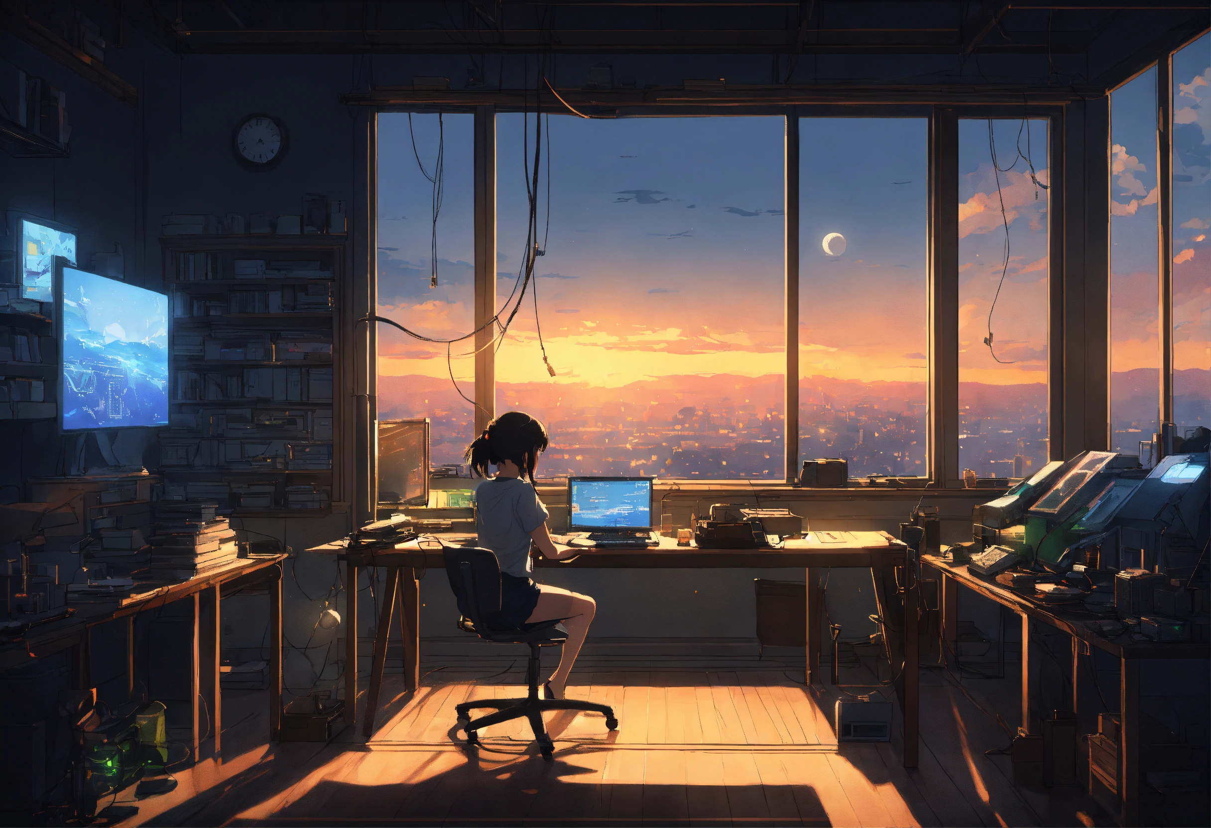 Create a high resolution artwork of anime girl is programming at a computer in a room full of gadgets, web developer, by makoto shinkai and ghibli studio, outlined silhouettes, dramatic lighting, highly detailed, incredible quality, trending on artstation, masterpiece, 8k, dark room, outside is moonli