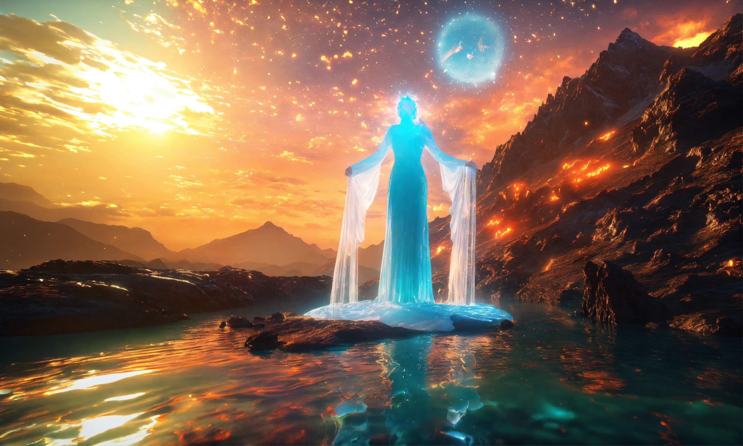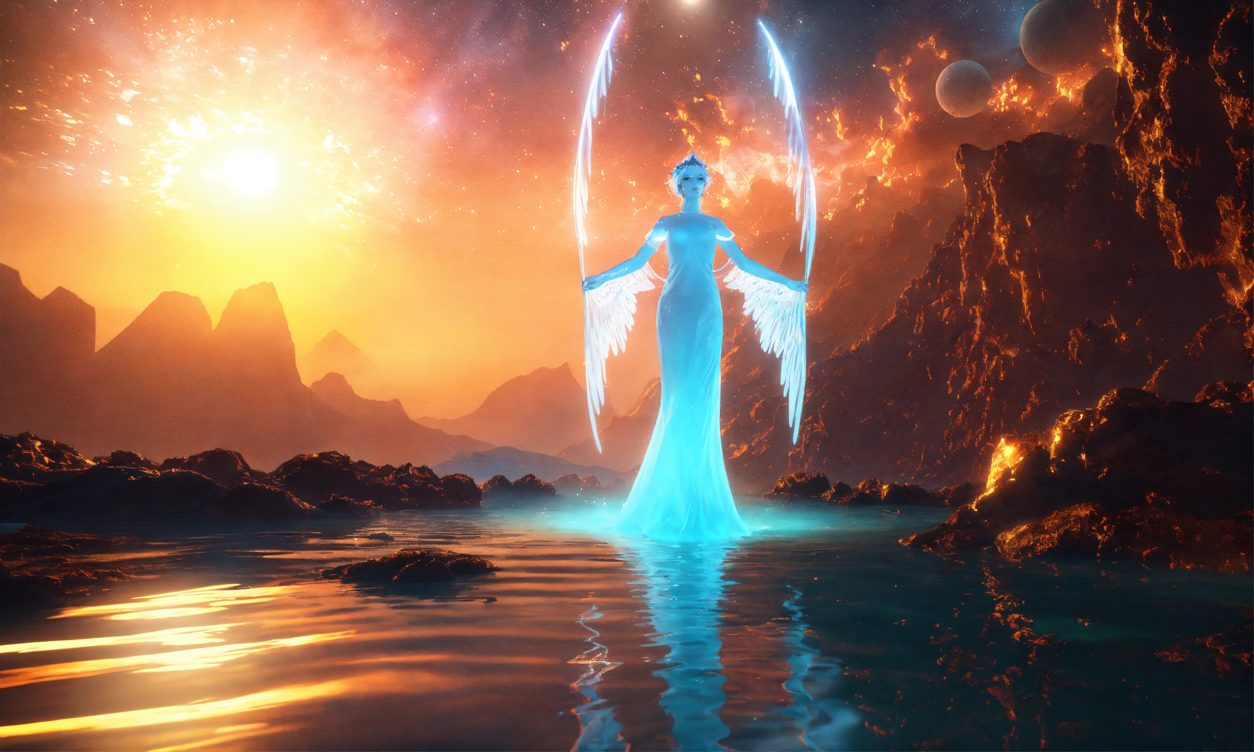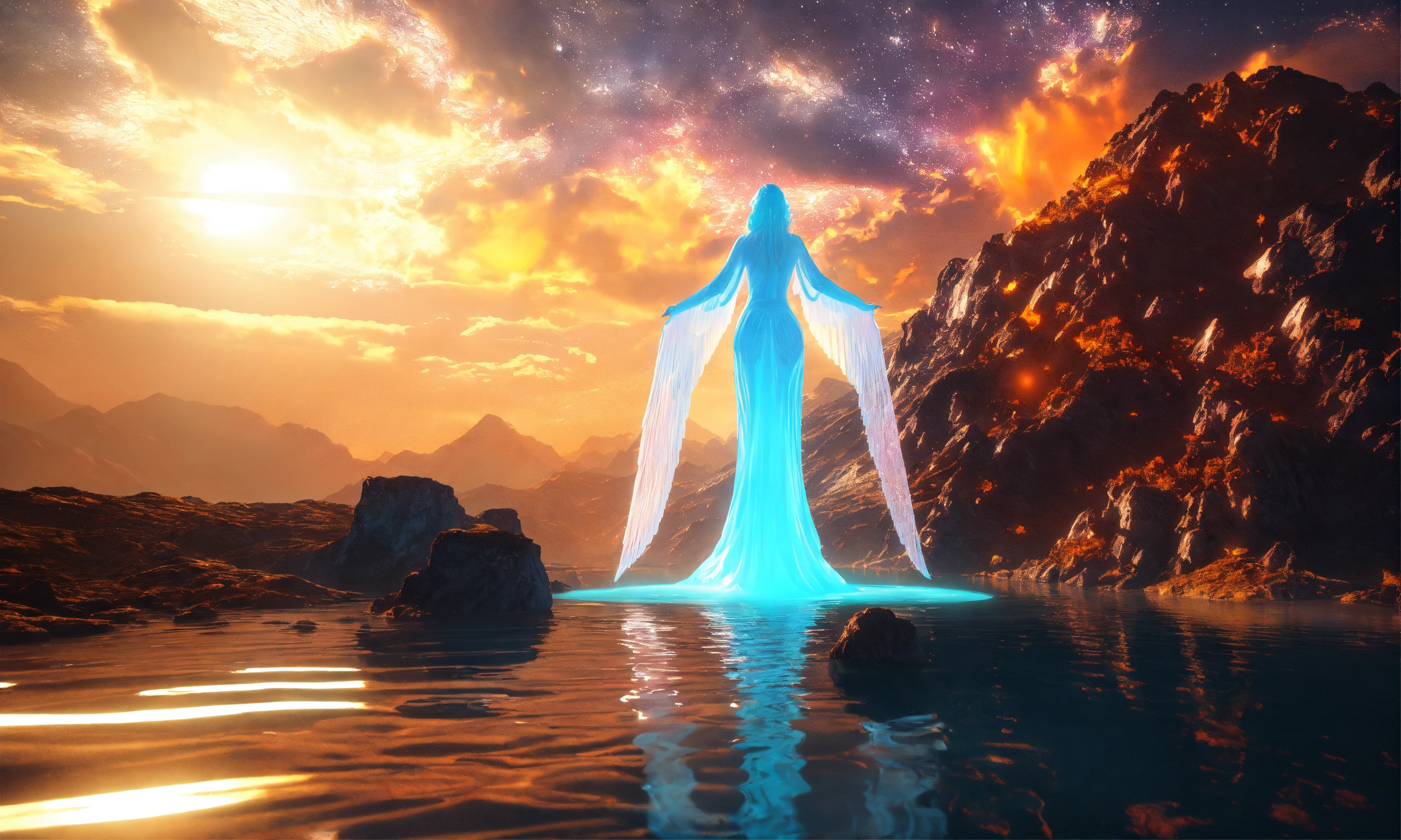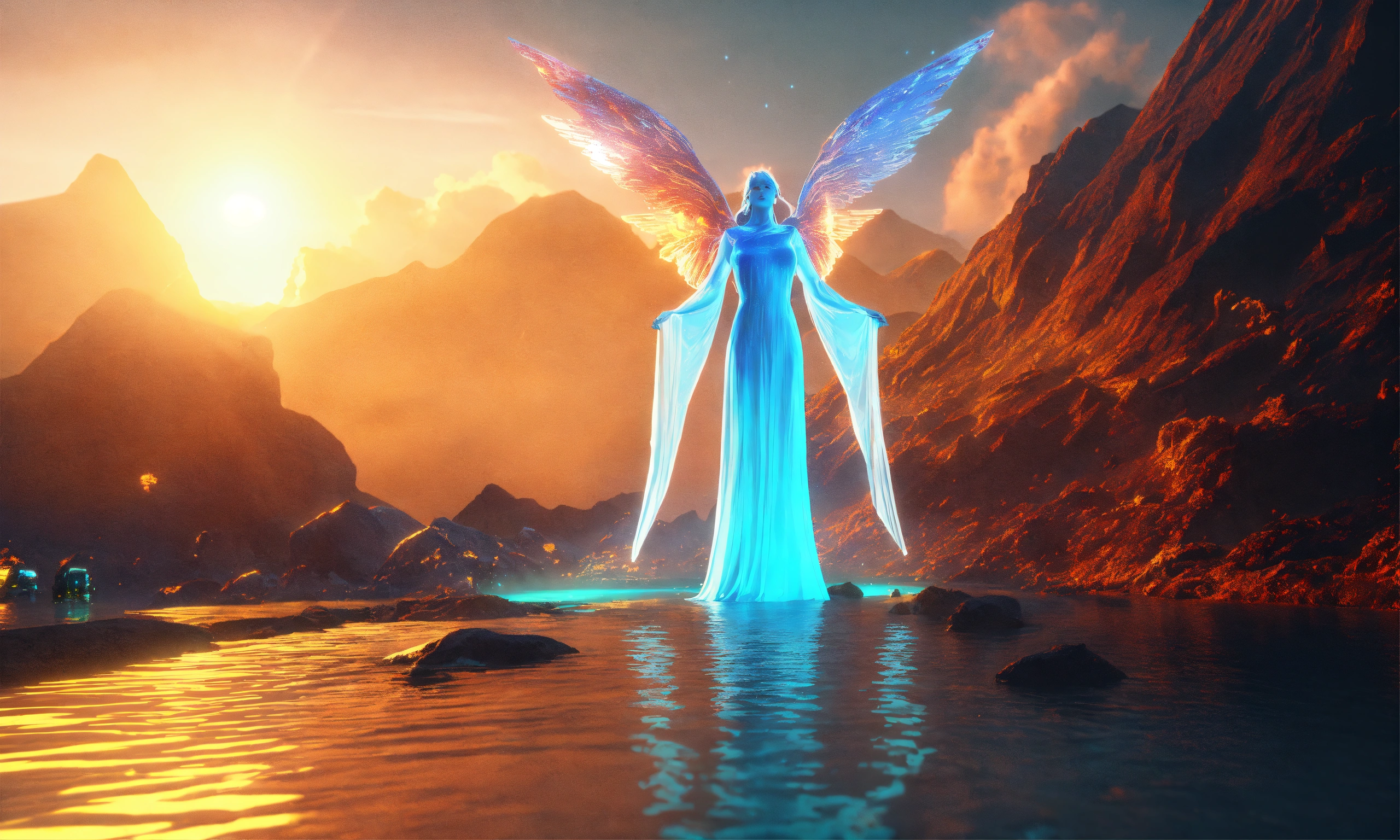 Two ethereal water angel, mountain nebula, sun backgound, cinema 4d scifi 3d scene of a showing, hyper realism, realistic shading, realistic render, detailed textures, photorealistic, wide shot, landscape