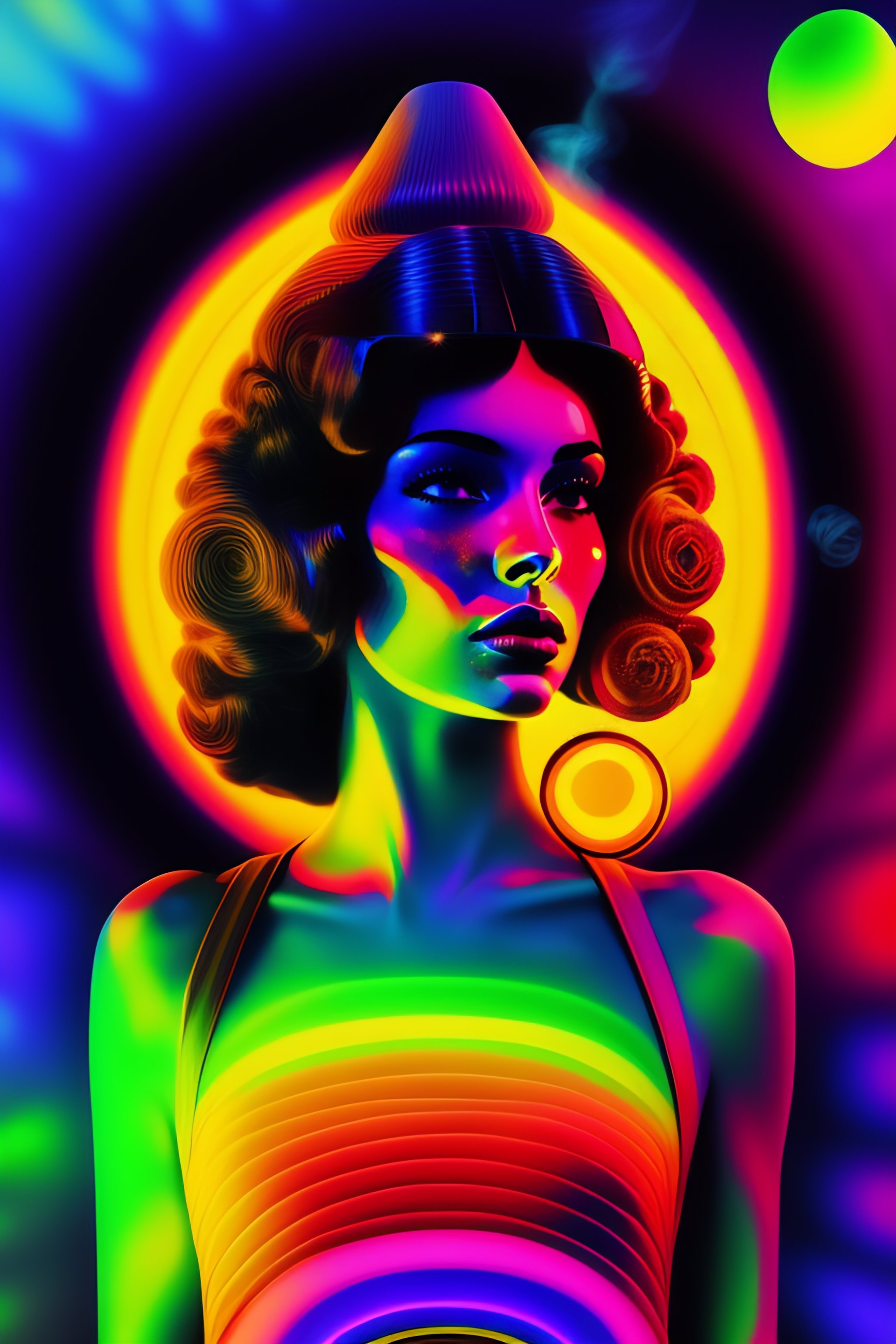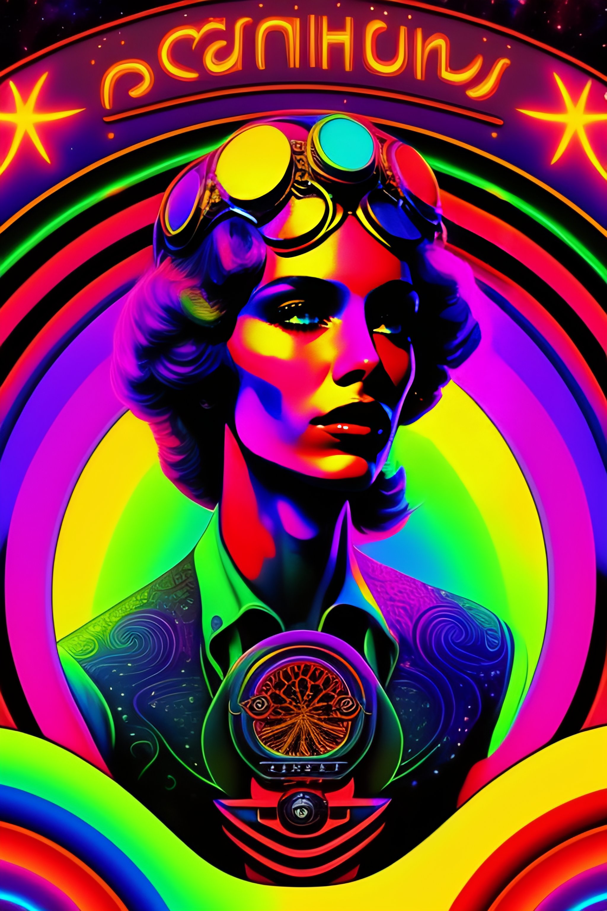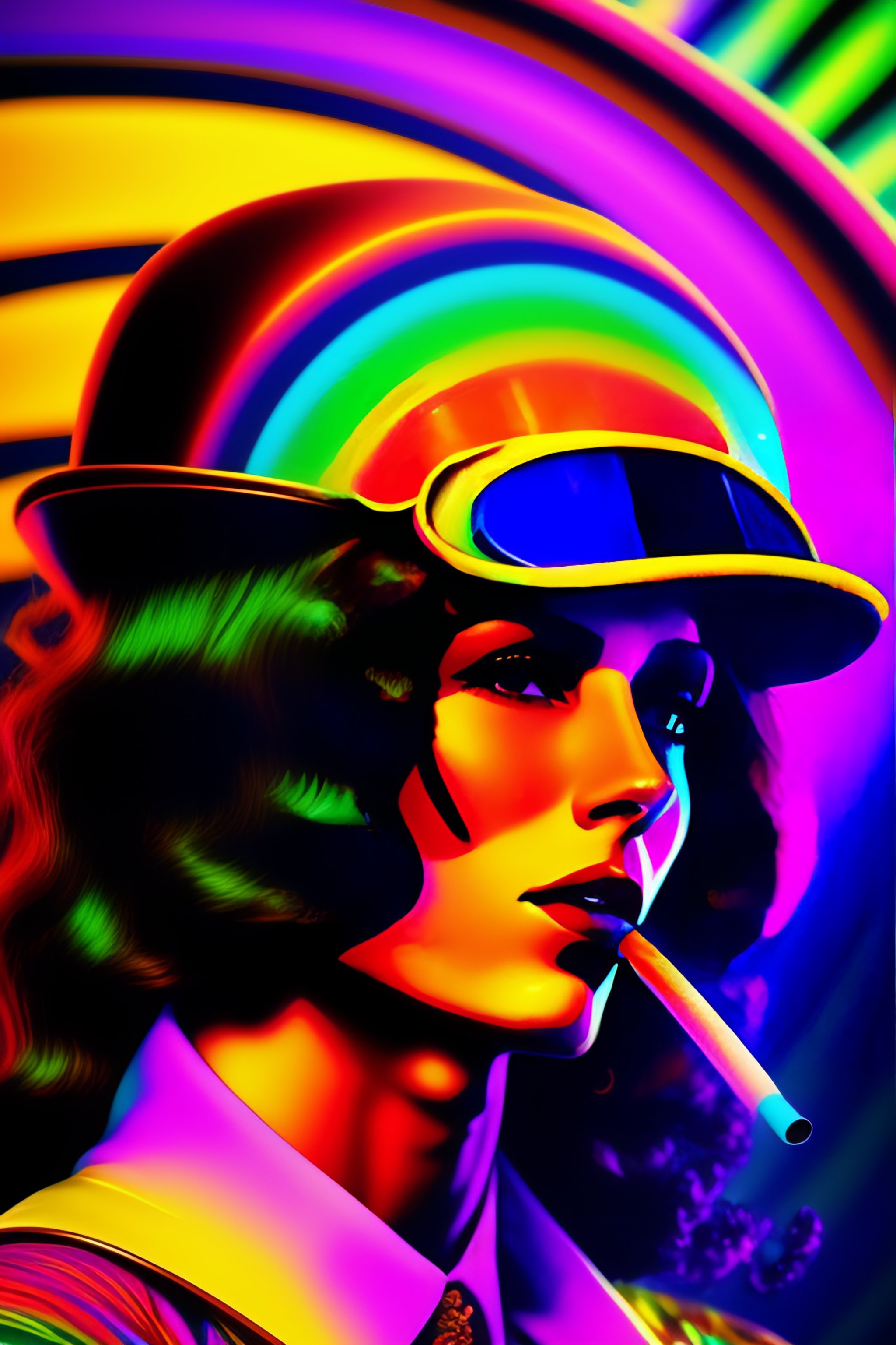 Psychedelic vintage full shot 1970's cartoon poster with alien hippy, ovni, tron, psychedelic alien hippy smoking marijuana cigarette, black in color, with a psychedelic steampunk space background, futuristic rainbow lighting, cinematic lighting, cozy lighting, 8k, cinematic poster vintage 1970's