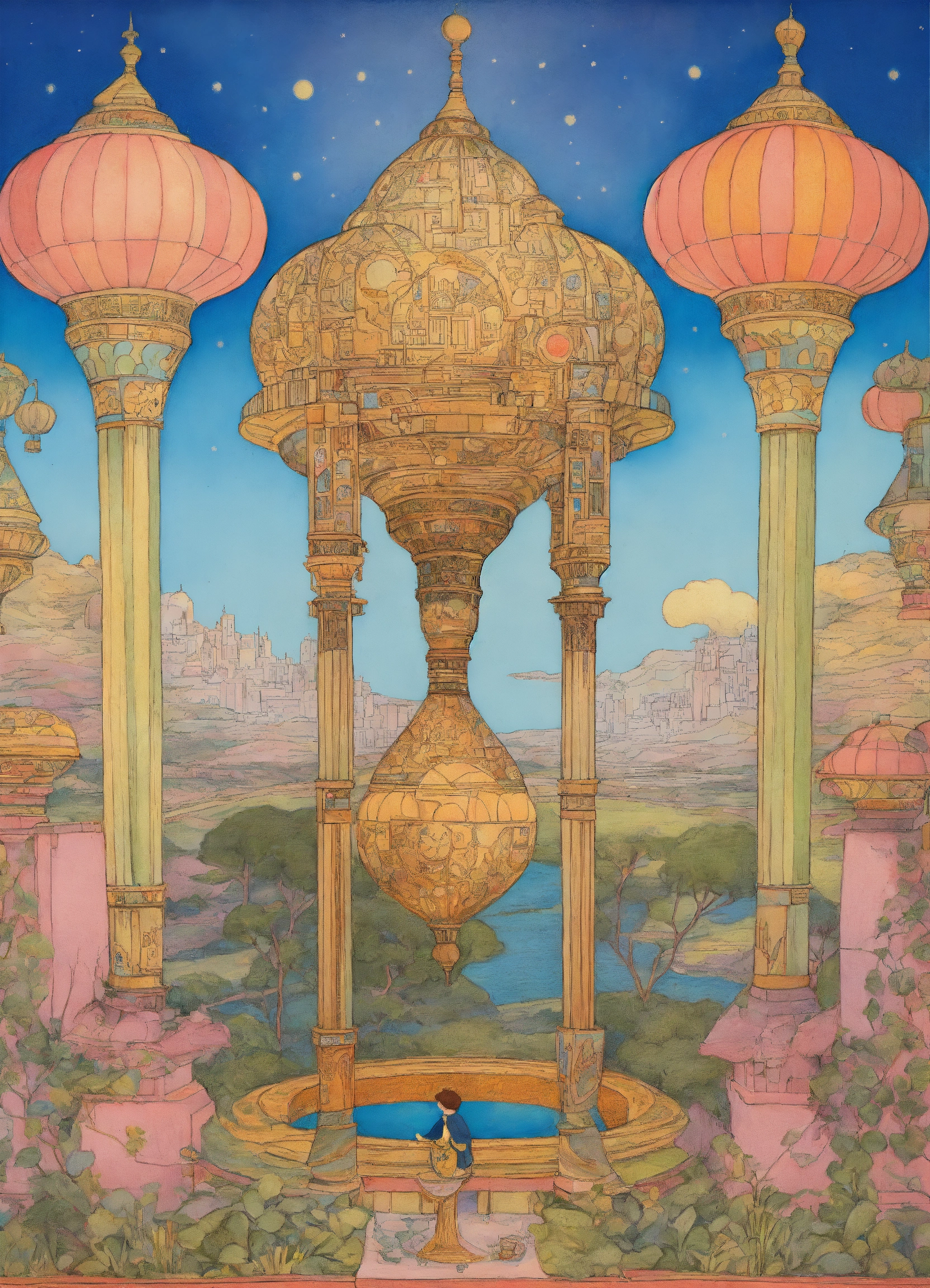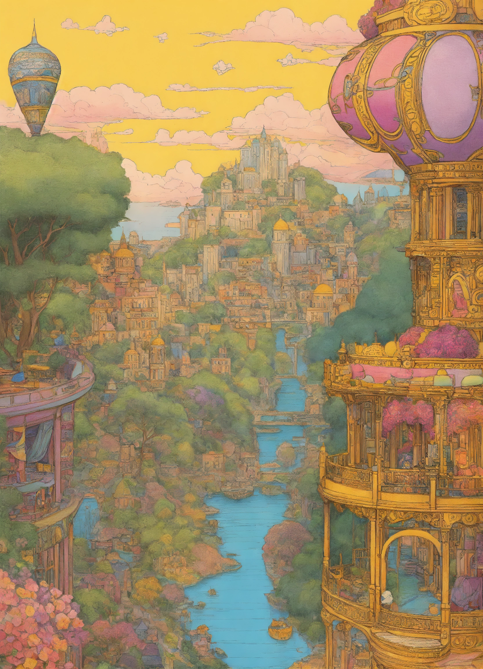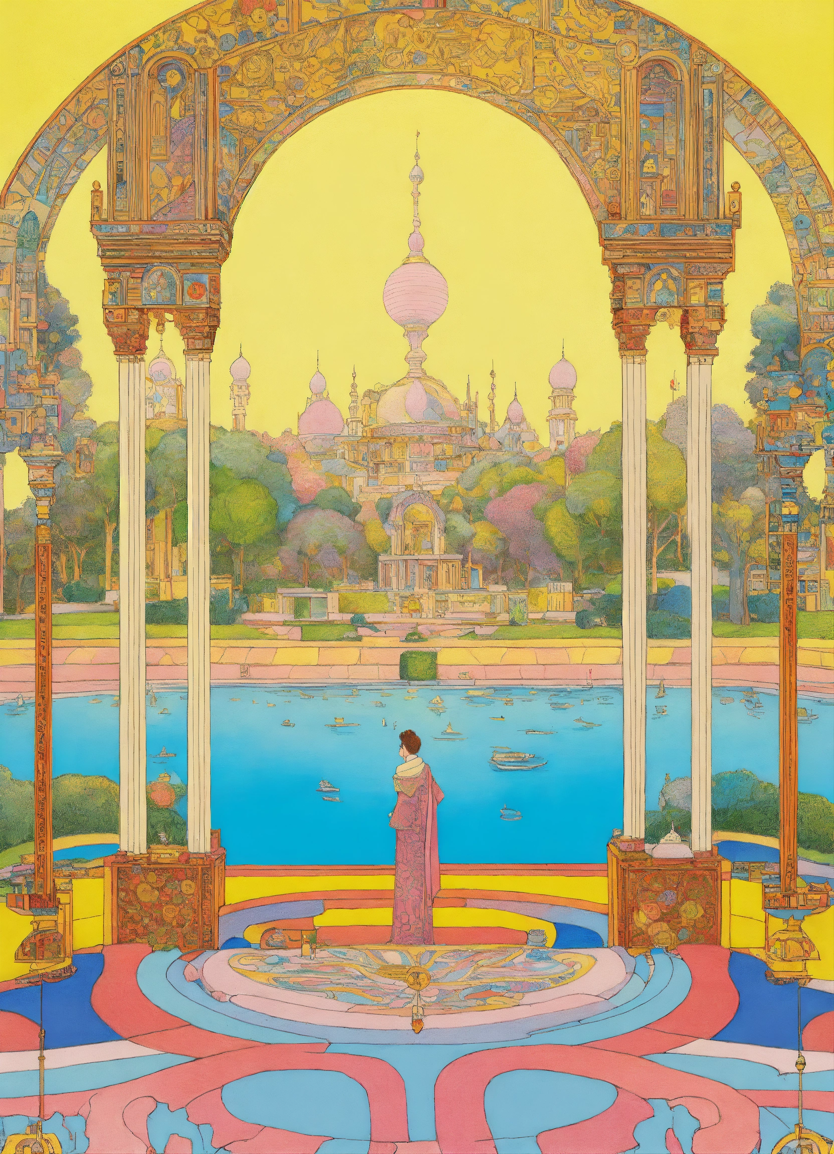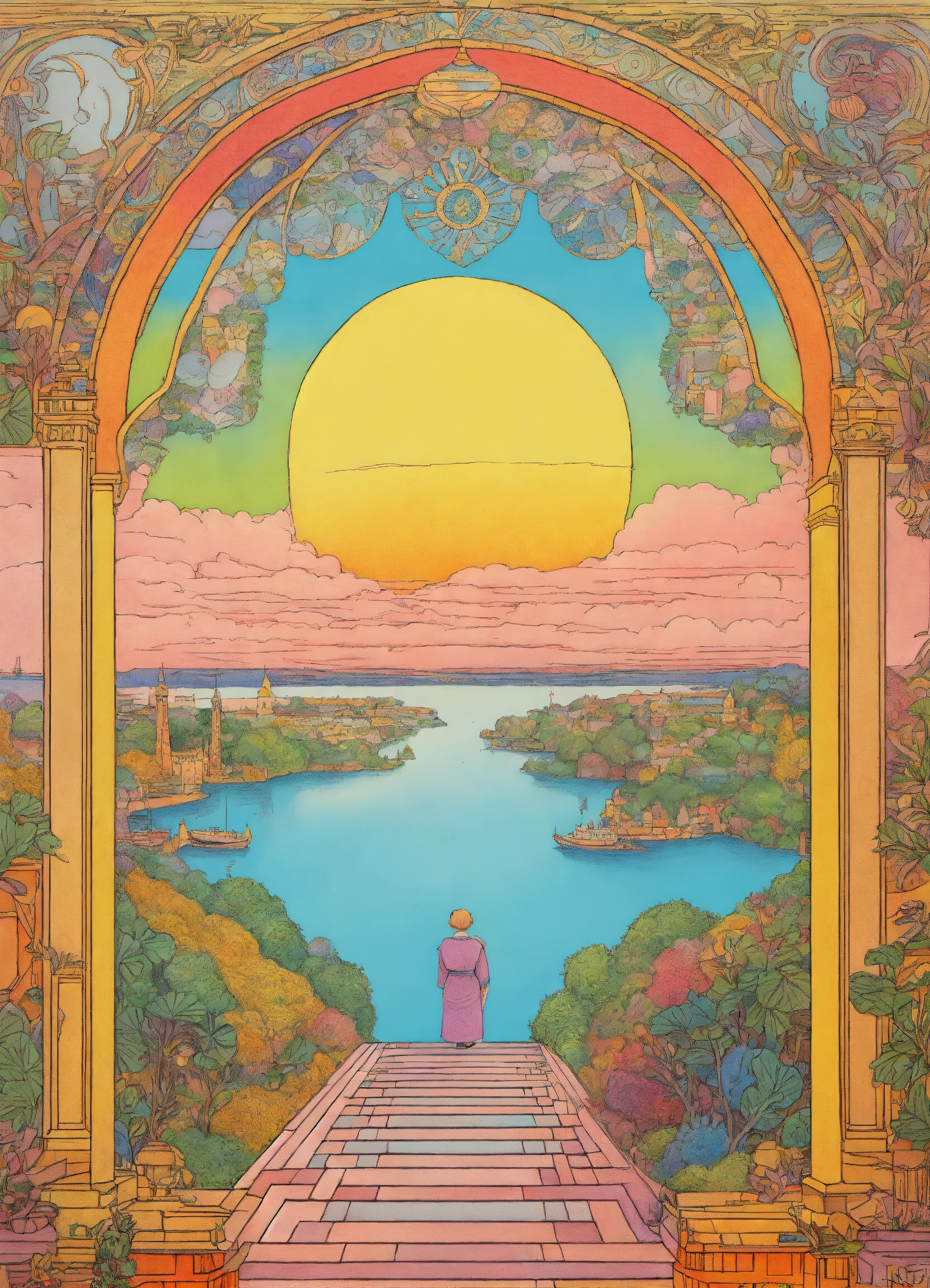 Buthanese drawing eternal bliss. line drawing, clean clear lines, coloring book style, bright colors, intricate details, elegant, discreete, serene, peaceful, fine detail, pastel pencils, winsor mccay style.