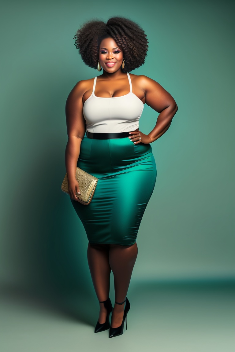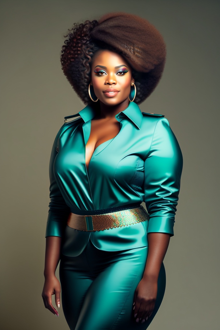 Curvy black woman, short natural curly hair, stylish clothing, full body length, teal, medium skin tone