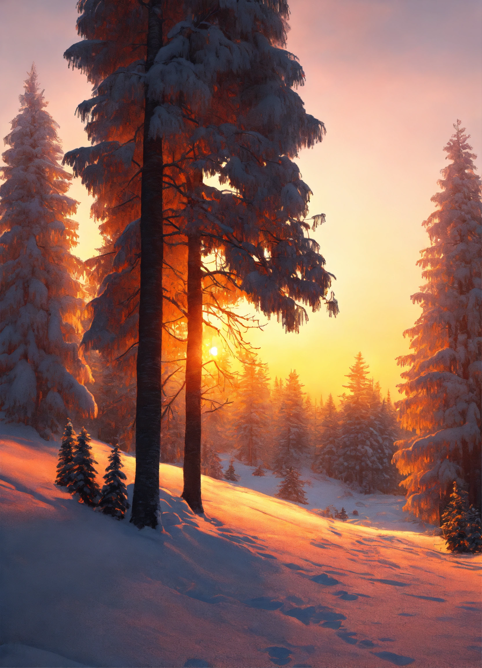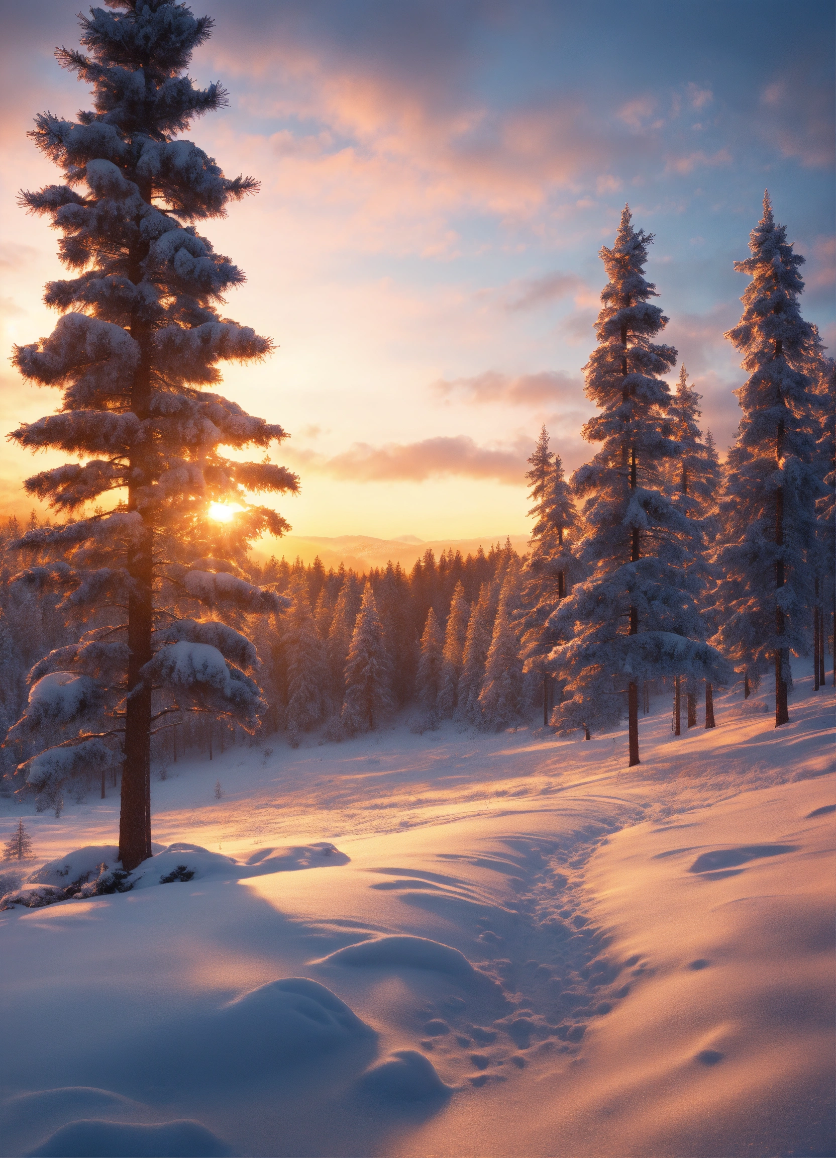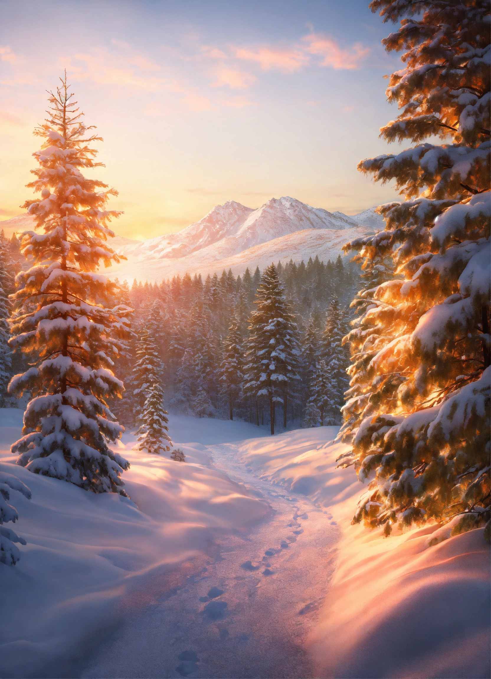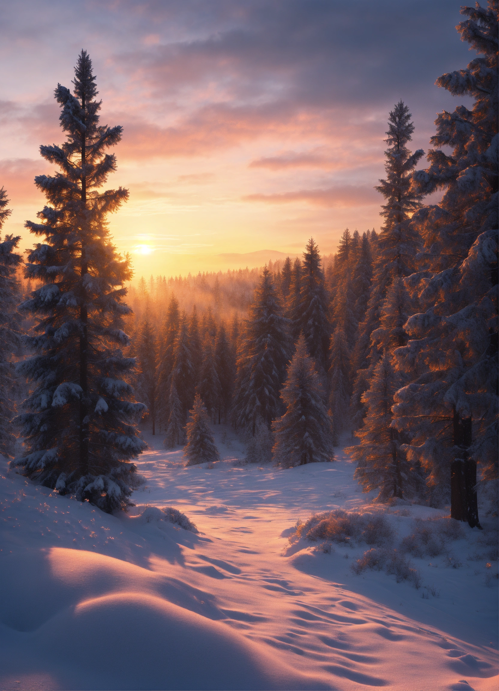 Winter landscape at sunrise, pine trees, snow, hyper realistic, detailed, 8k, sharp, magical winter theme