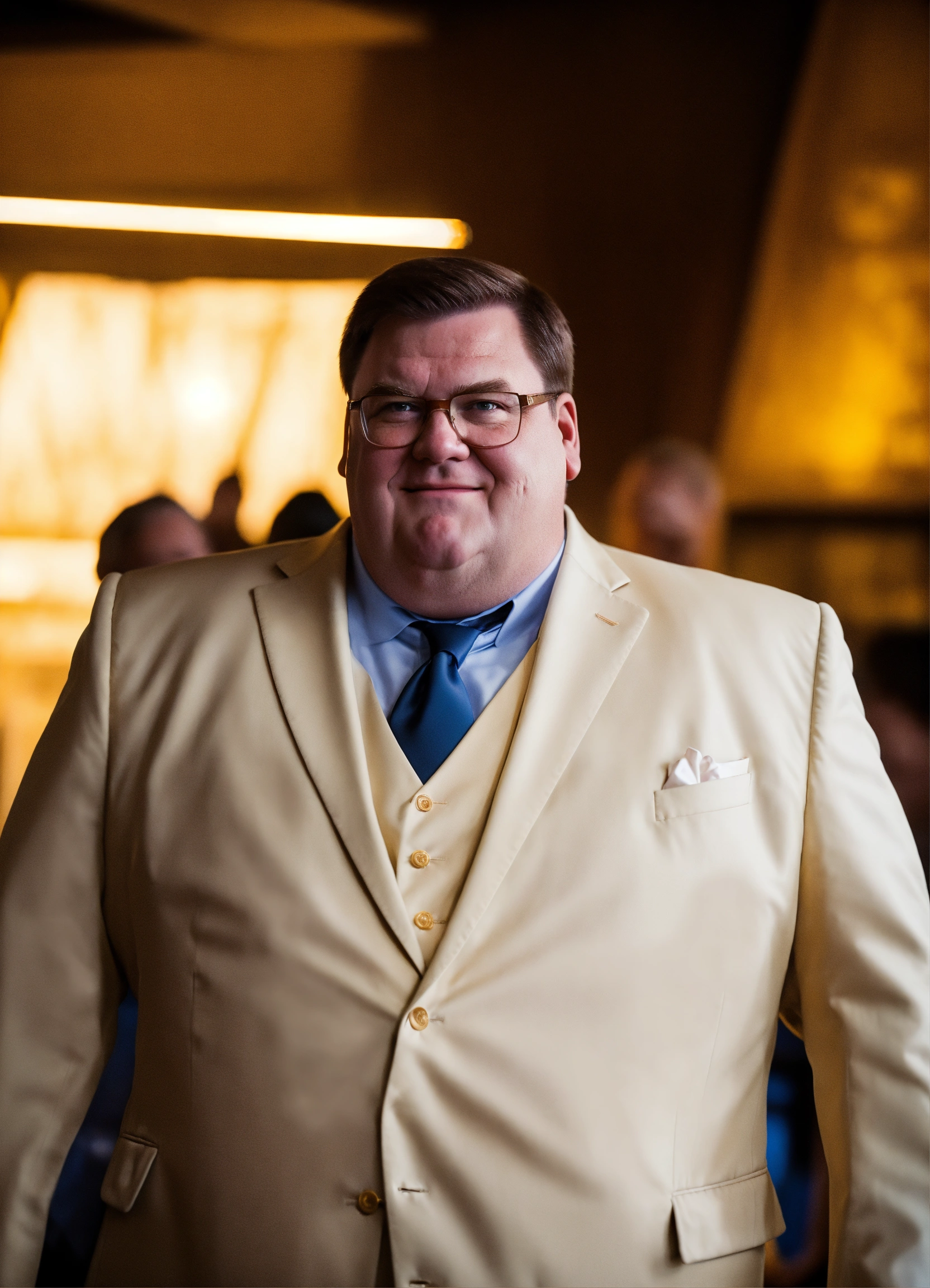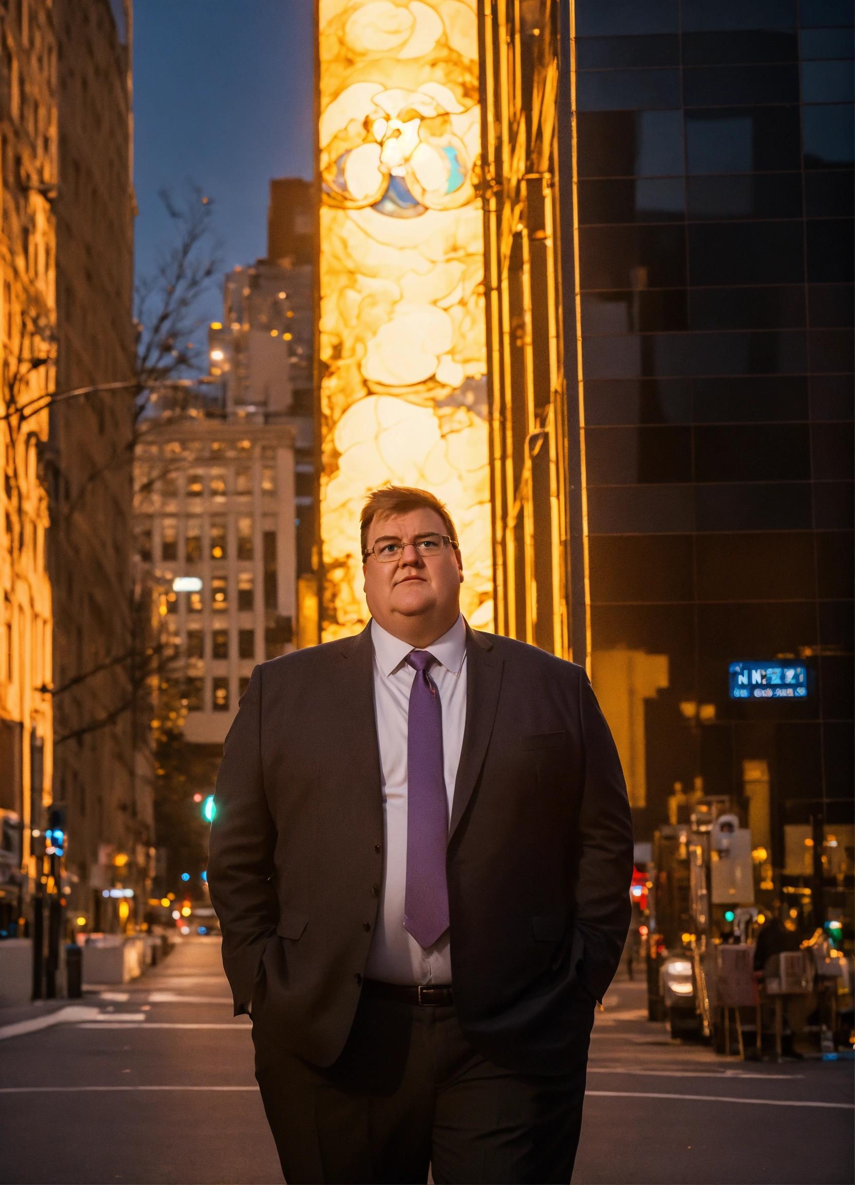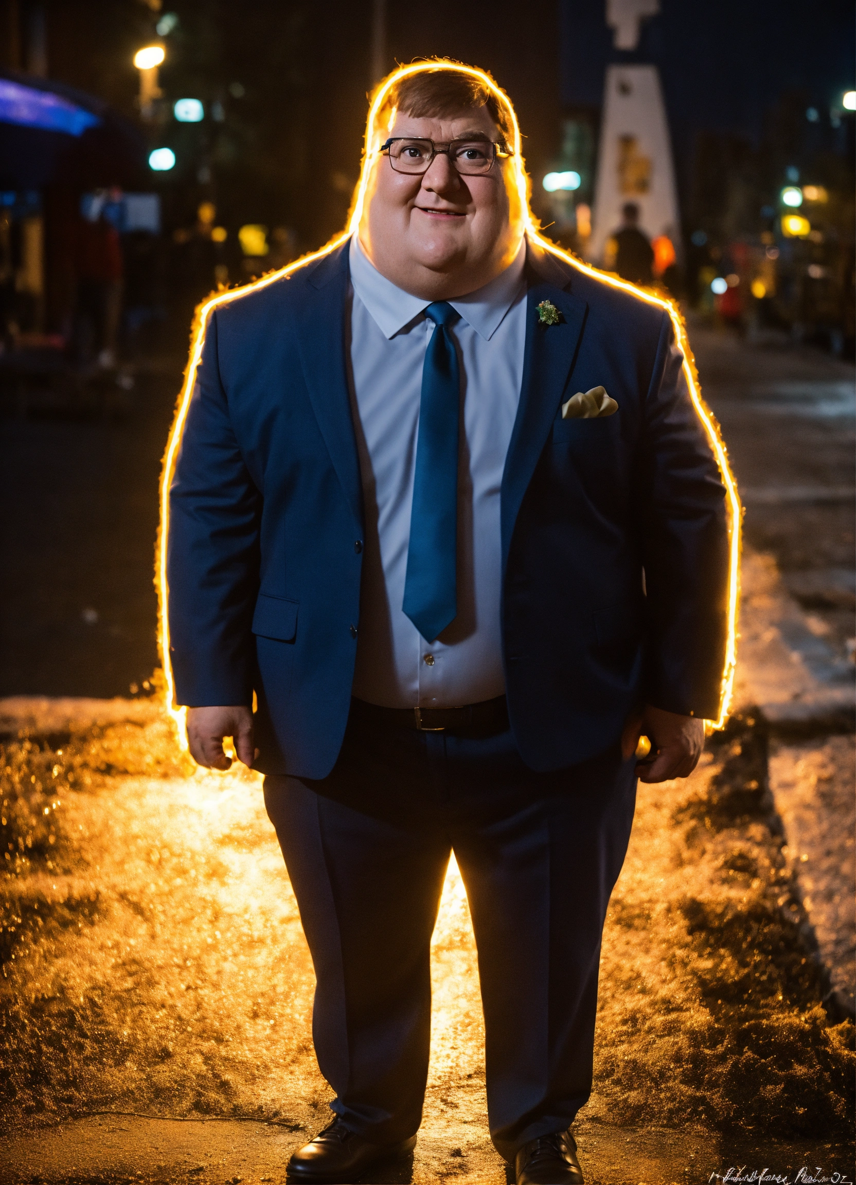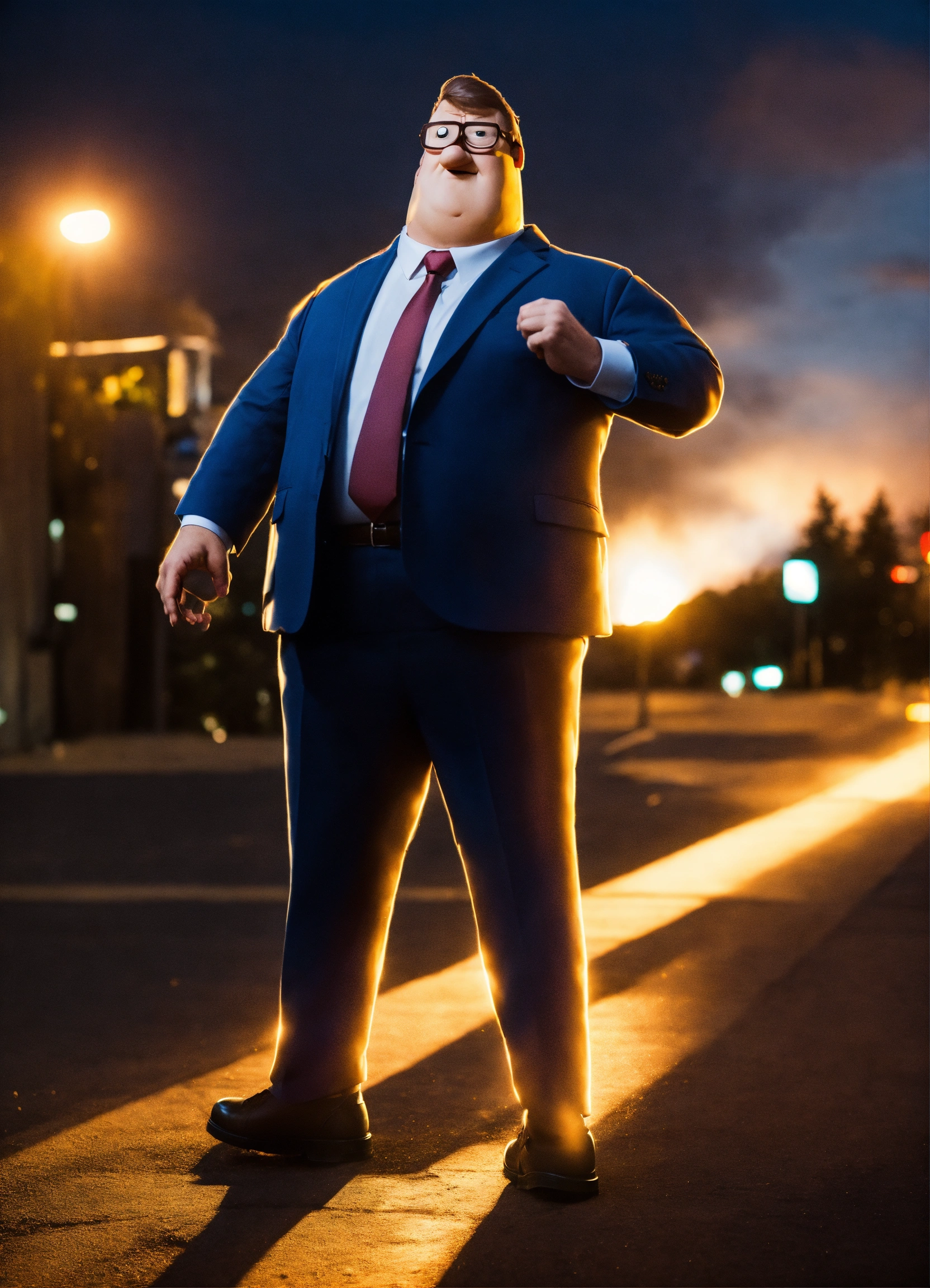 Peter griffin in a suit comes from above, casting a heroic glow on his face. taken on nikon z9, f/1.8, 1/400s, iso 200.