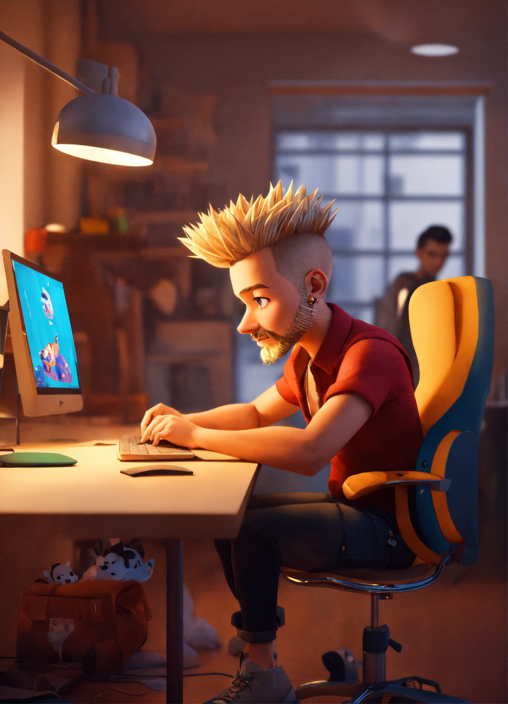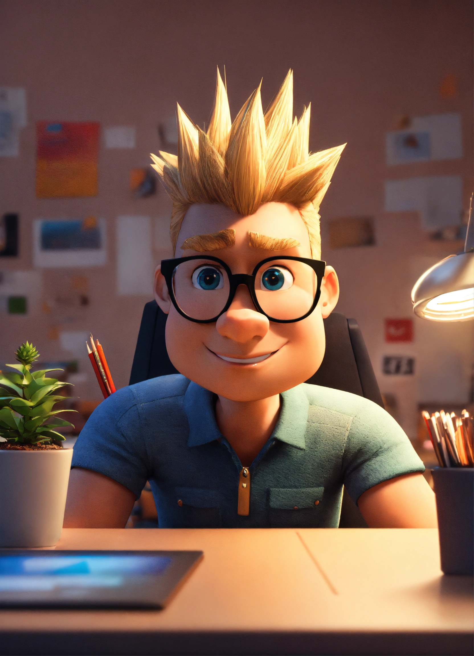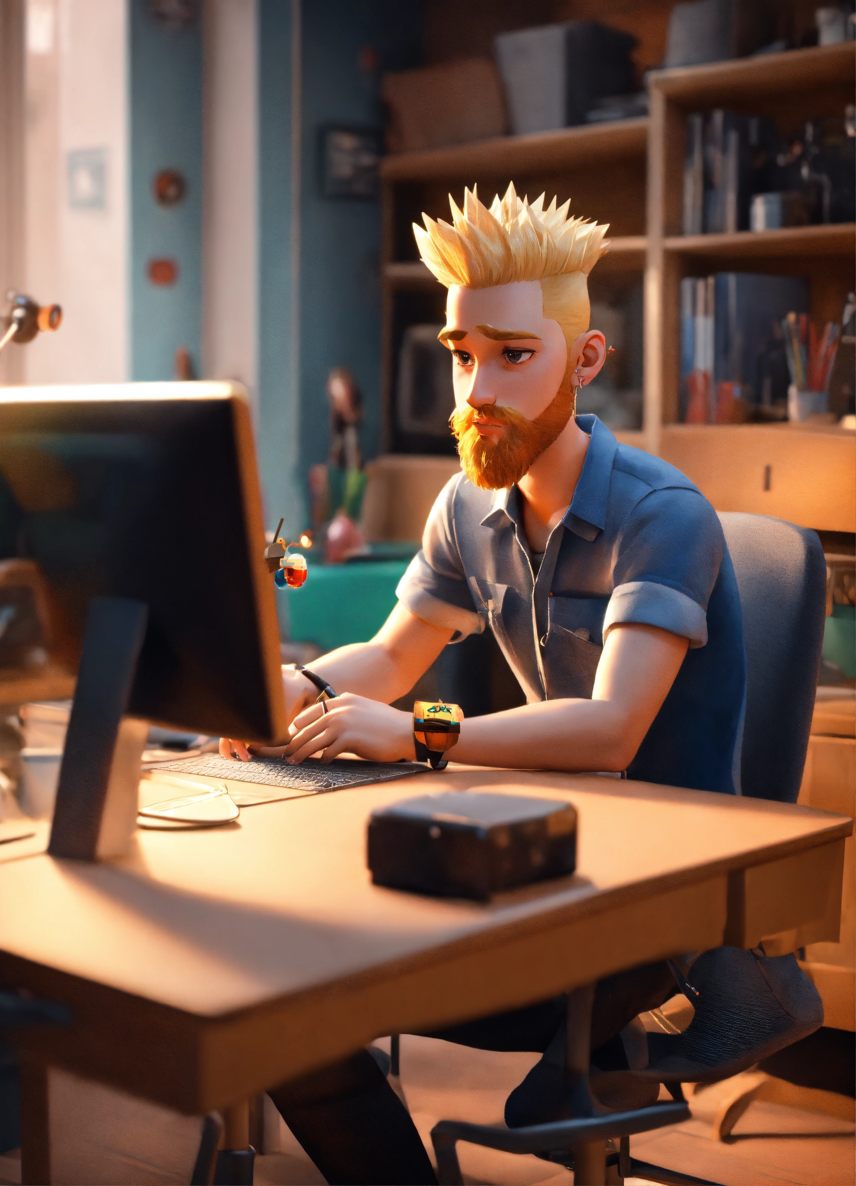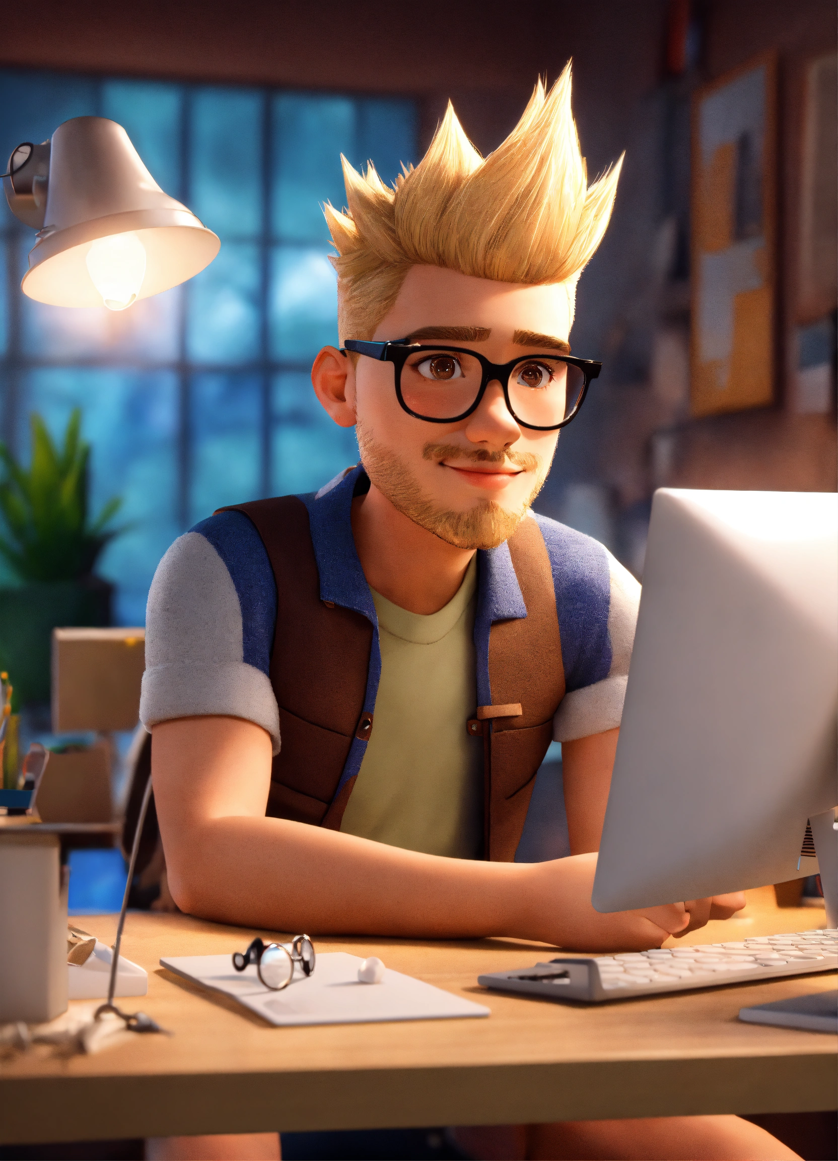 A 3d pixar disney style pôster, with a cute blond man, spiky hair, shaved on the side, thin beard, silver hoop earrings, sitting at the table, computer, the man is a graphic designer, workplace
