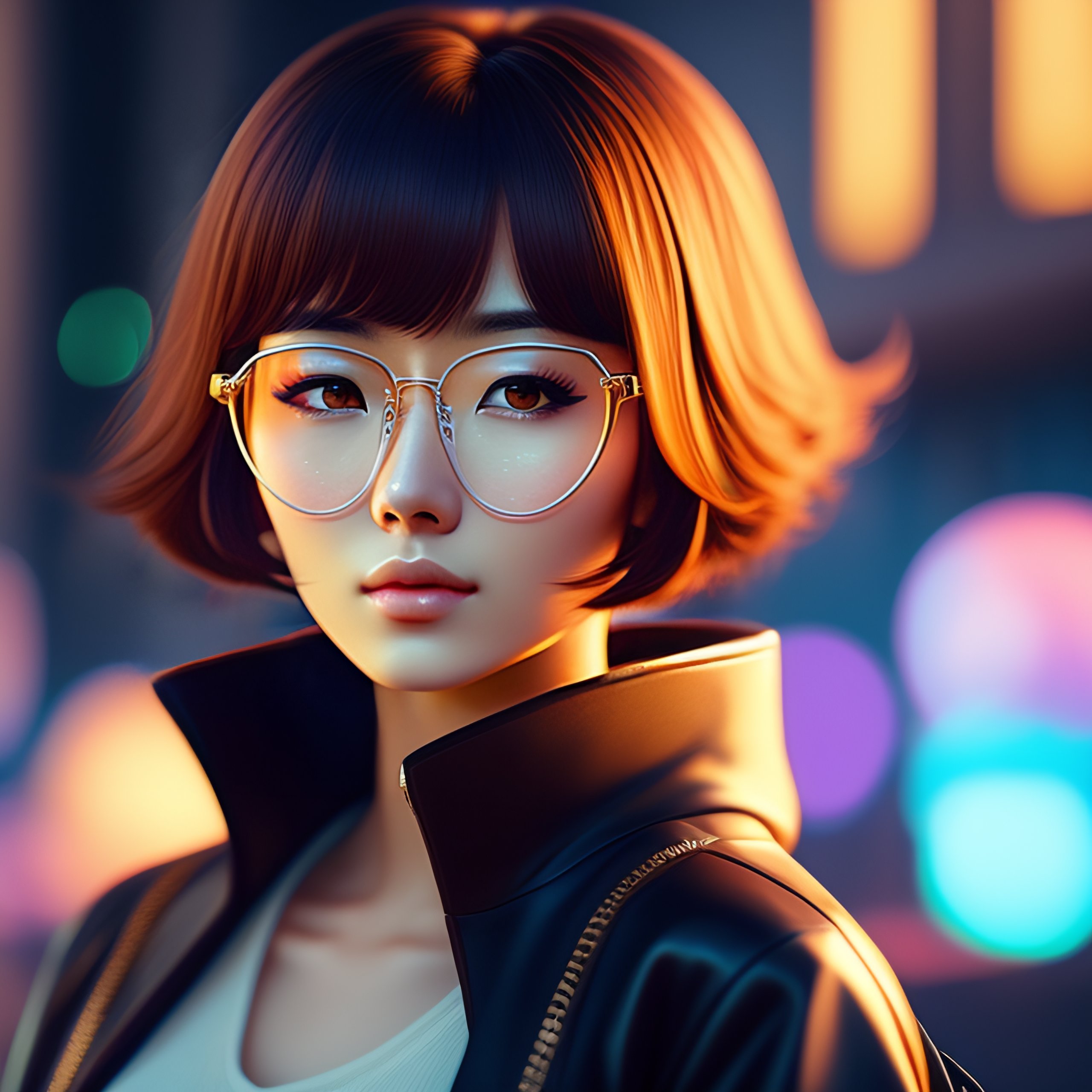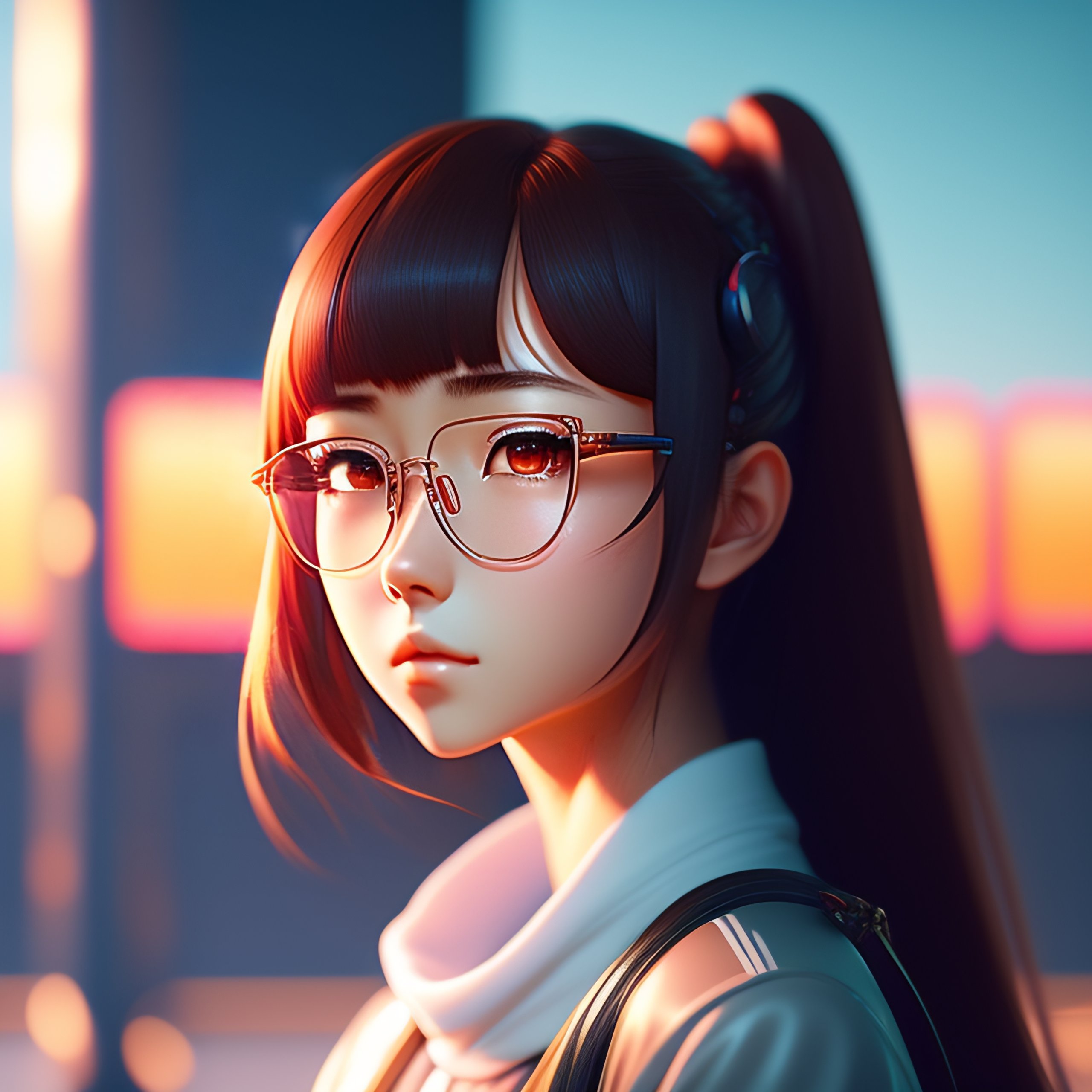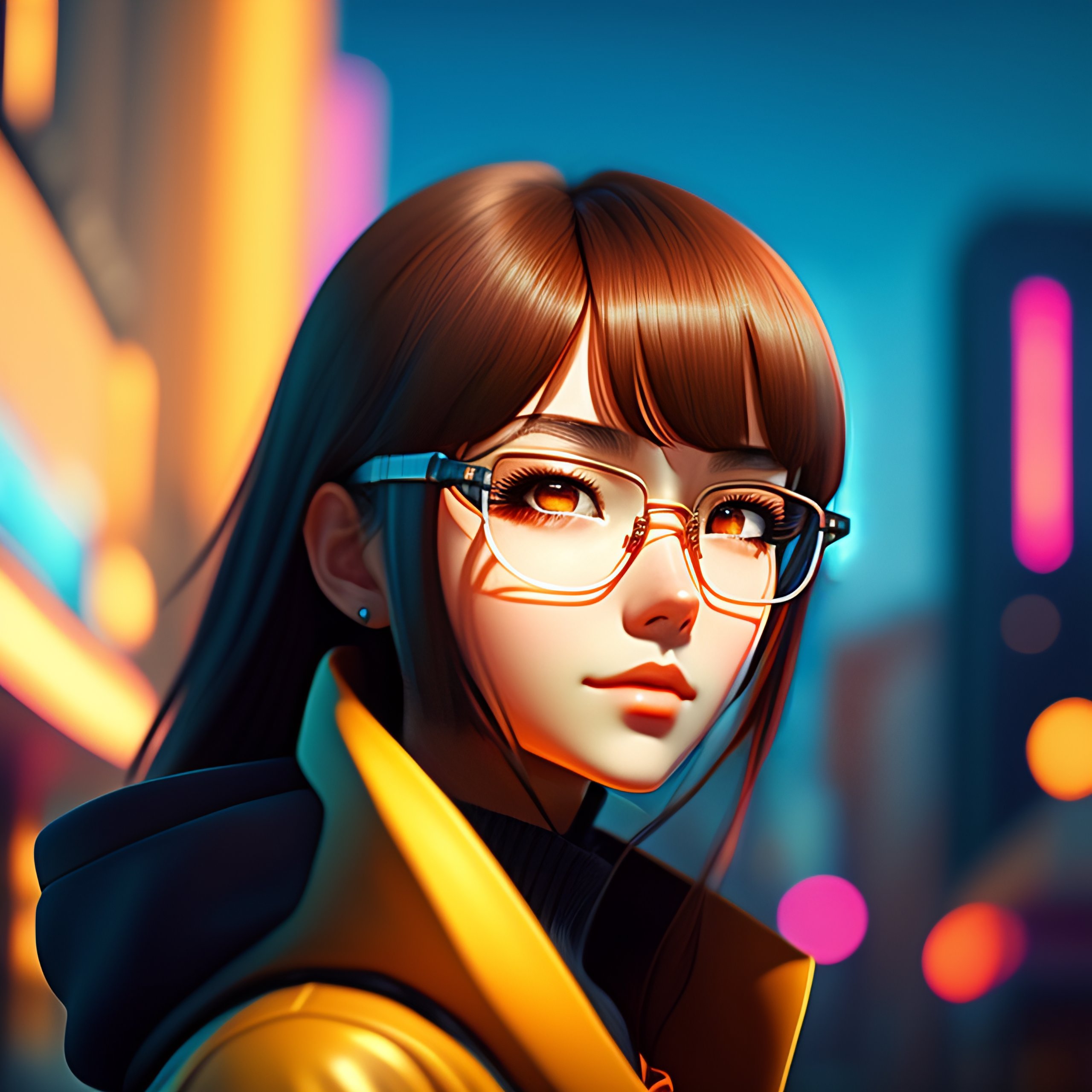 Anime girl with brown hair and brown eyes and round glasses, cyberpunk room landscape on the background, deep bokeh, close-up, anime masterpiece by studio ghibli. 8k, sharp high quality classic anime from 2000 in style of hayao miyazaki