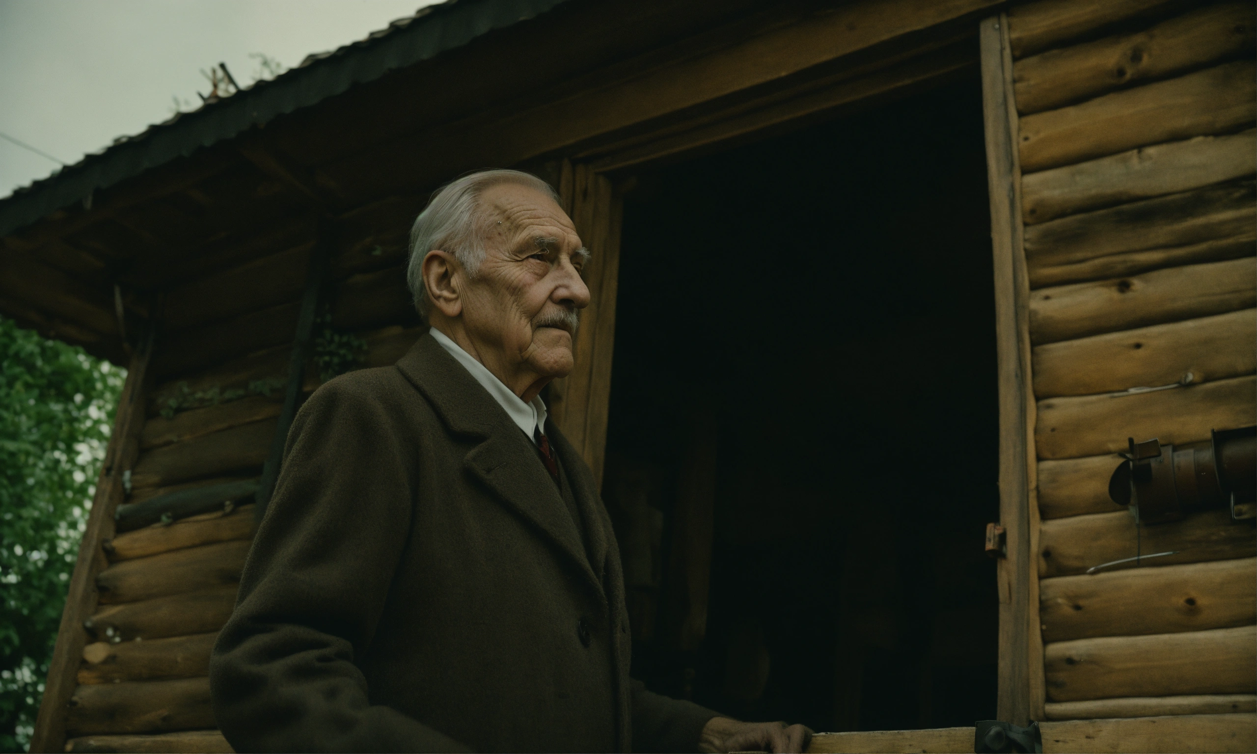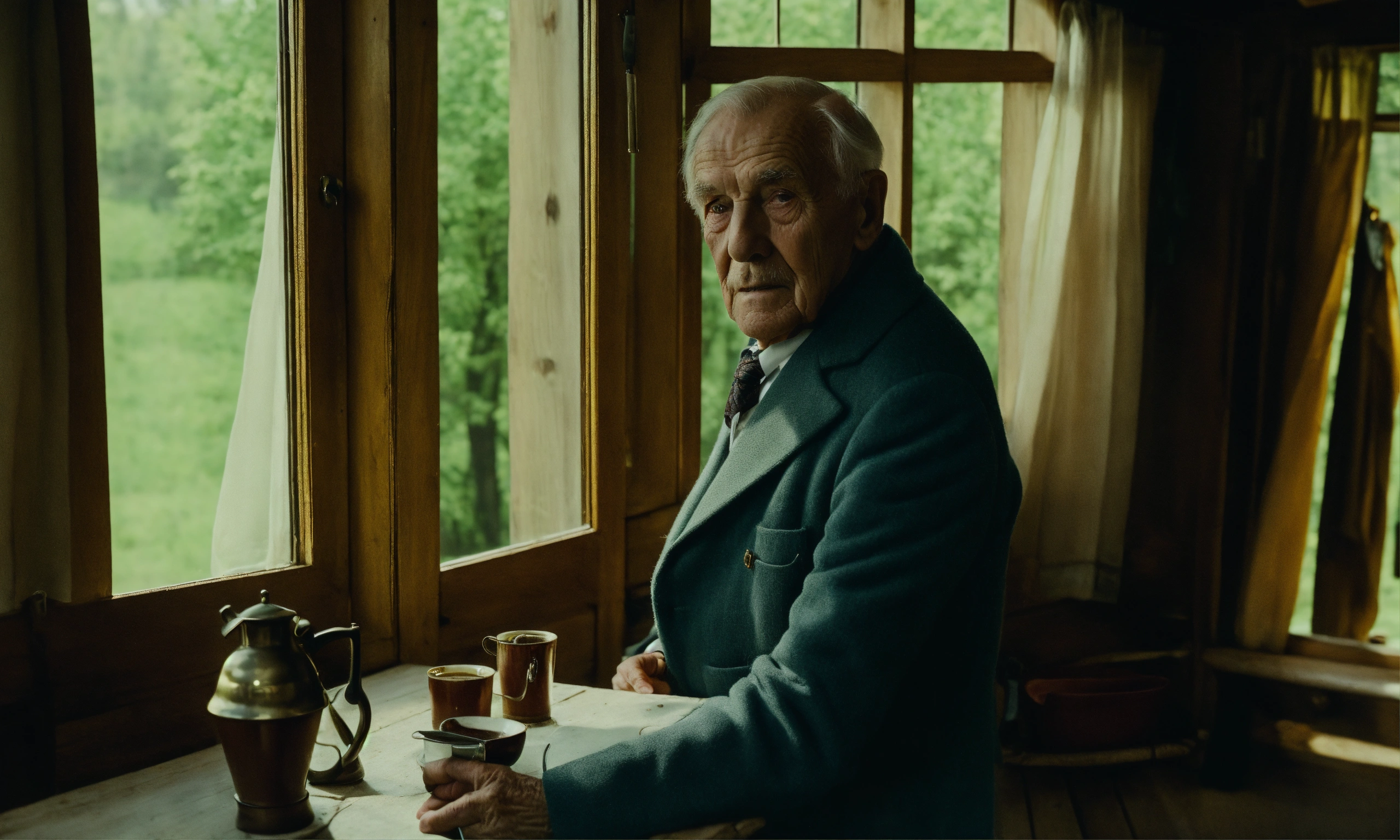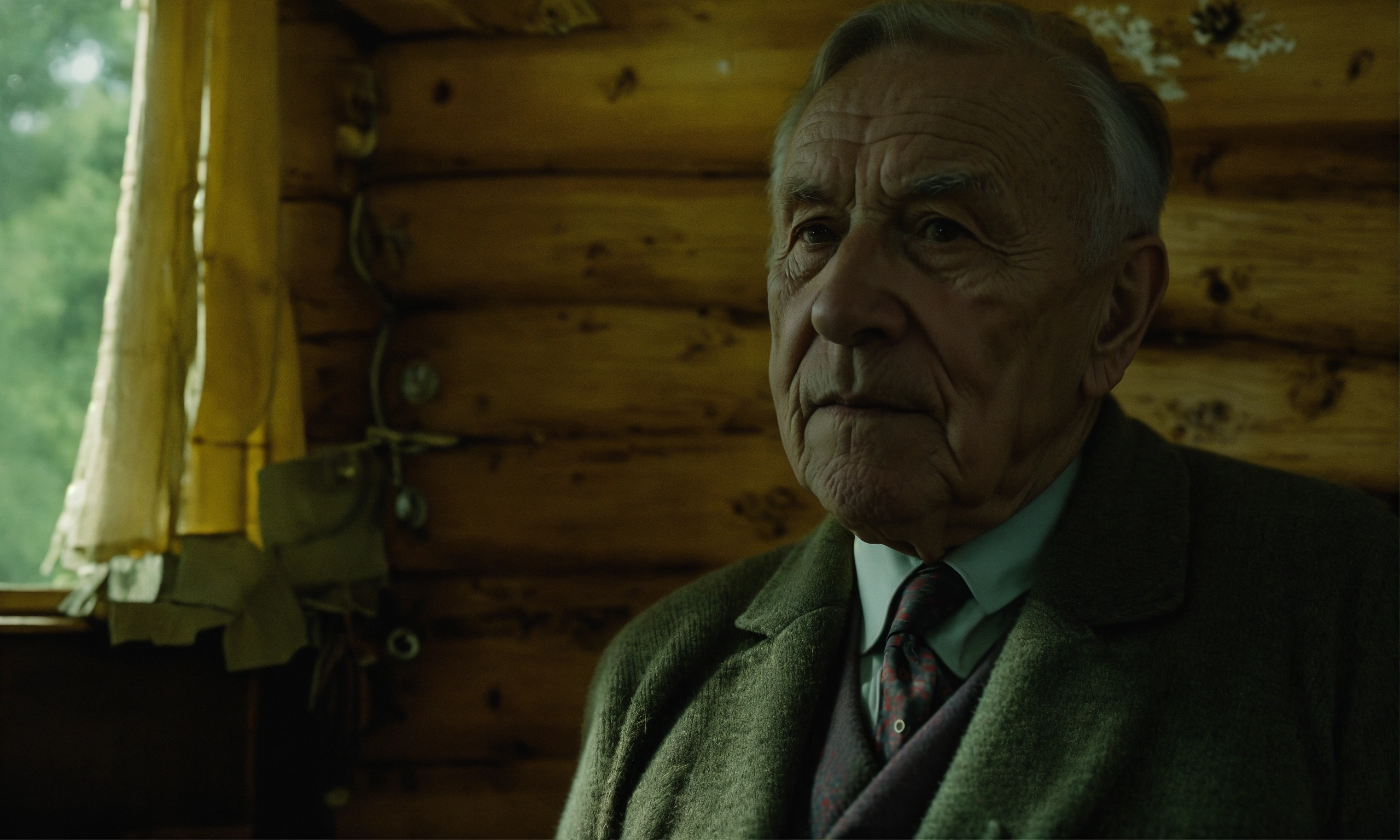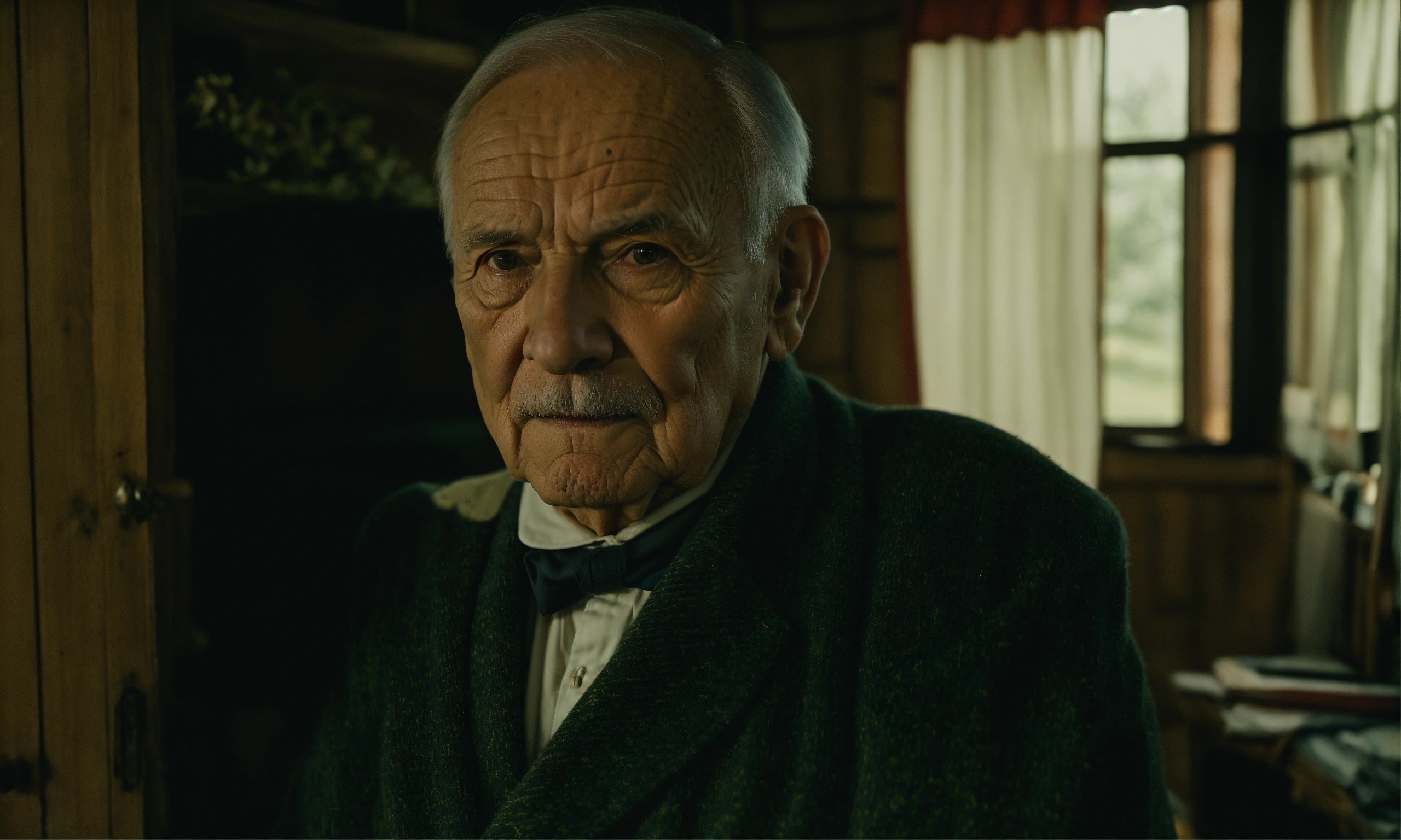Retro warszawa 1920-1930, elderly gentleman, inside a cozy cabin, looks at the camera at half height, short hair.