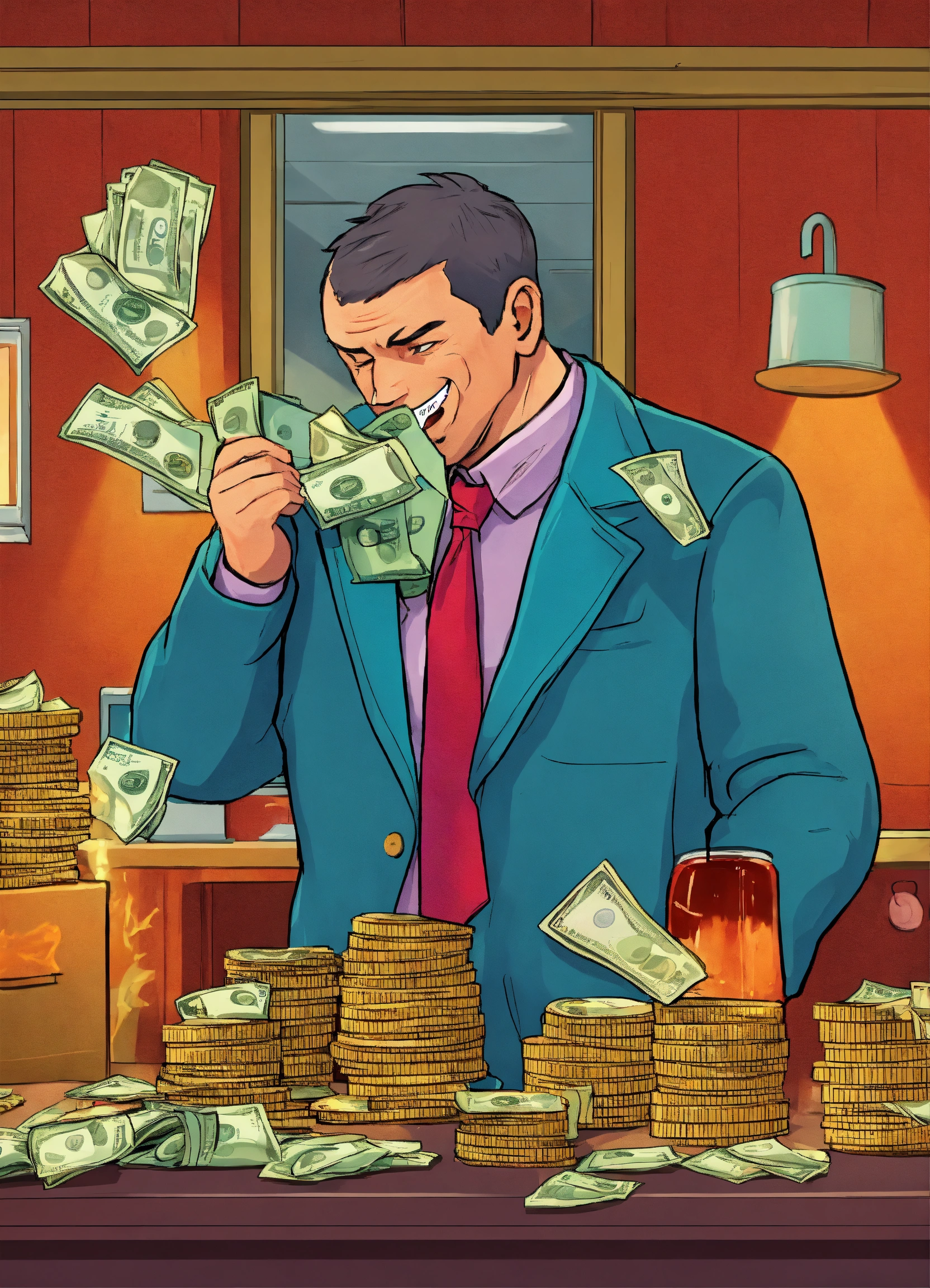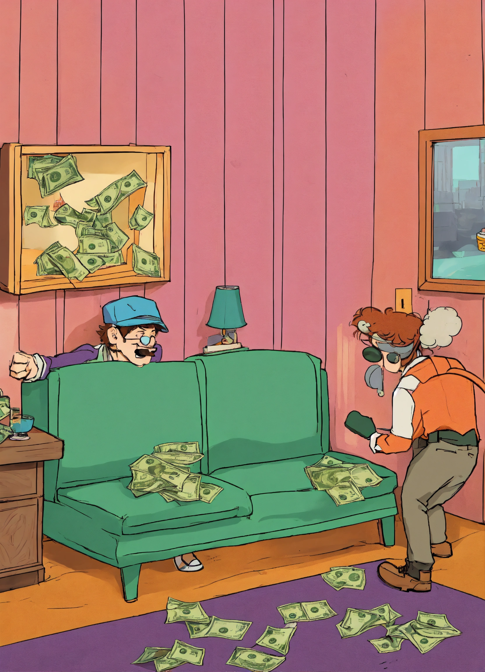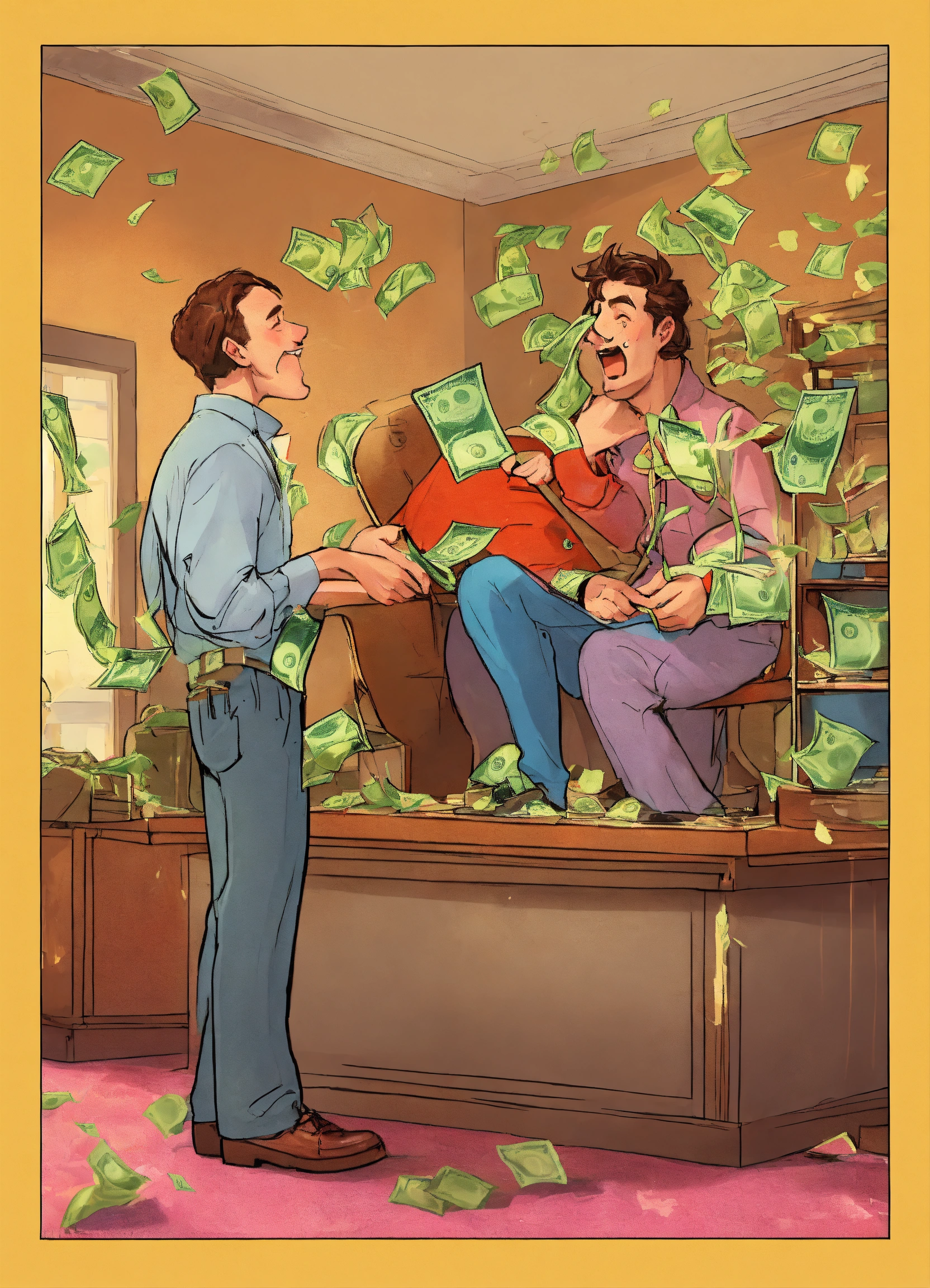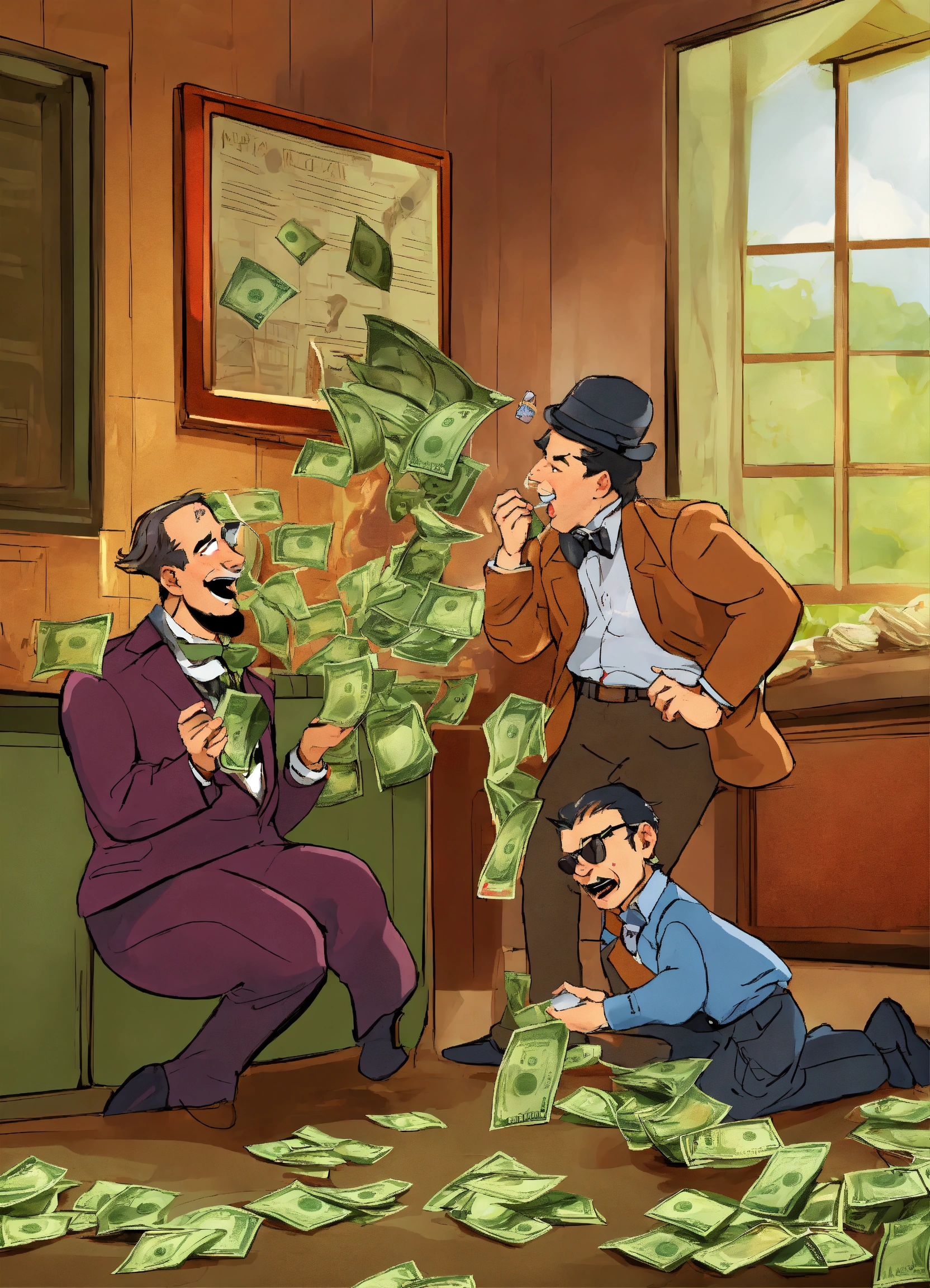 Create a humorous scenario where characters attempt to 'out-prank' each other using money-themed gags and tricks