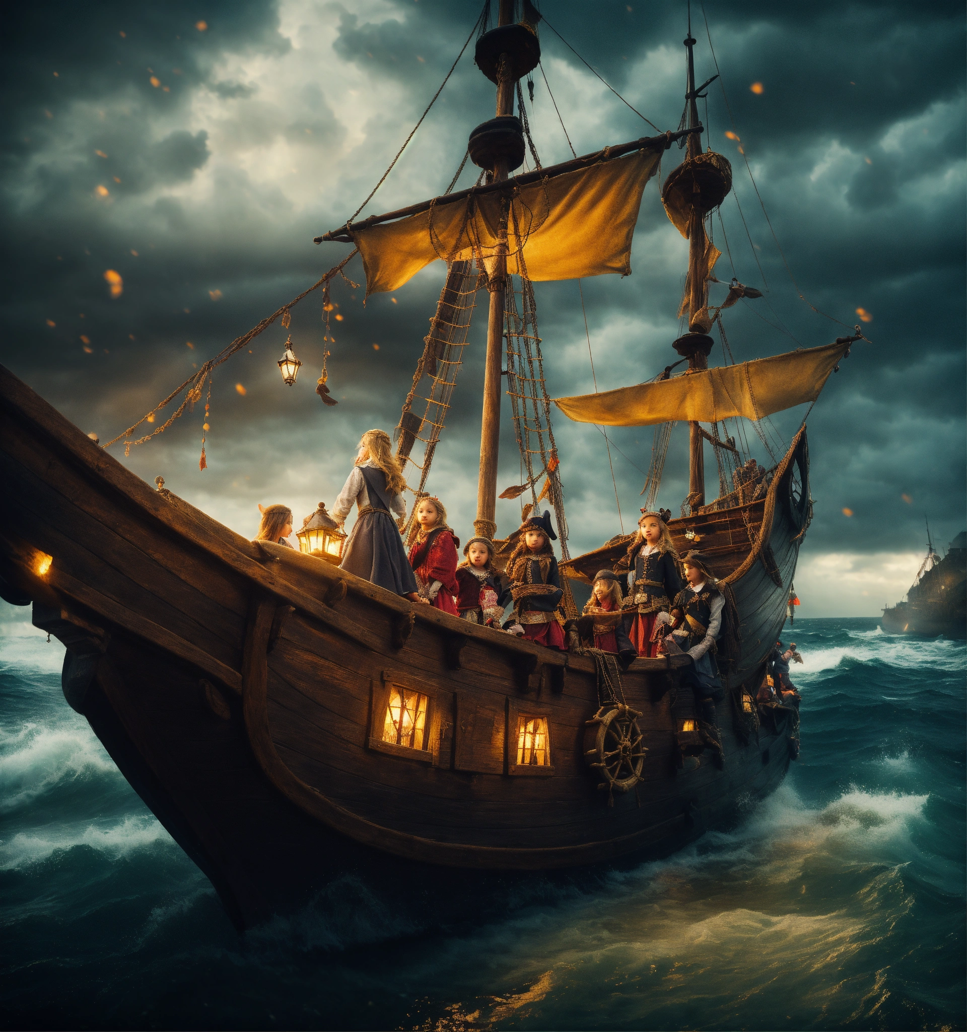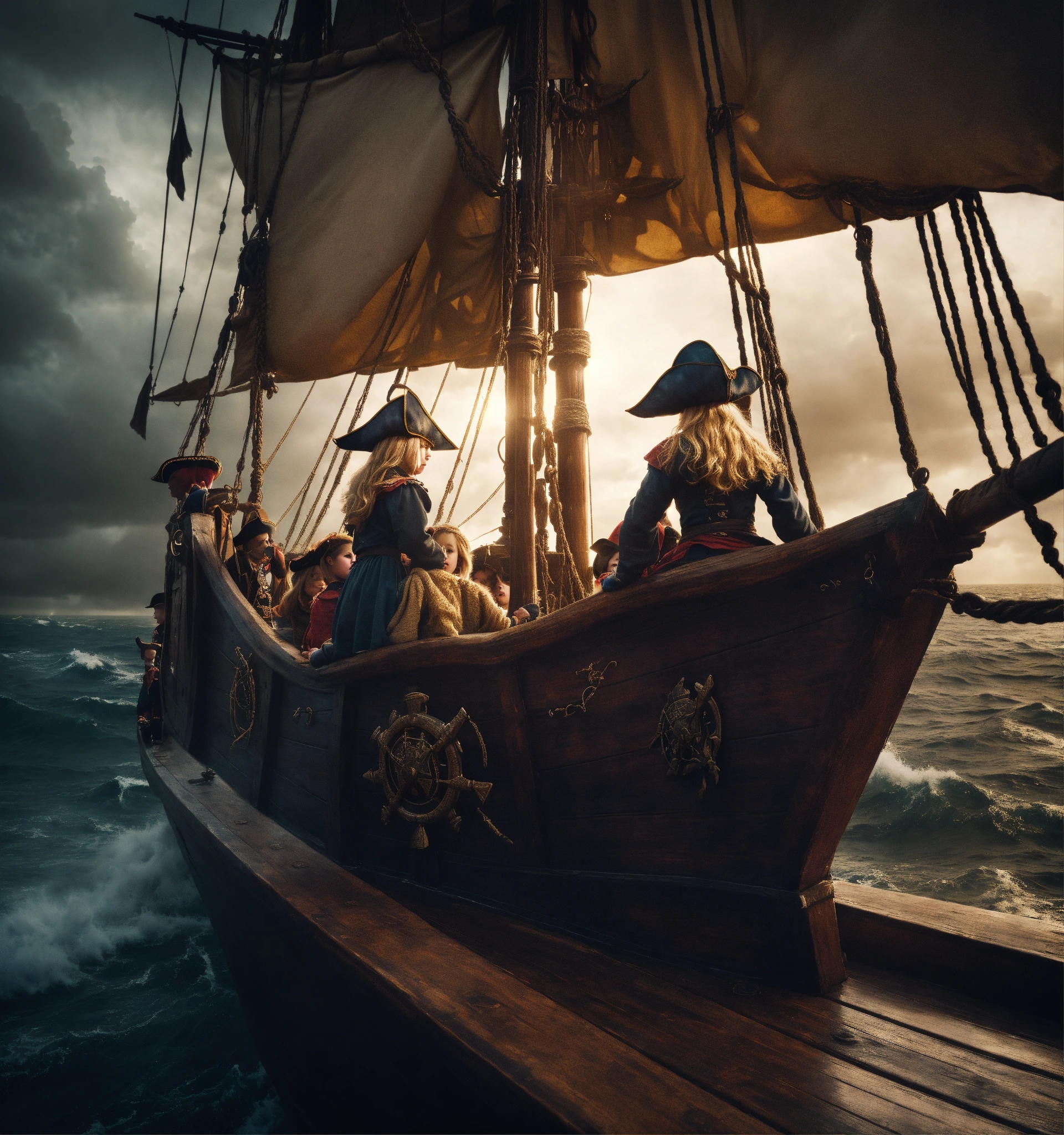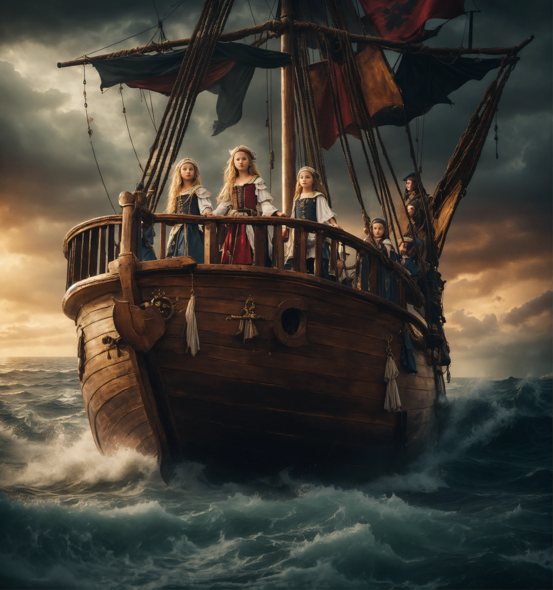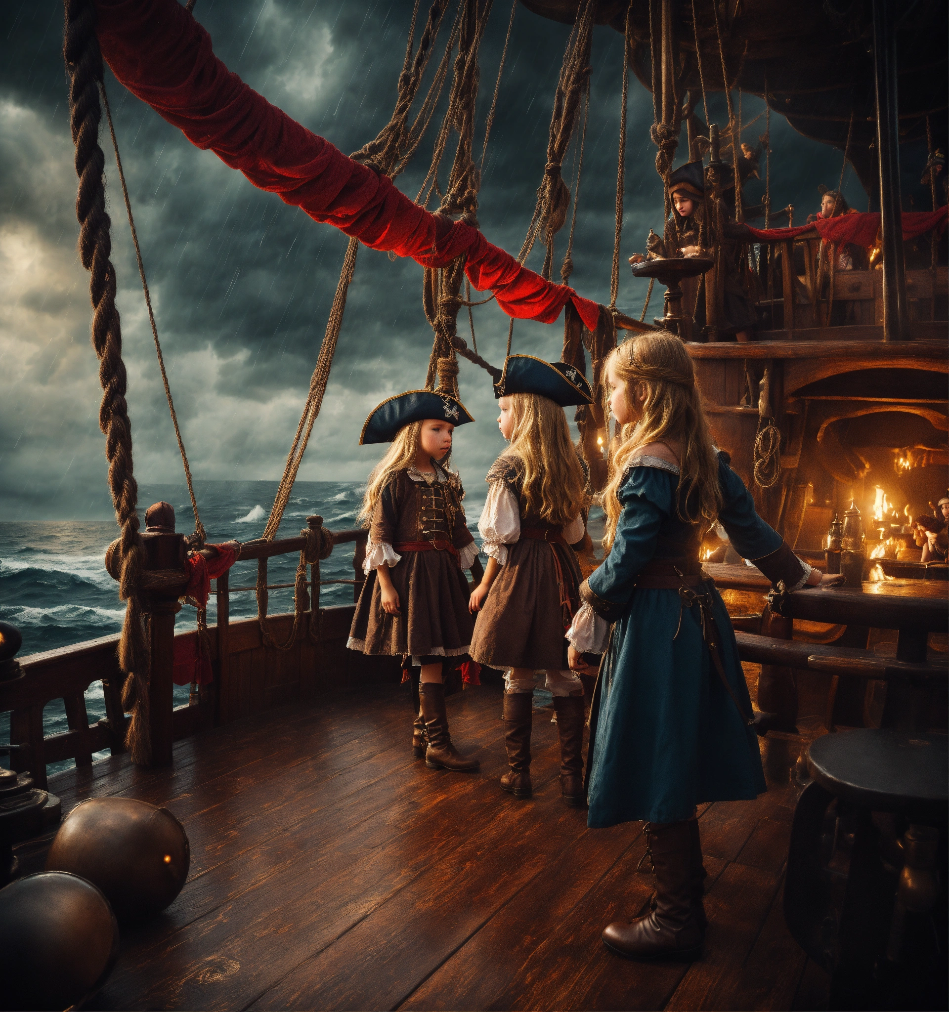 An epic fantasy scene featuring two little girls, blonde and brunette twins on a deck of a medieval pirate ship surrounded by men pirates. stormy atmosphere. cinematic view, sharp detail.