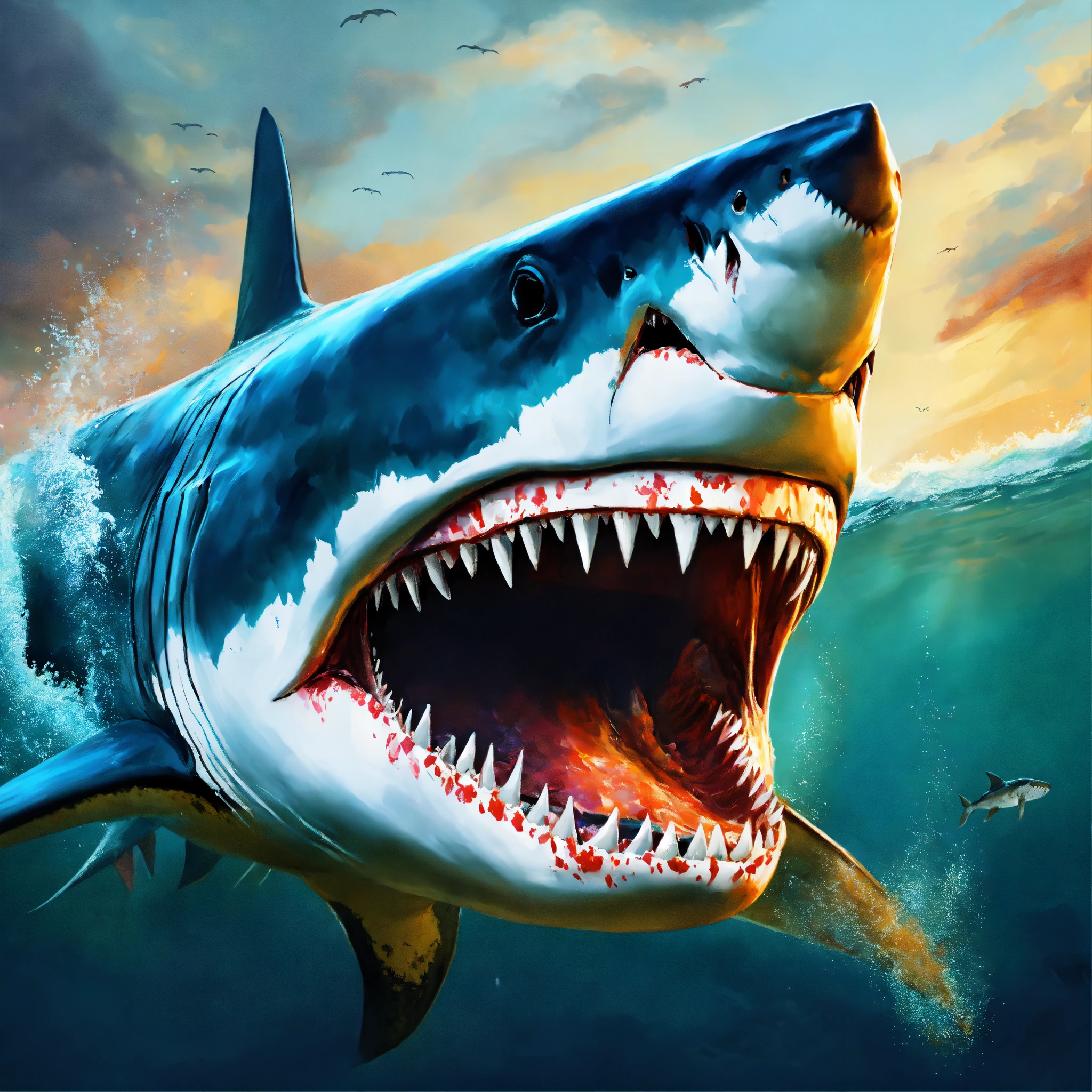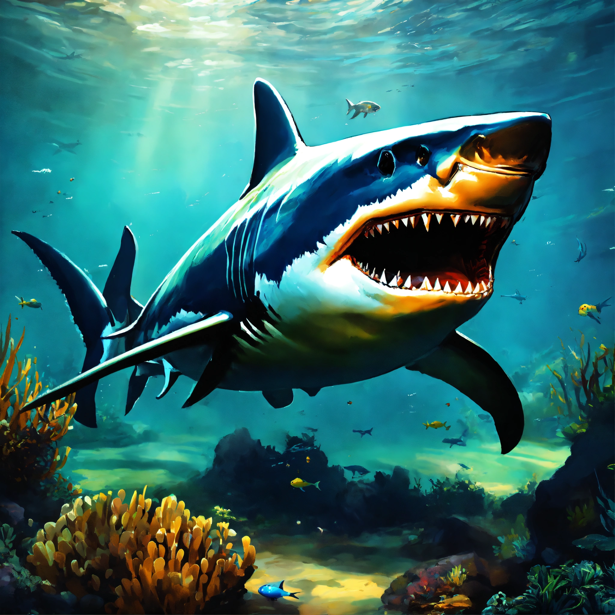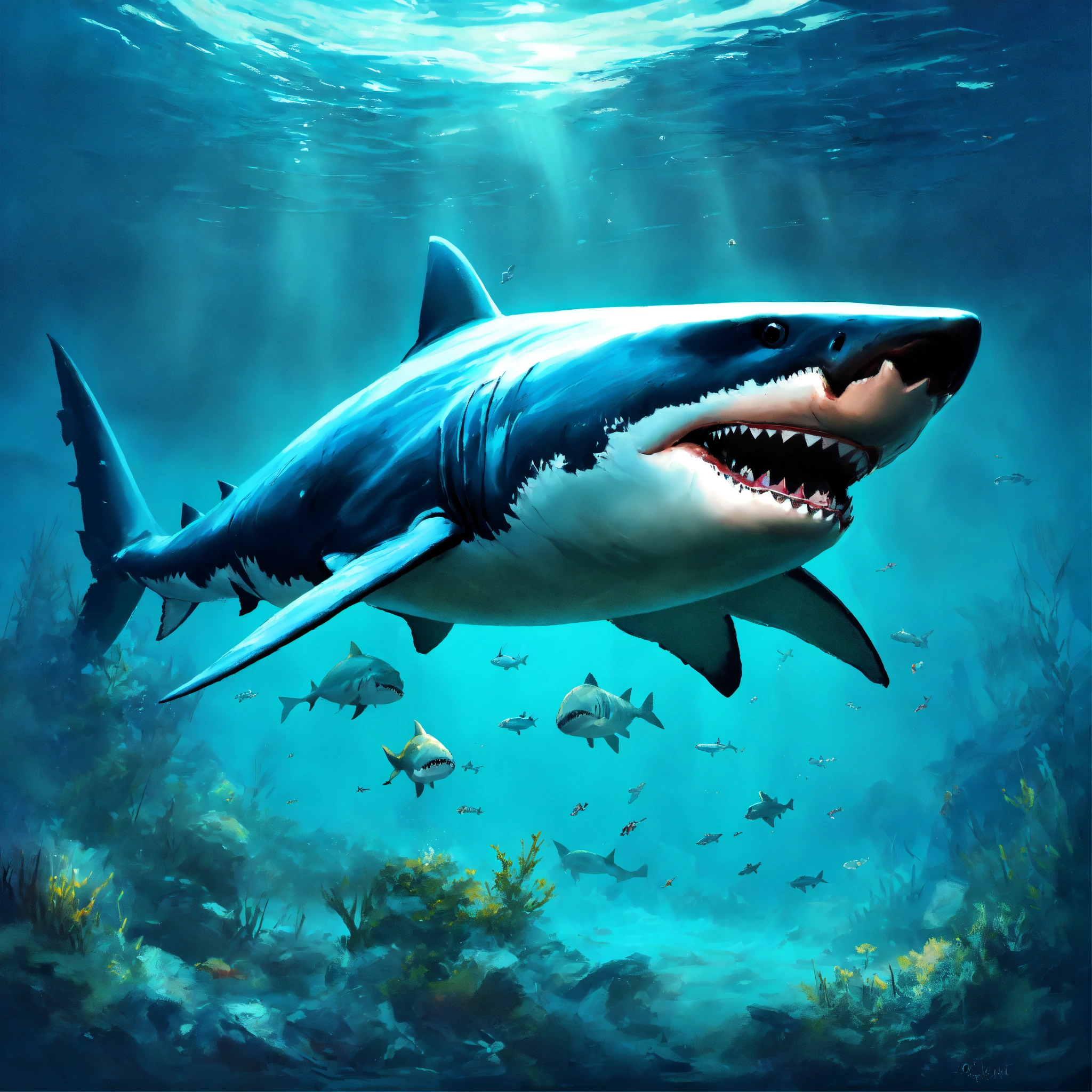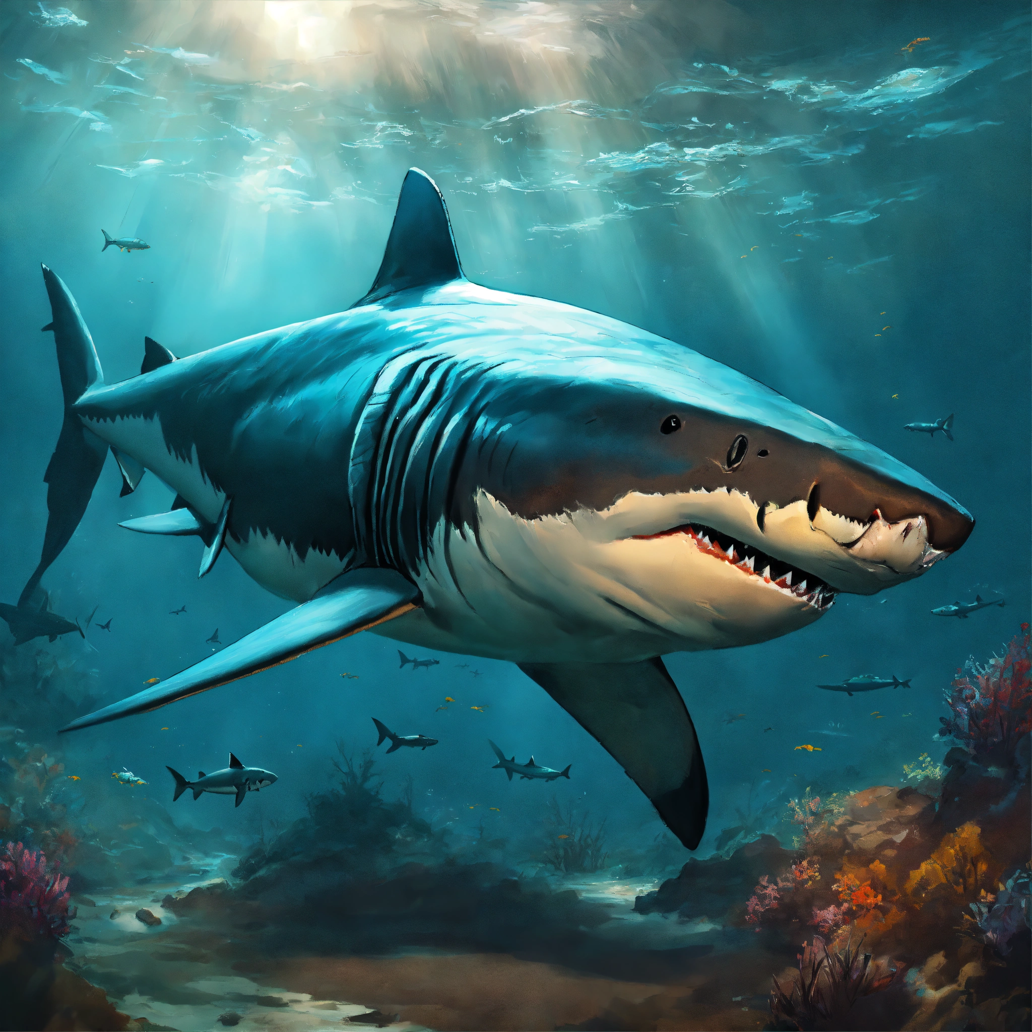 Concept art of a megalodon shark, blind, full of scars, oil painting style, highly detailed, brush strokes, 8k