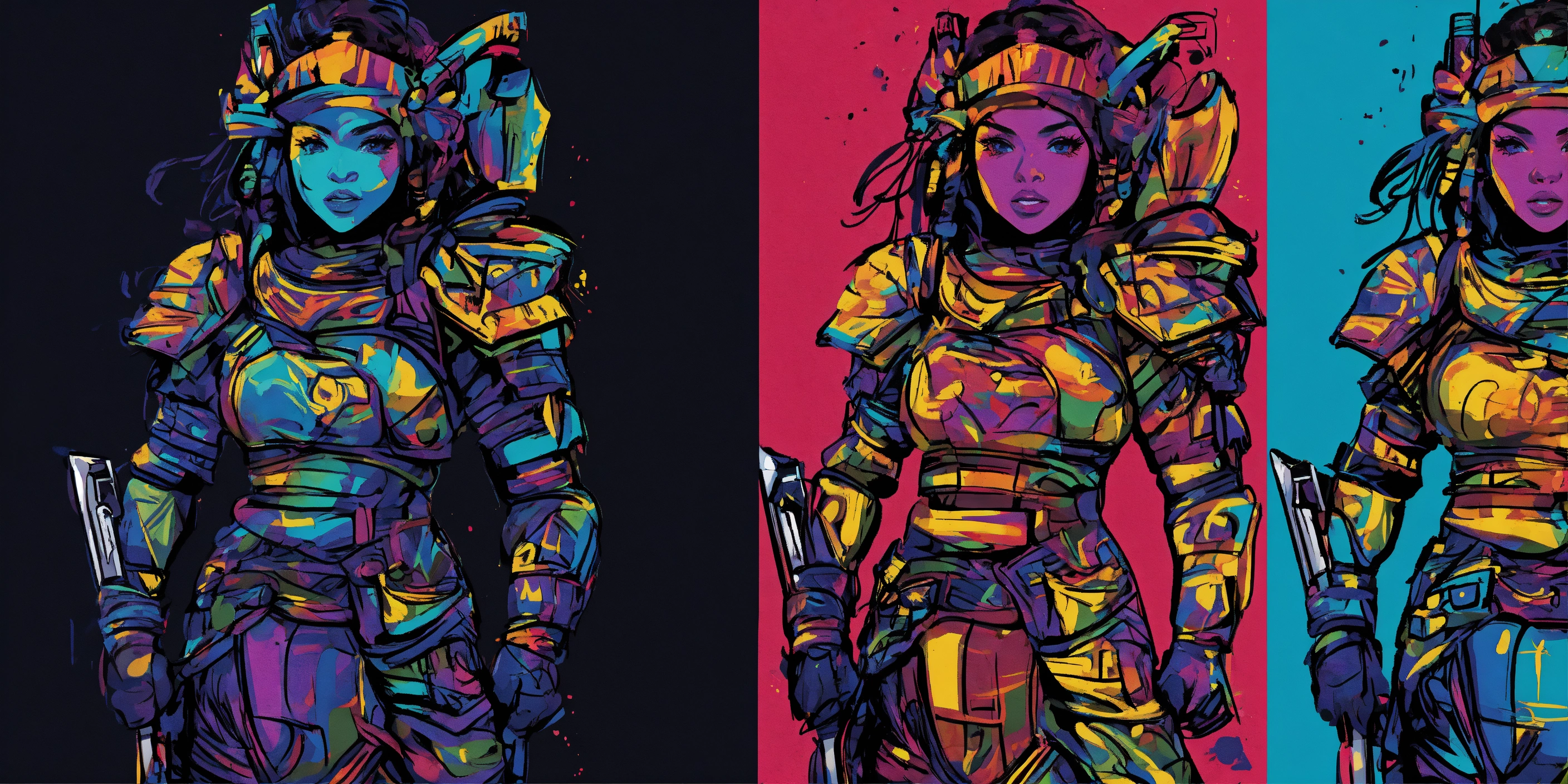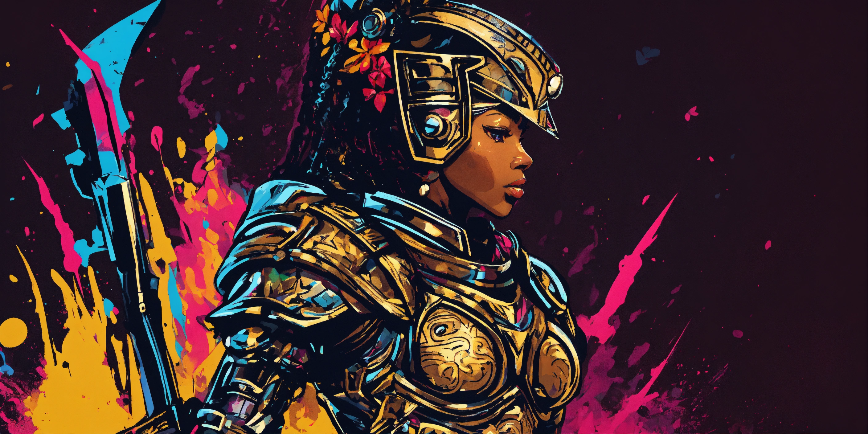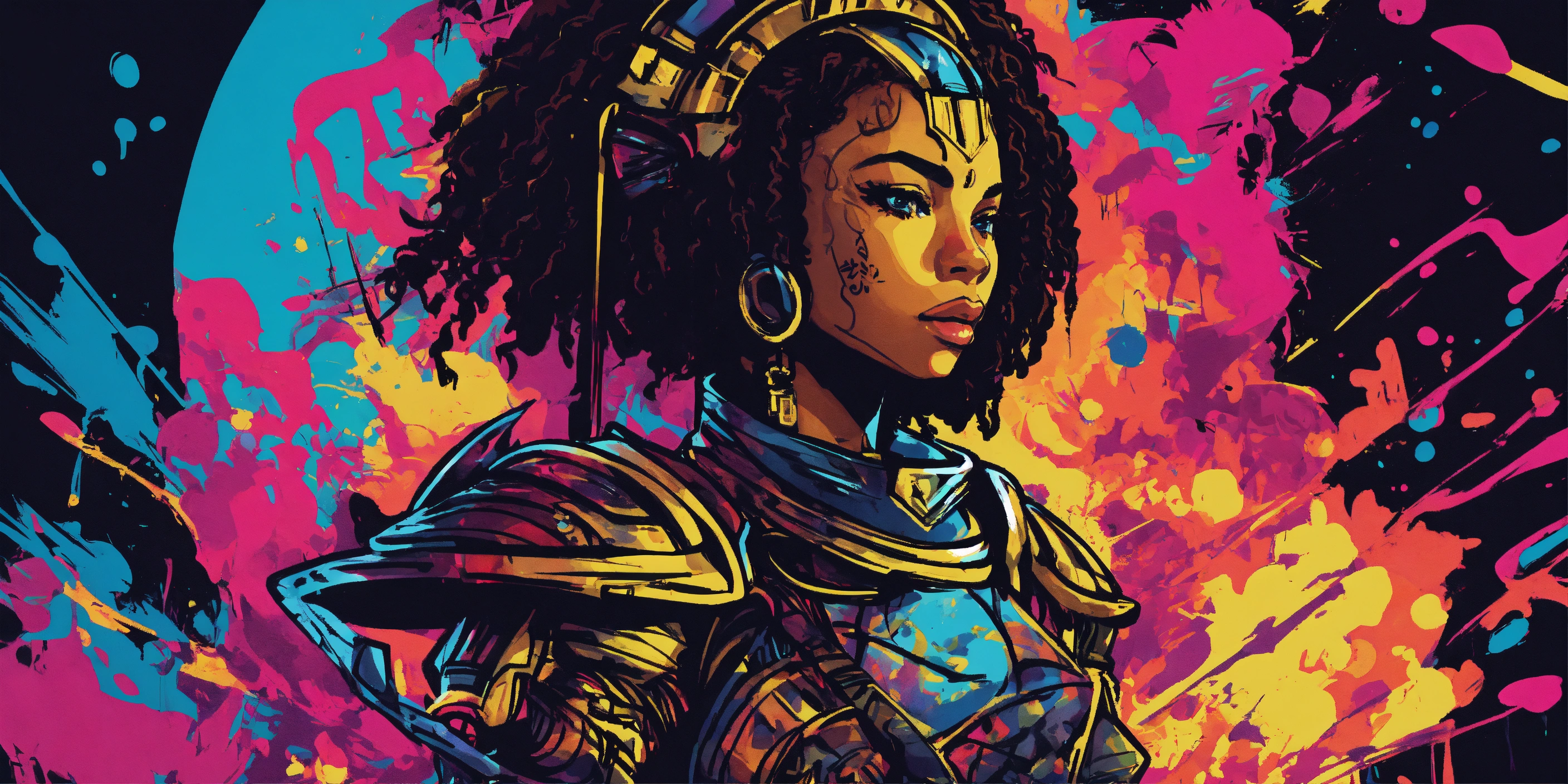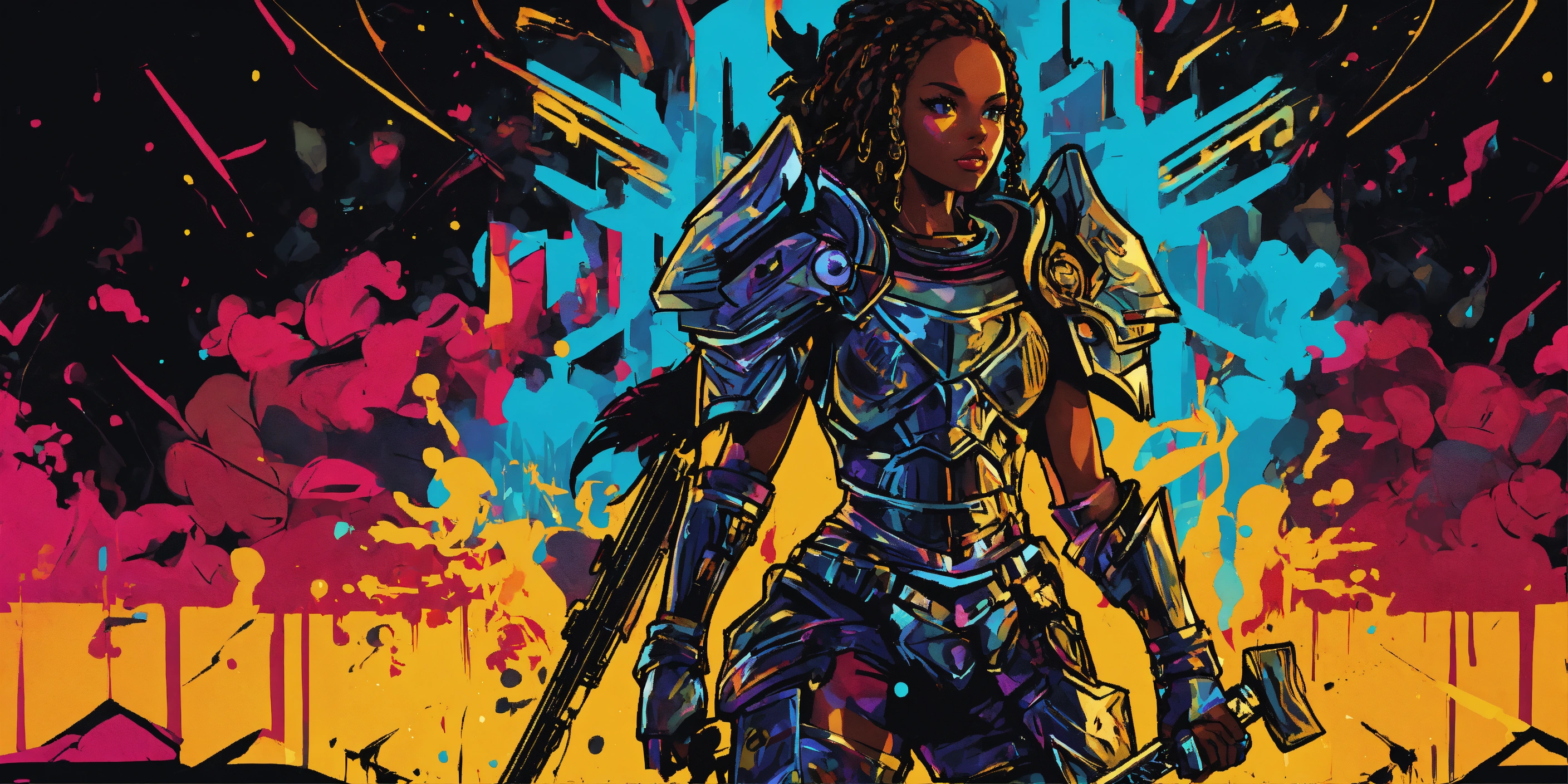 Graffiti fantasy warrior black woman in graffiti-style armor and weaponry, standing tall in an otherworldly graffiti battleground — t-shirt design graphic, vector, contour, black background.