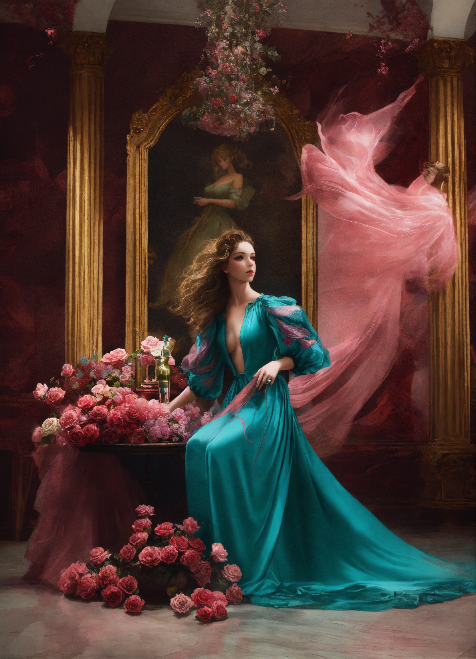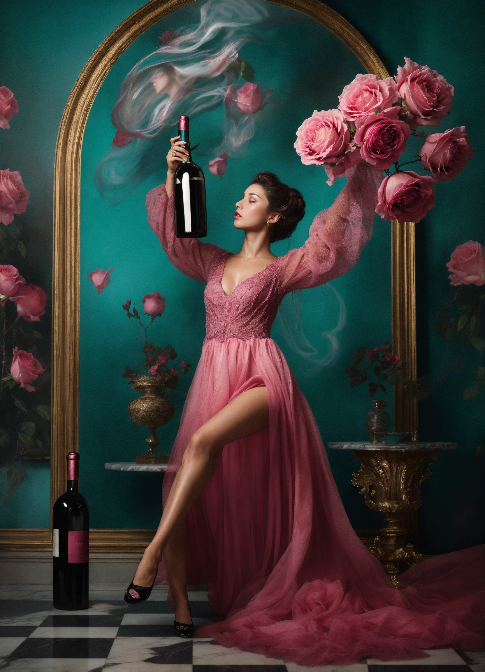Hyper realistic photoshop composition, a photoreal female model in a 19th century dress with futuristic flowing hair. she is balancing a wine bottle on her fingertipps. three giant dark-pink roses are hovering in midair, marble cherubs on the floor, abstract glas objects also hovering, a few abstract stringy lines are part of the composition. muted teal background, interesting lighting, studio photography in the style ofjanet delaney
