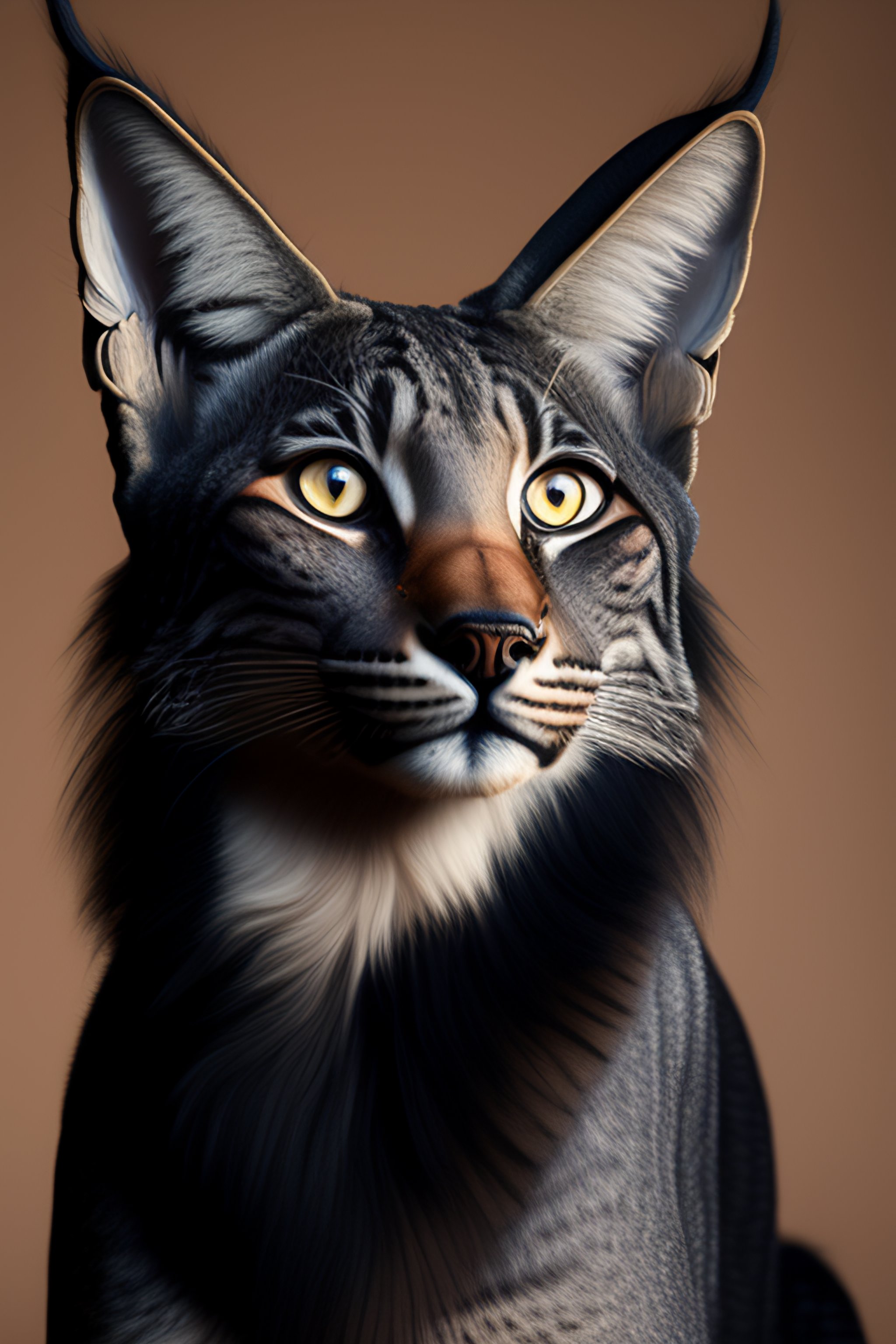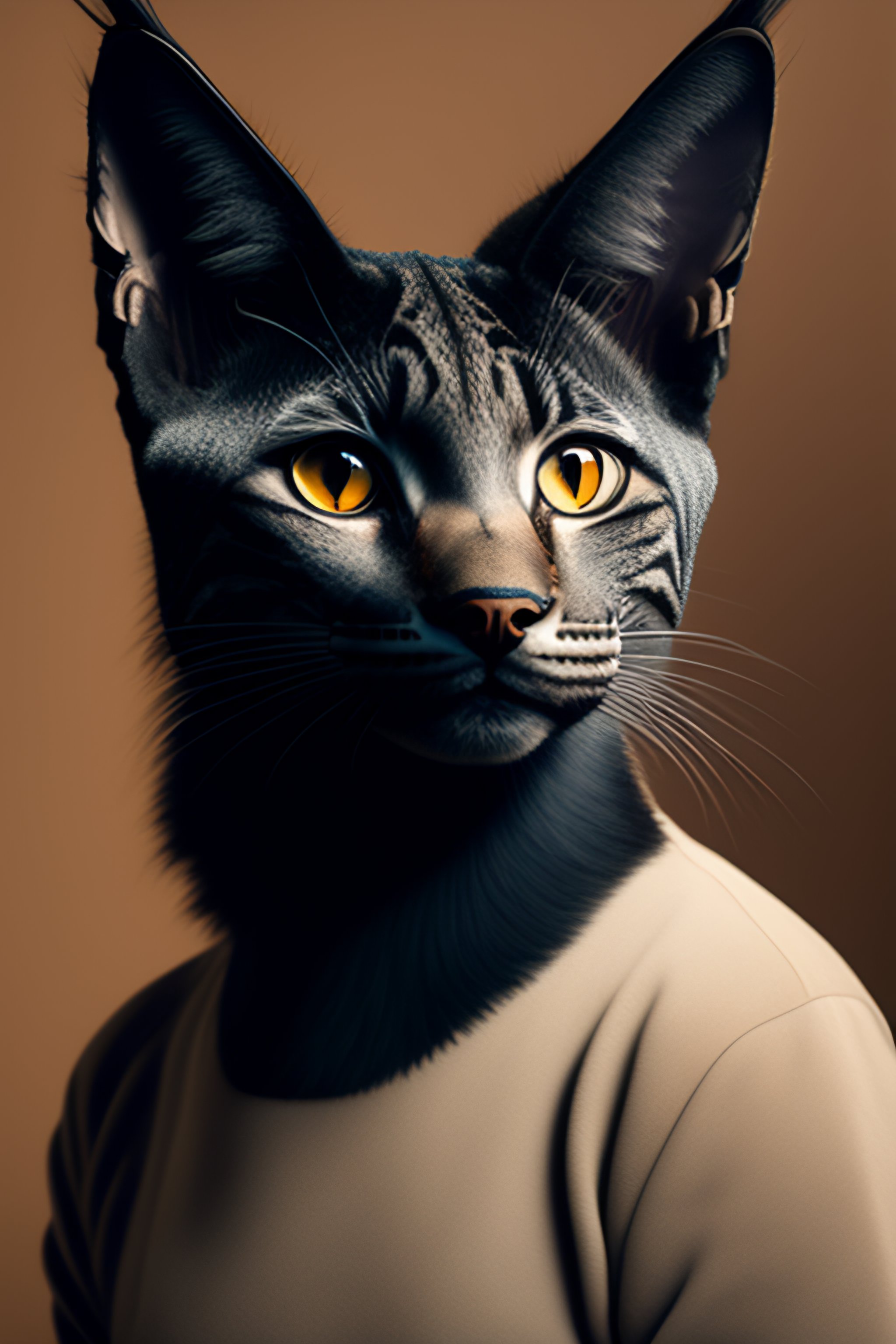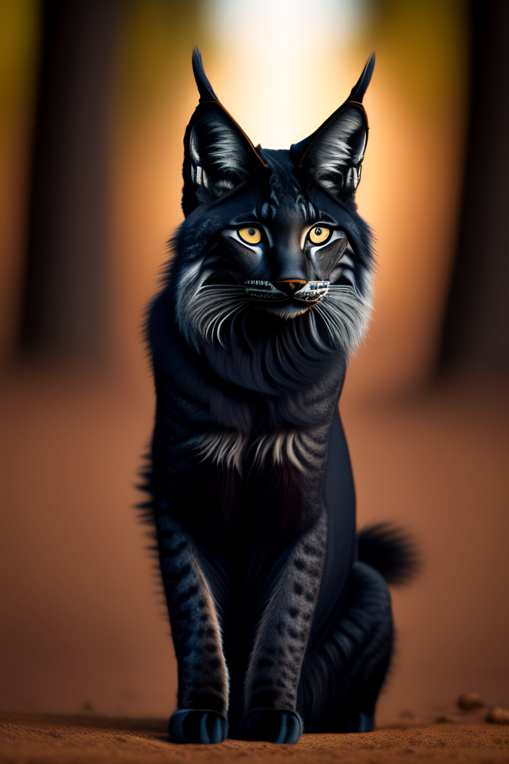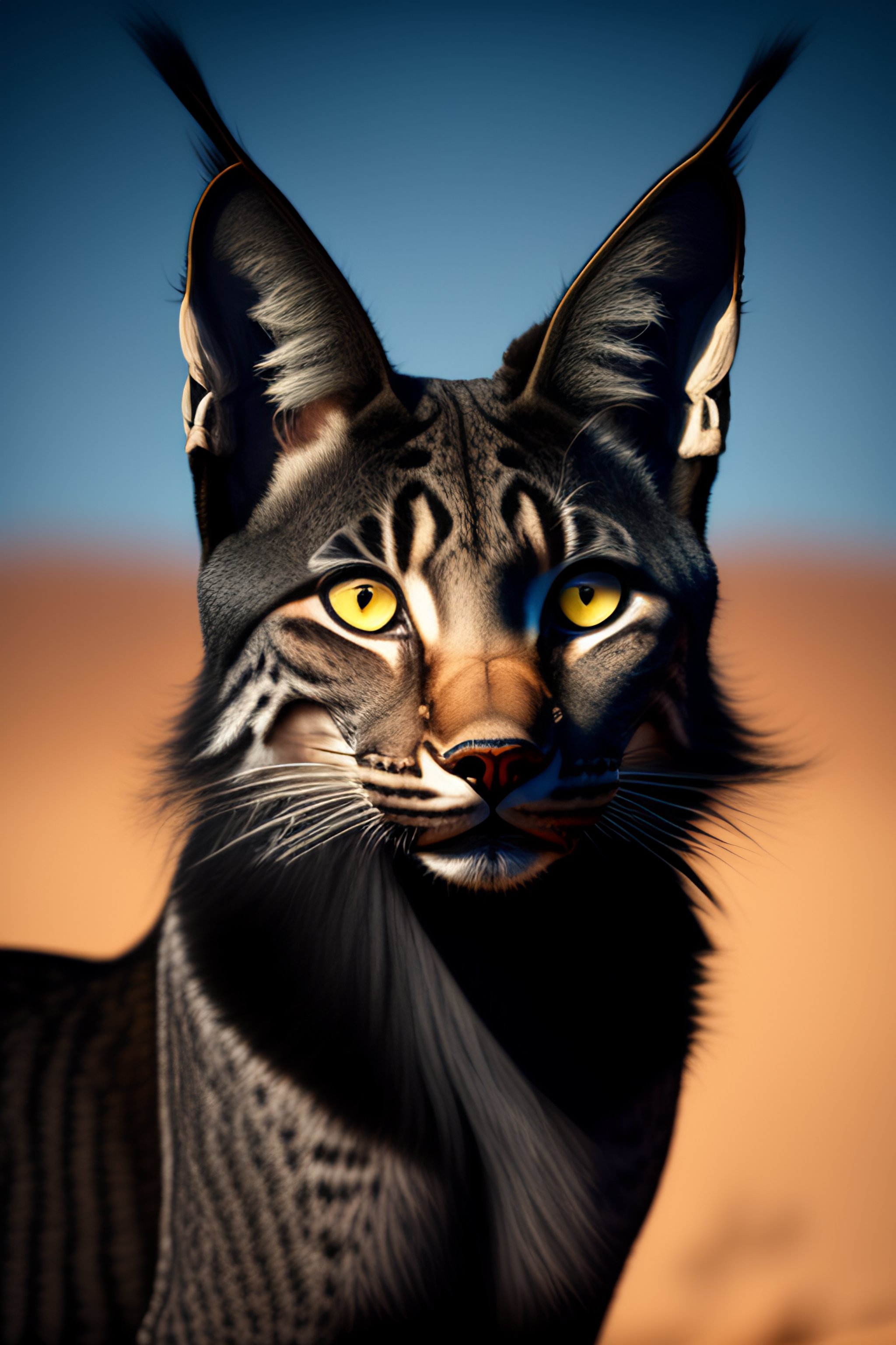 Human-like black lynx, with a cat-like face, completely covered in short black fur, wearing desert clothing
