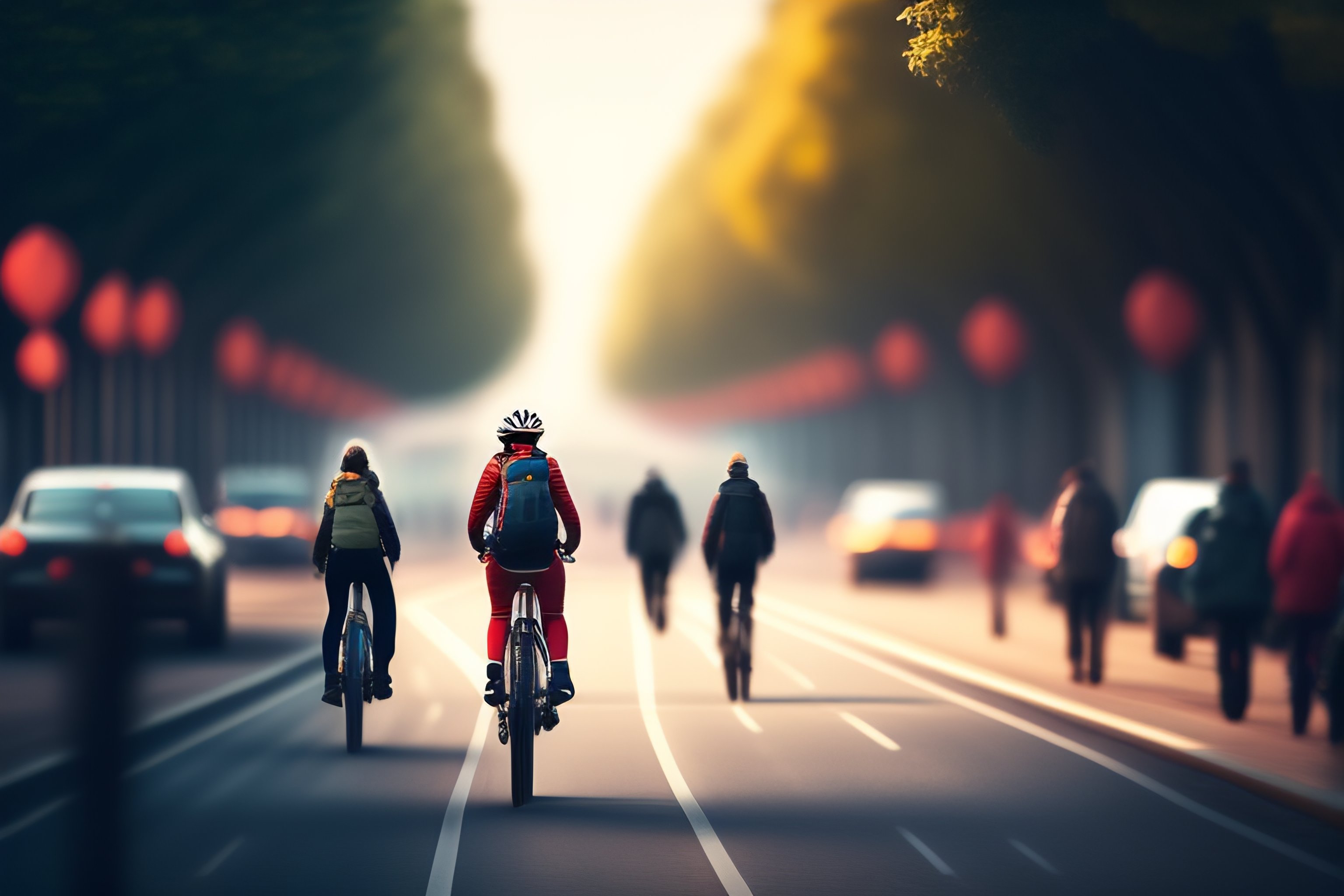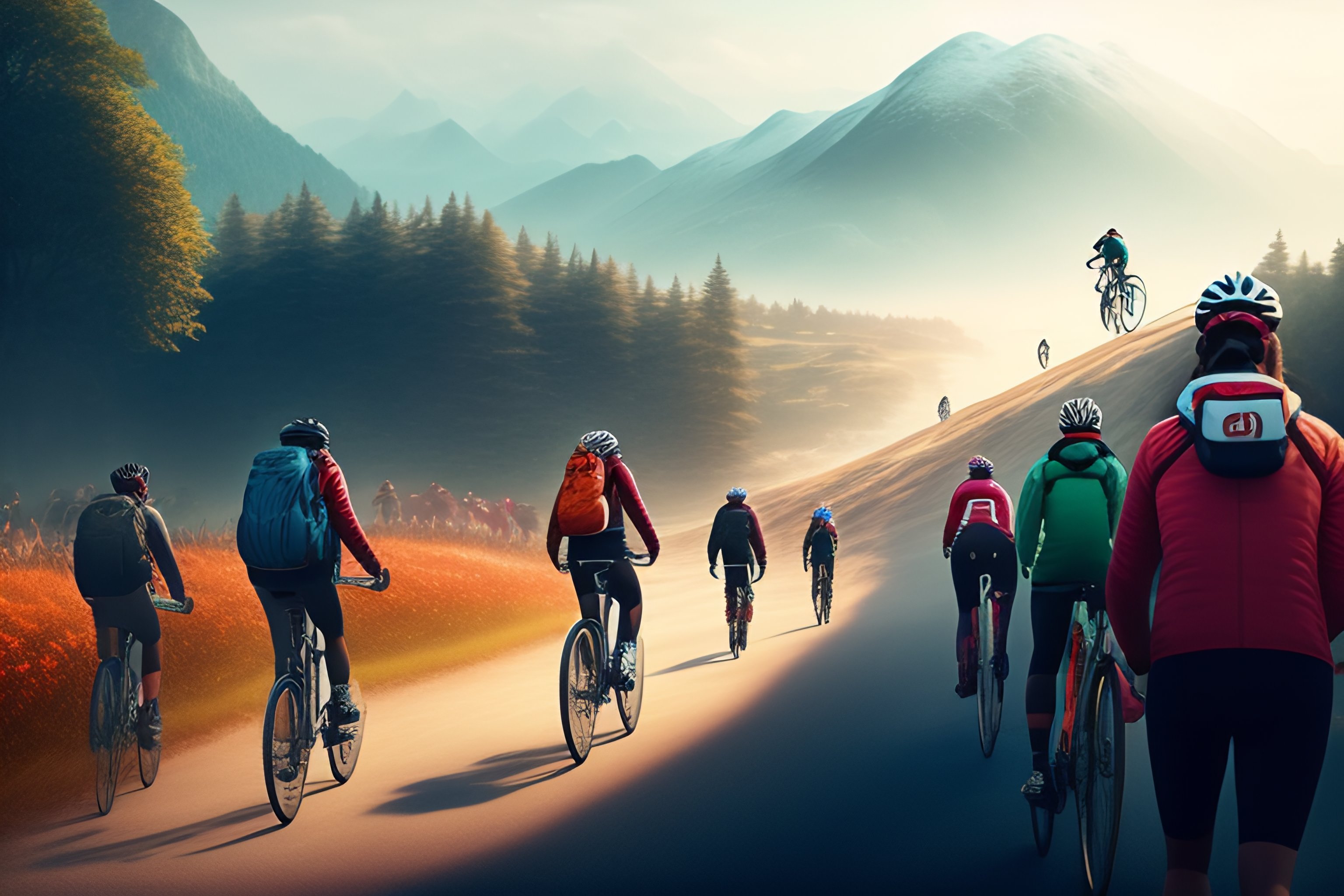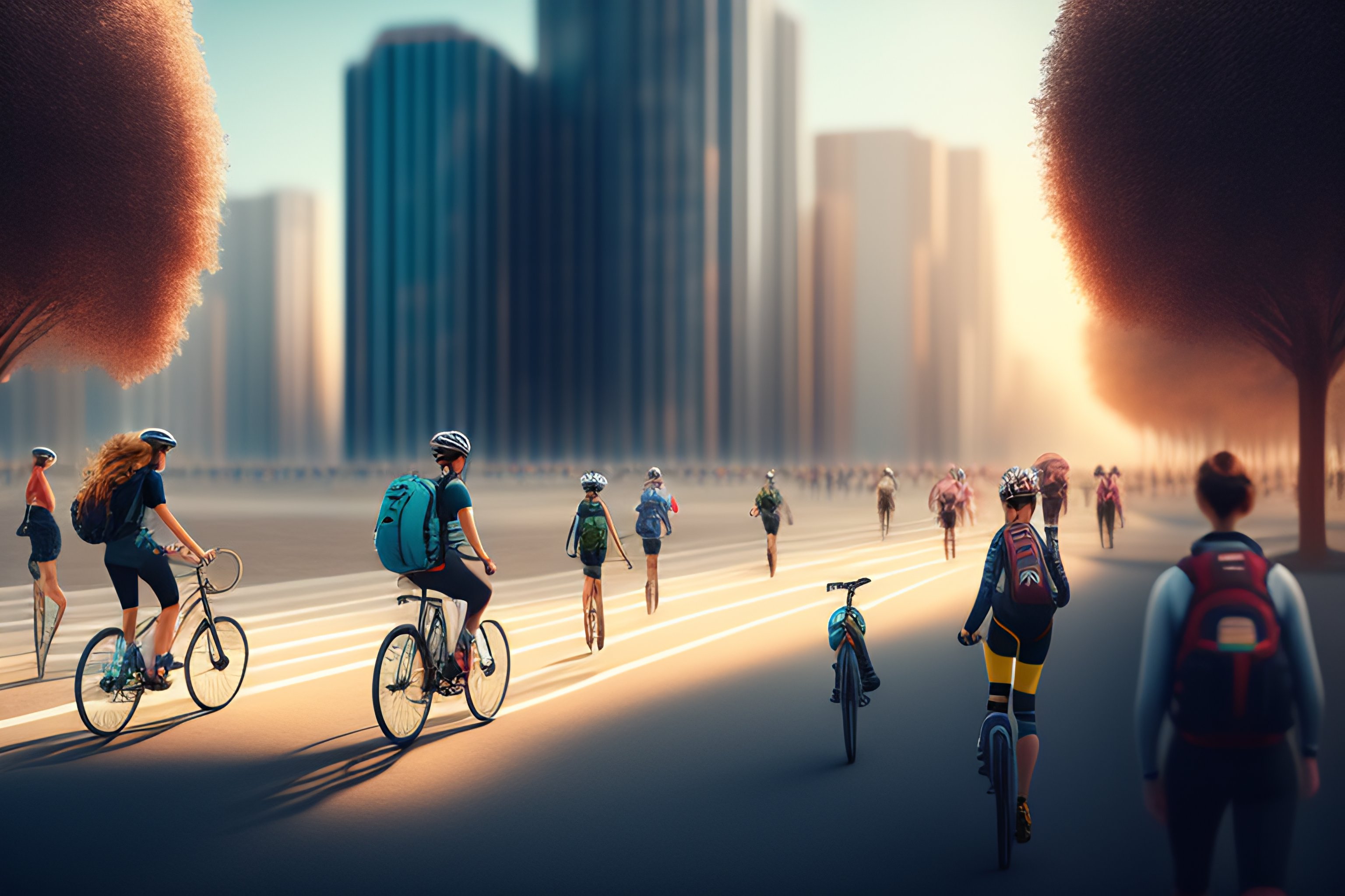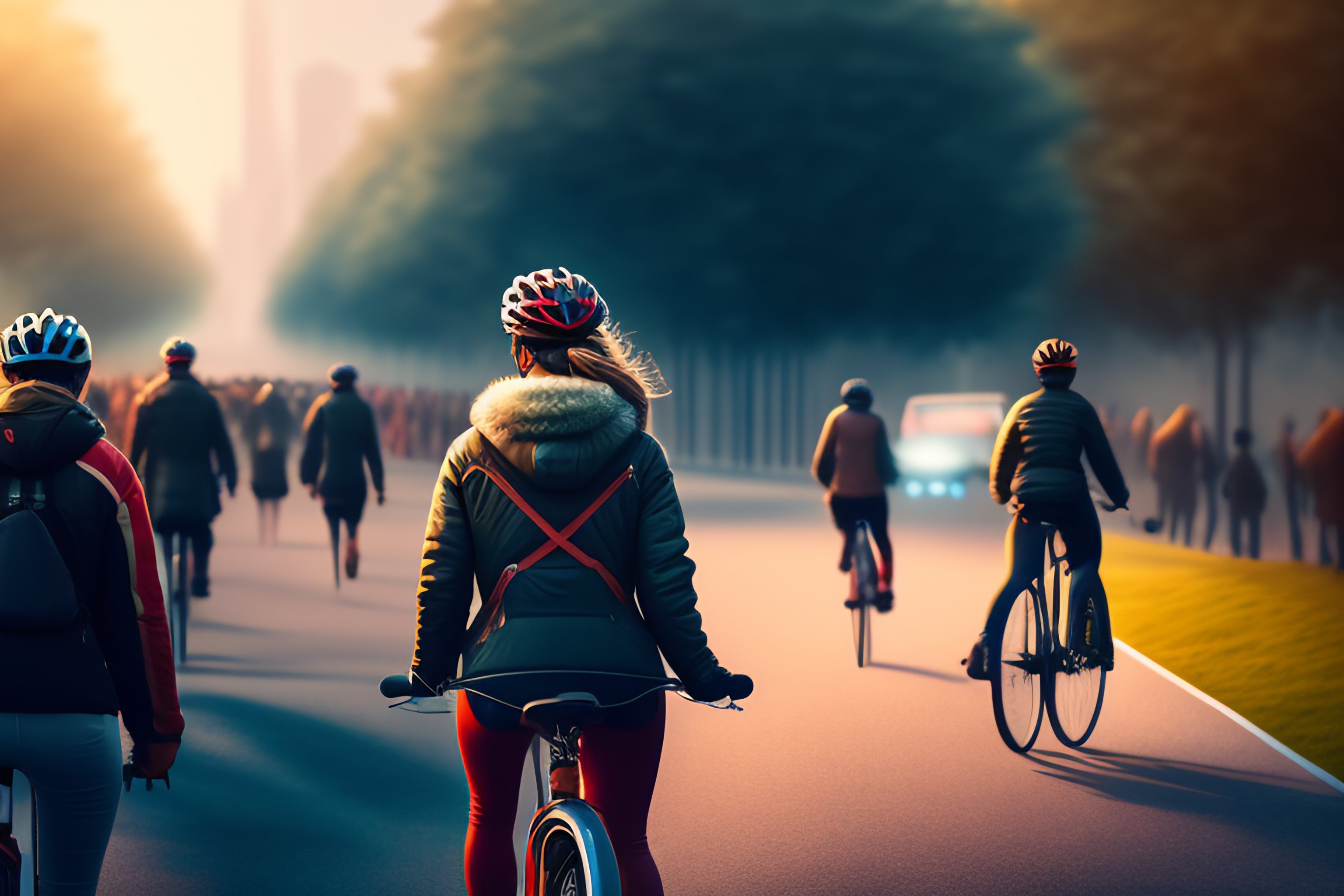 A photograph of a girl riding a bicycle, background with people walking on staris, on the right side a man walking around, ond the left upper cornner a group of people talking, left corner people doing sports, digital art, character design, 8k, unreal enginge