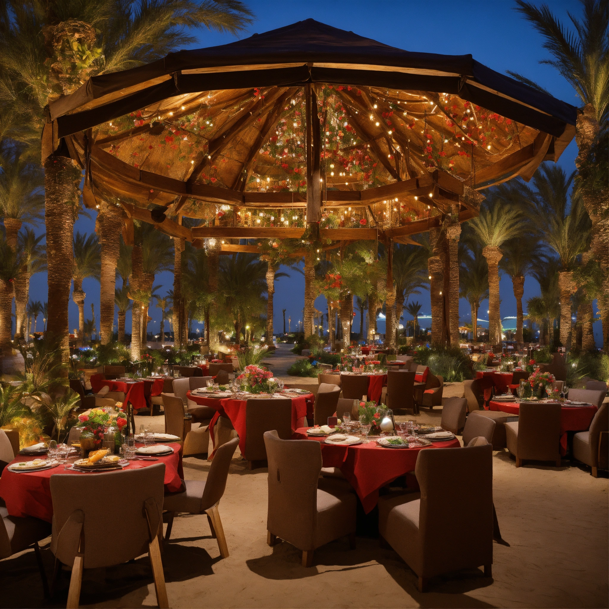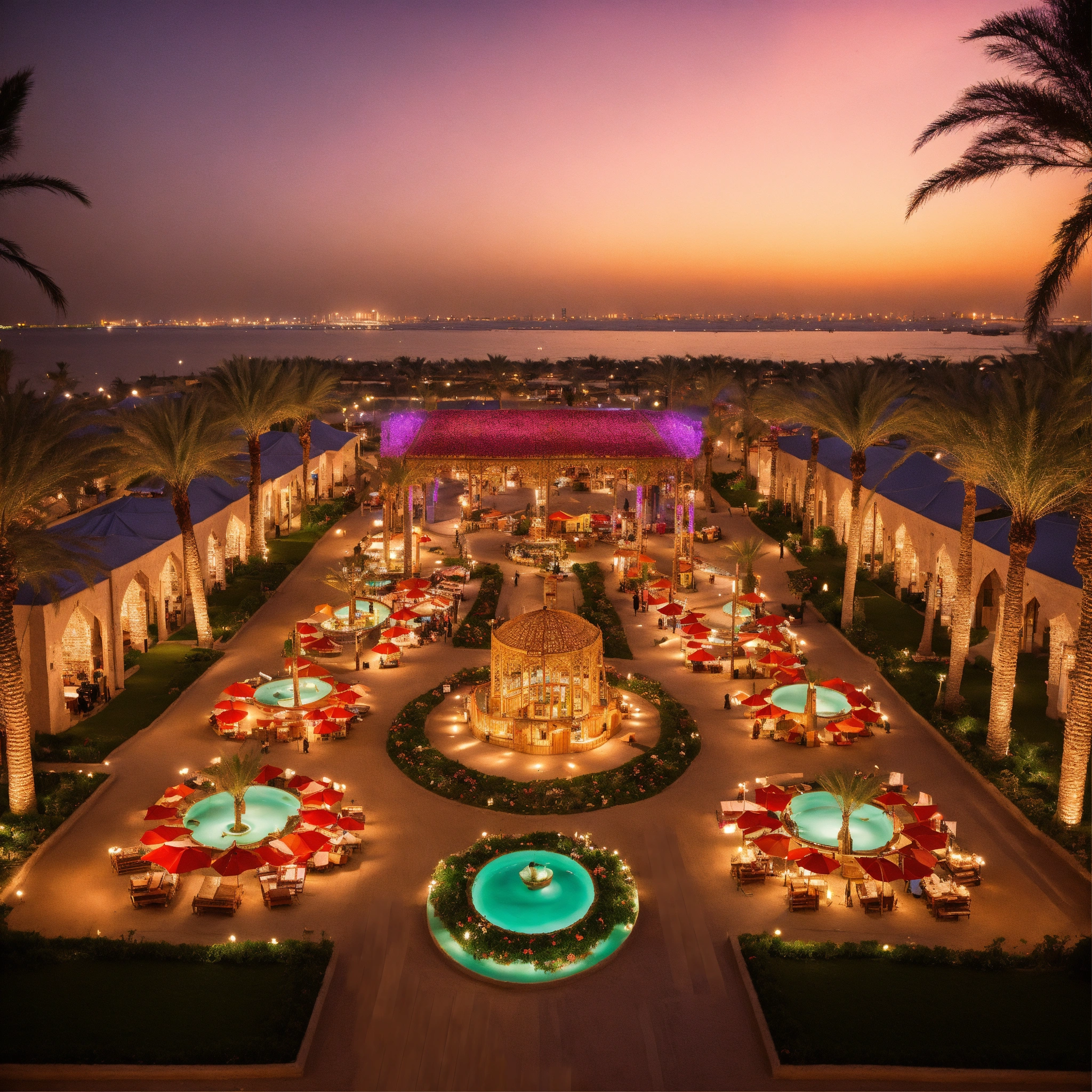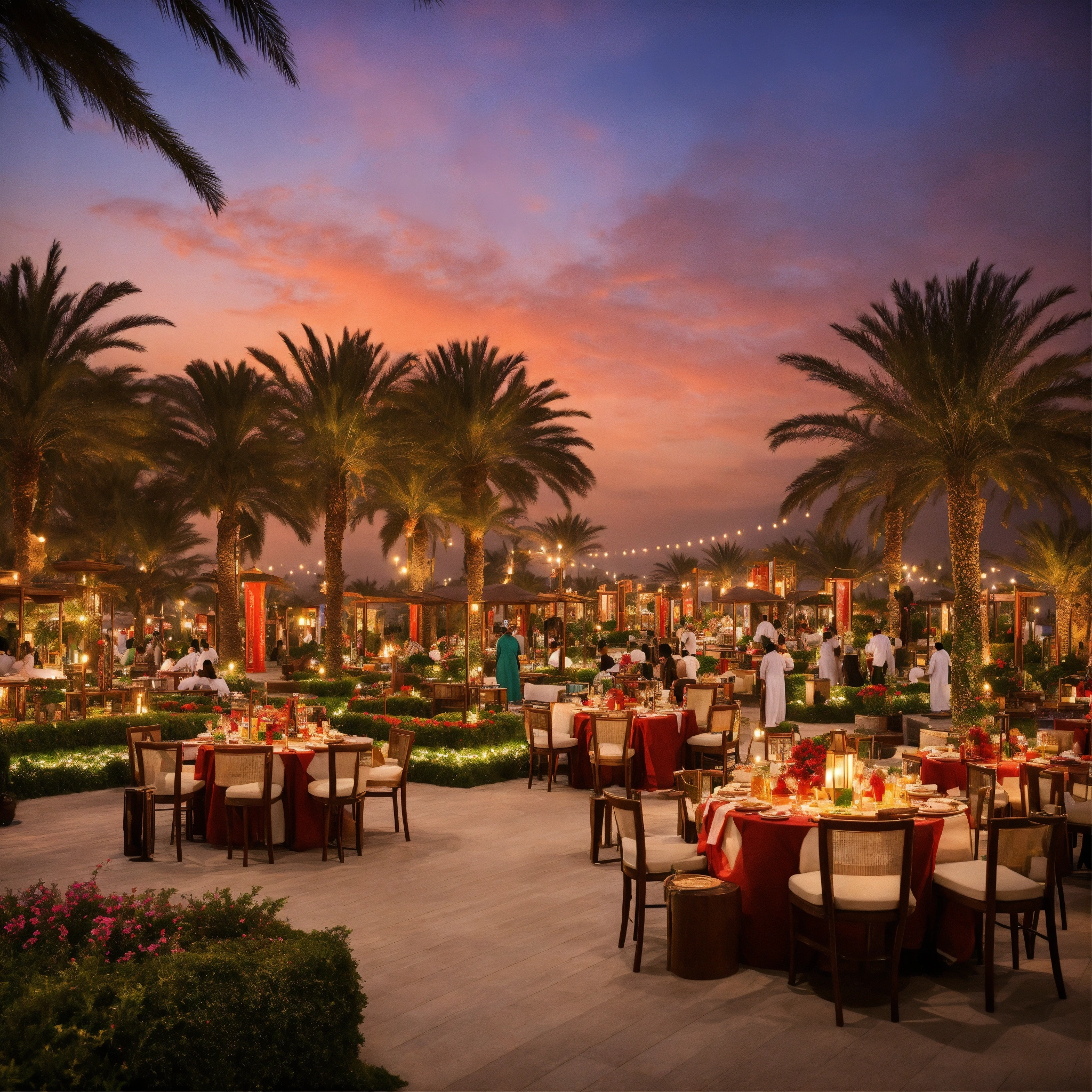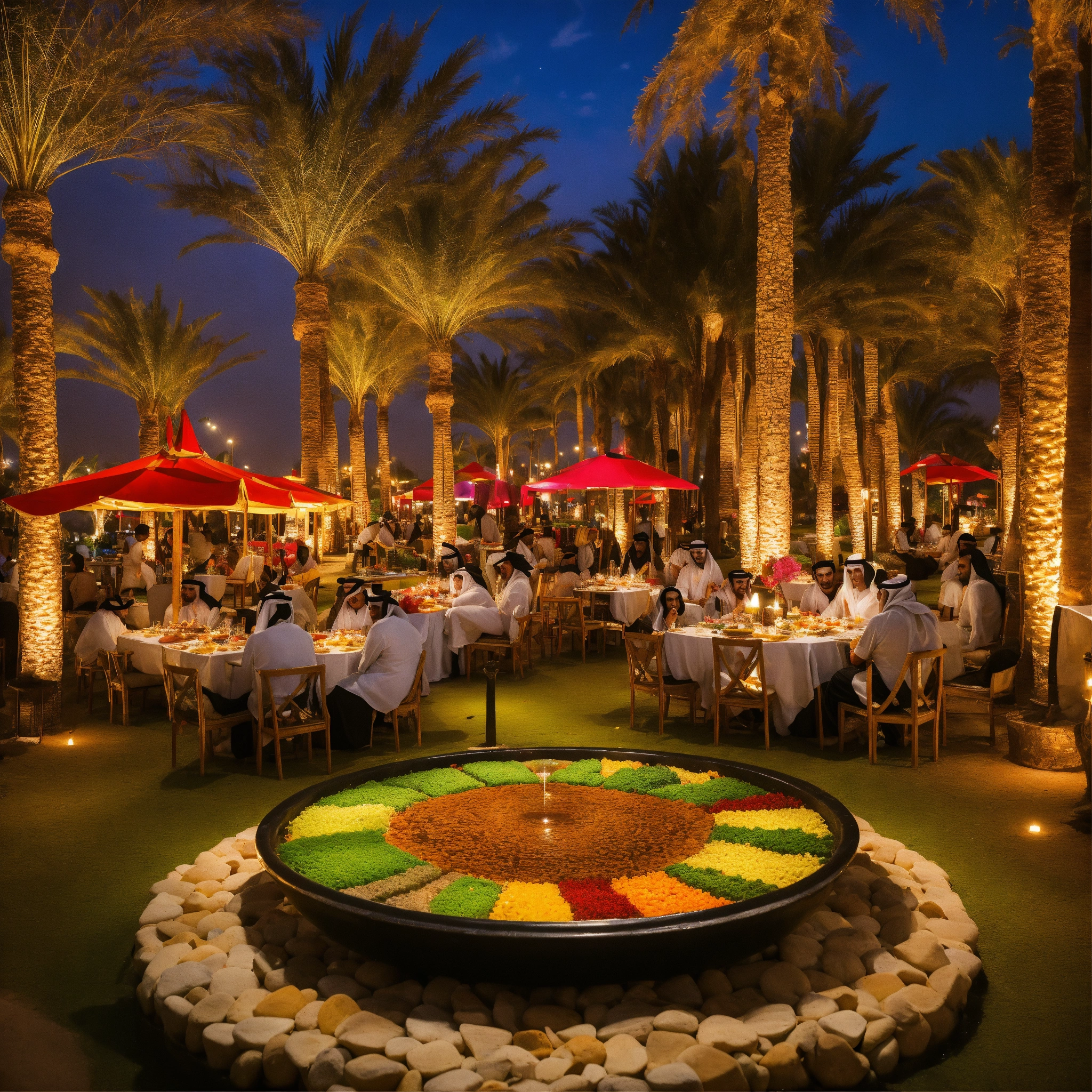 Imagine a captivating scene at the 'taste of bahrain' food festival, where a symphony of flavors converges in a vibrant celebration of bahrain's culinary heritage. the central theme invites you on a sensory journey through the diverse tastes of bahrain, merging traditional bahraini delicacies with international influences. as you step into the festival grounds, you find yourself immersed in an arabian oasis, a lush garden-like haven, complete with swaying palm trees, enchanting water features, and a riot of colorful blooms, evoking the essence of an arabian oasis. underfoot, the festival's pathways and seating areas blend a harmonious mix of sand, faux grass, and wooden decking, mirroring the picturesque landscapes of bahrain. prepare to embark on a gastronomic adventure like no other, where every bite tells a story of this enchanting island nation's rich culinary tapestry.