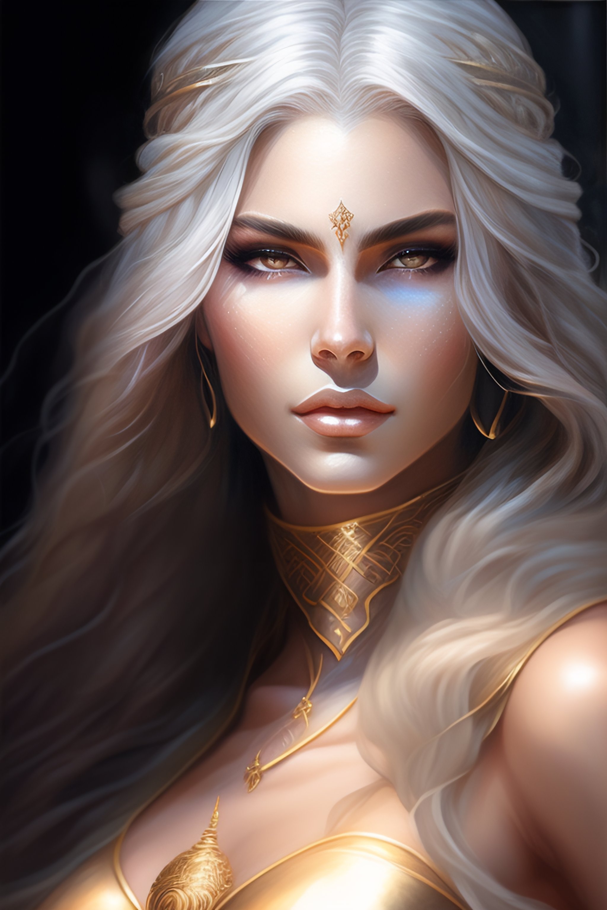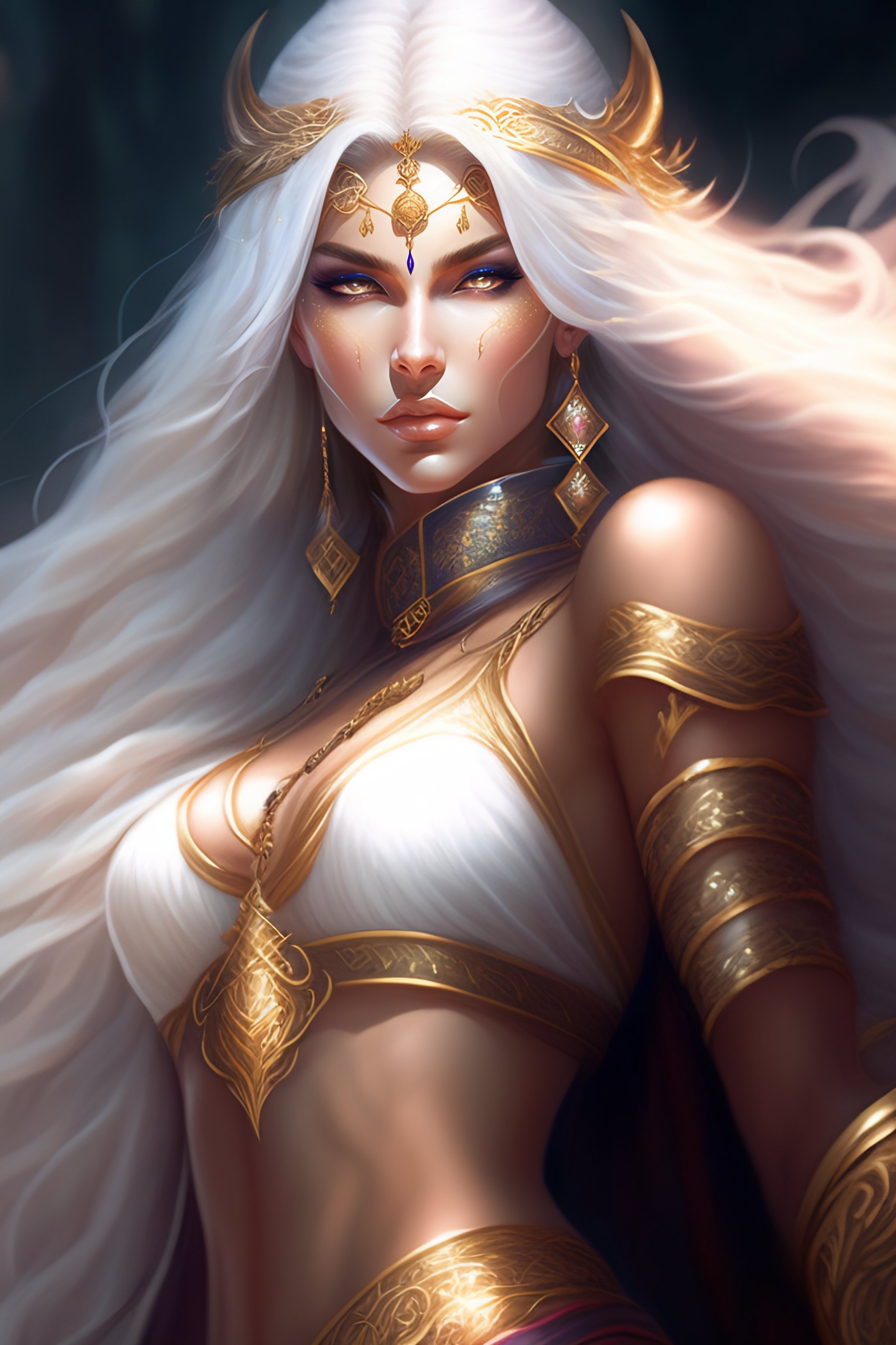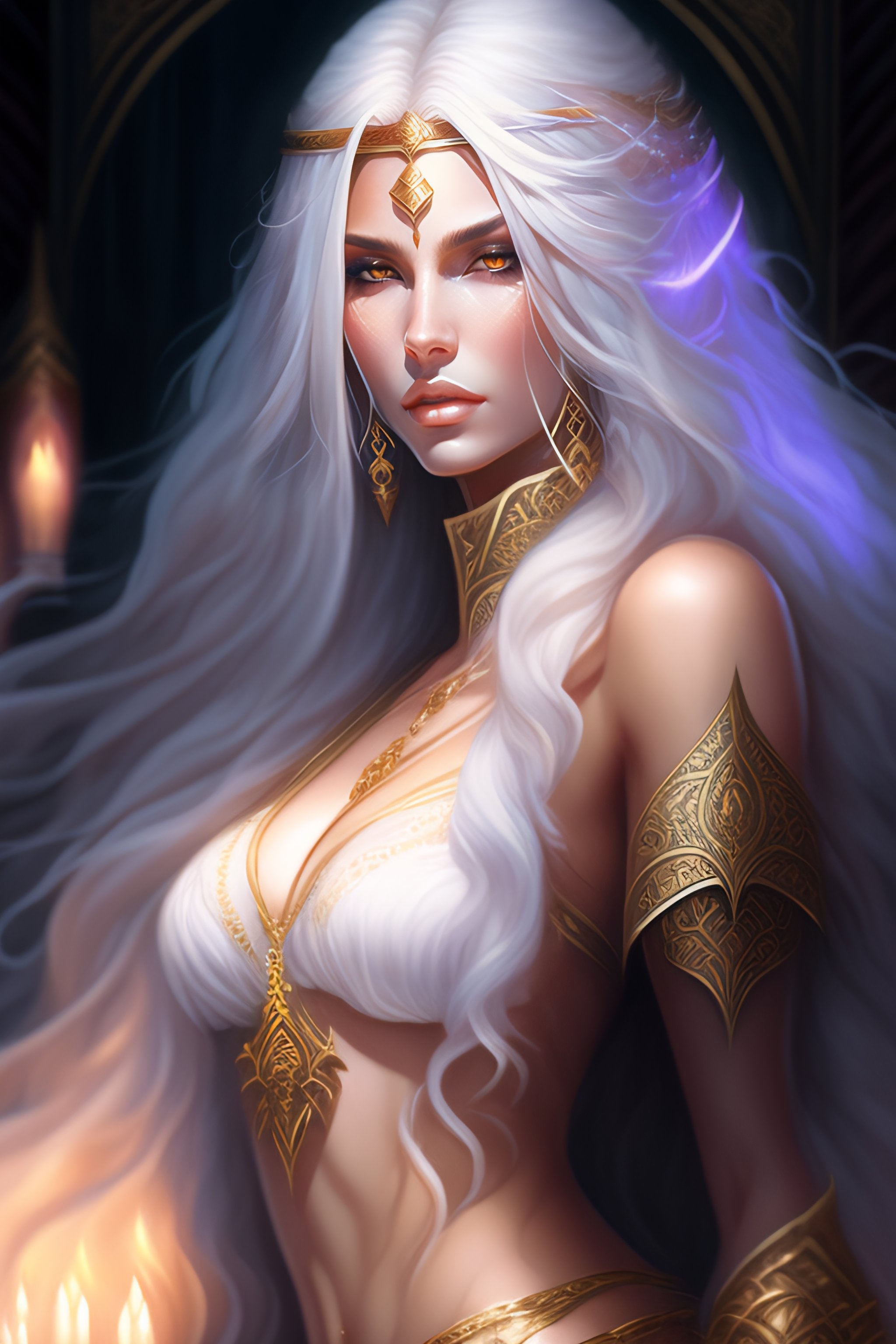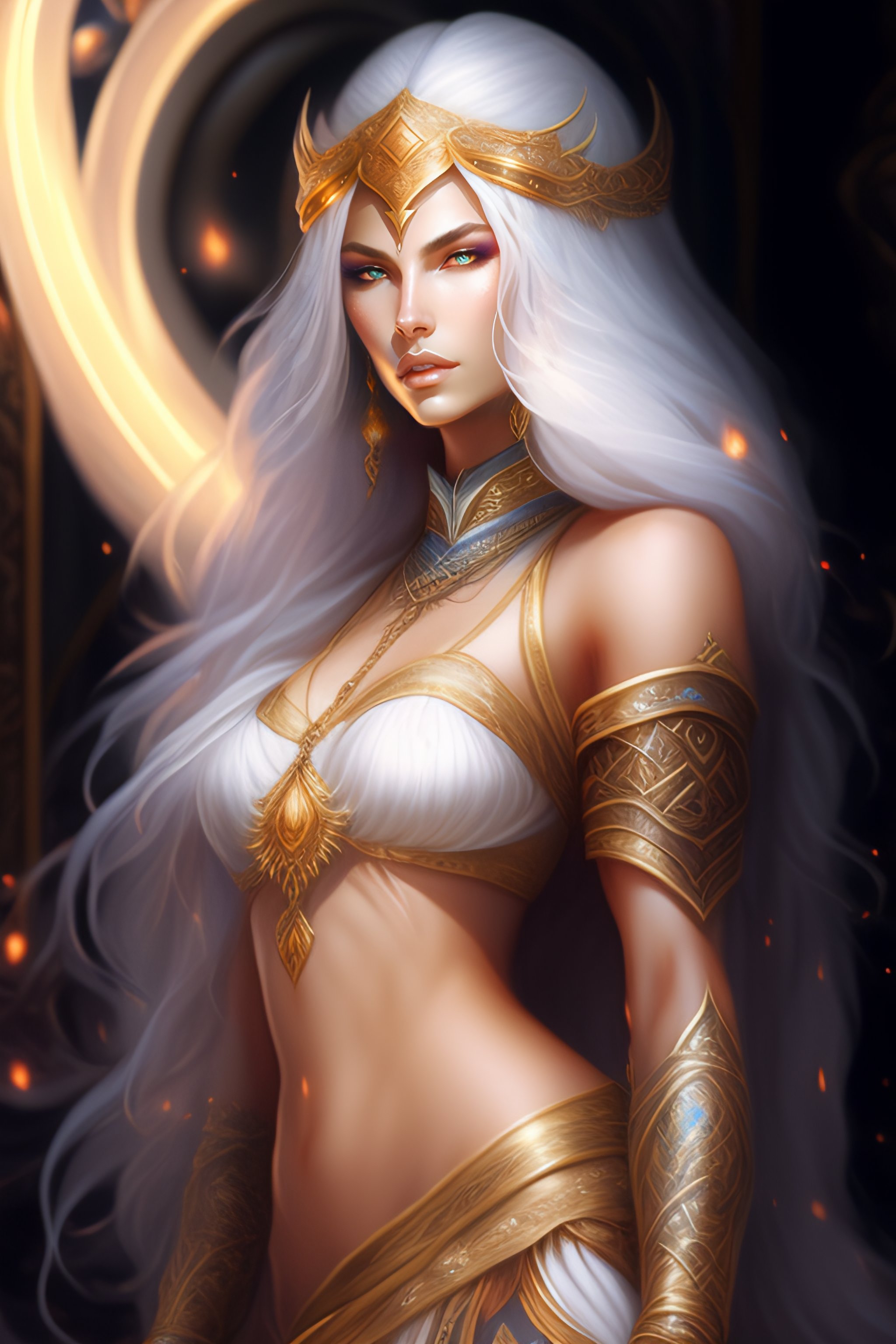 Female, mage godess with long white hair, sorcerer, shaved temple, fantasy, sharp focus, intricate, elegant, illustration, ambient lighting, art by stefanie law, qistina khalidah, tranding on artstation, art by luis royo higly detailed studio lighting