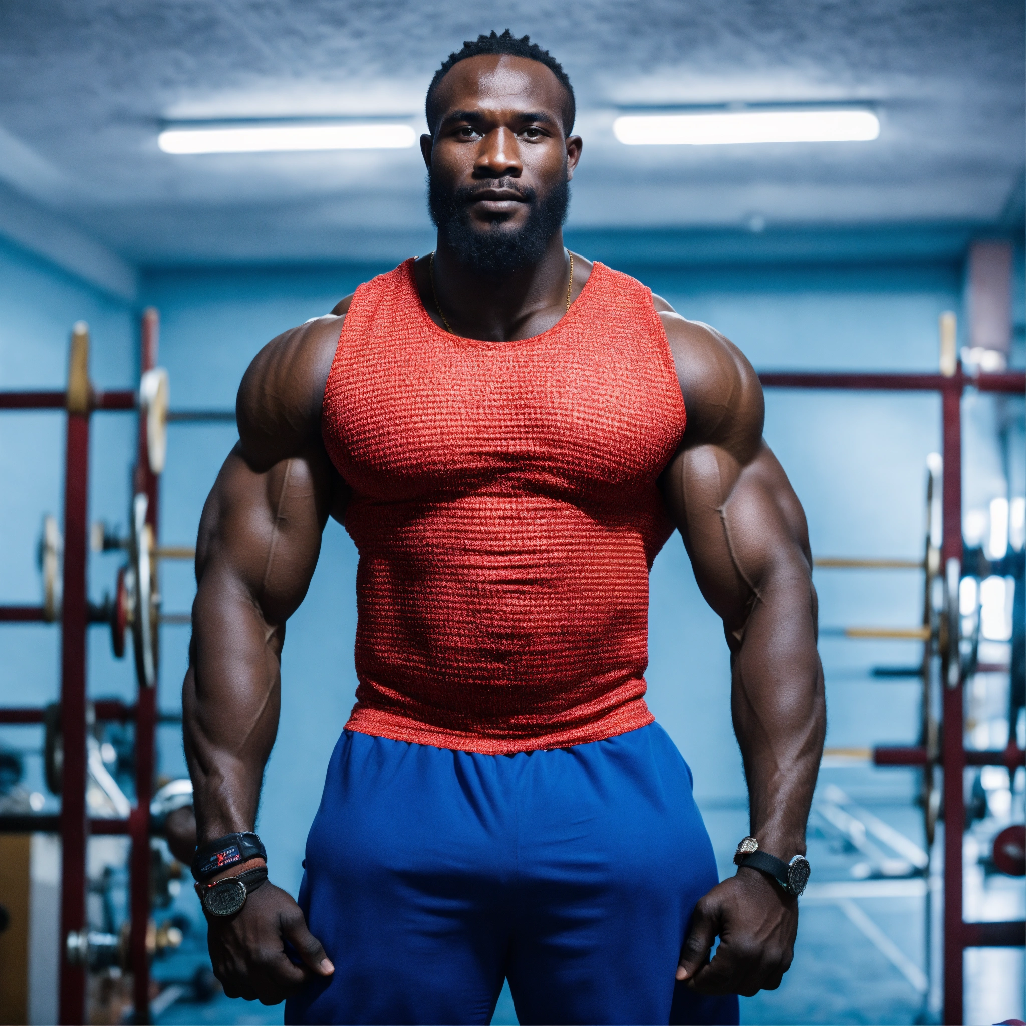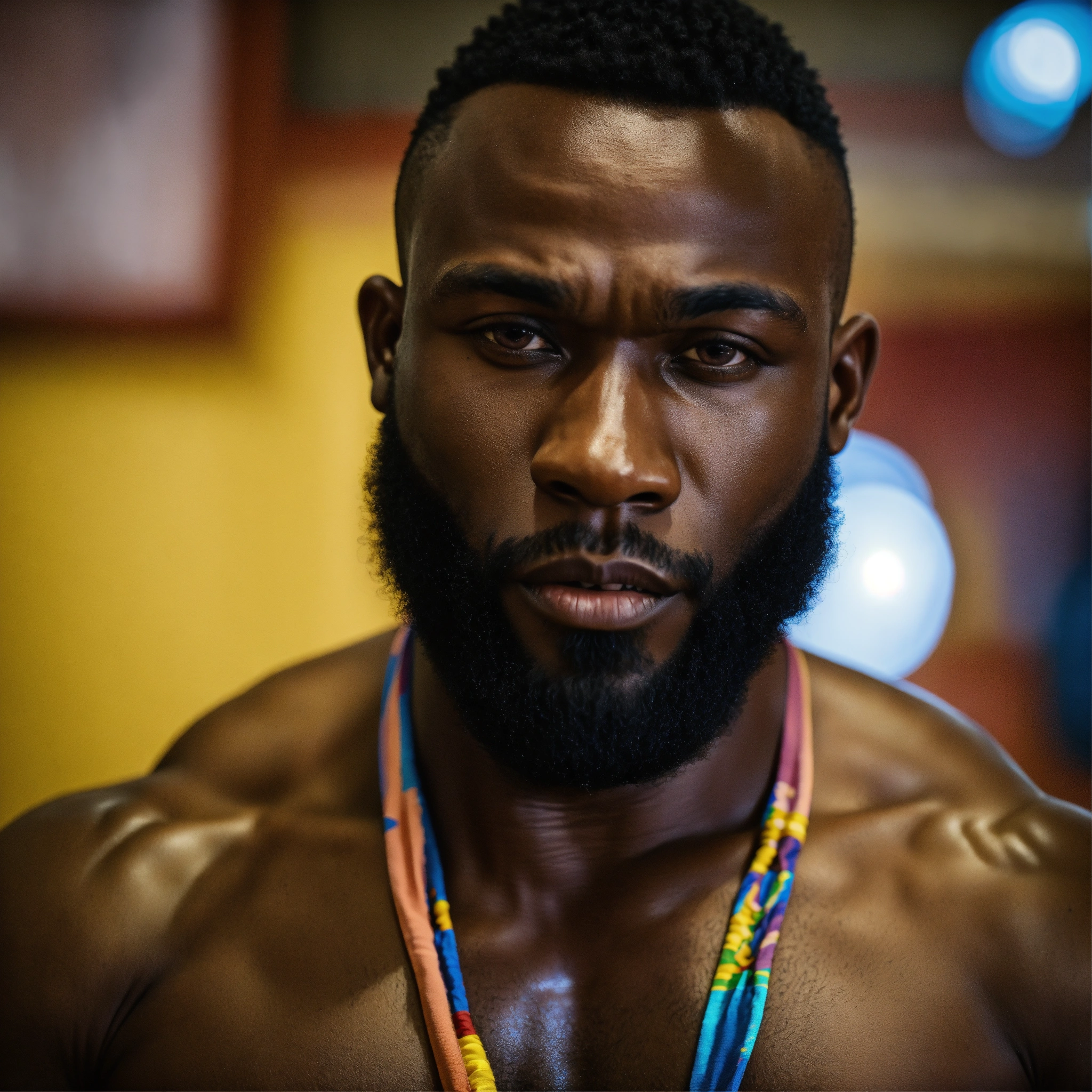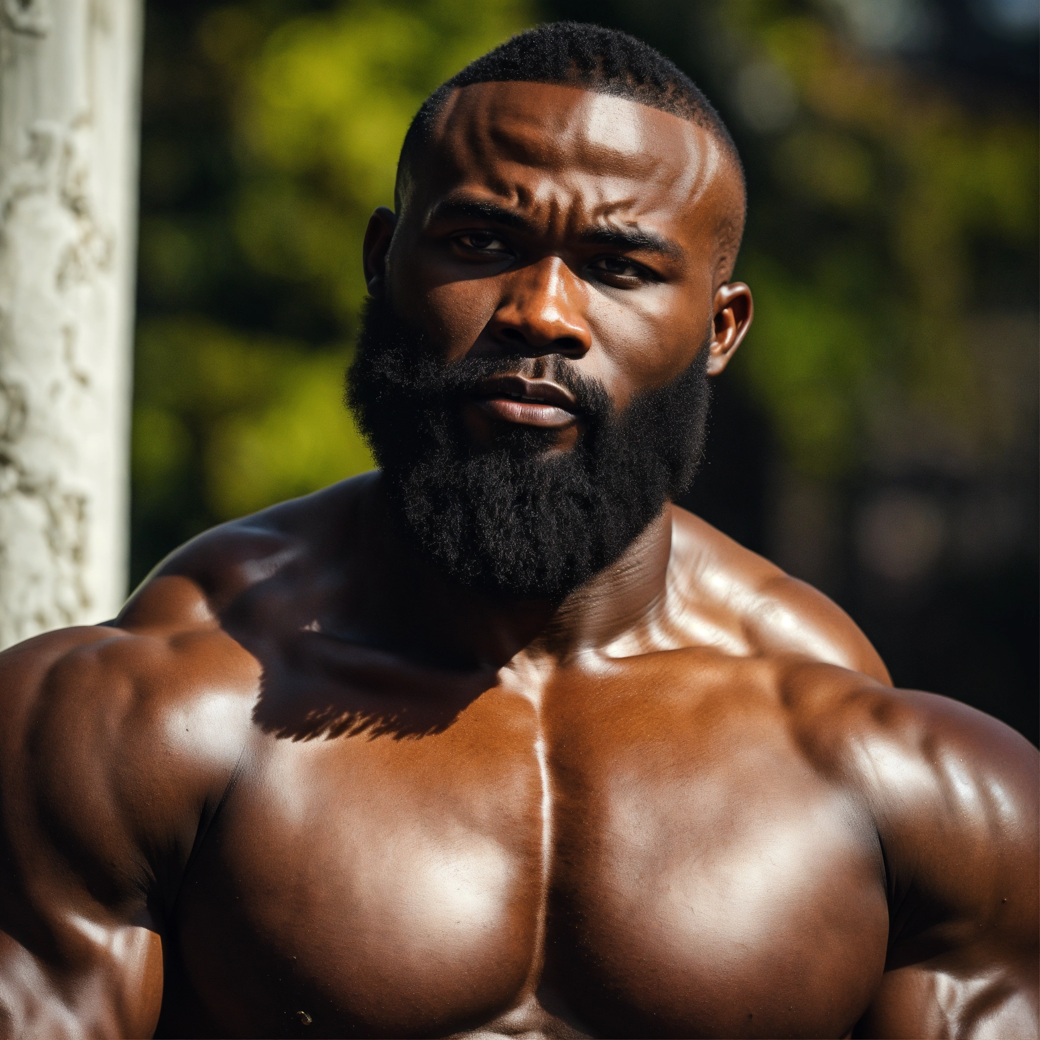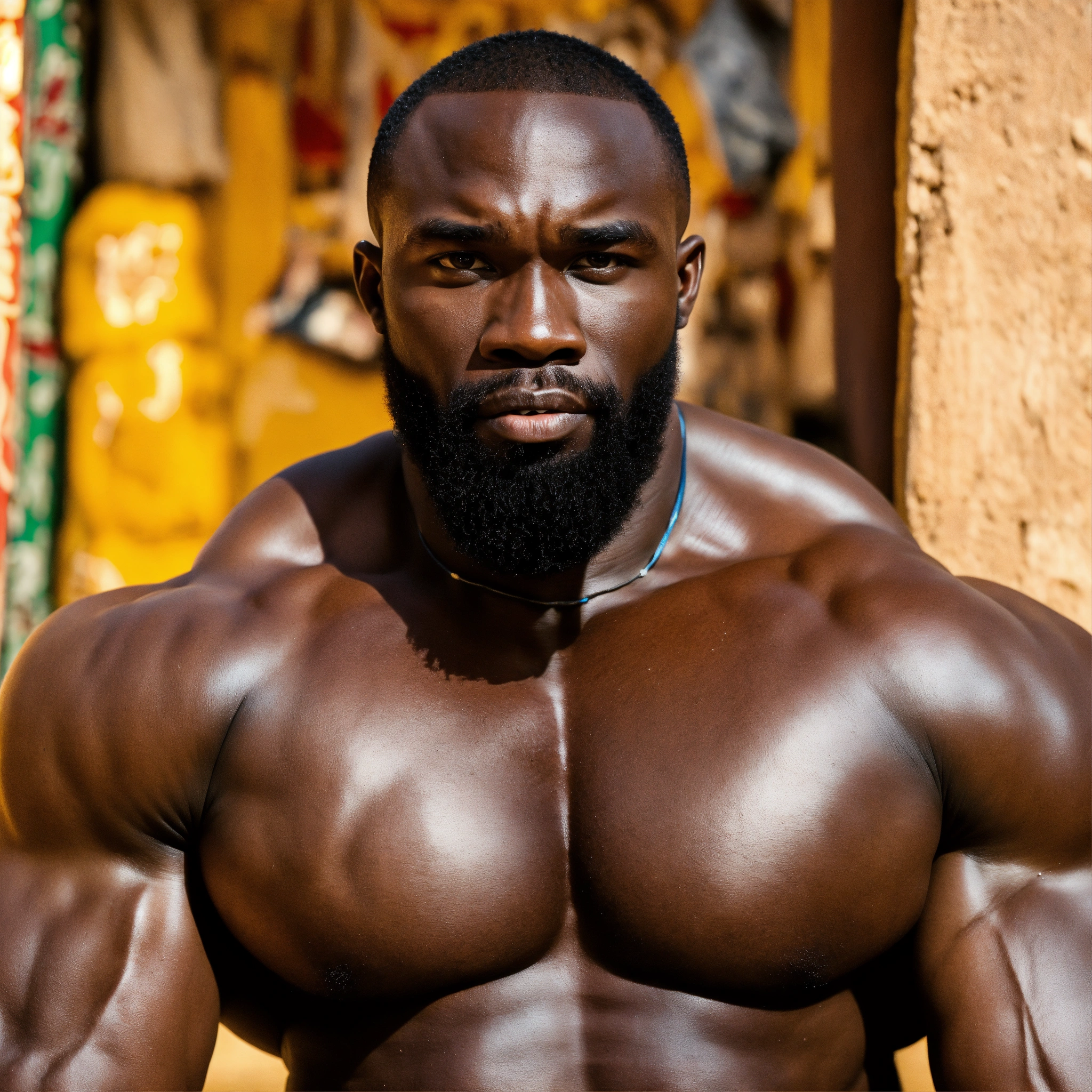 30-year-old hairy gambian man with big muscles, big bodybuilder, body like a wrestler, fierce, in a temple