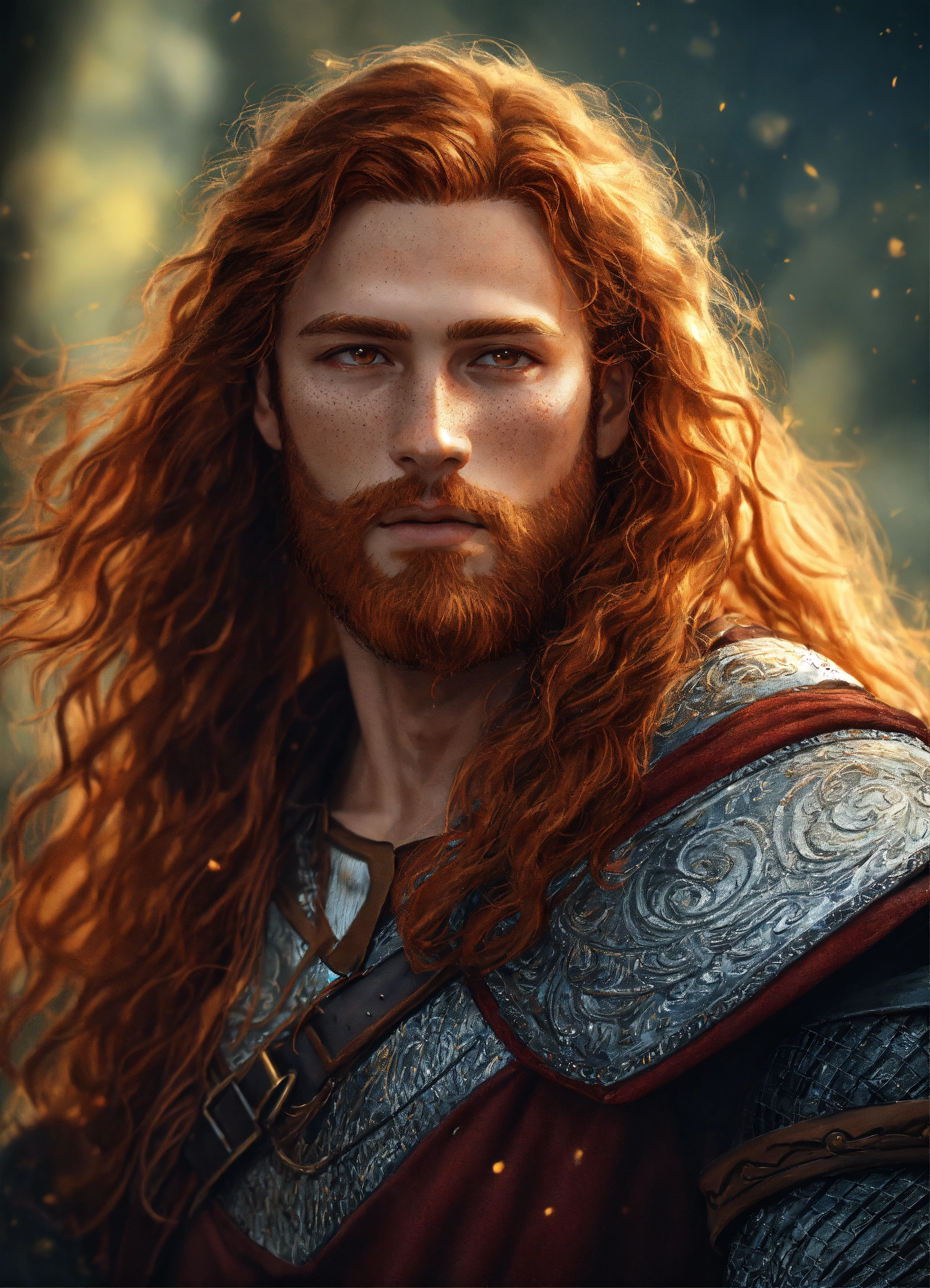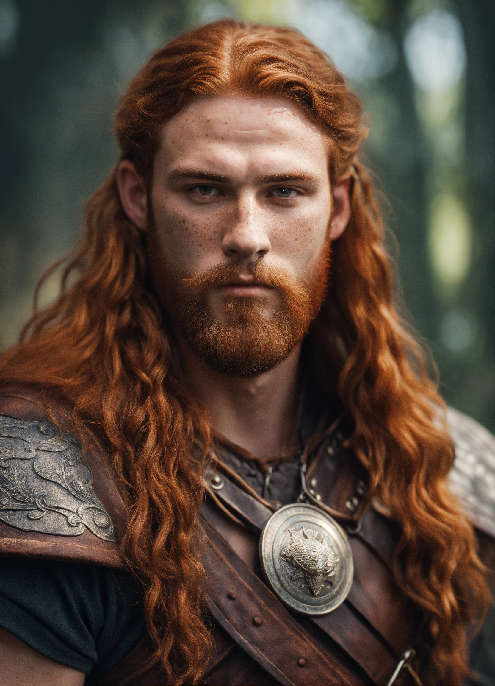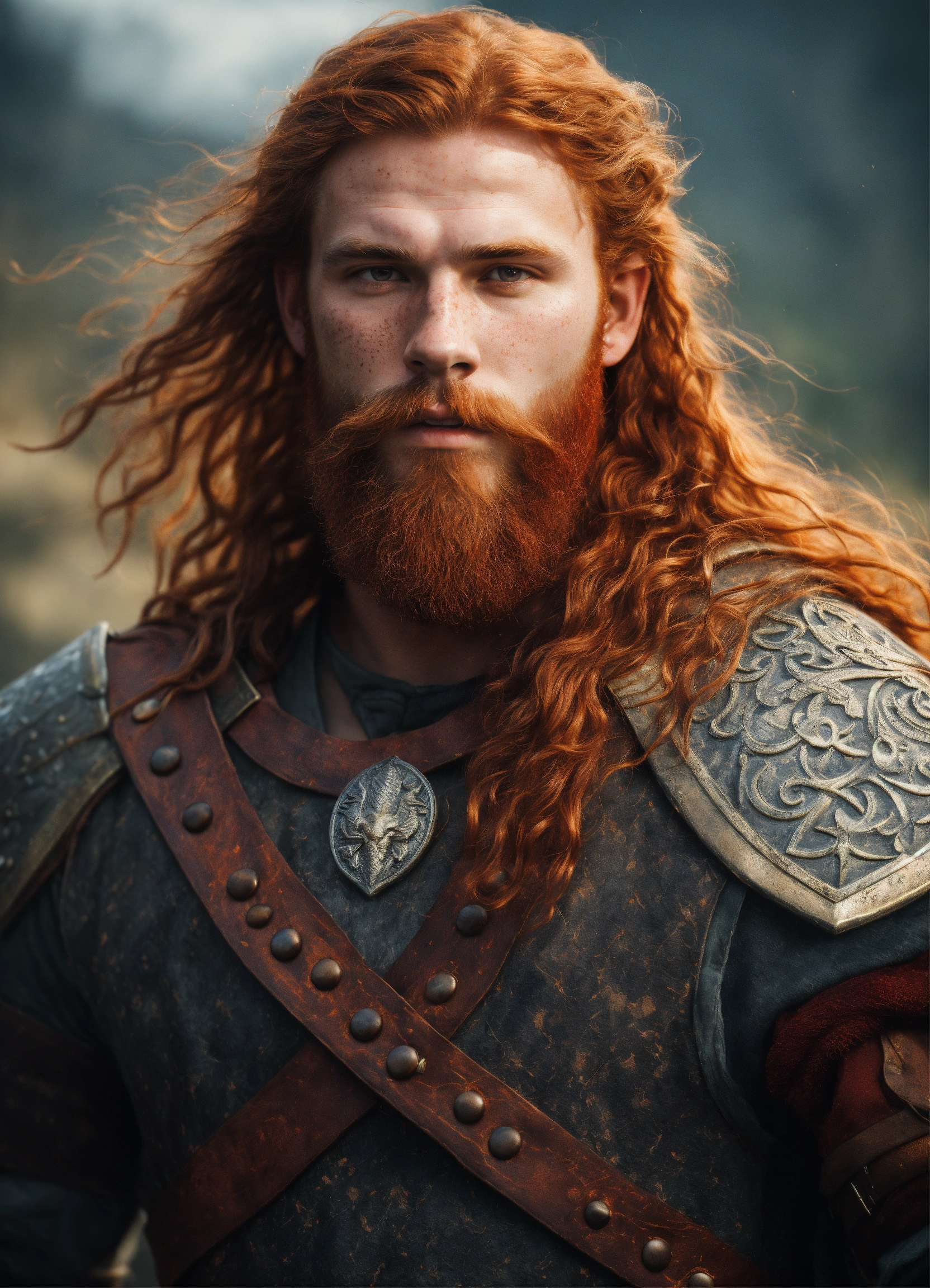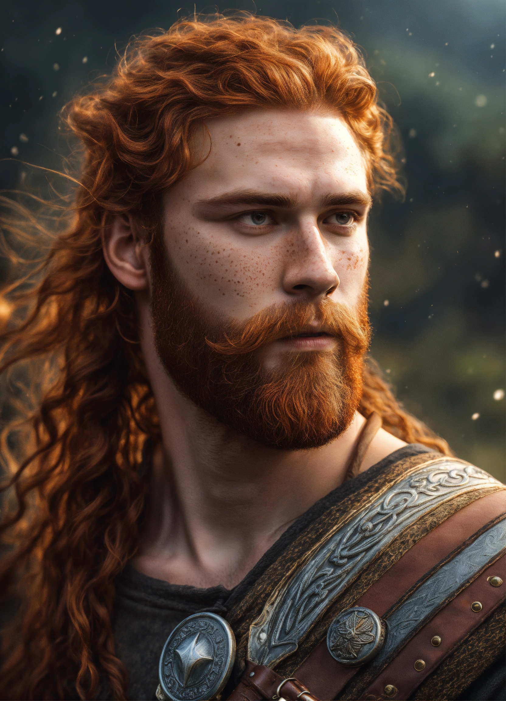25-year-young man with long red wavy hair and matching beard, white skin and freckles, athletic body type, viking fashion, realistic digital art, fantasy