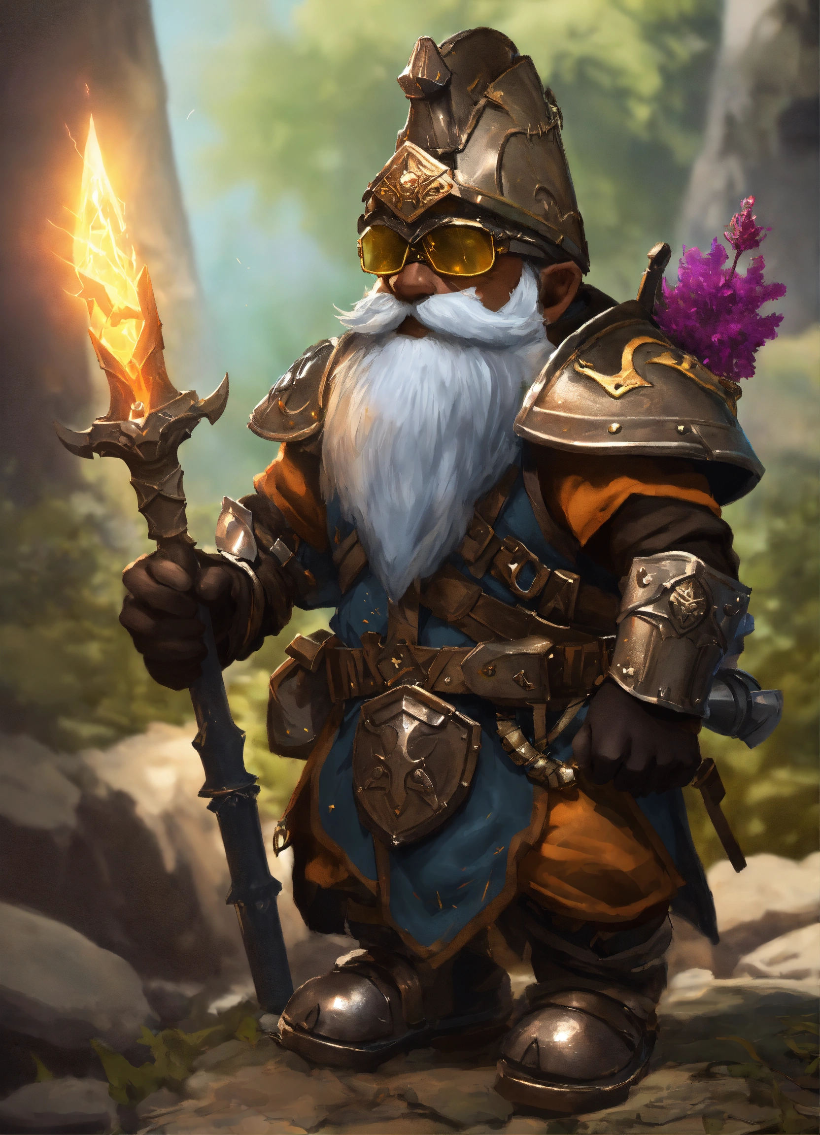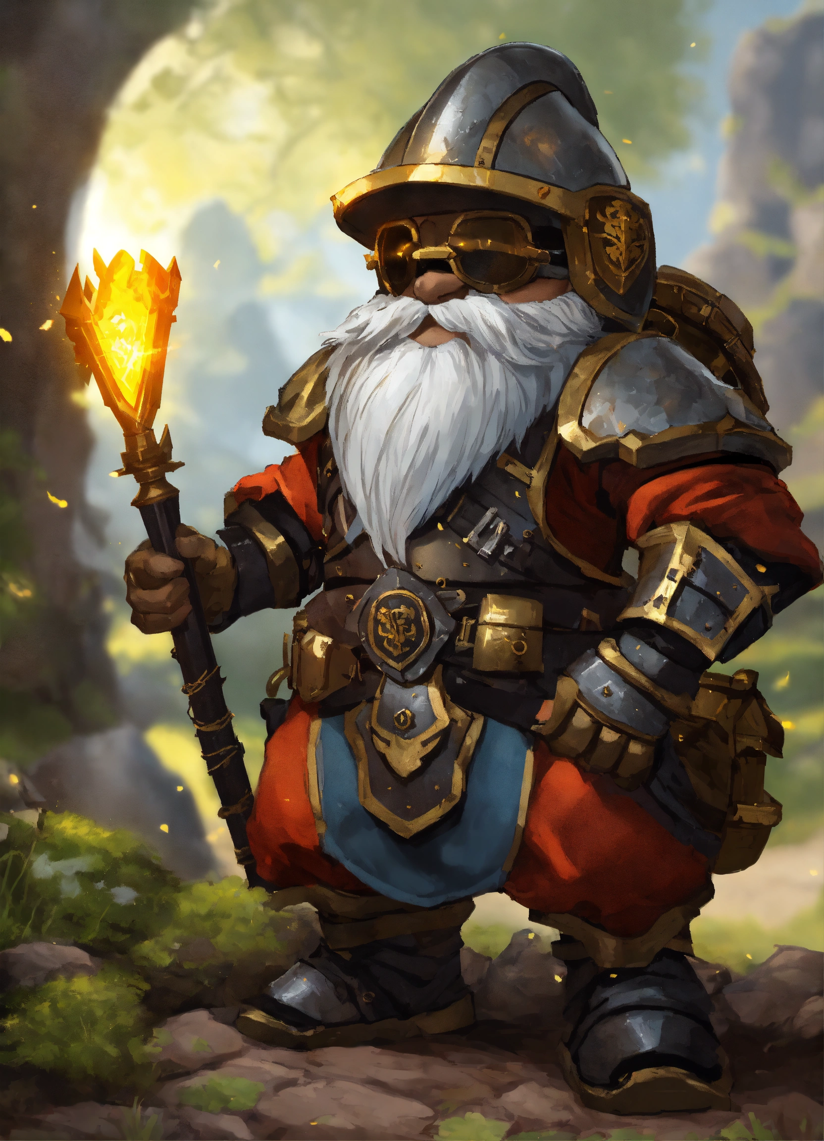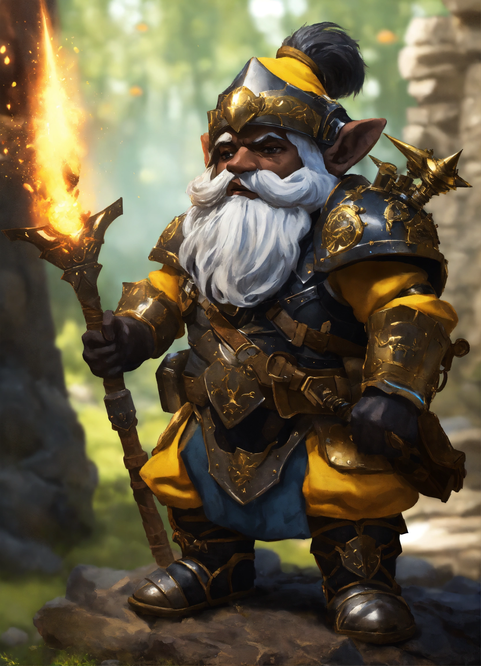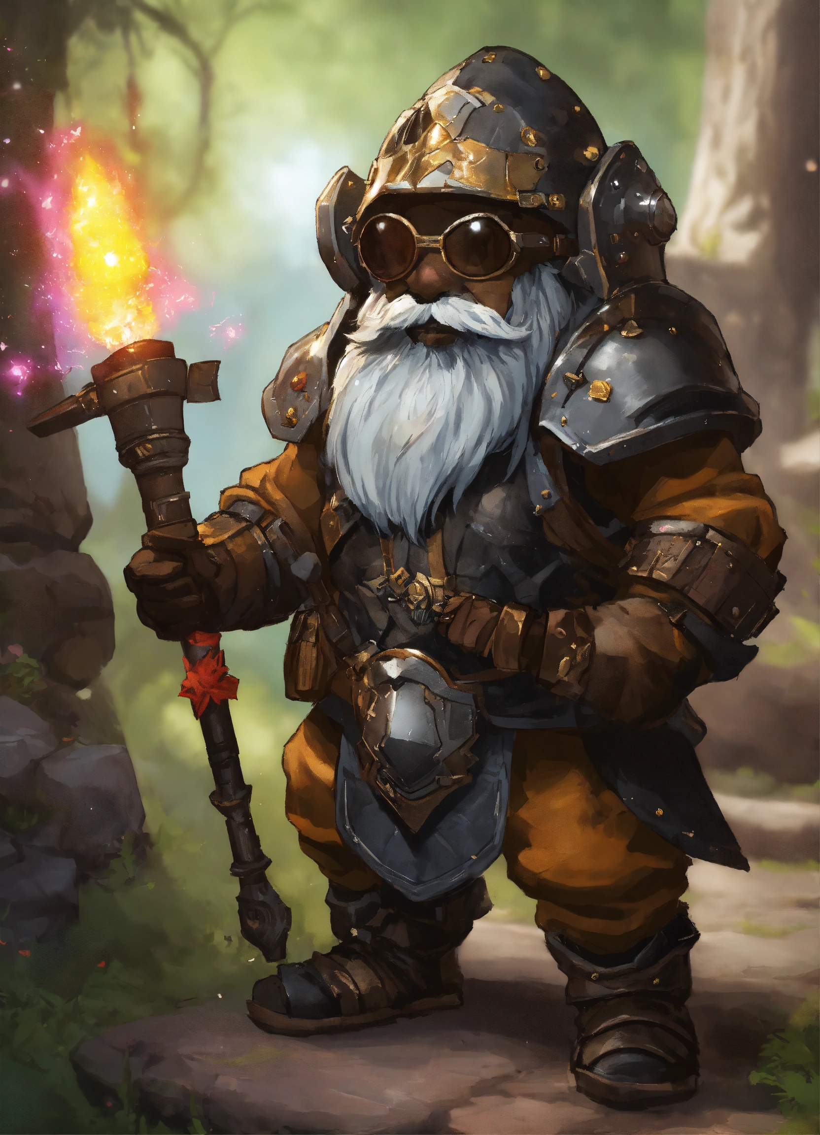 Armorer artificer rock gnome with black skin, on a heavy dark magical homemade armor, magic pulsing through the armor, wearing black medieval visor on a helmet, combat breastplate, heavy armor like a medieval exoskeleton, empty handed with electric gauntlet