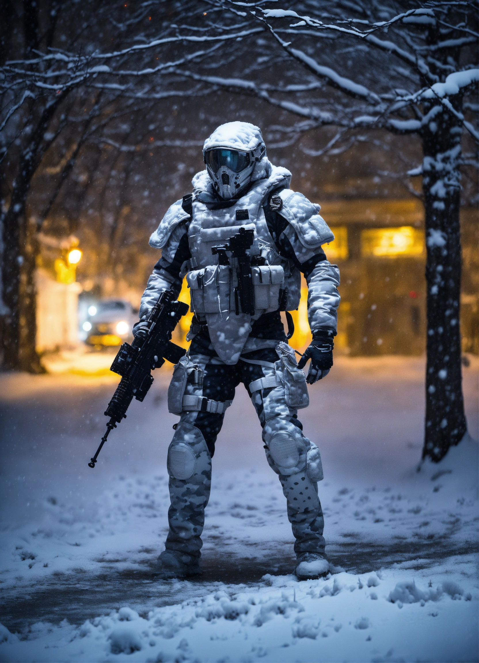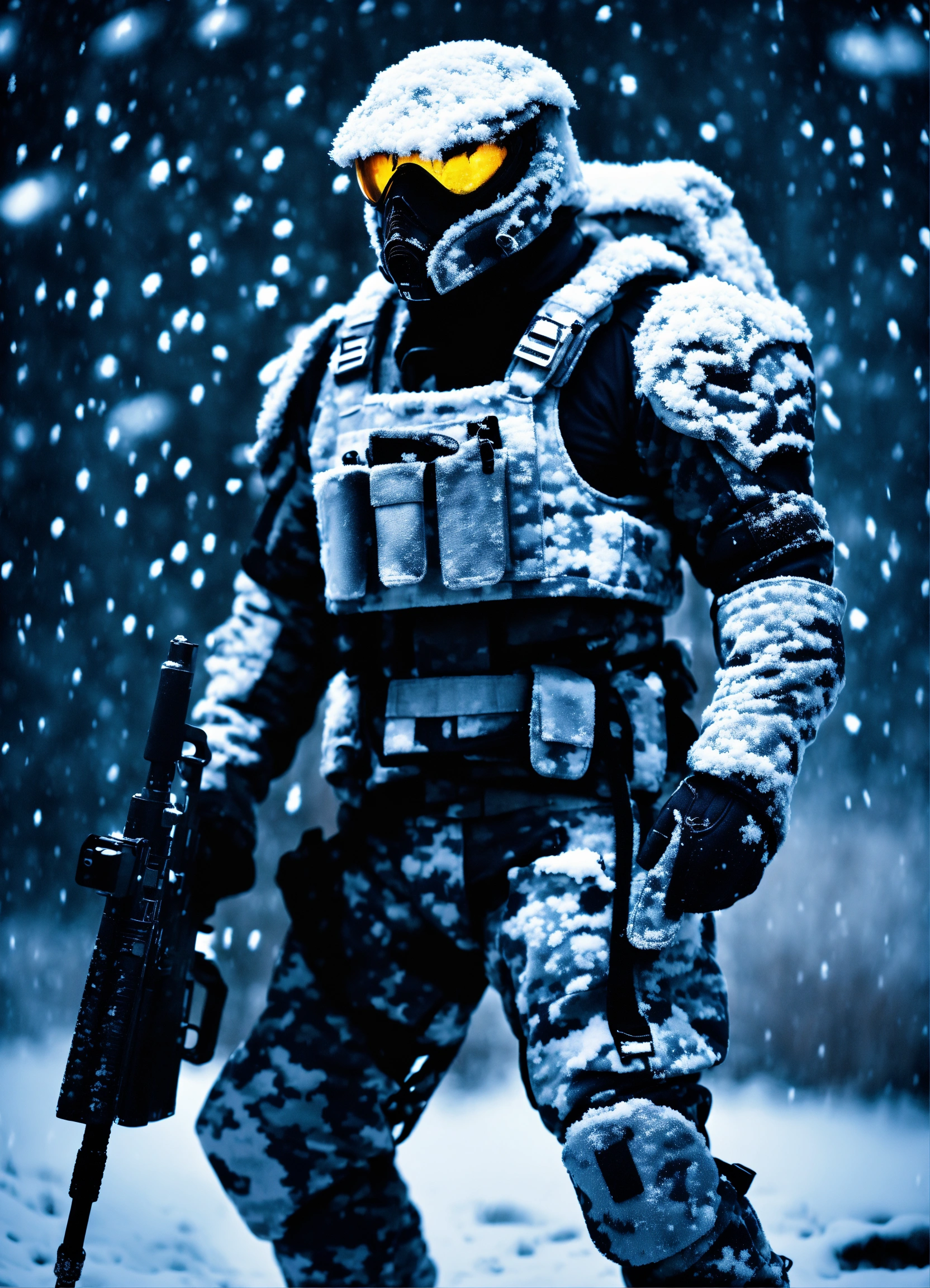 A alien soldier monster, full body portrait in a lanscape, wearing white winter camo military gear, during a snow storm, dark lighting, intricate details, depth of field, in a cold snowstorm, outdoors, night
